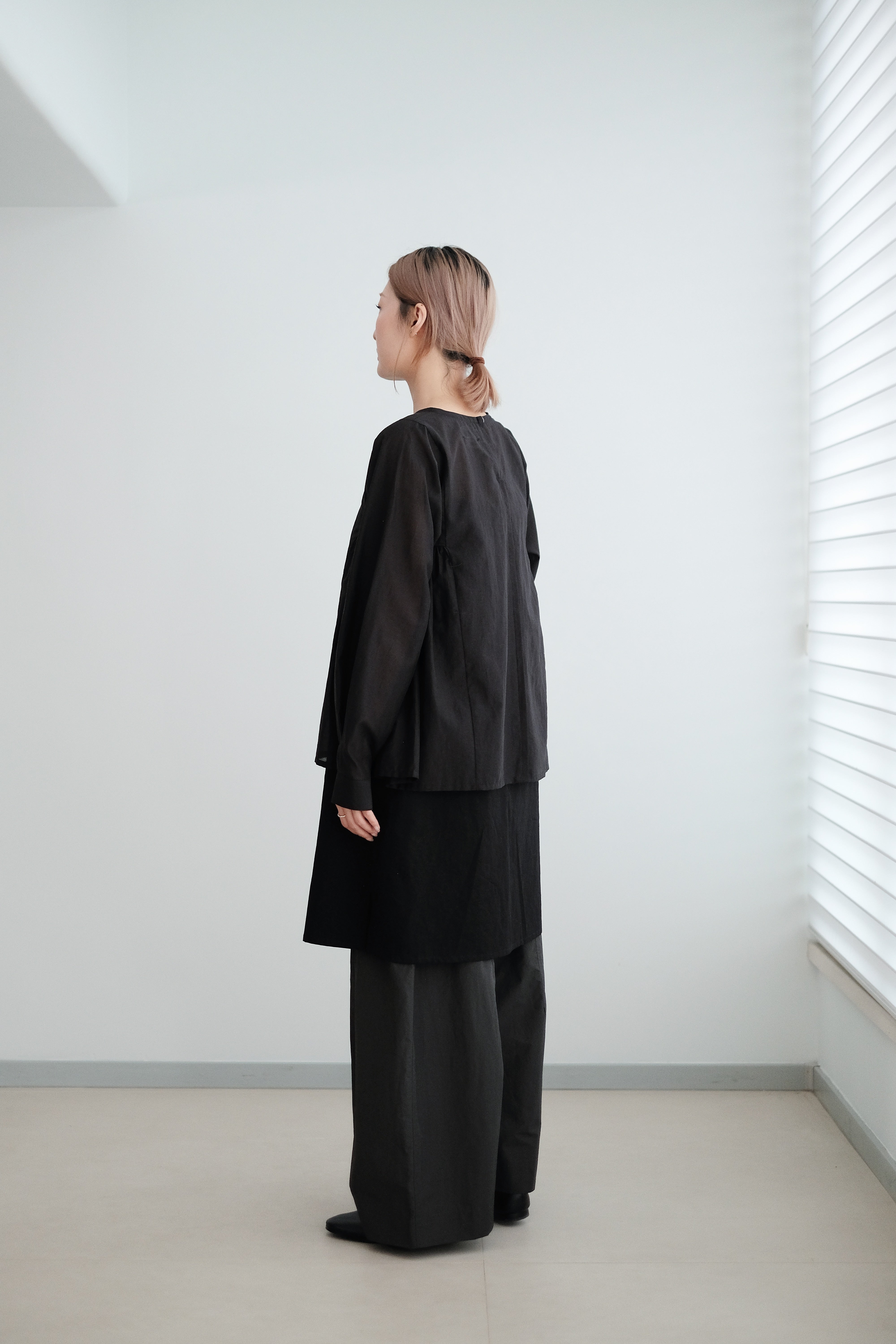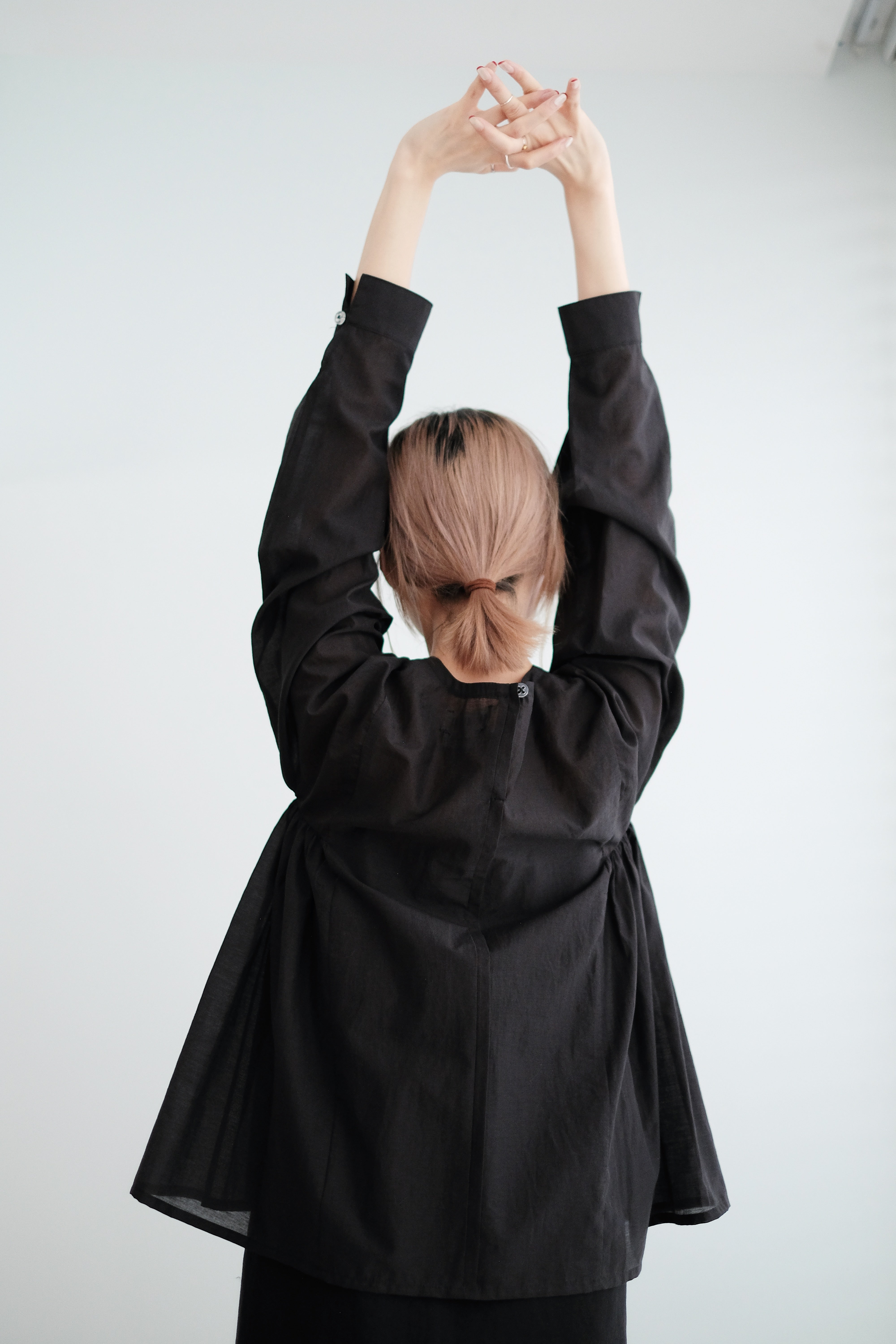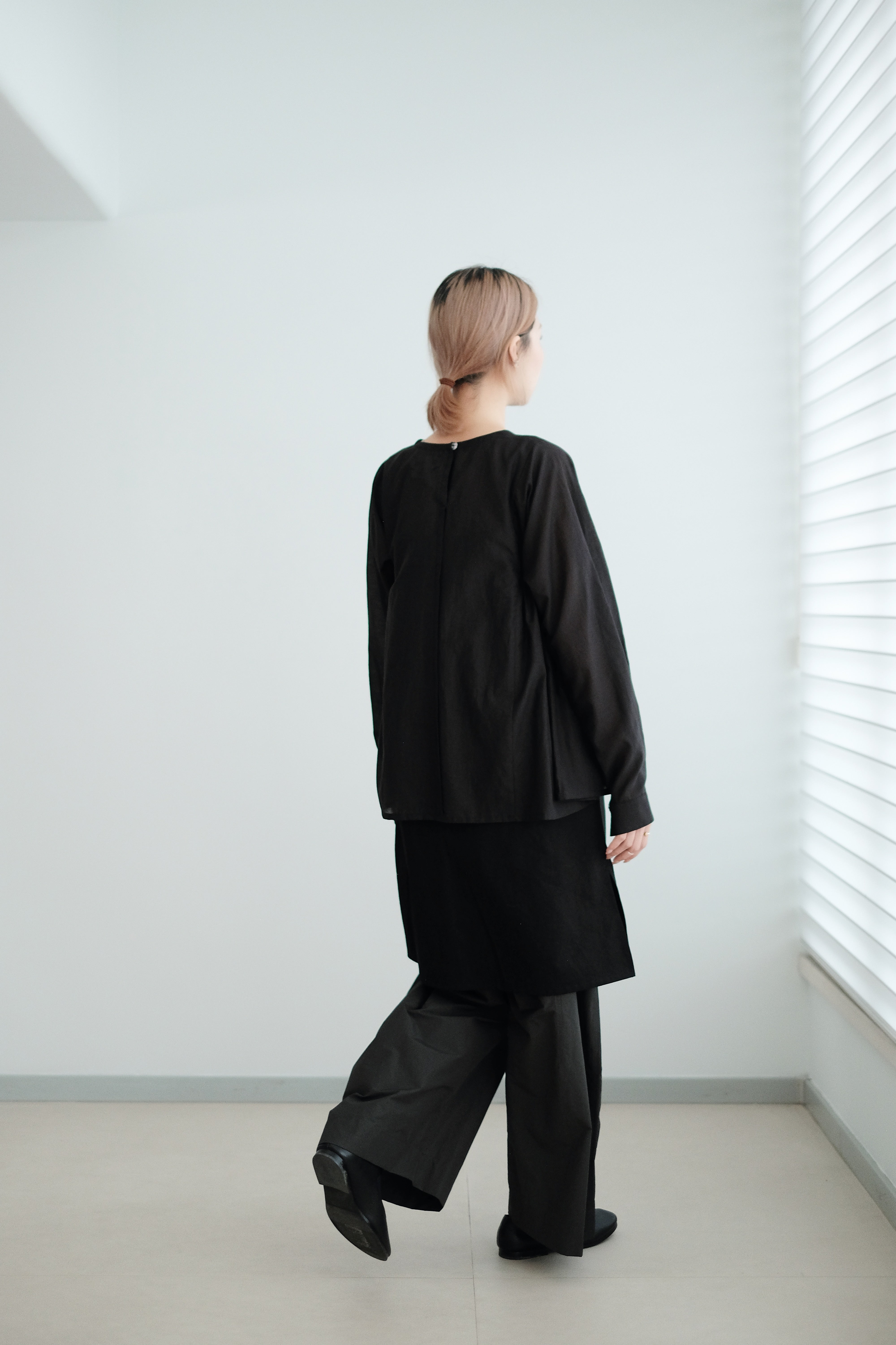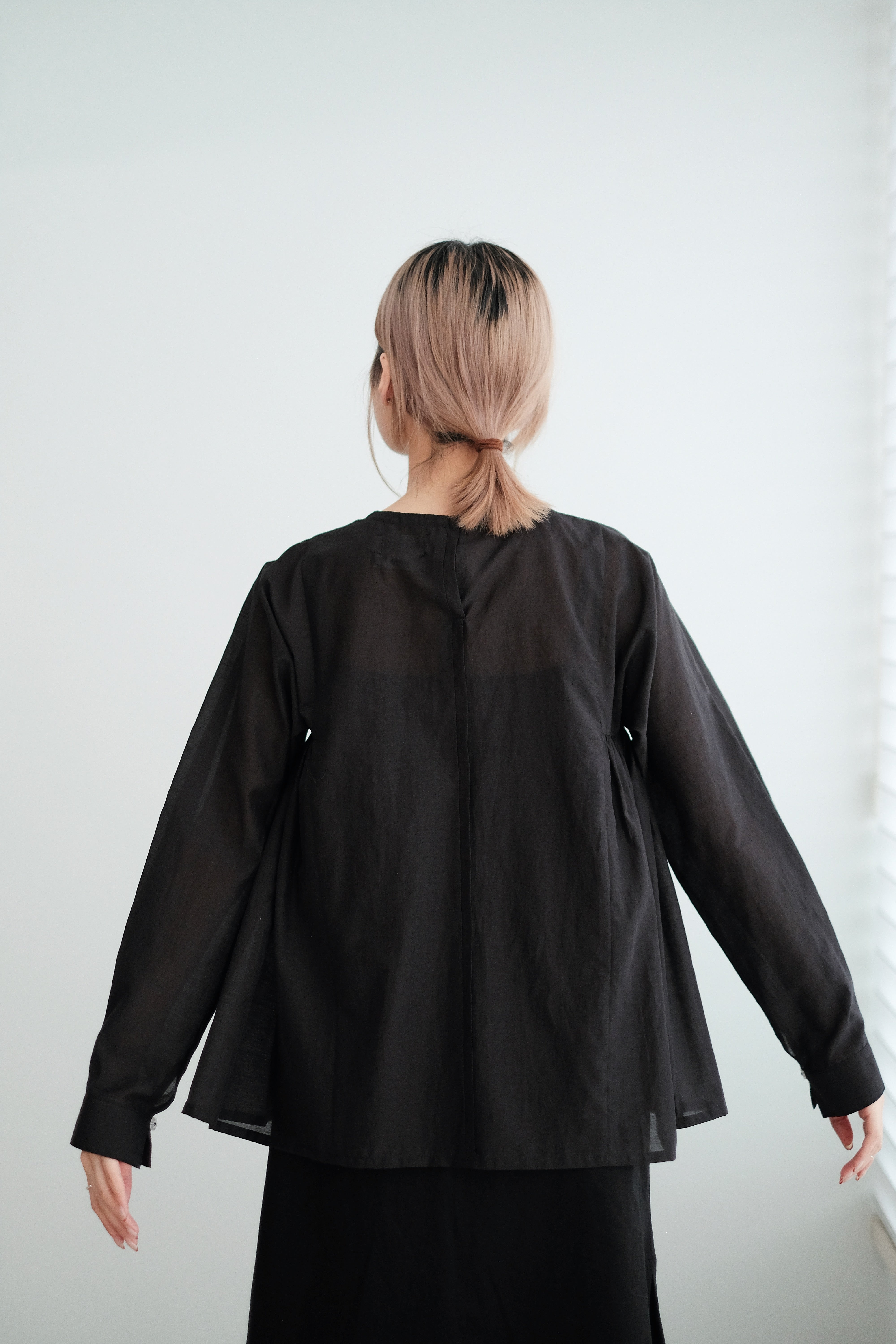 This black top is made from a cotton blended fabric with a crisp yet breathable structure. Designed in an A-line silhouette, it features delicate pleats under the arms, adding subtle volume and movement. The back button closure and flared hem complete a relaxed fit—ideal for layering in summer while keeping a sense of fluid structure.