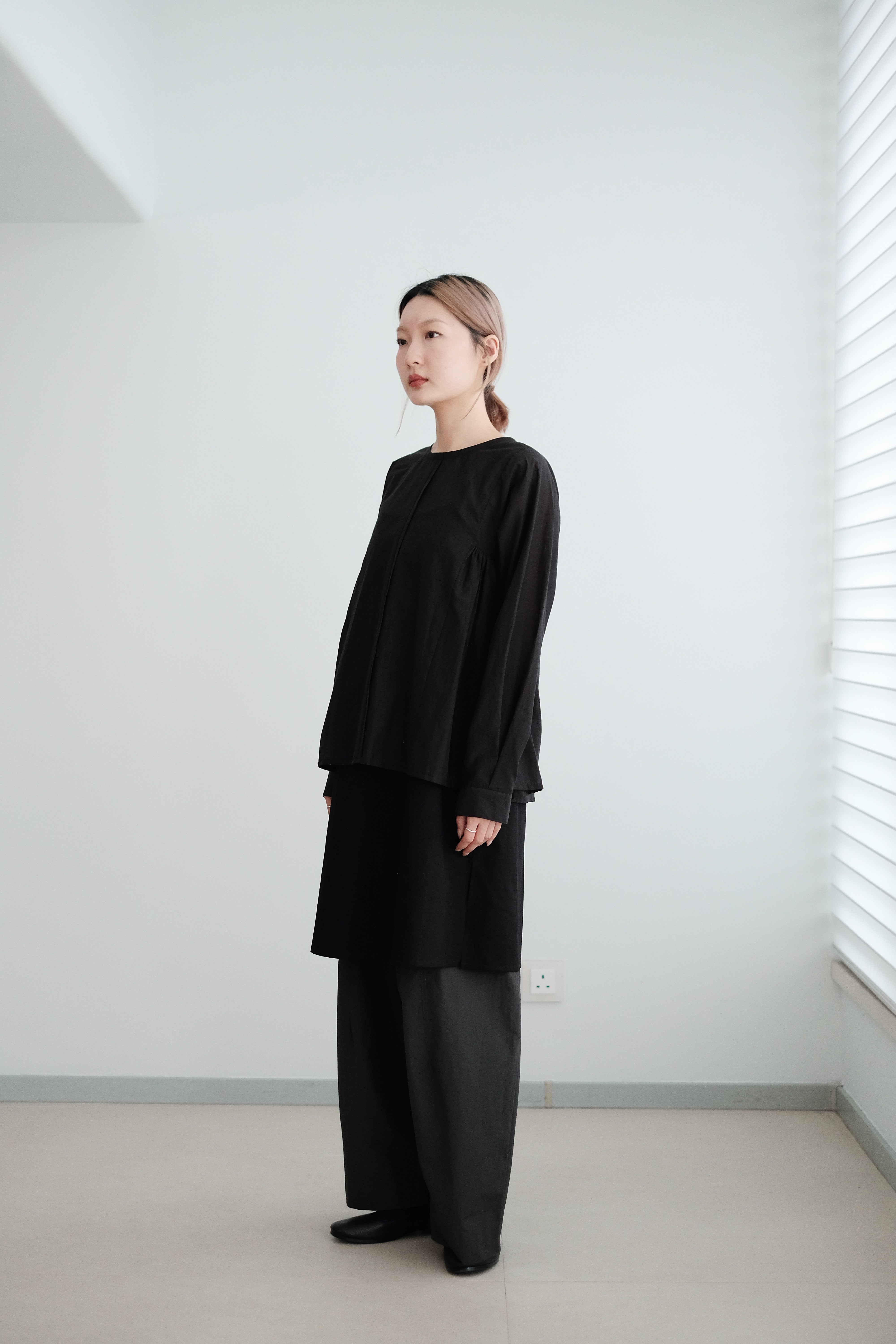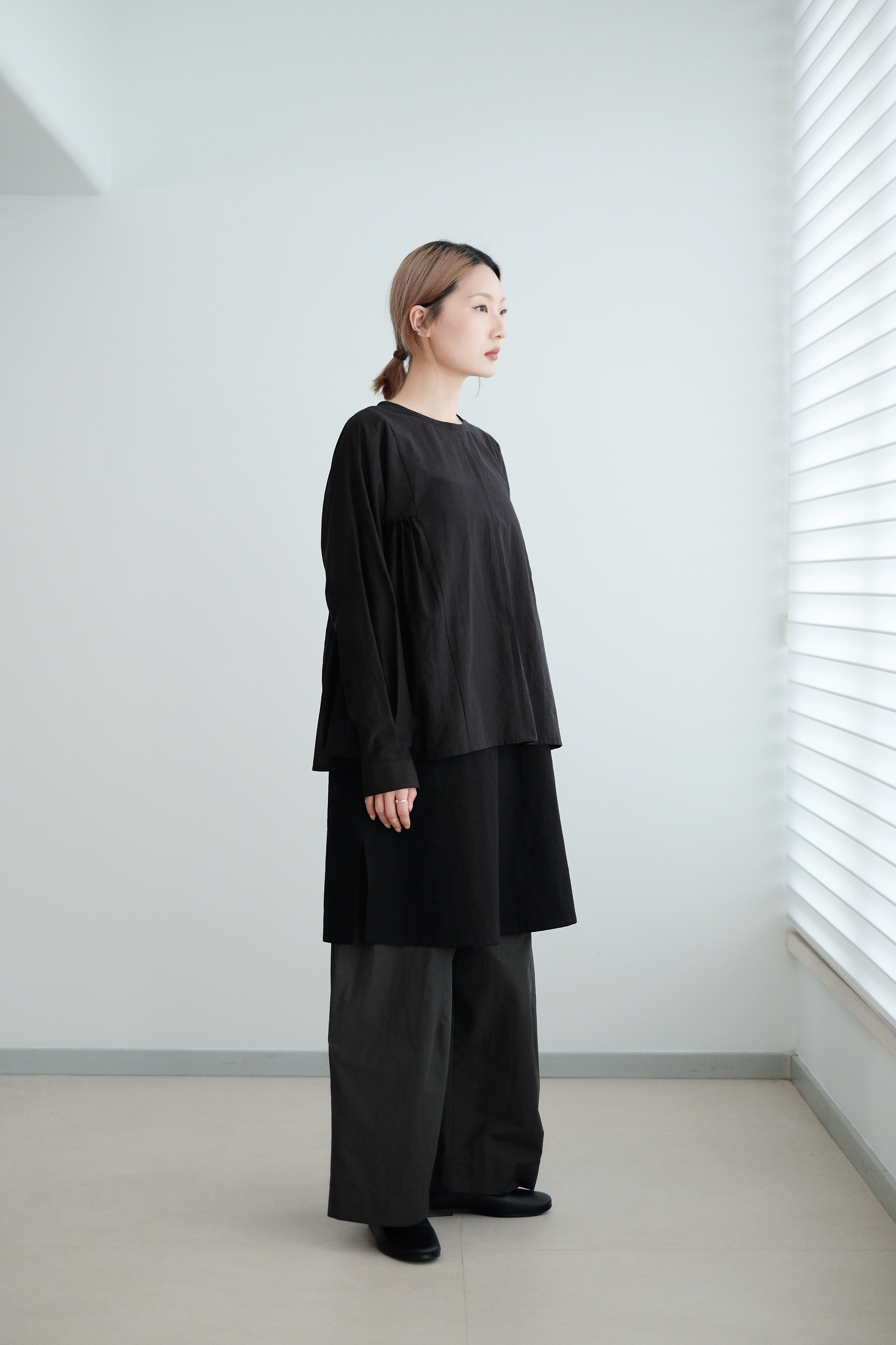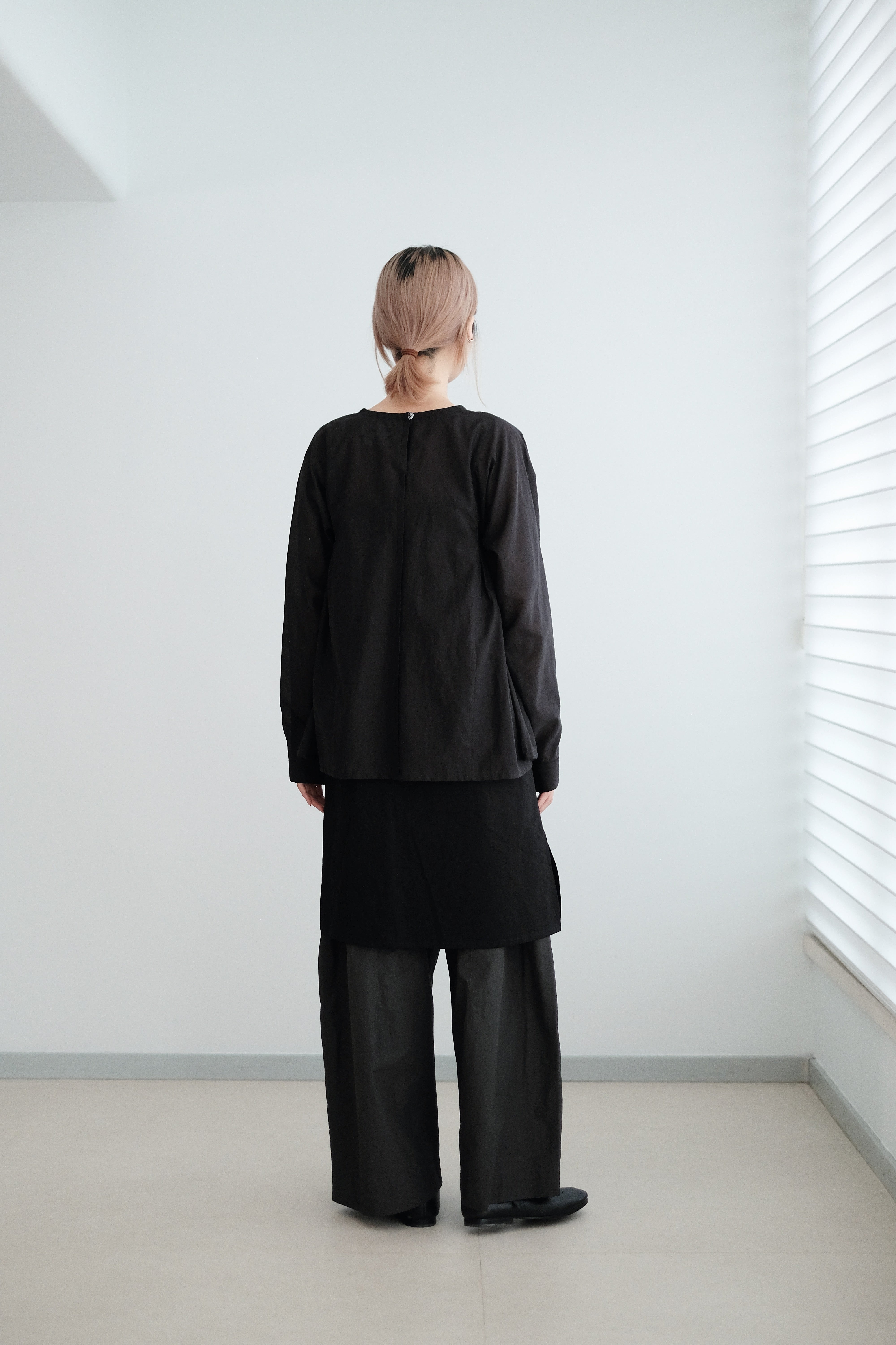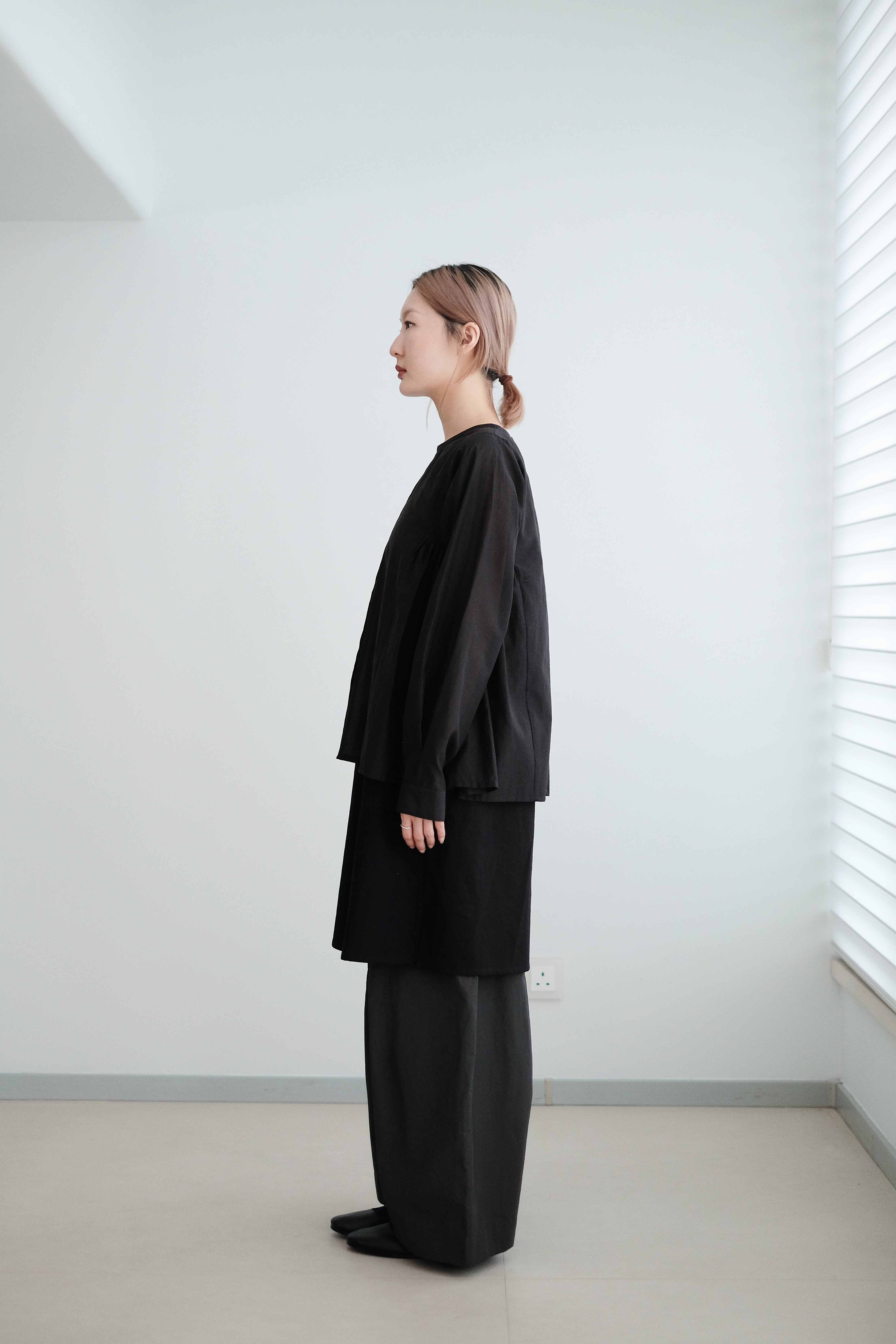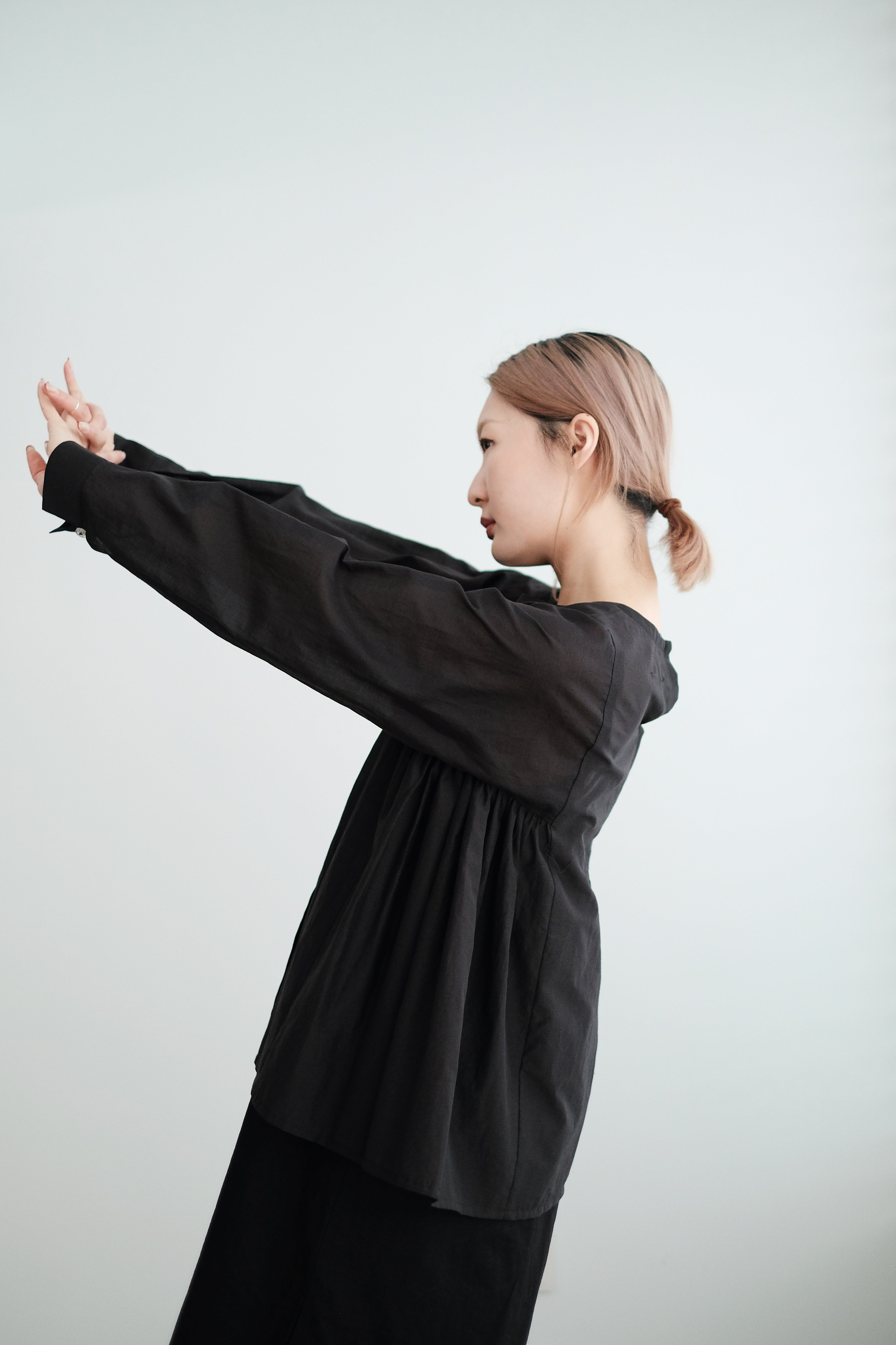 This black top is made from a cotton blended fabric with a crisp yet breathable structure. Designed in an A-line silhouette, it features delicate pleats under the arms, adding subtle volume and movement. The back button closure and flared hem complete a relaxed fit—ideal for layering in summer while keeping a sense of fluid structure.