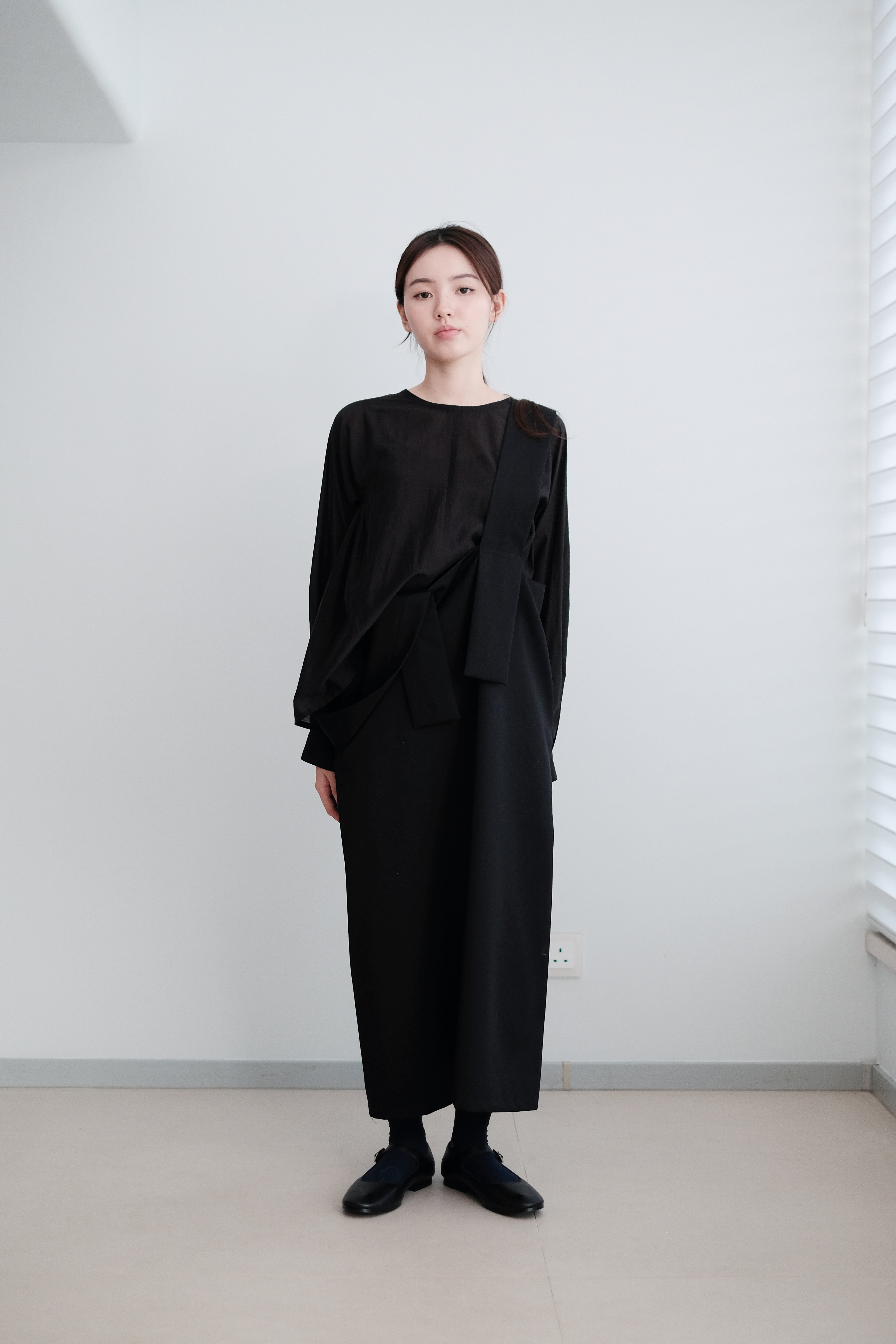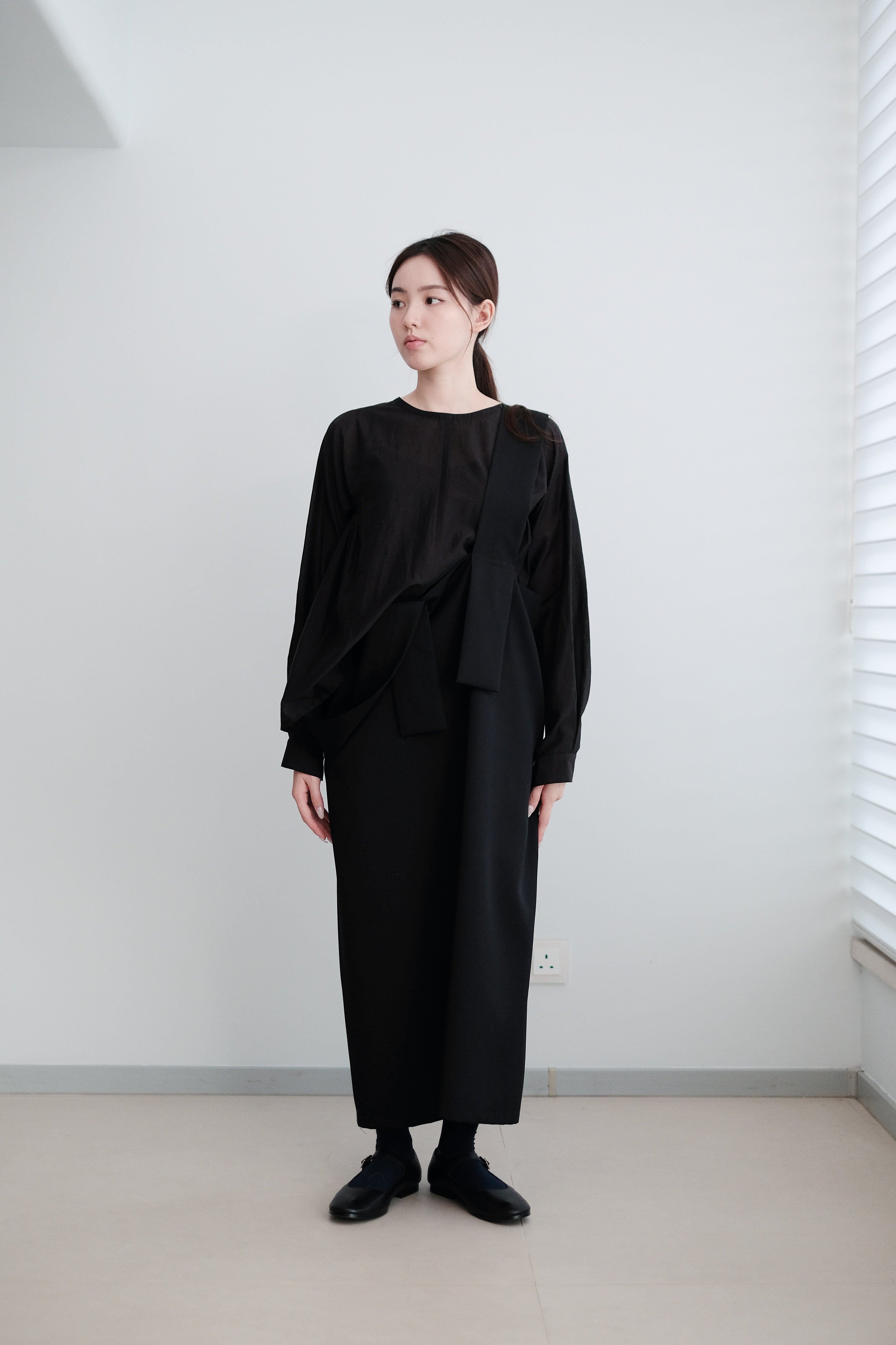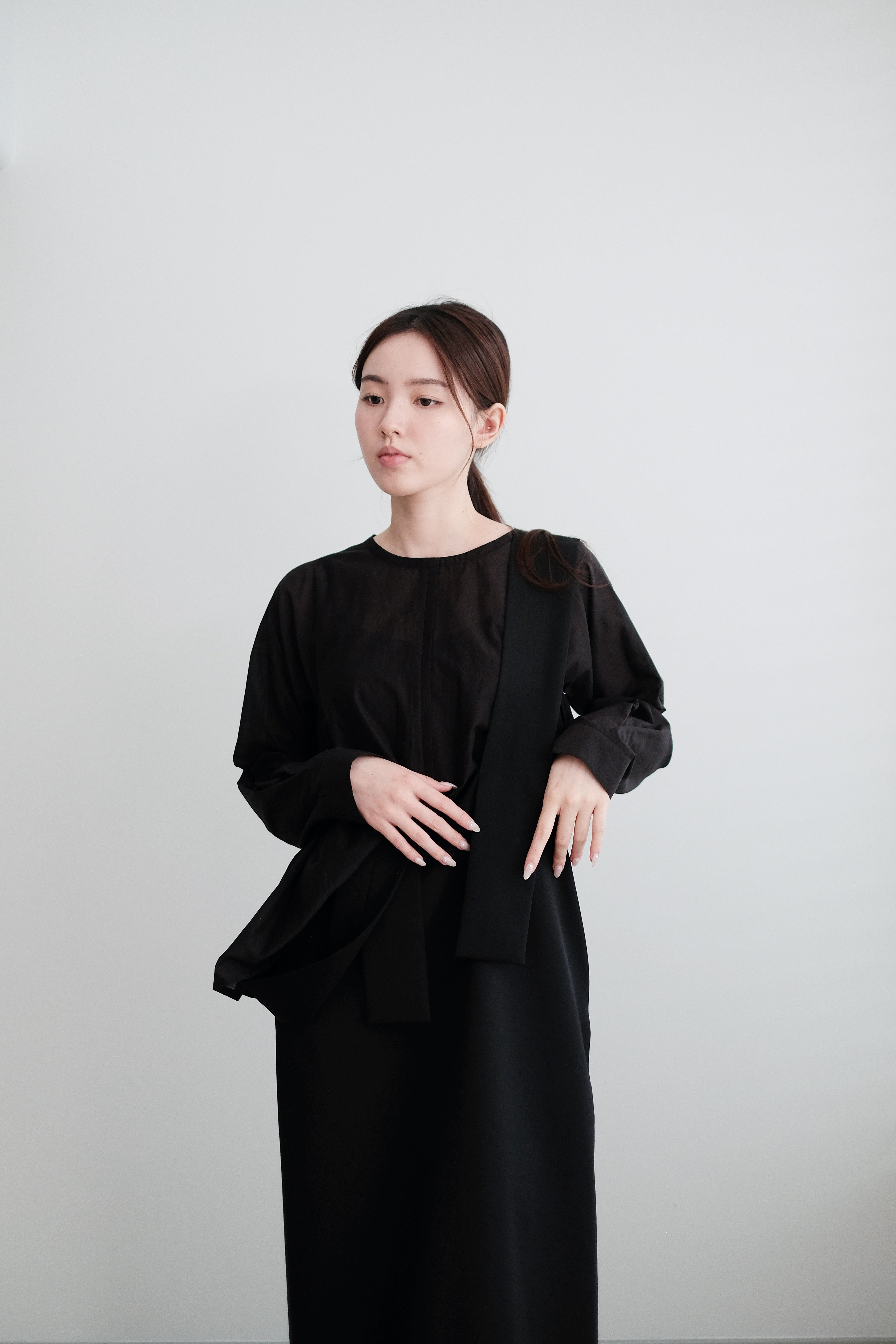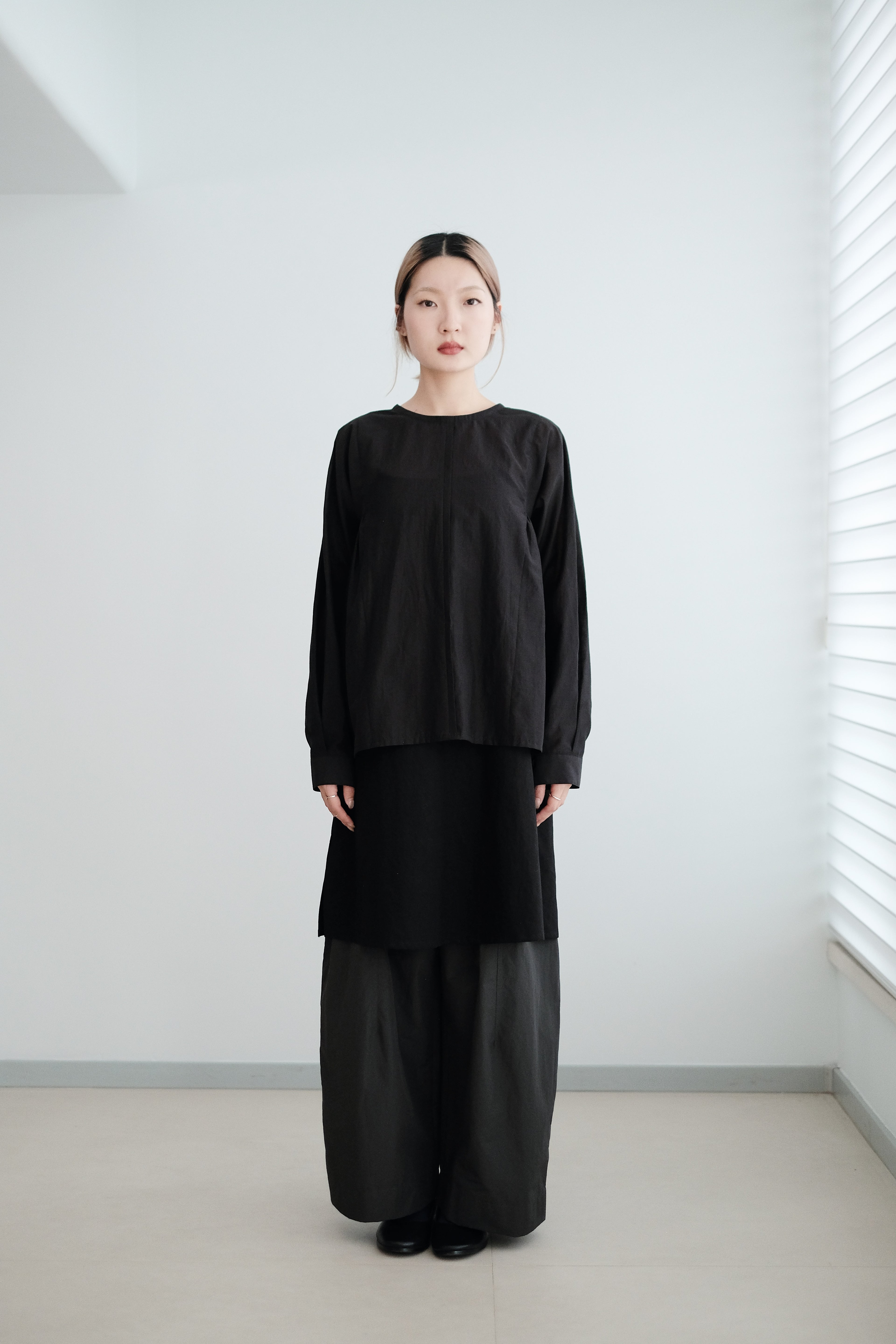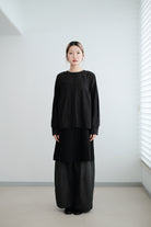 This black top is made from a cotton blended fabric with a crisp yet breathable structure. Designed in an A-line silhouette, it features delicate pleats under the arms, adding subtle volume and movement. The back button closure and flared hem complete a relaxed fit—ideal for layering in summer while keeping a sense of fluid structure.