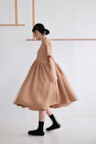 裙子的傘形剪裁和中長寬闊的下擺設計