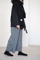褲腳處開叉設計加上褲子兩側束帶作拼接