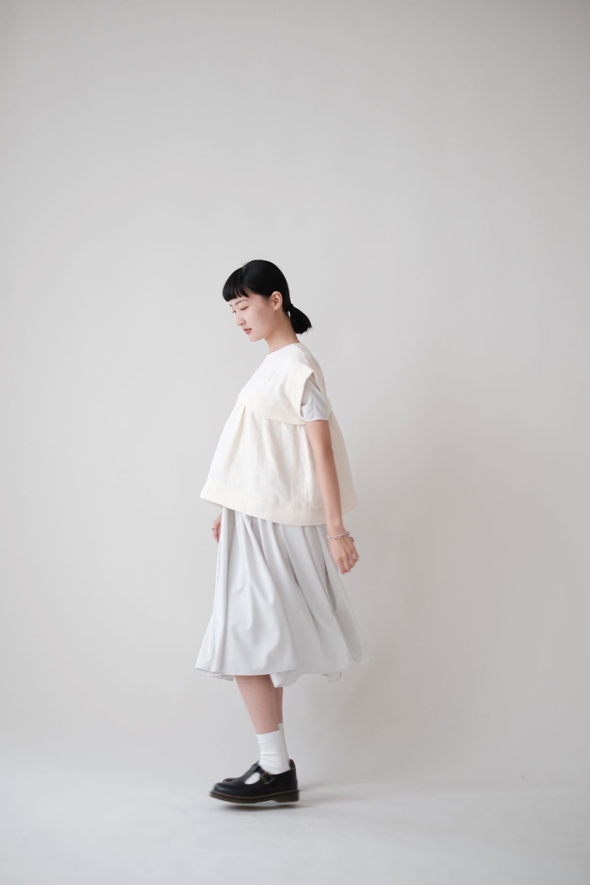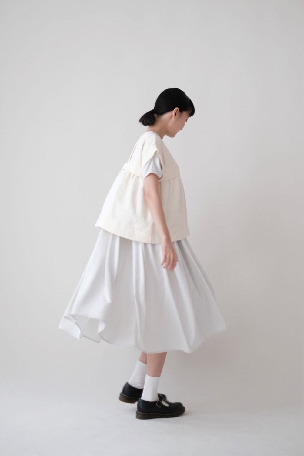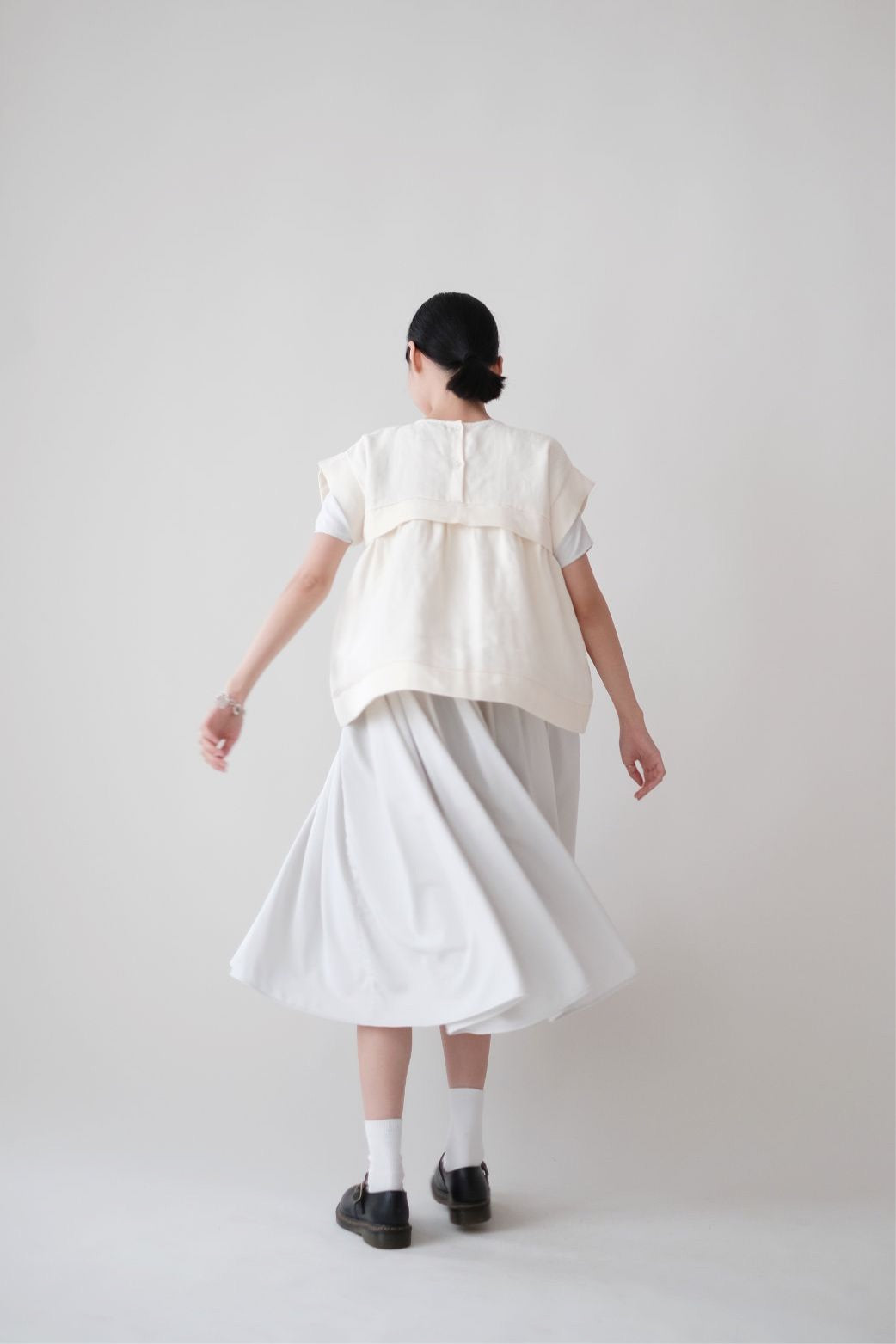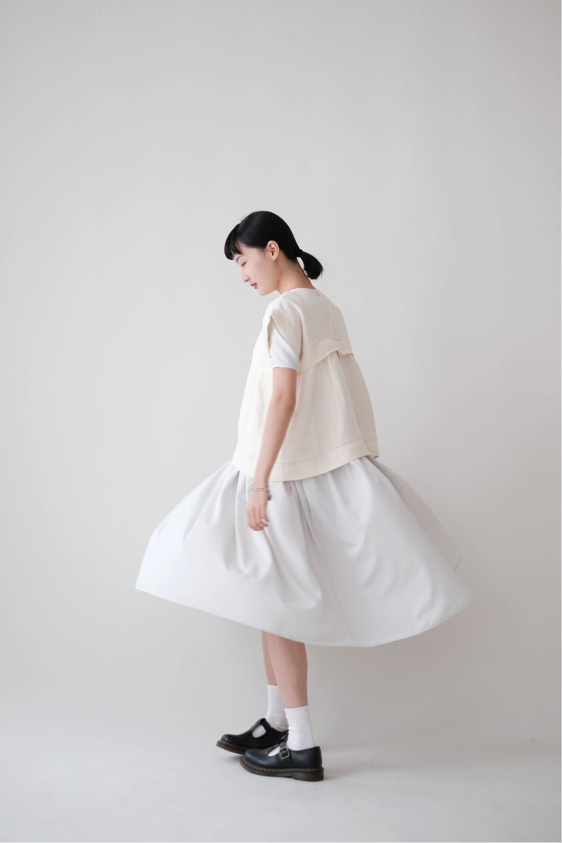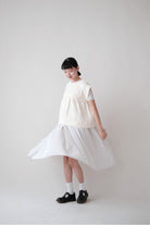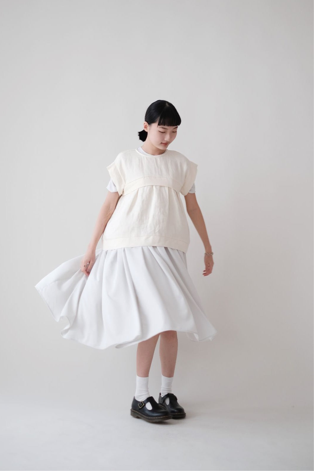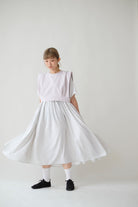 裙子的傘形剪裁和中長寬闊的下擺設計可單獨穿著或加上外套裙子選用挺身的布料製作透氣度和飄逸感都十分高A字形裙擺和帶皺褶的車邊設計讓原本簡潔的平面增添層次感