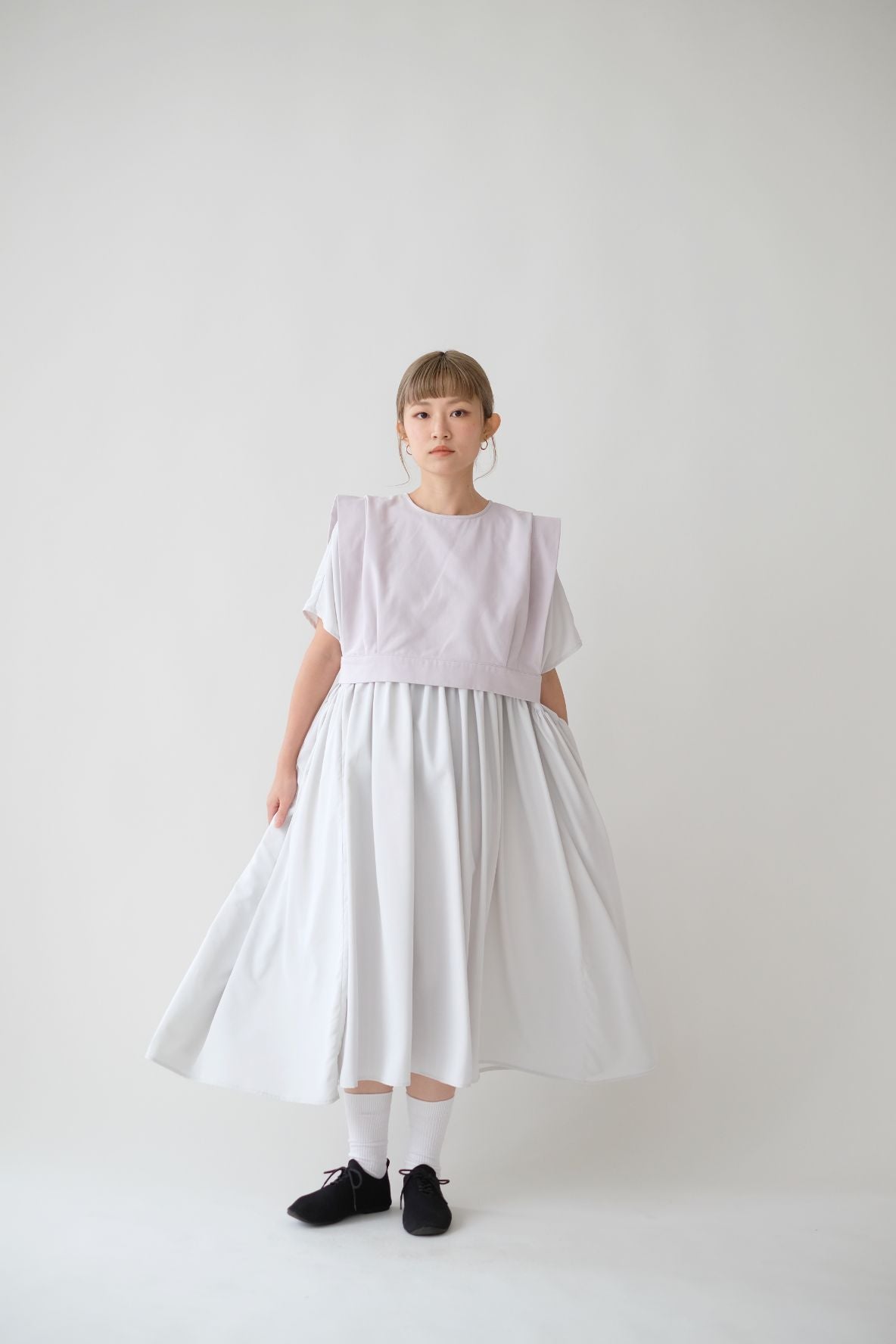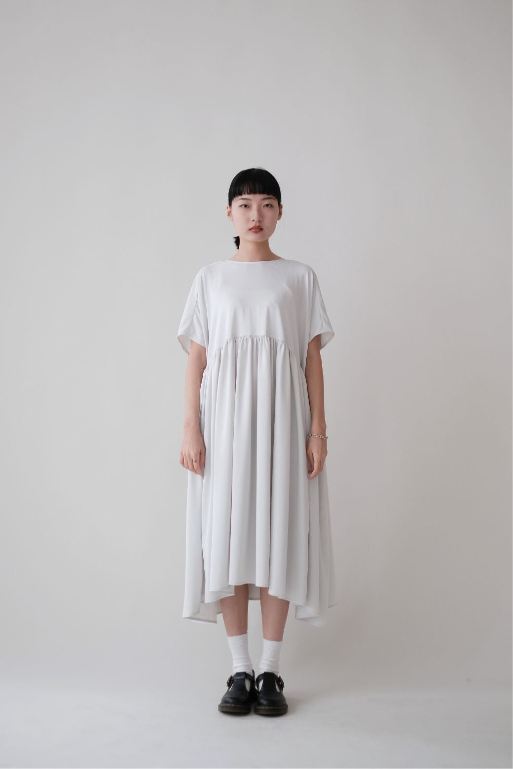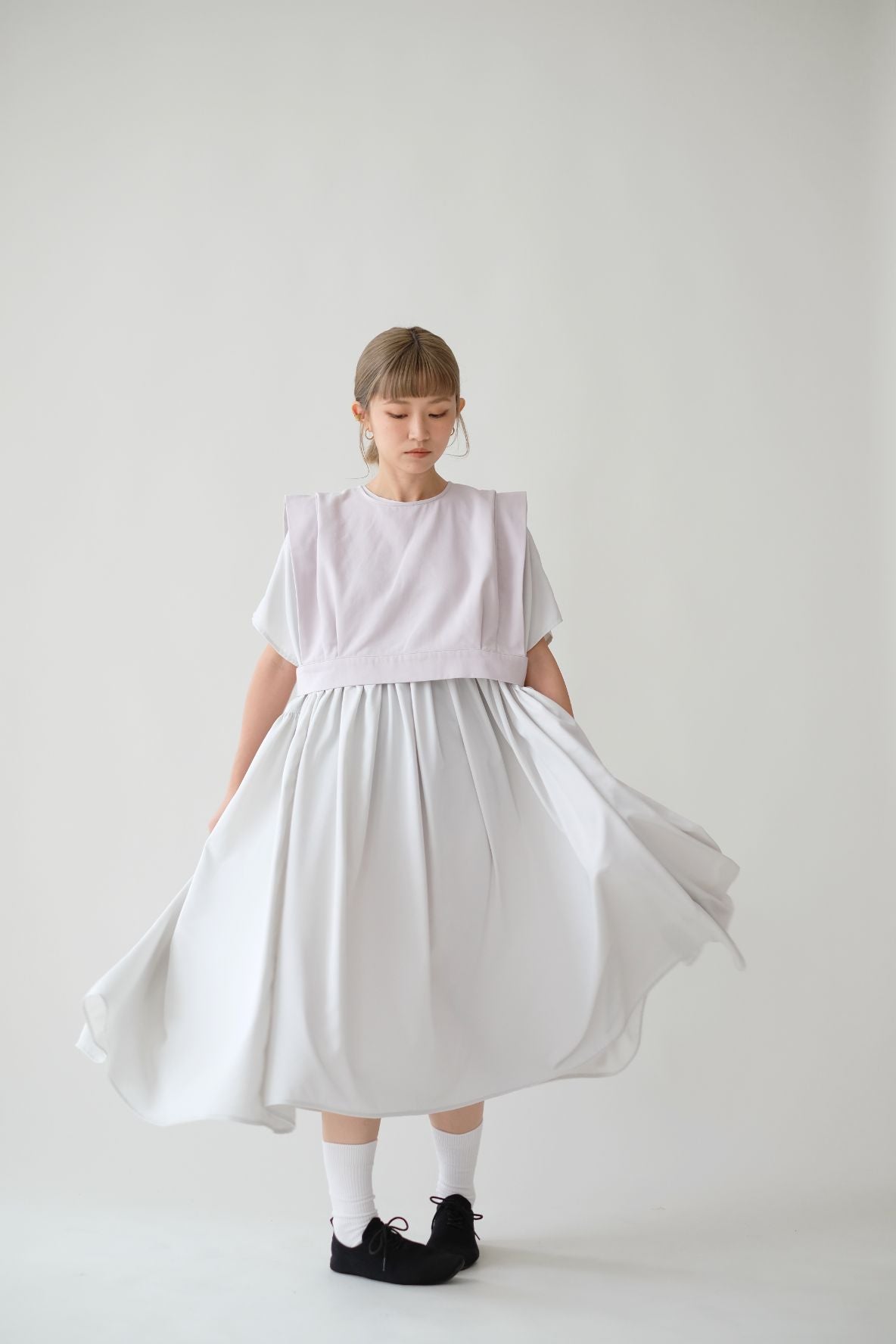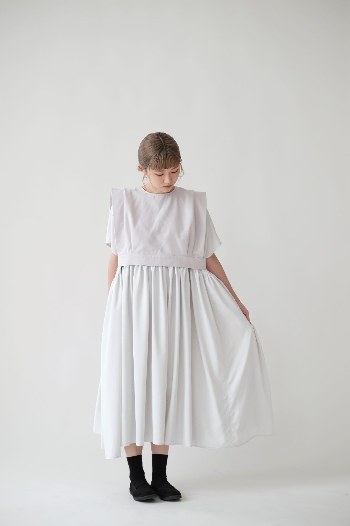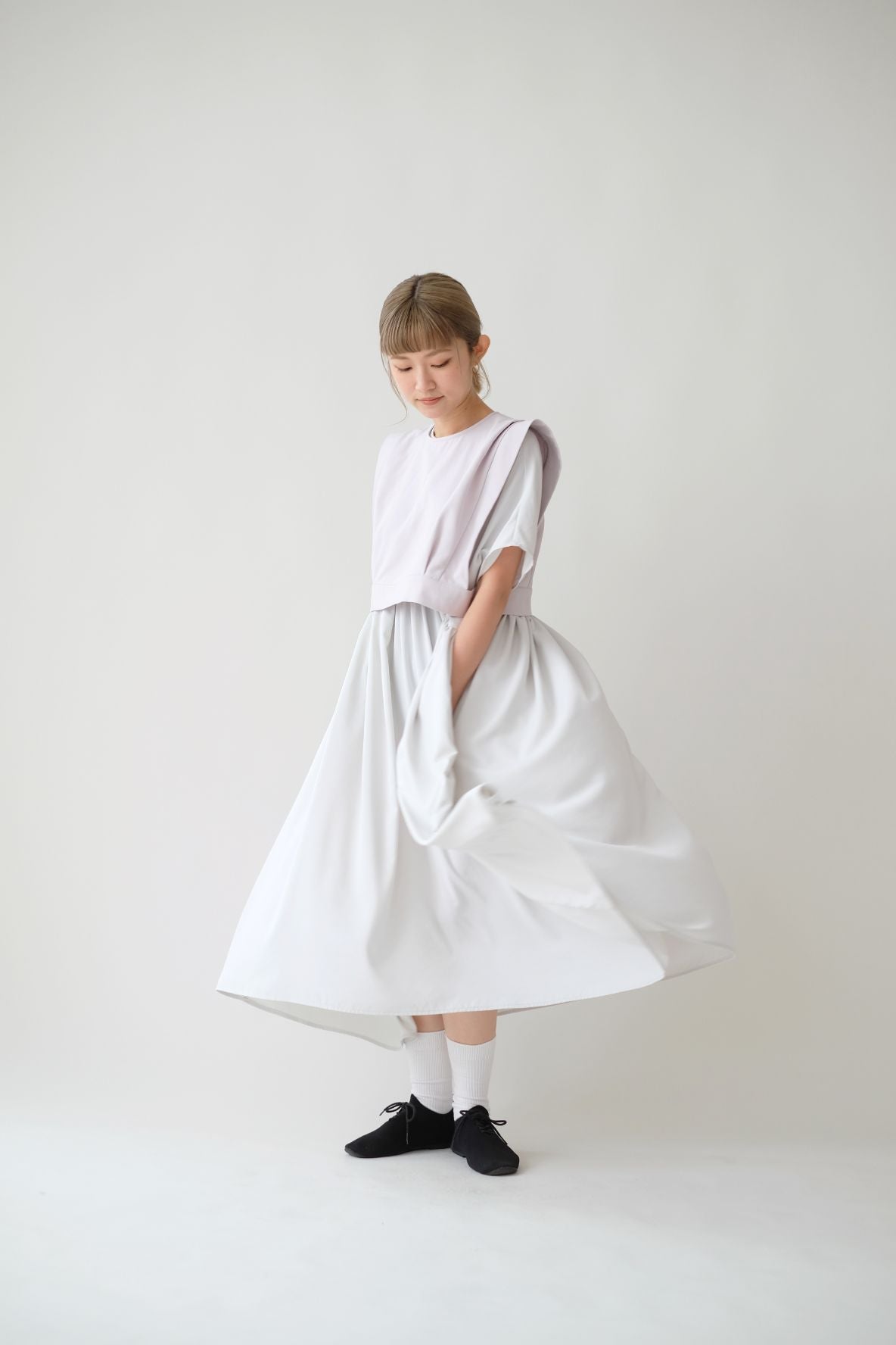 裙子的傘形剪裁和中長寬闊的下擺設計可單獨穿著或加上外套裙子選用挺身的布料製作透氣度和飄逸感都十分高A字形裙擺和帶皺褶的車邊設計讓原本簡潔的平面增添層次感