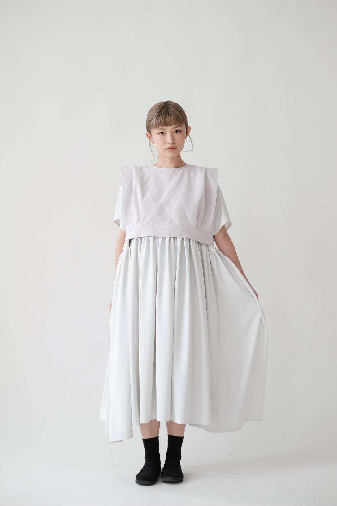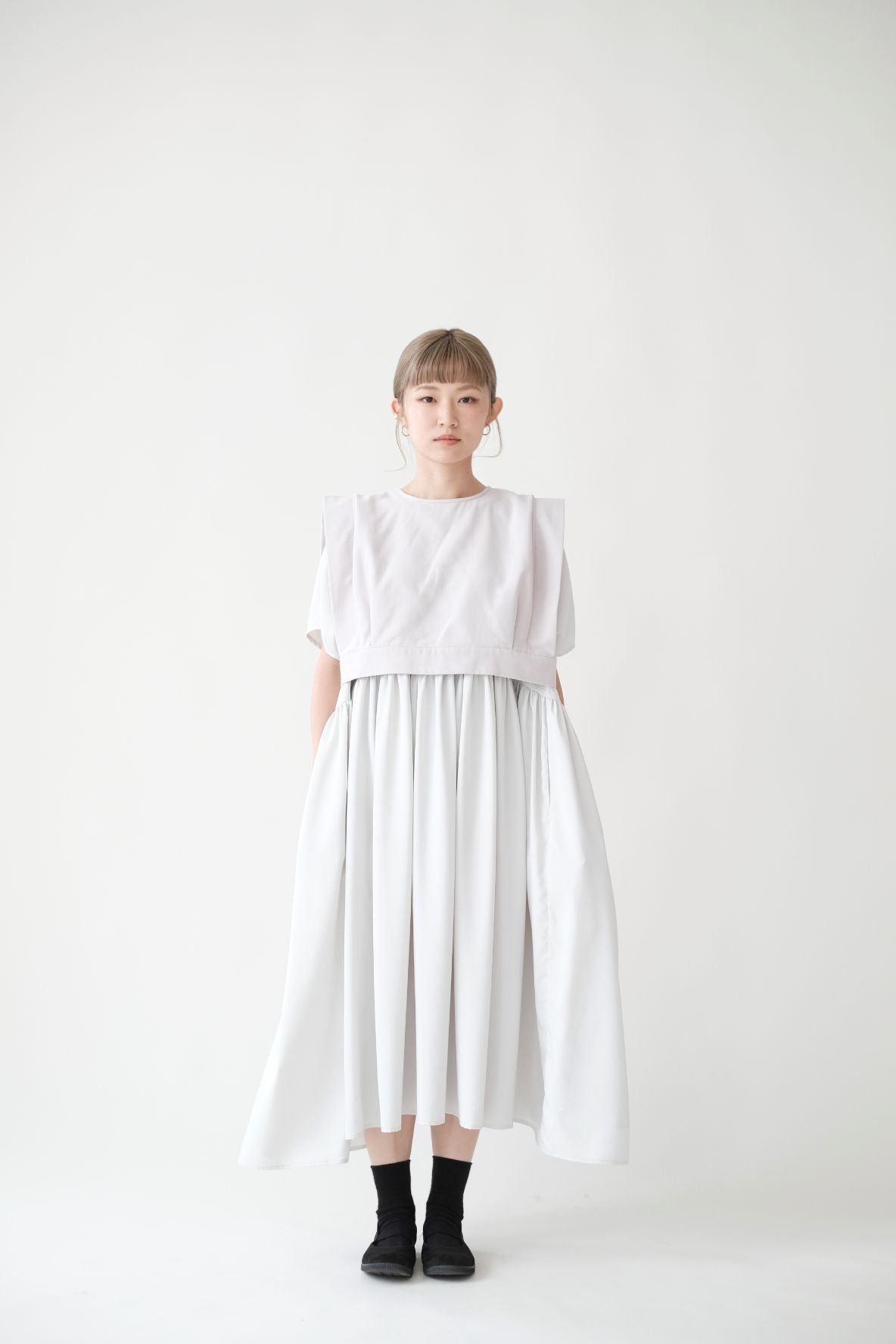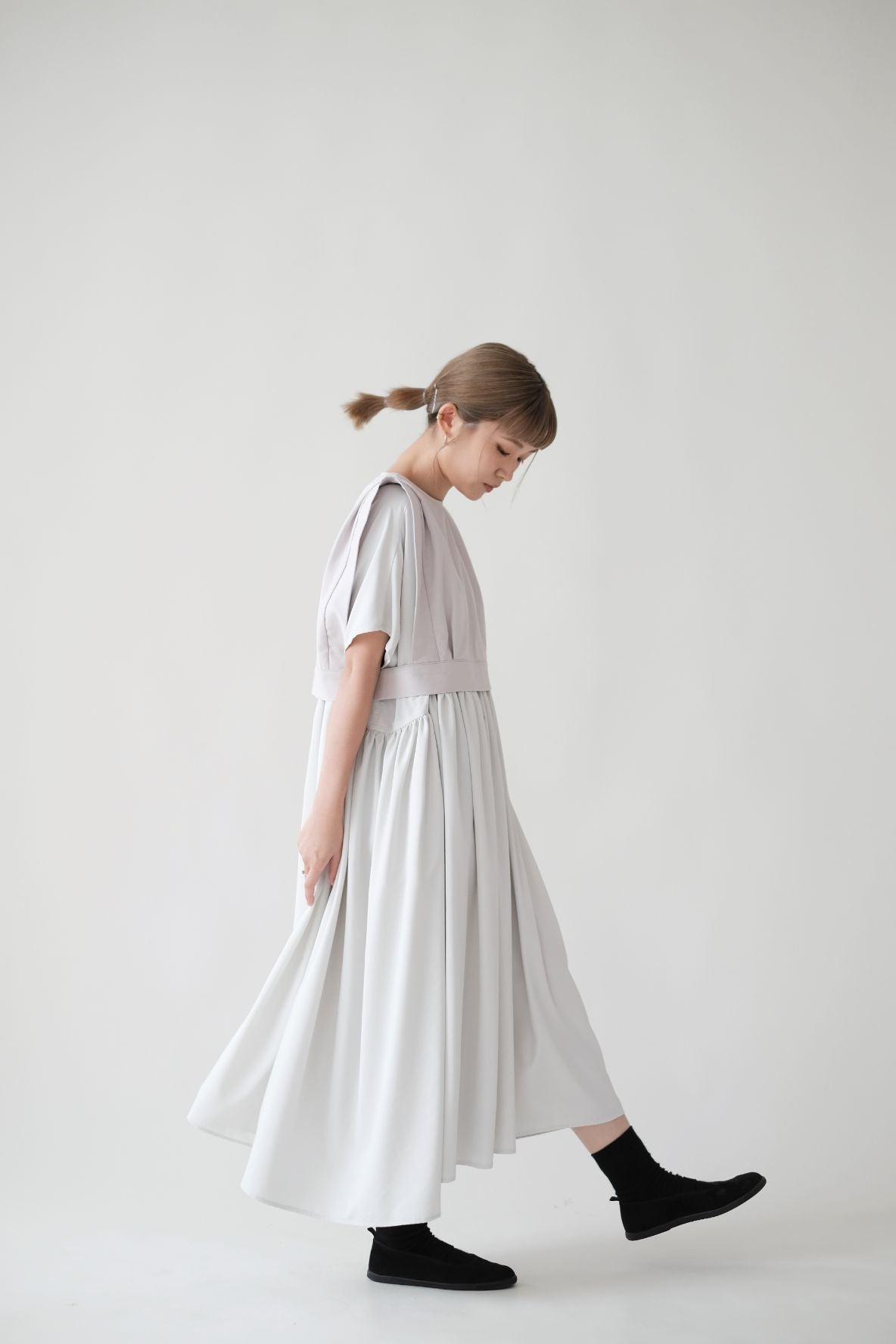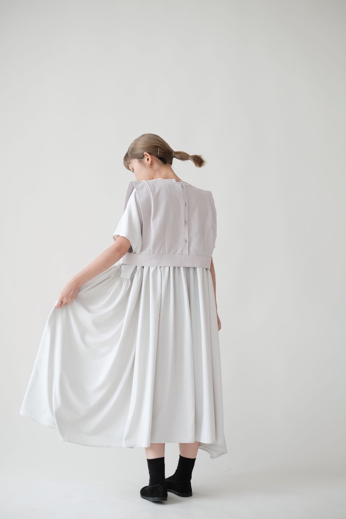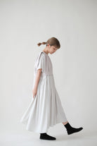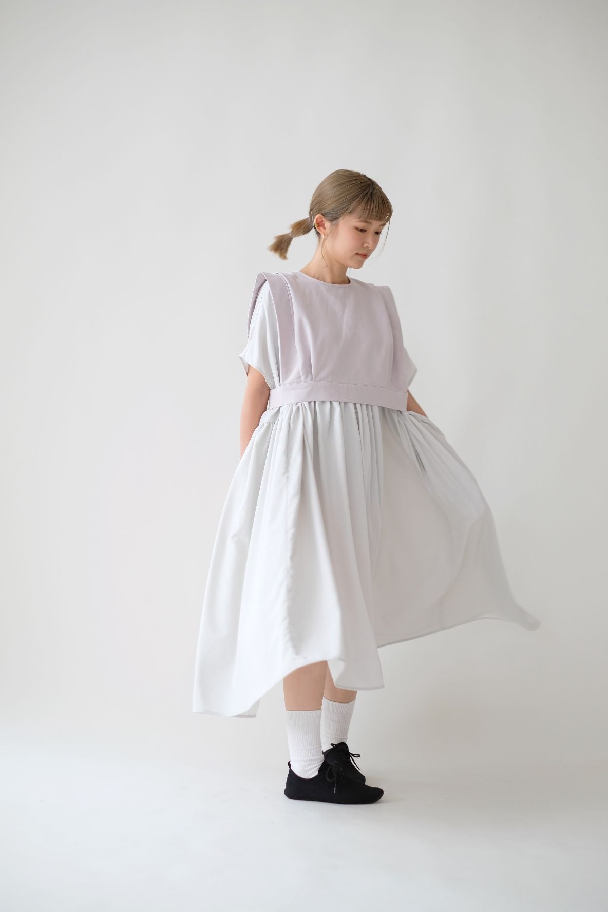 裙子的傘形剪裁和中長寬闊的下擺設計可單獨穿著或加上外套裙子選用挺身的布料製作透氣度和飄逸感都十分高A字形裙擺和帶皺褶的車邊設計讓原本簡潔的平面增添層次感