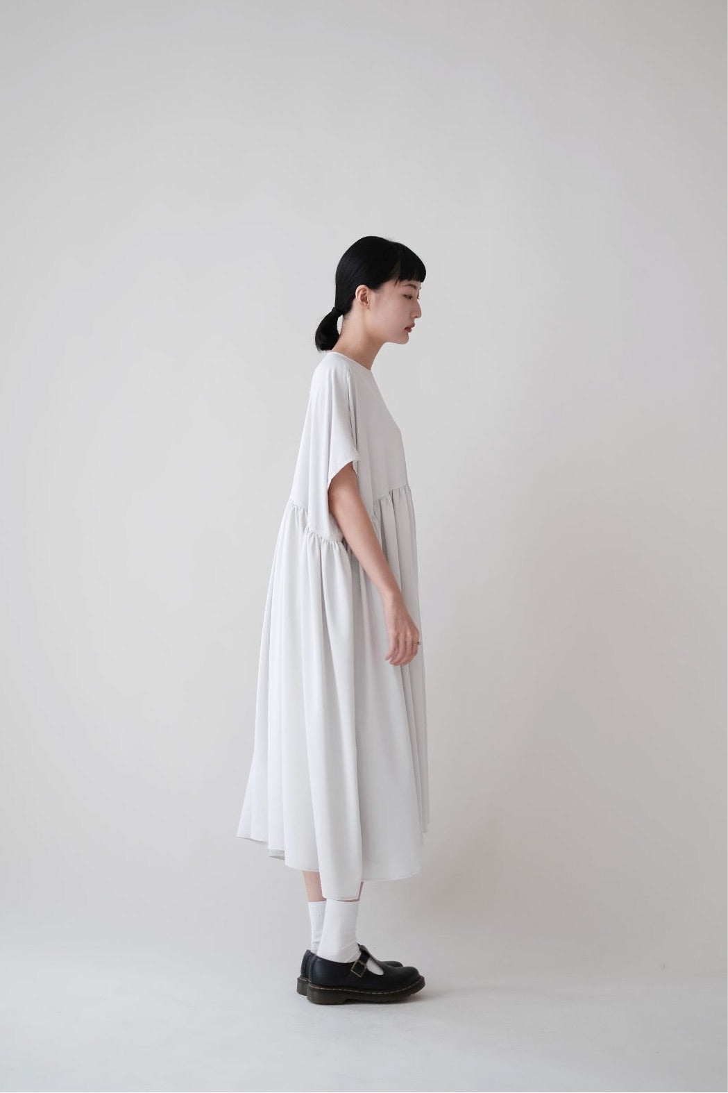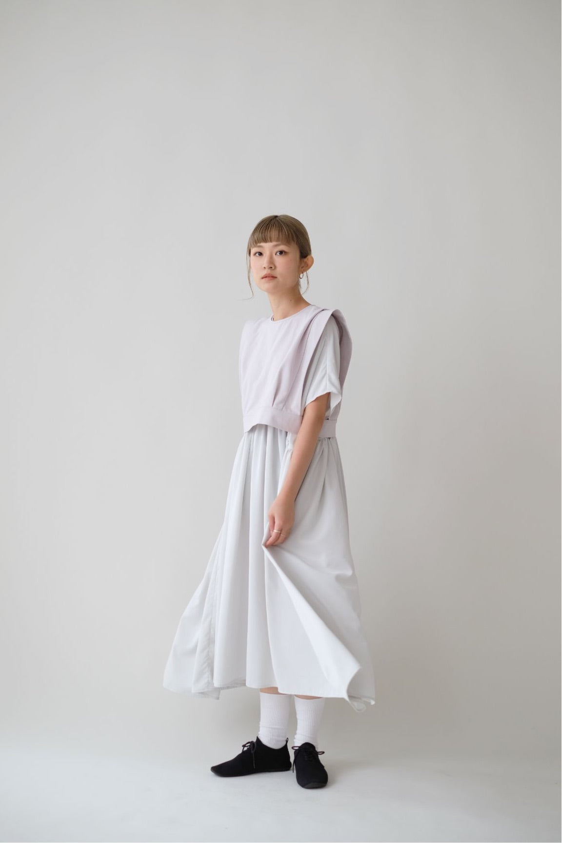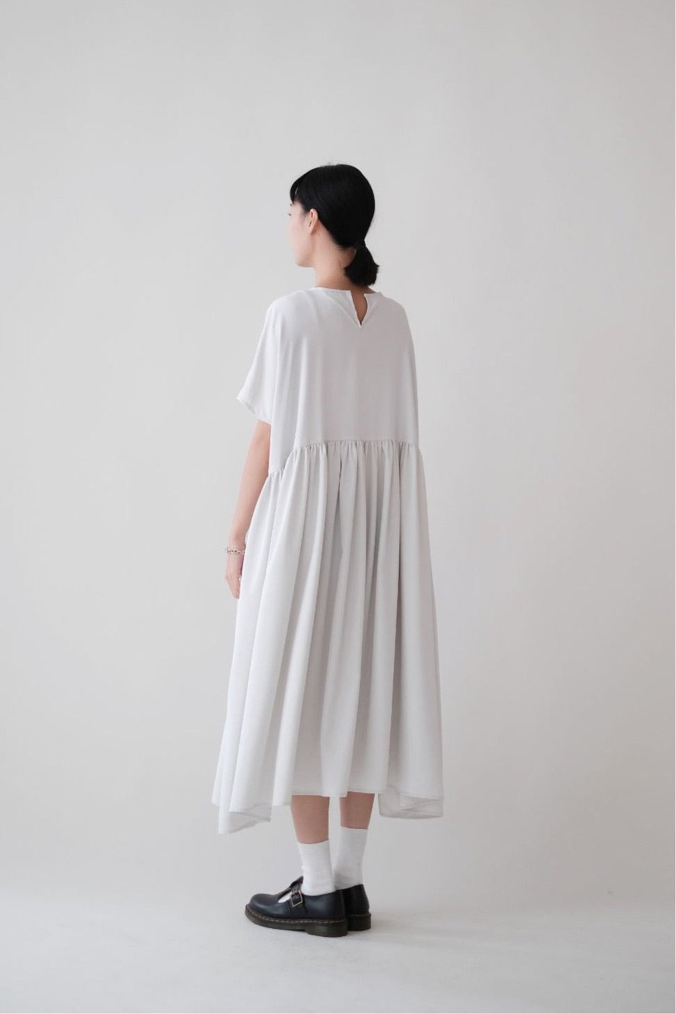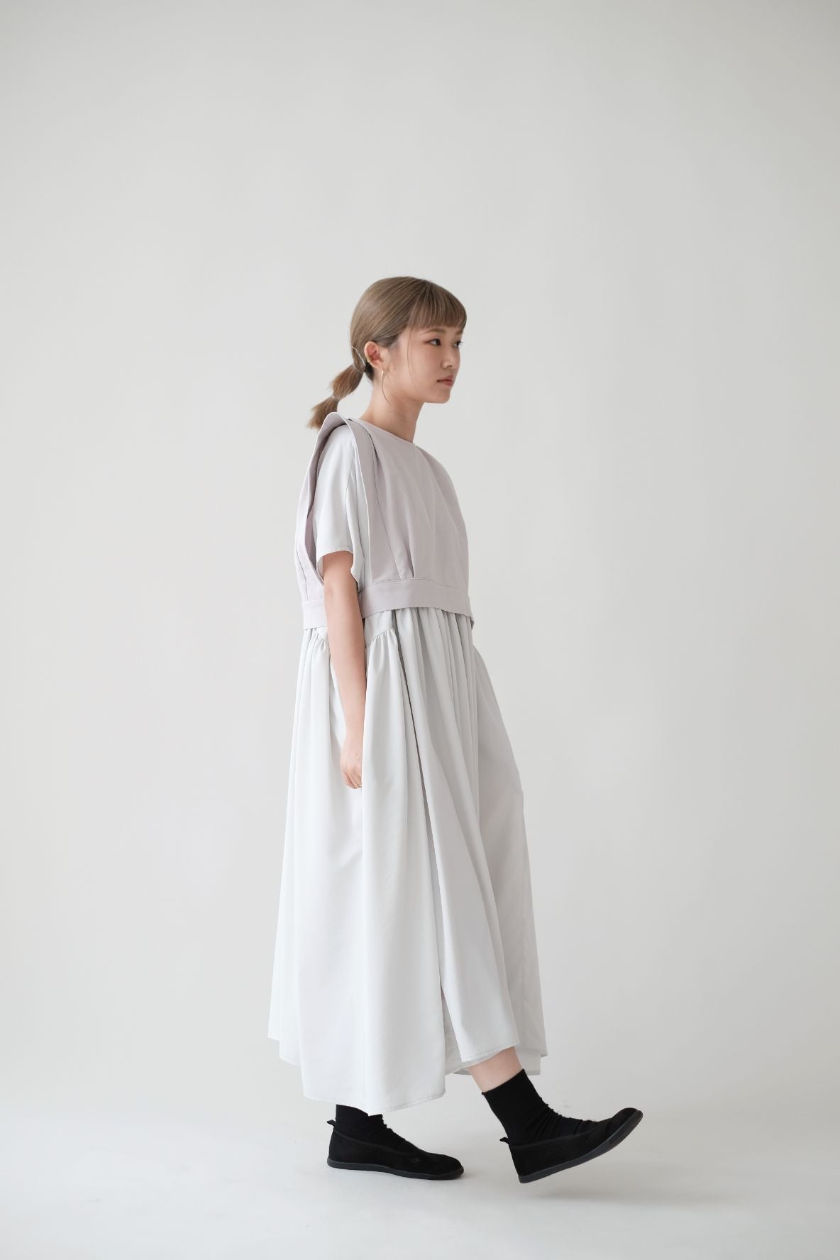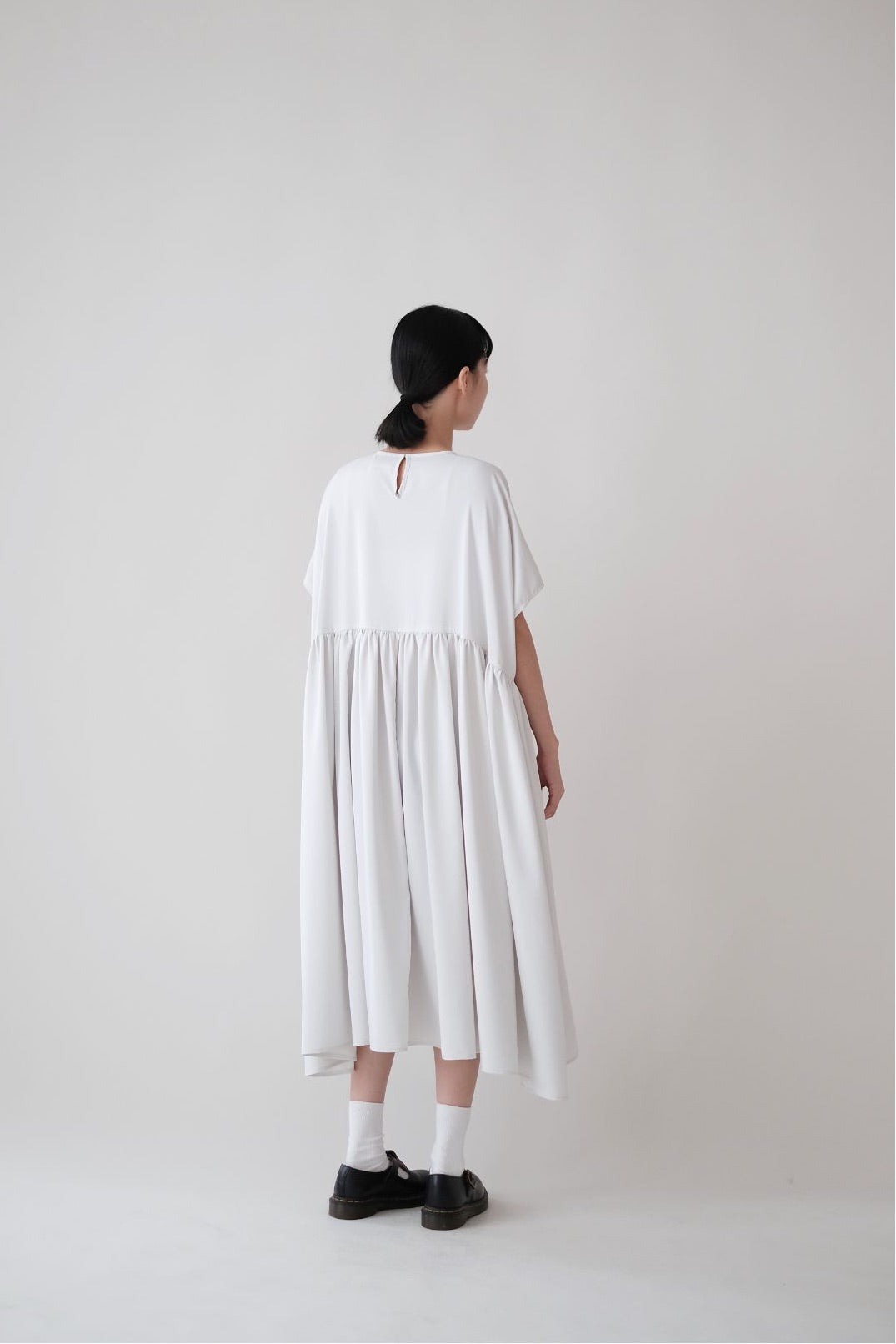 裙子的傘形剪裁和中長寬闊的下擺設計可單獨穿著或加上外套裙子選用挺身的布料製作透氣度和飄逸感都十分高A字形裙擺和帶皺褶的車邊設計讓原本簡潔的平面增添層次感