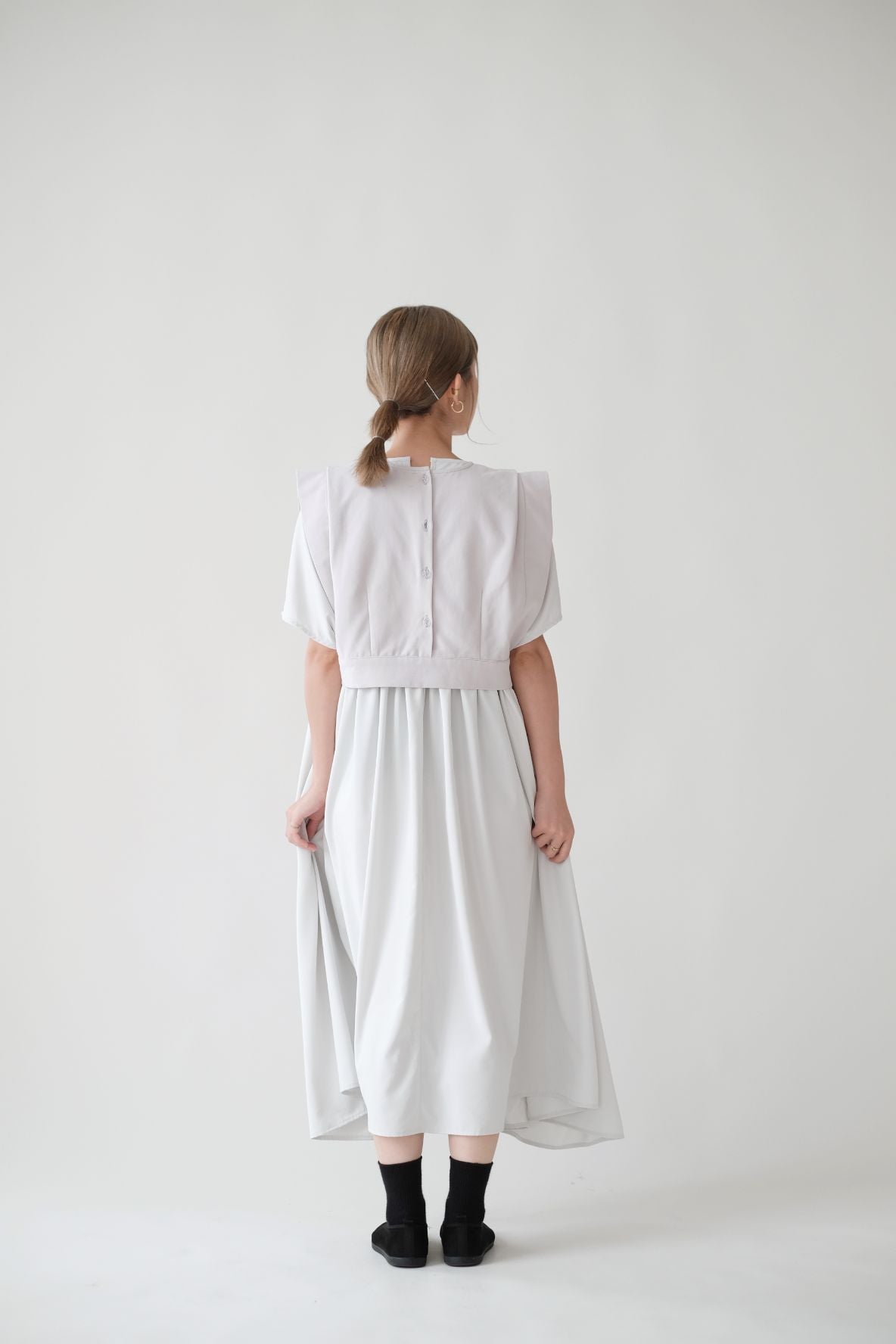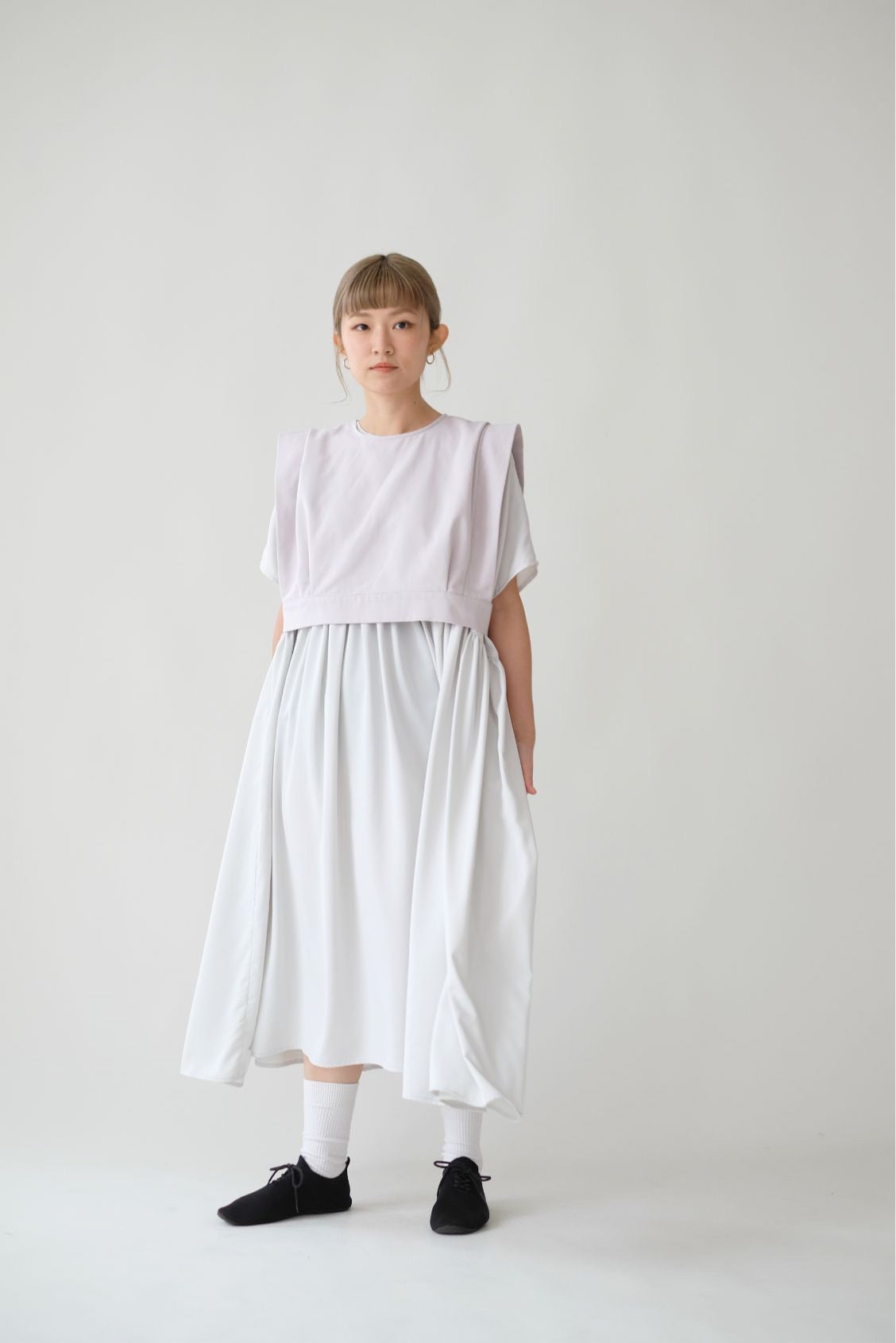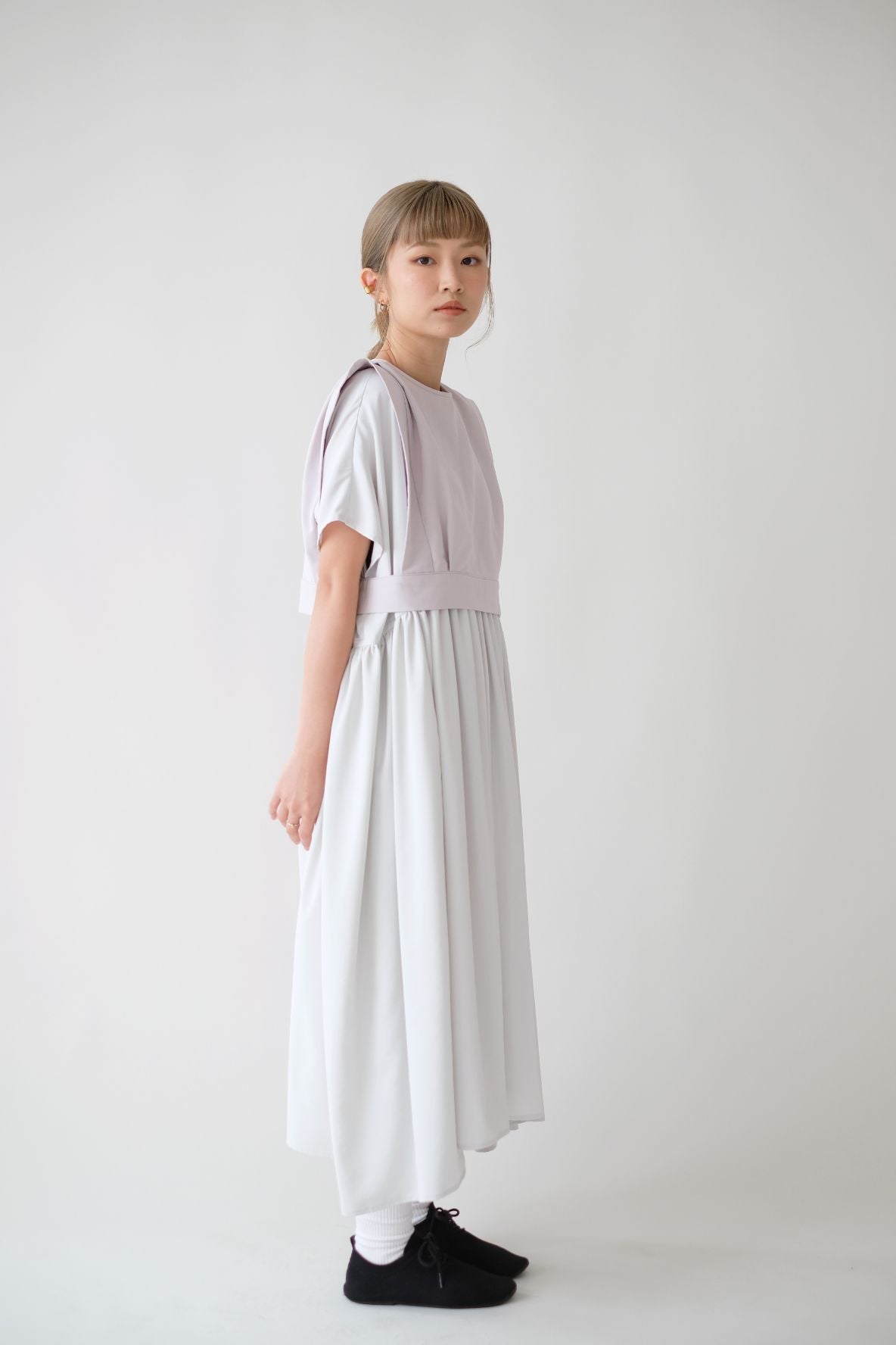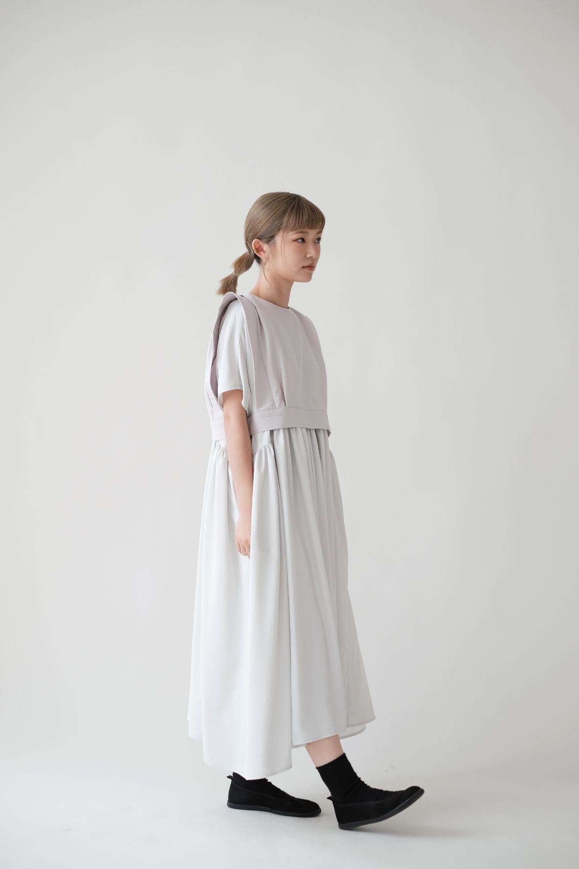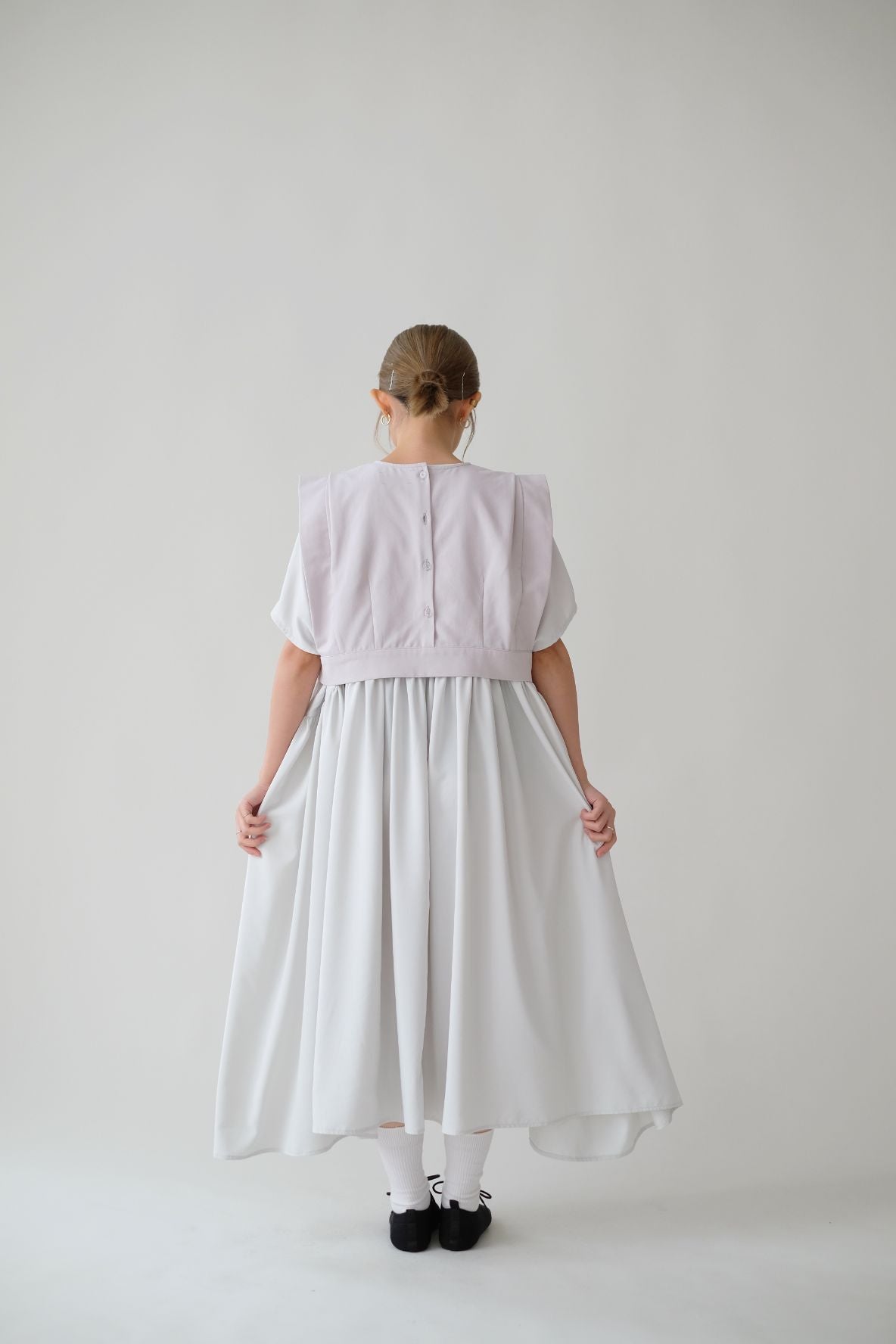 裙子的傘形剪裁和中長寬闊的下擺設計可單獨穿著或加上外套裙子選用挺身的布料製作透氣度和飄逸感都十分高A字形裙擺和帶皺褶的車邊設計讓原本簡潔的平面增添層次感