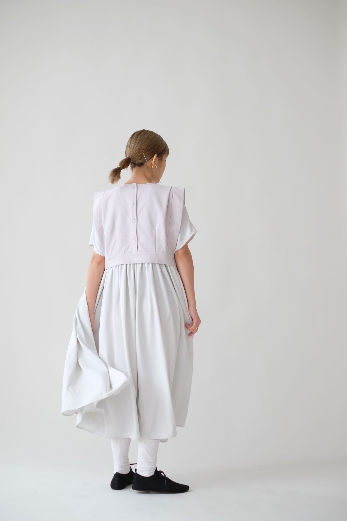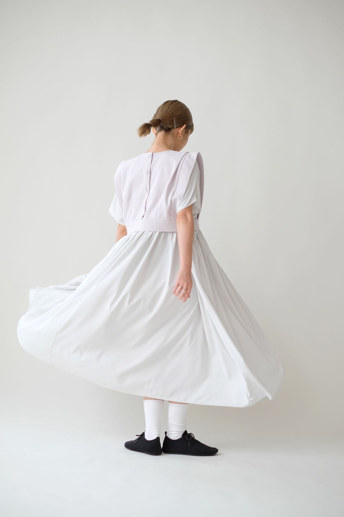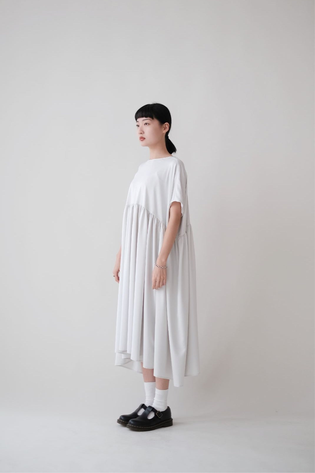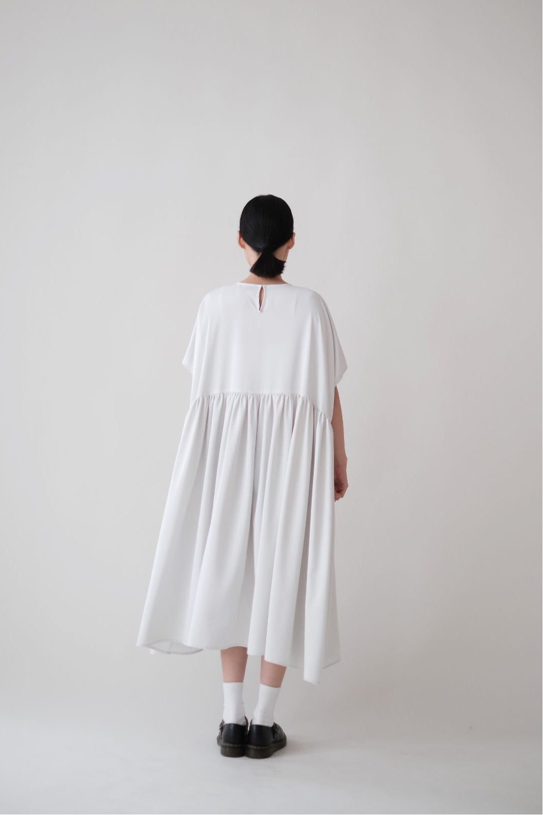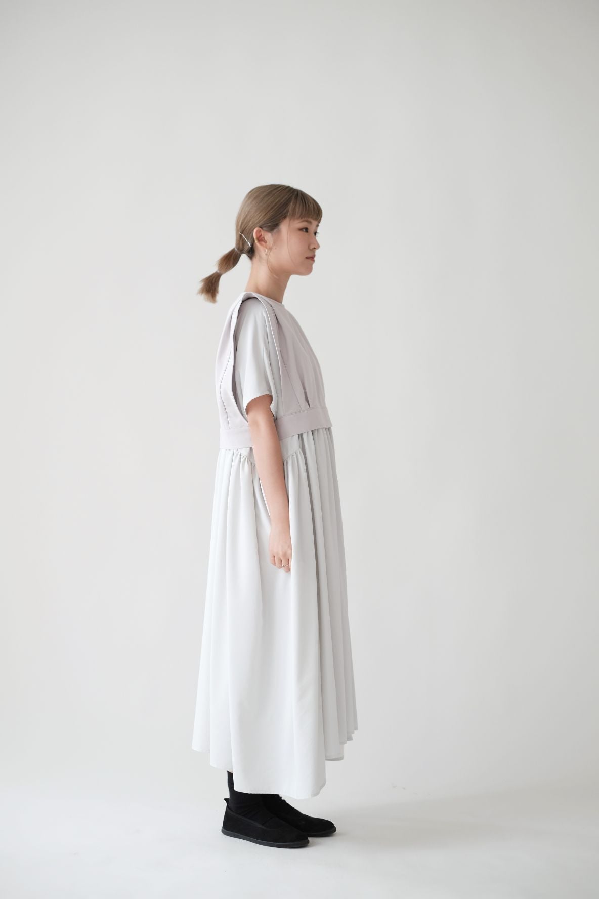 裙子的傘形剪裁和中長寬闊的下擺設計可單獨穿著或加上外套裙子選用挺身的布料製作透氣度和飄逸感都十分高A字形裙擺和帶皺褶的車邊設計讓原本簡潔的平面增添層次感