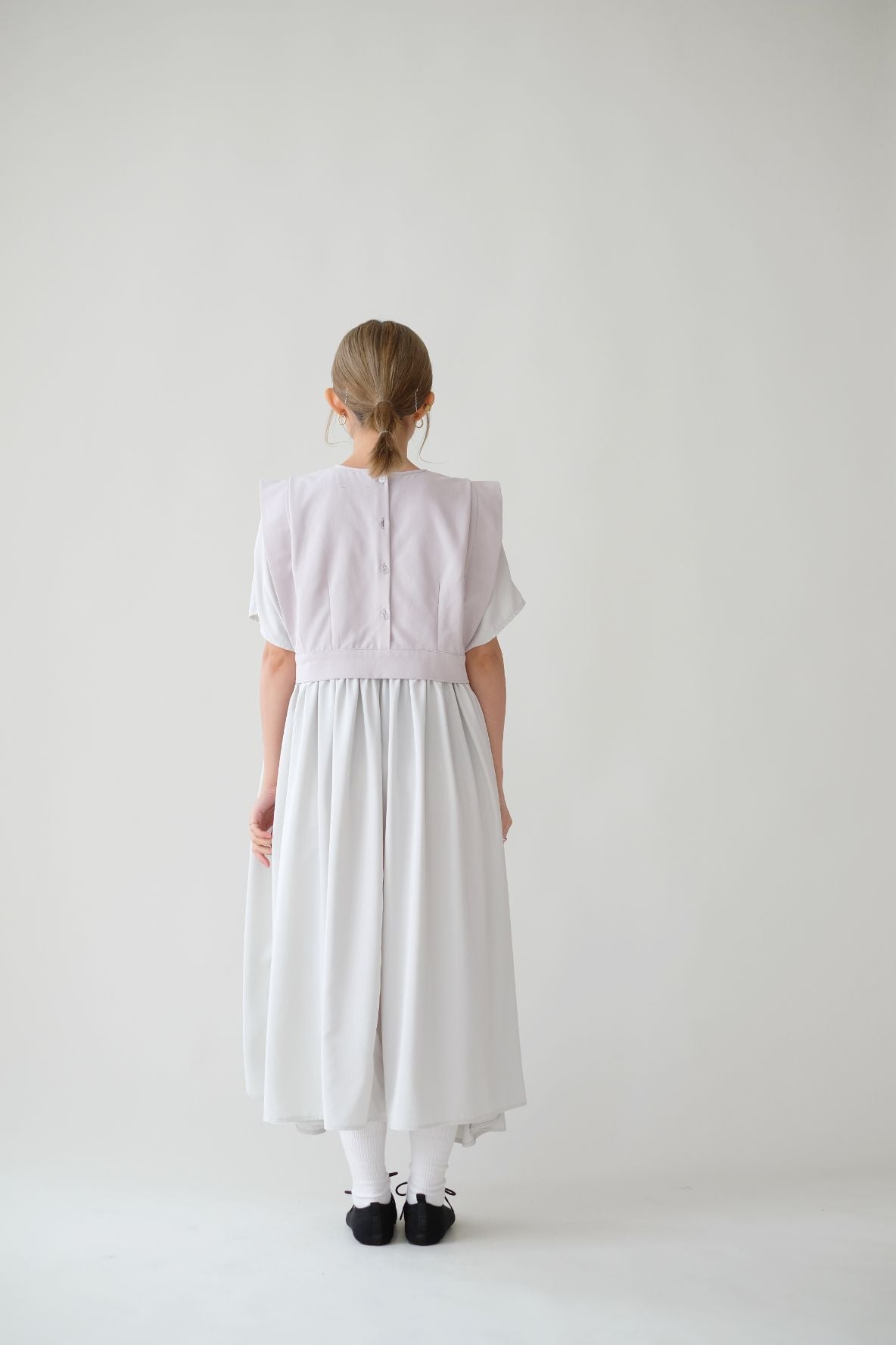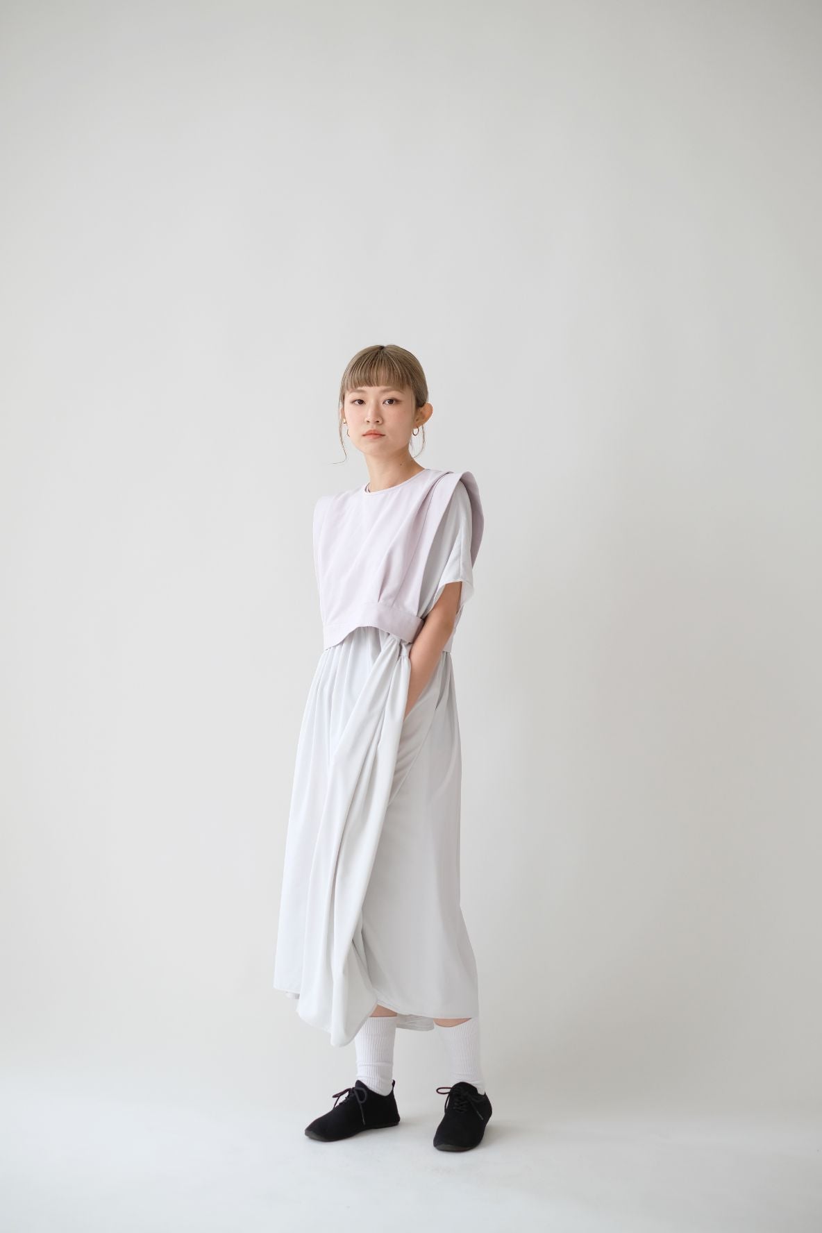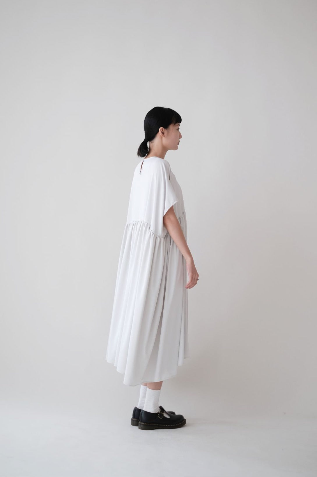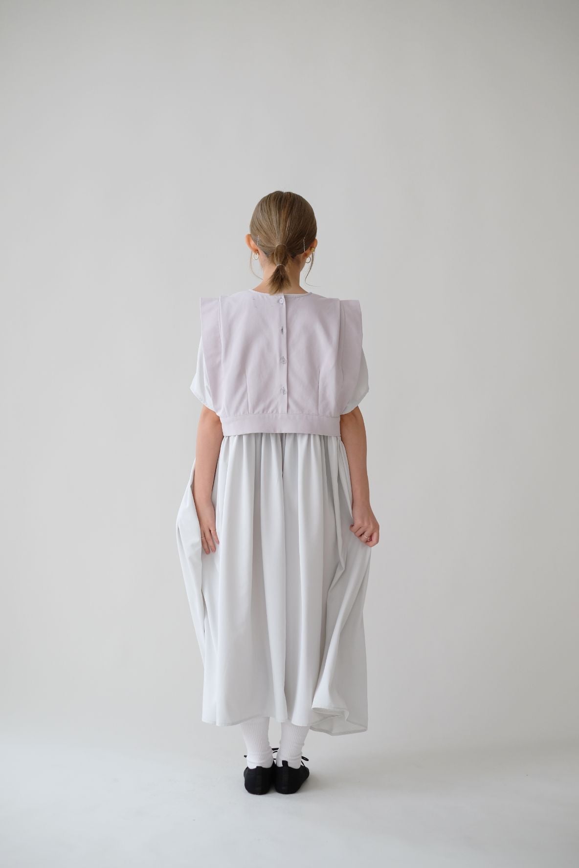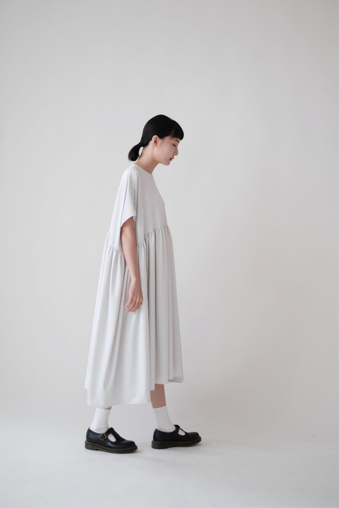 裙子的傘形剪裁和中長寬闊的下擺設計可單獨穿著或加上外套裙子選用挺身的布料製作透氣度和飄逸感都十分高A字形裙擺和帶皺褶的車邊設計讓原本簡潔的平面增添層次感