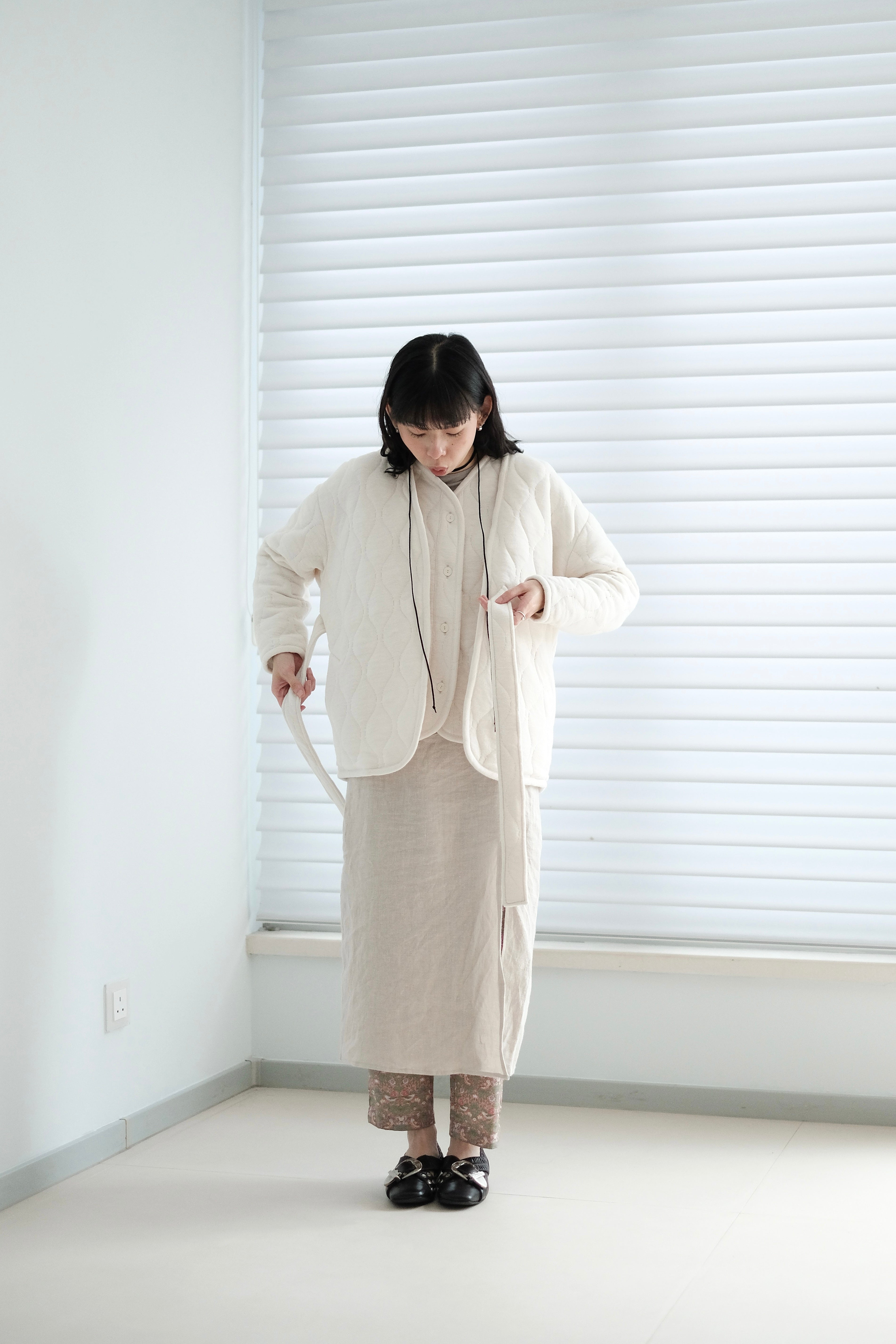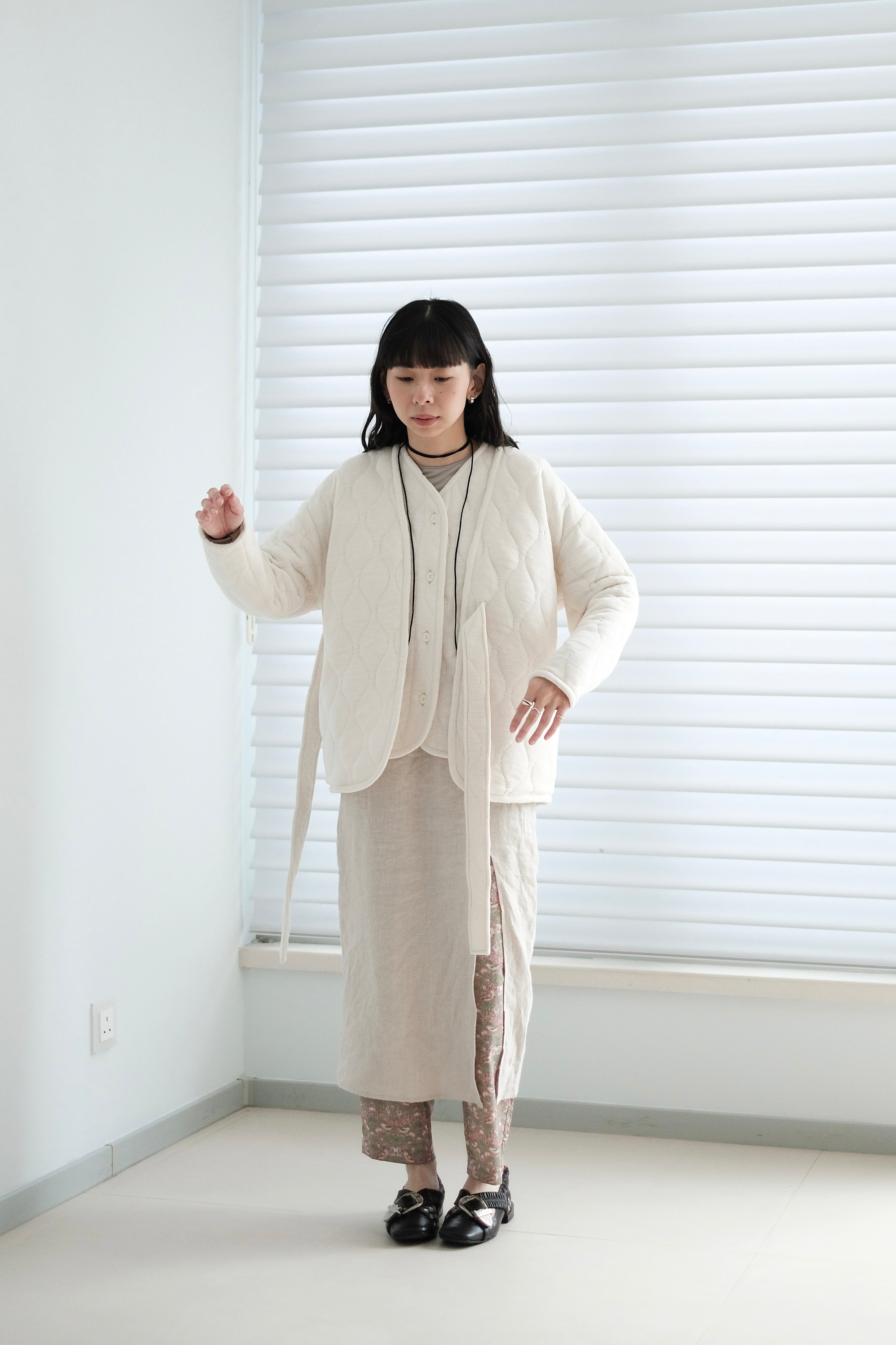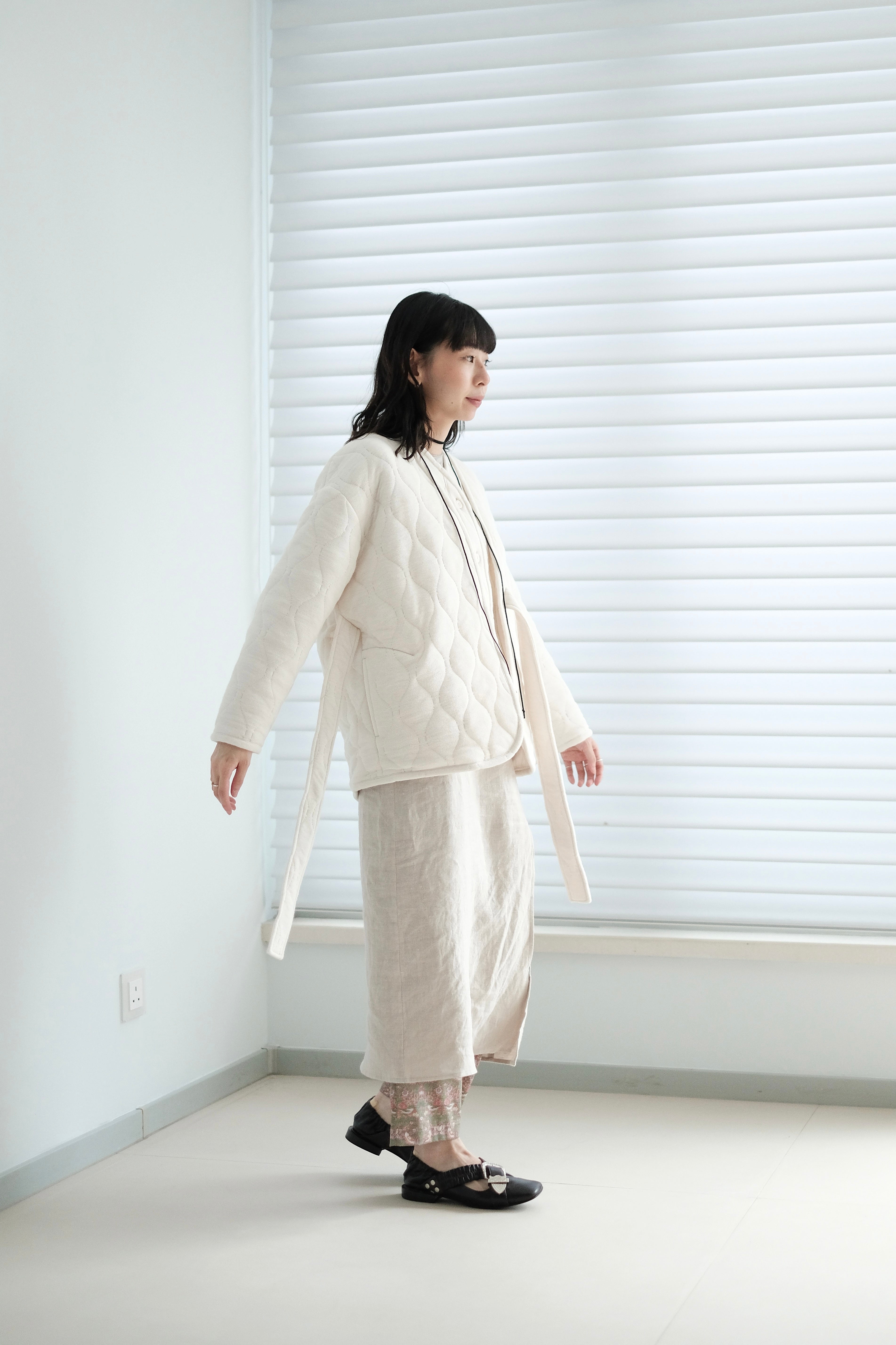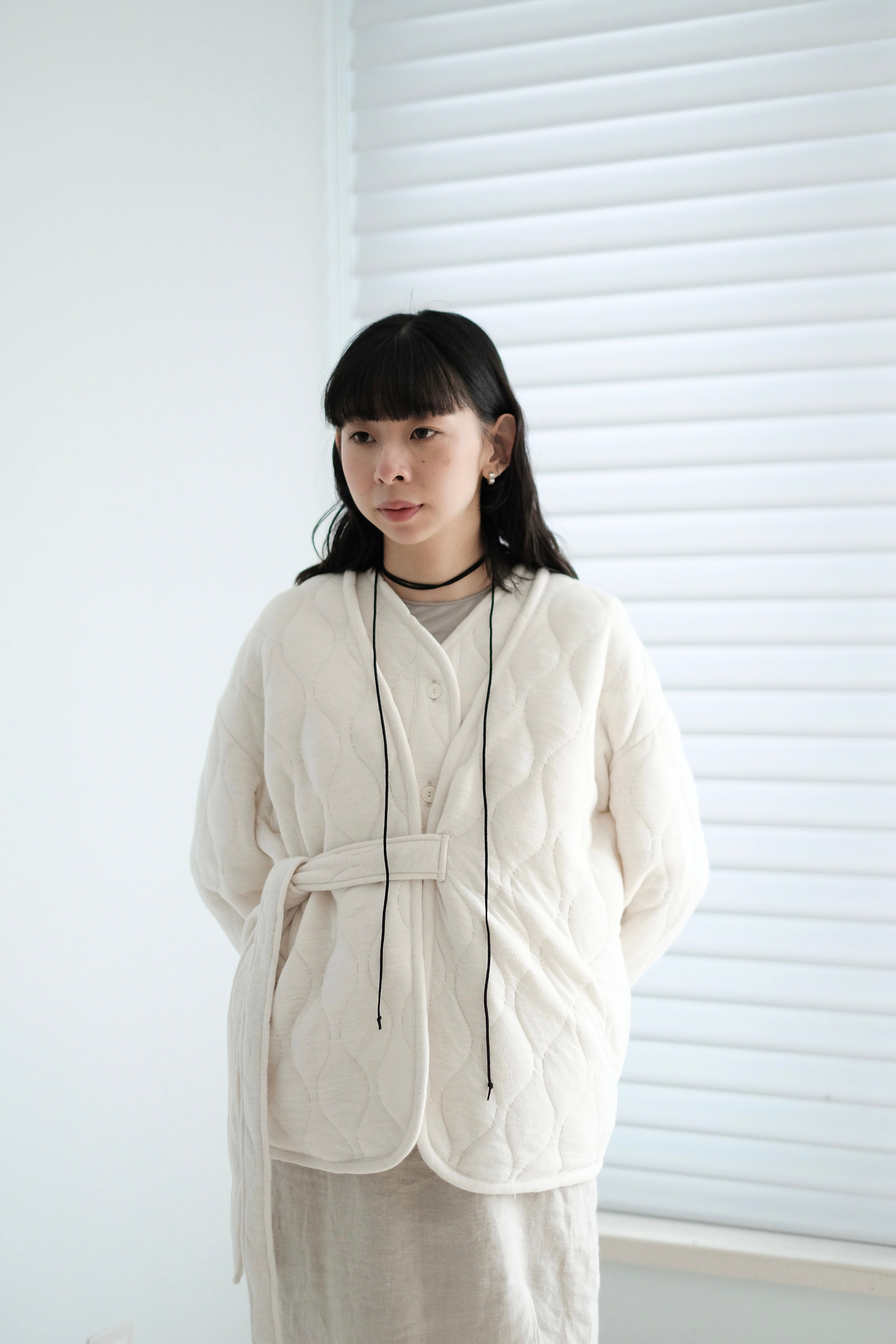 This jacket is crafted from quilted fabric, combining softness and warmth for a comfortable wear. Its classic collarless design showcases minimalist elegance. The matching fabric belt allows for adjustable styling to suit various outfits. Delicate edging along the front opening and cuffs adds a refined touch to the overall design. Lightweight yet layered, this jacket is a versatile and practical choice for everyday wear.