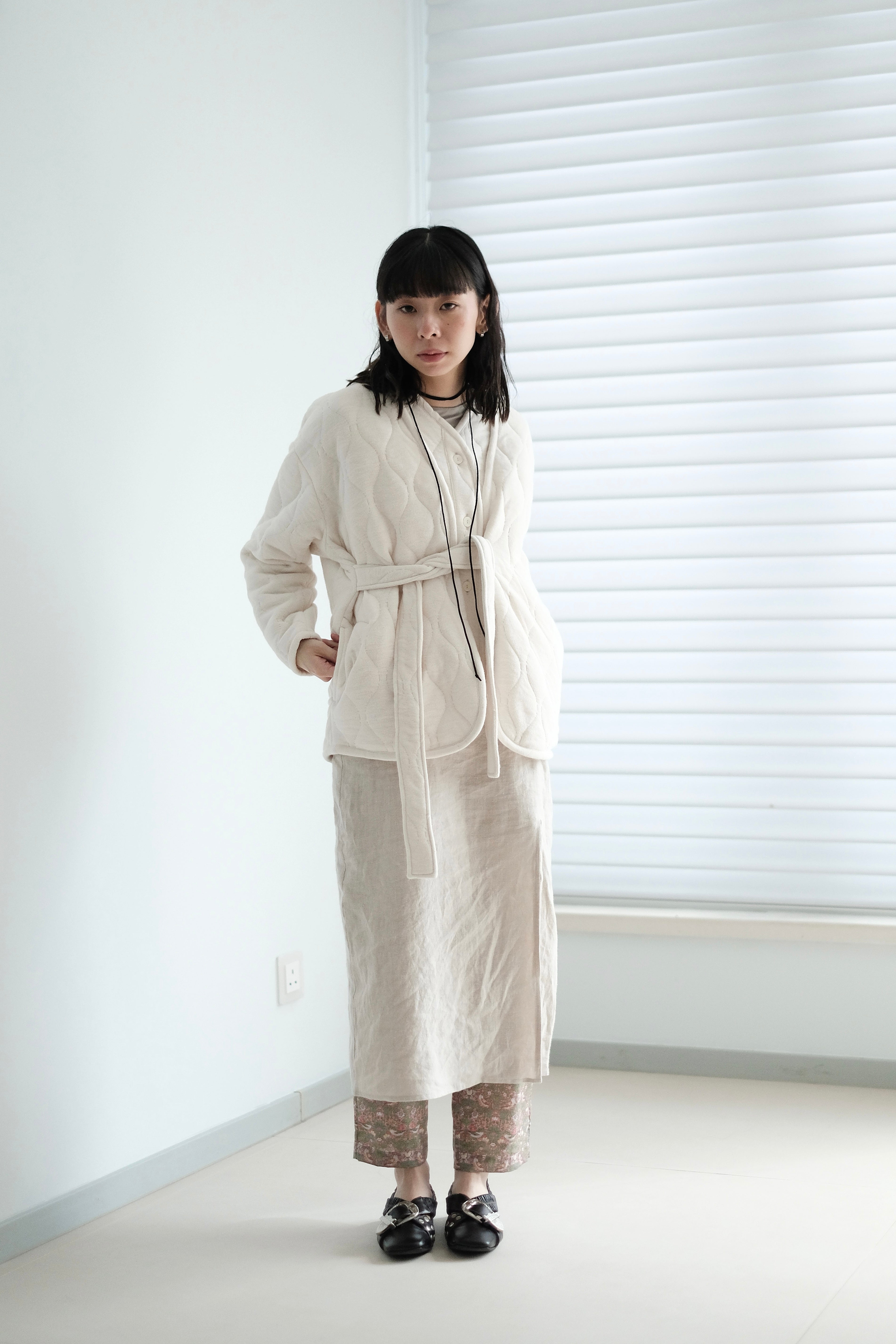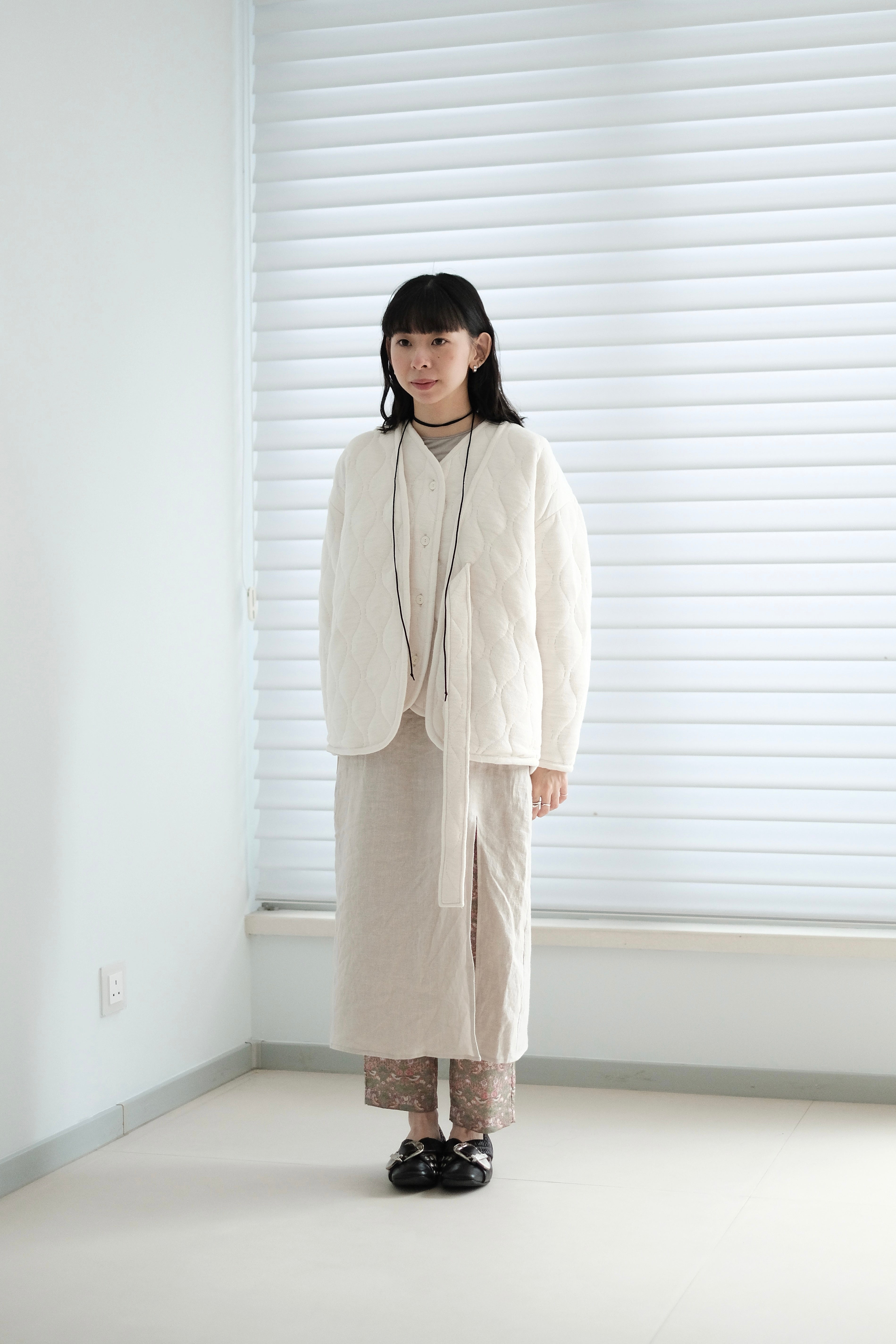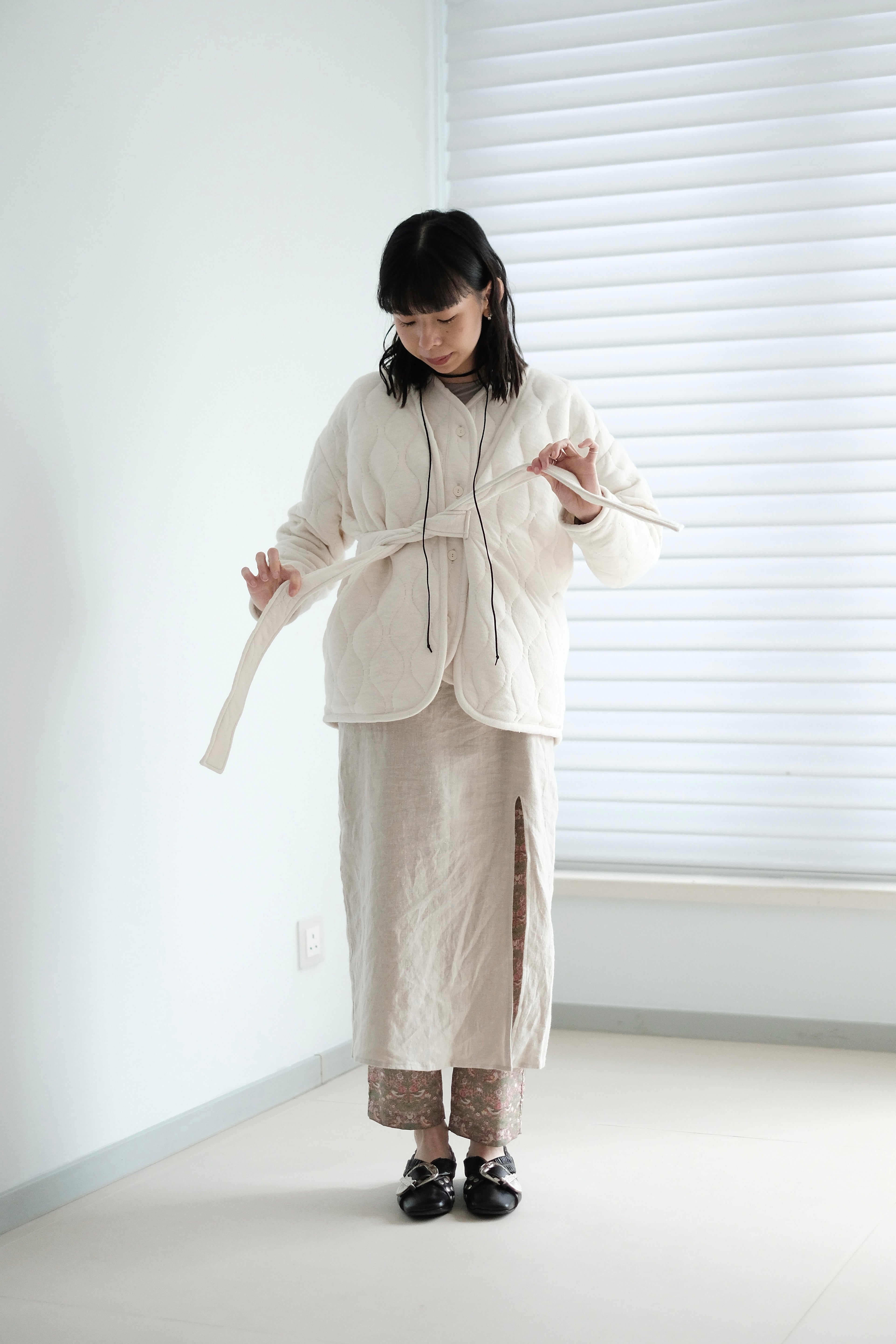 This jacket is crafted from quilted fabric, combining softness and warmth for a comfortable wear. Its classic collarless design showcases minimalist elegance. The matching fabric belt allows for adjustable styling to suit various outfits. Delicate edging along the front opening and cuffs adds a refined touch to the overall design. Lightweight yet layered, this jacket is a versatile and practical choice for everyday wear.