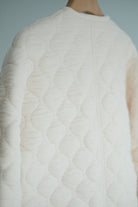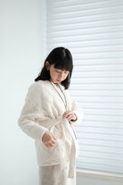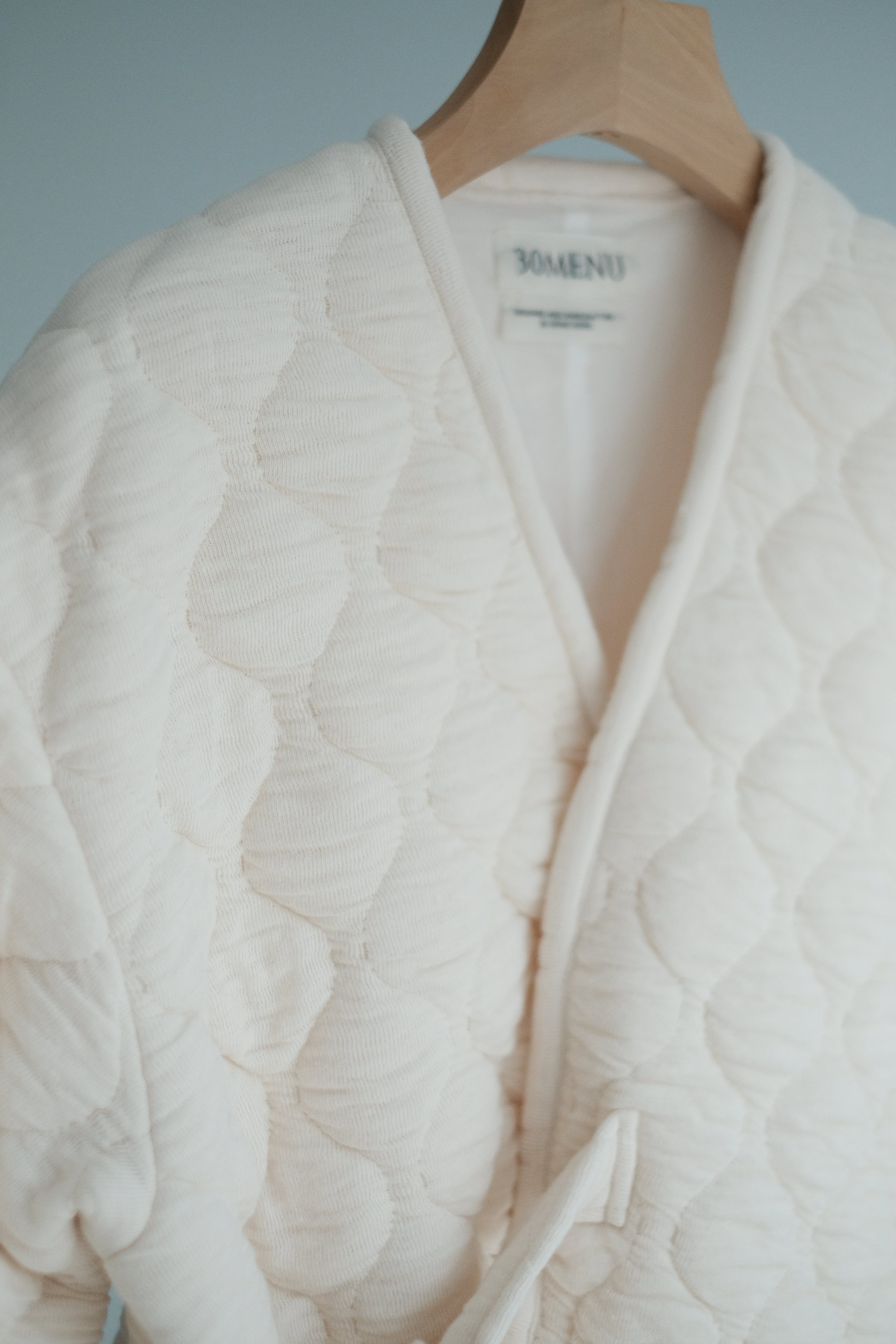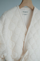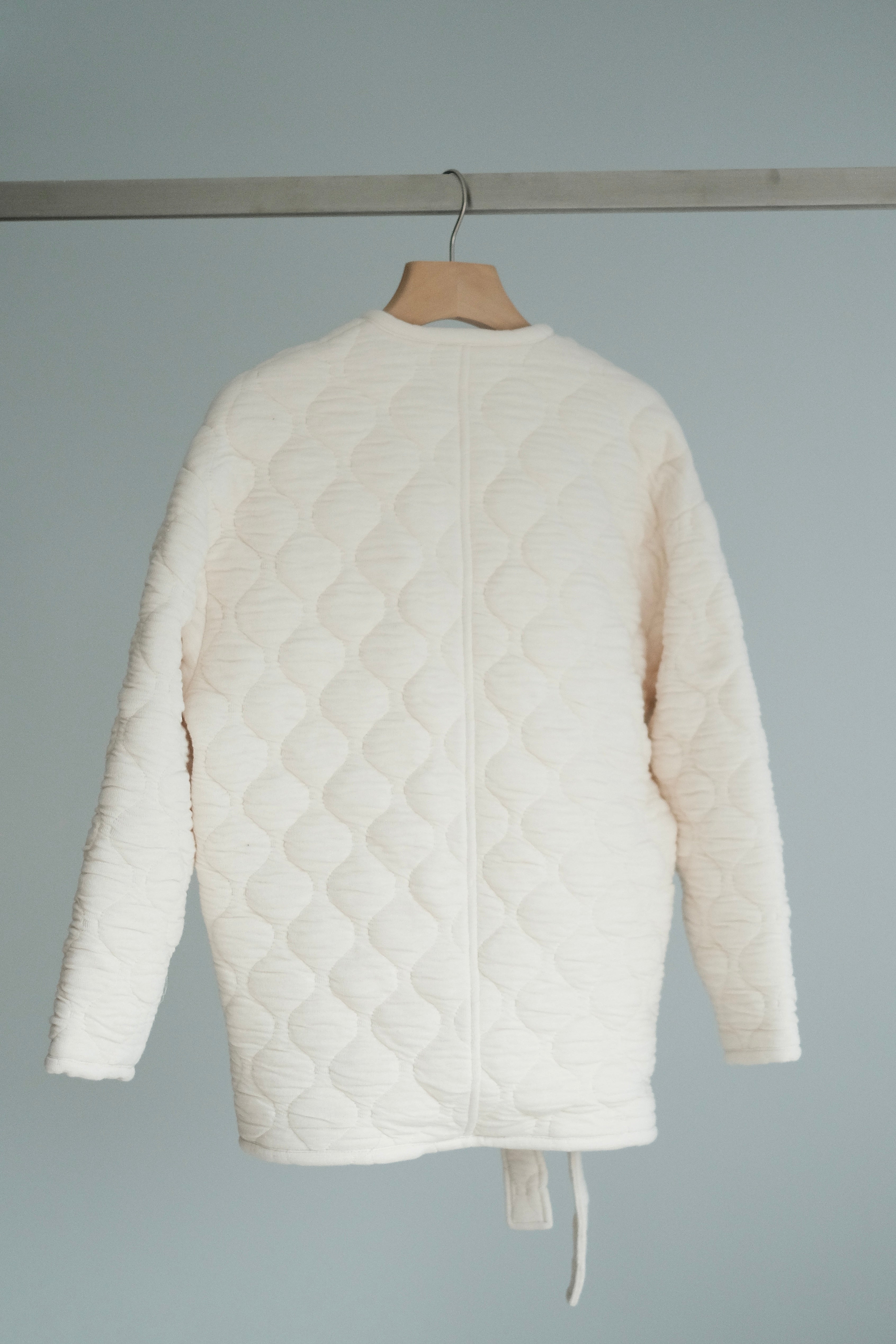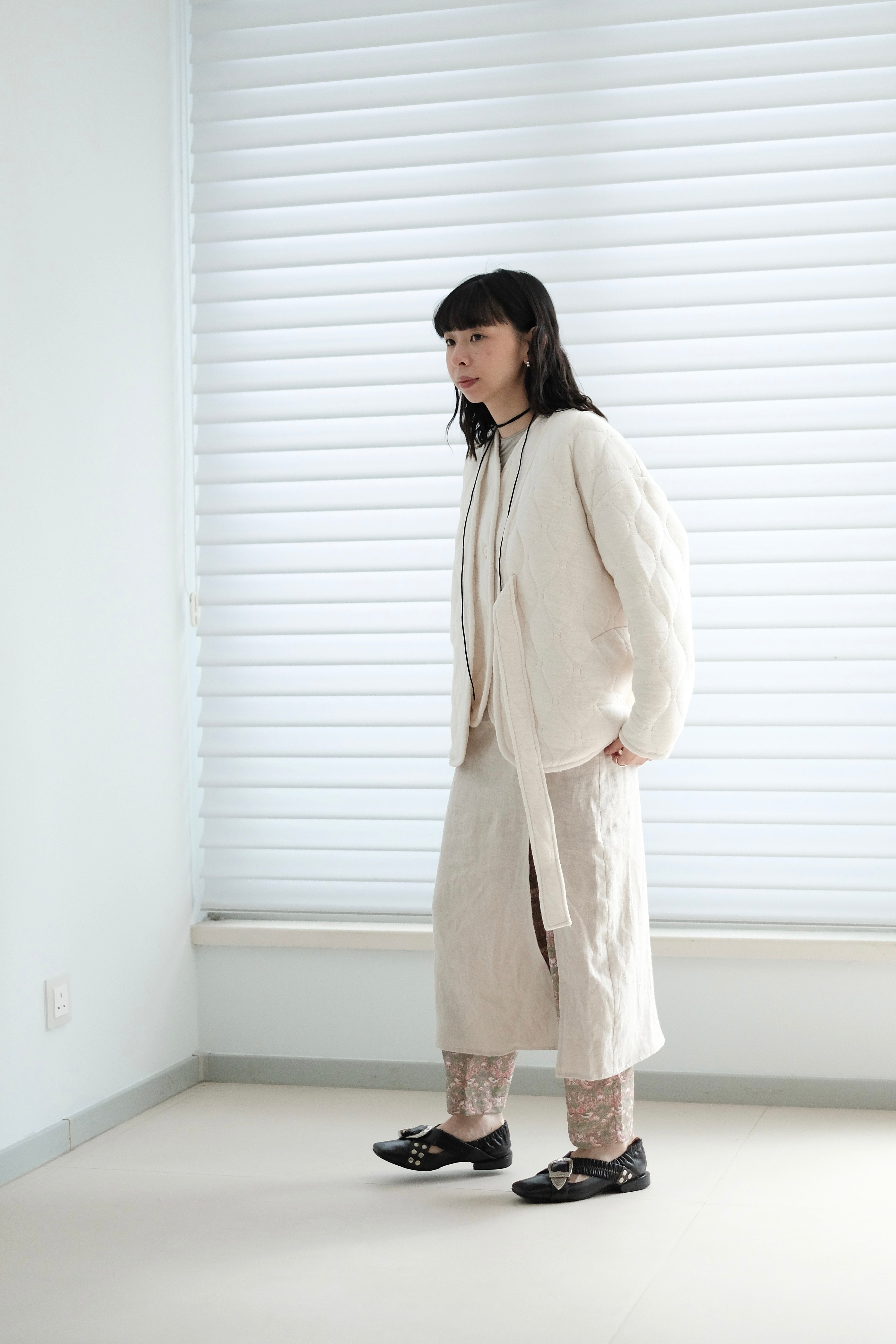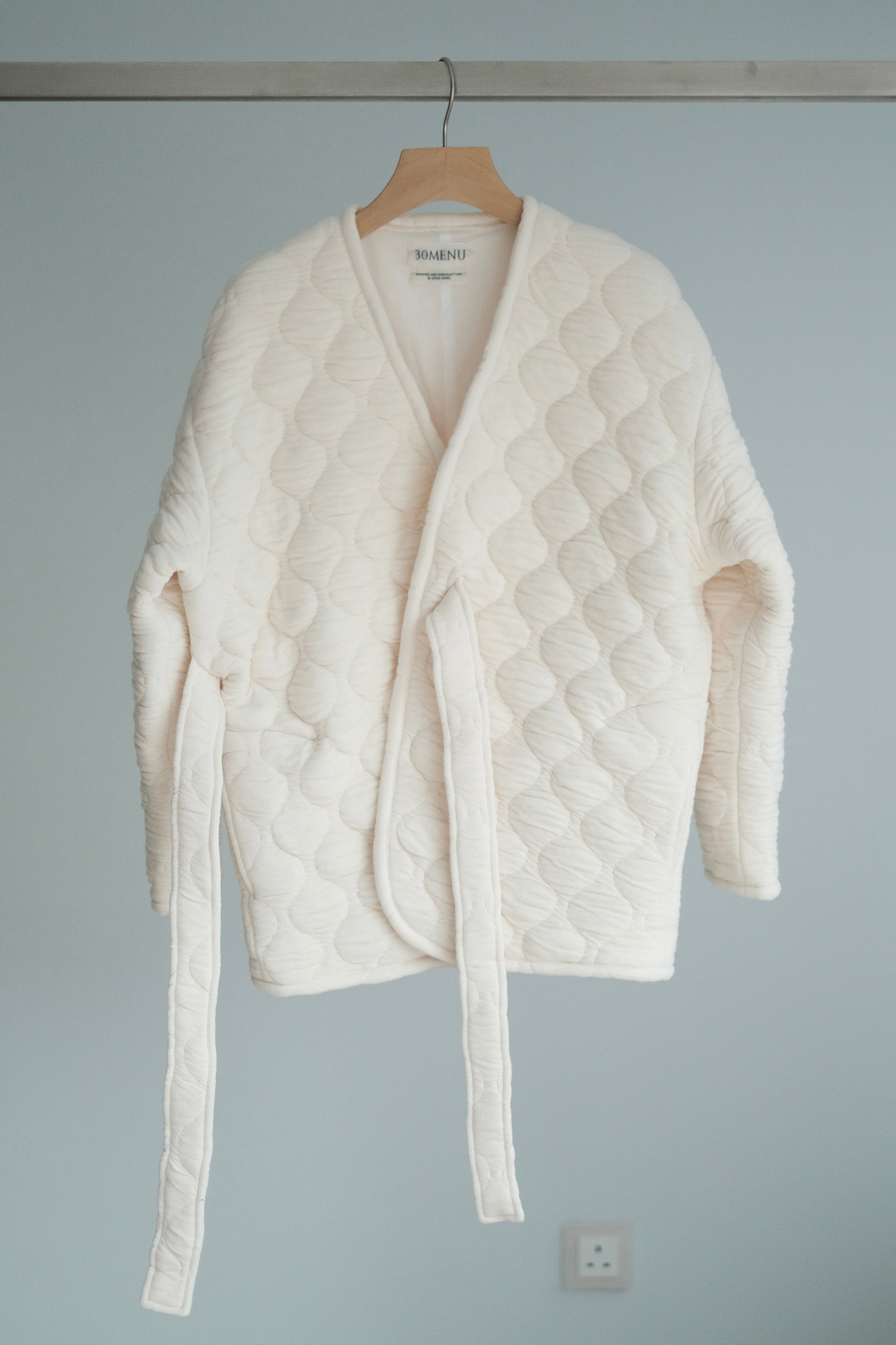 This jacket is crafted from quilted fabric, combining softness and warmth for a comfortable wear. Its classic collarless design showcases minimalist elegance. The matching fabric belt allows for adjustable styling to suit various outfits. Delicate edging along the front opening and cuffs adds a refined touch to the overall design. Lightweight yet layered, this jacket is a versatile and practical choice for everyday wear.