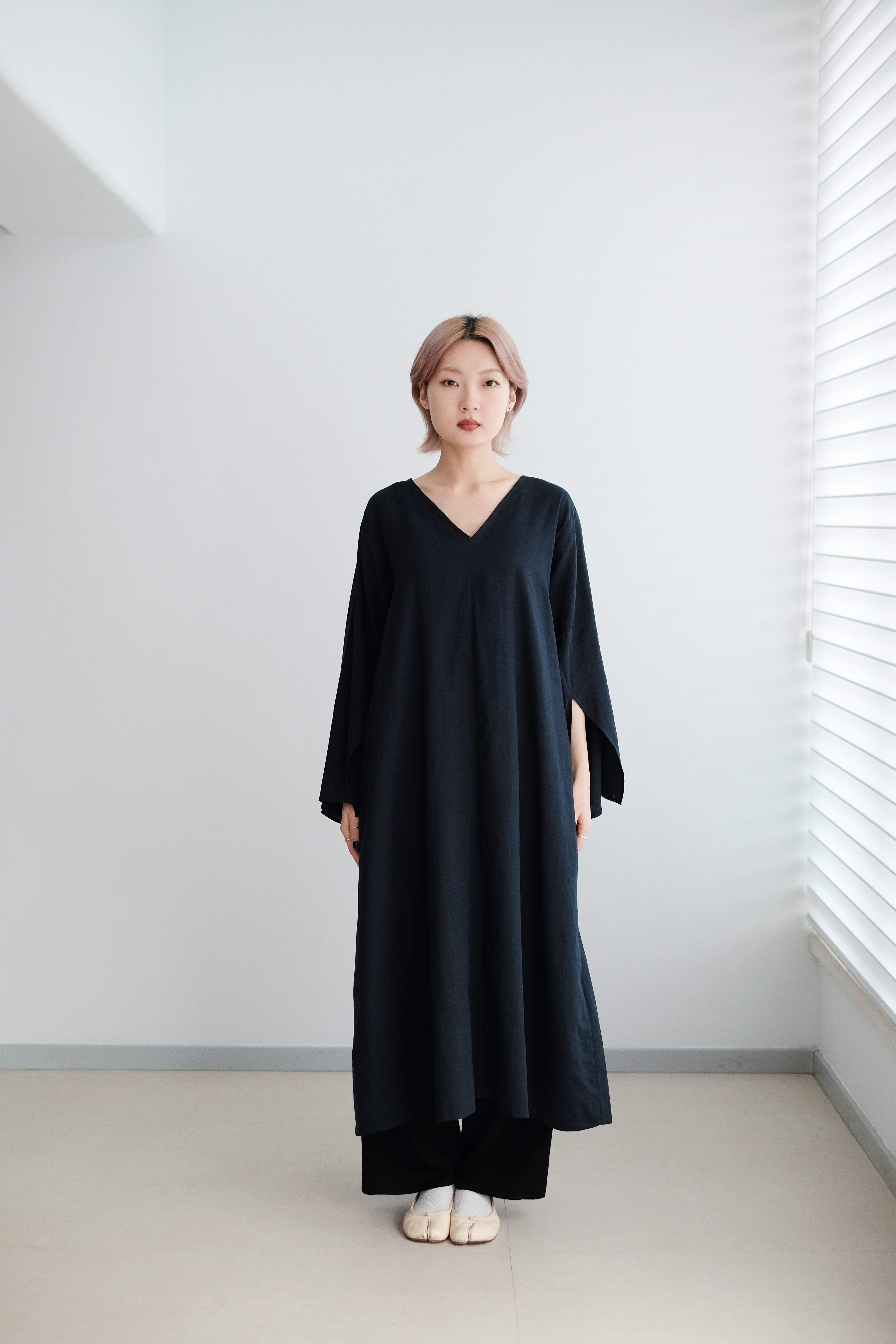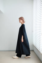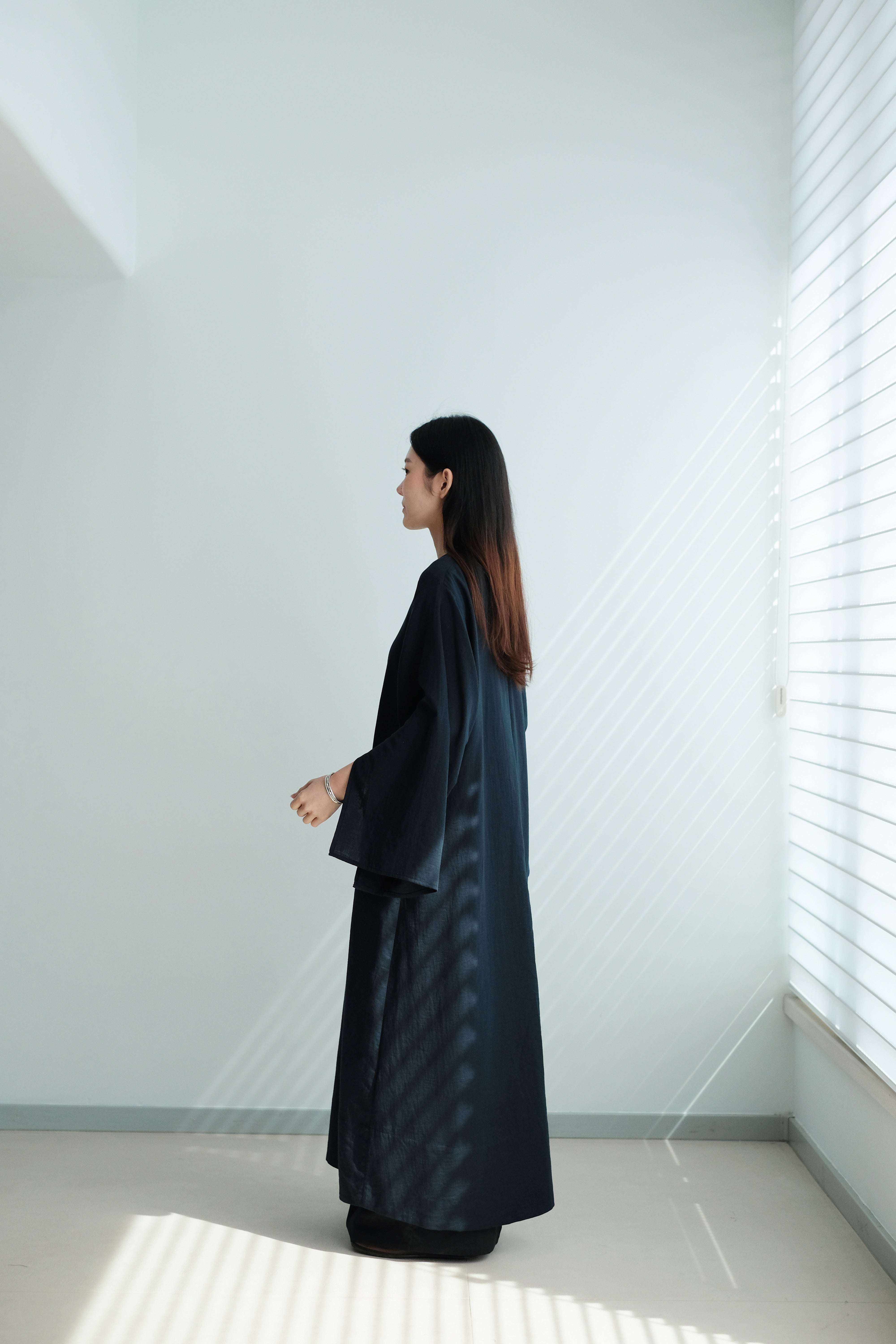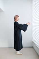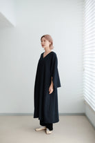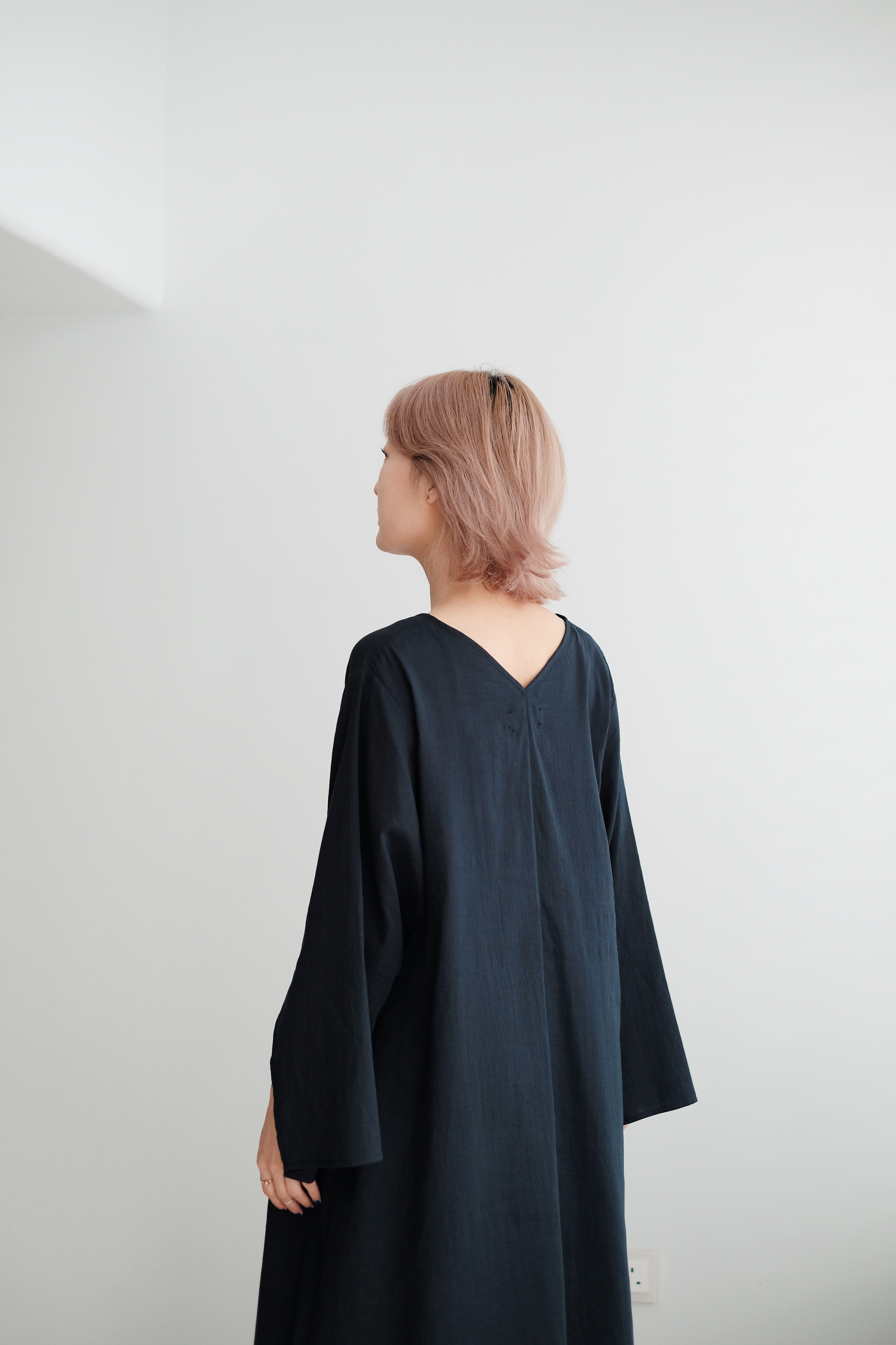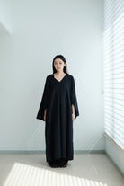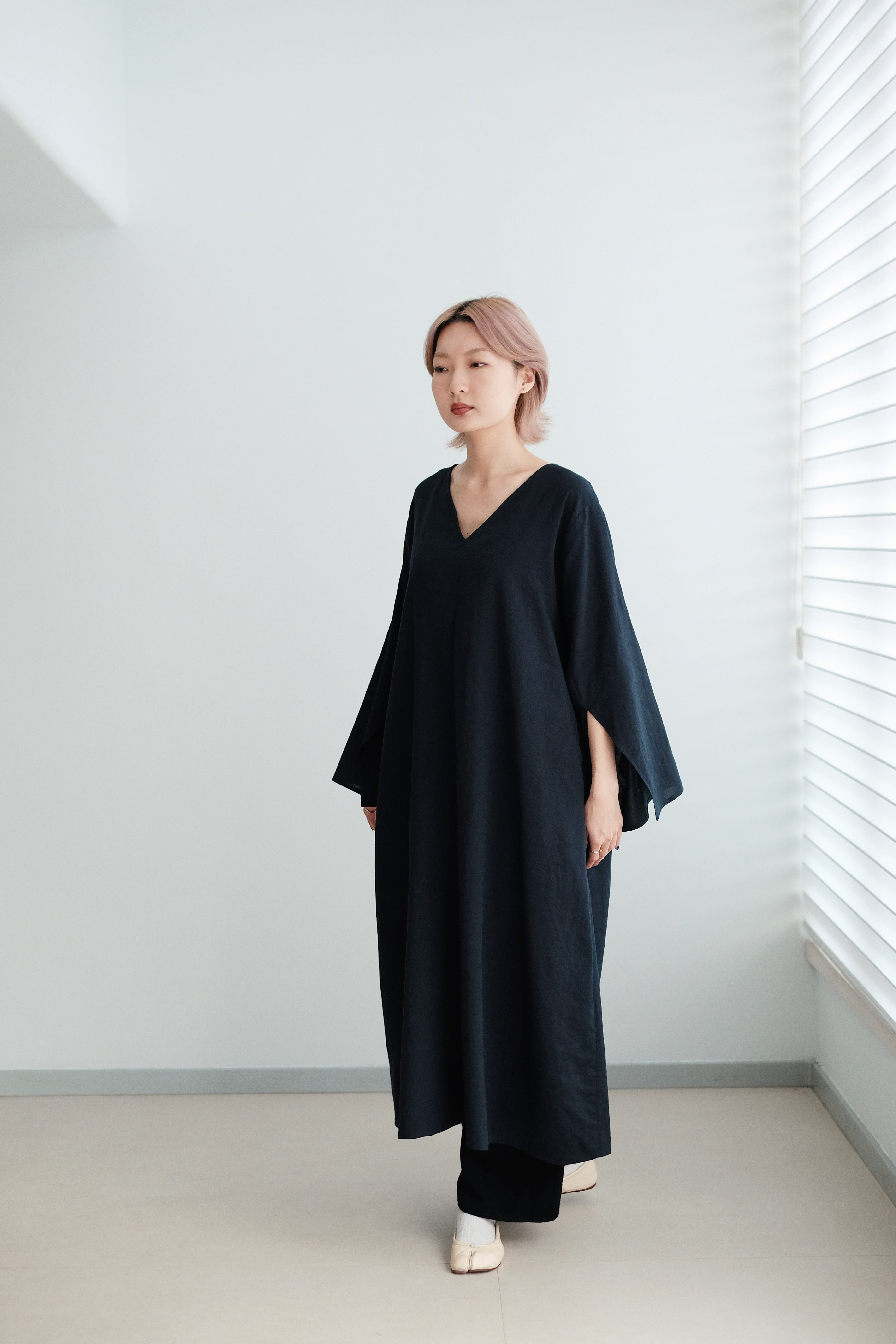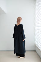 This deep navy kaftan dress is crafted from a soft yet structured fabric that drapes beautifully without looking bulky. Designed with a relaxed silhouette, a clean V-neckline, and wide kimono-style sleeves, it moves elegantly with every step.