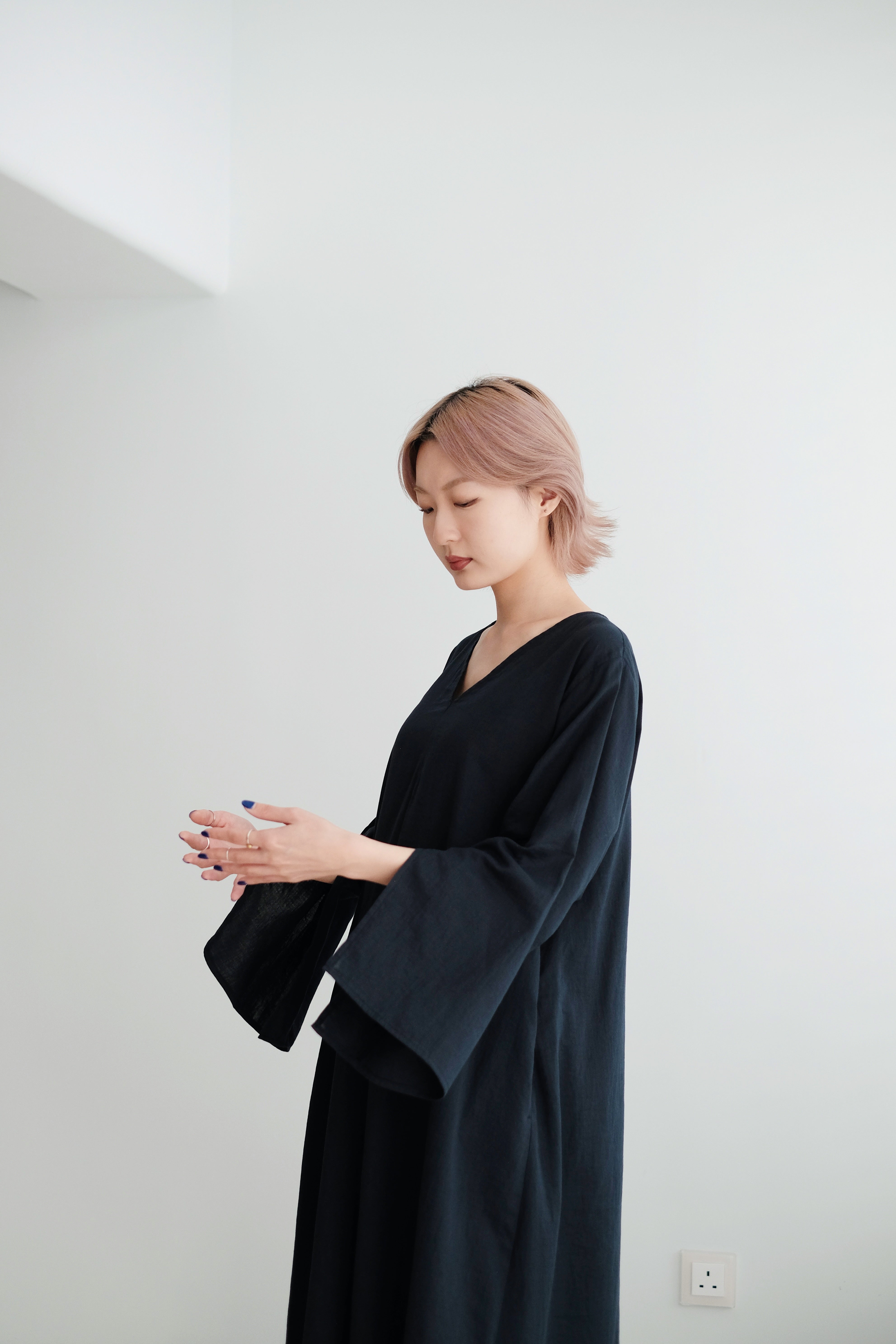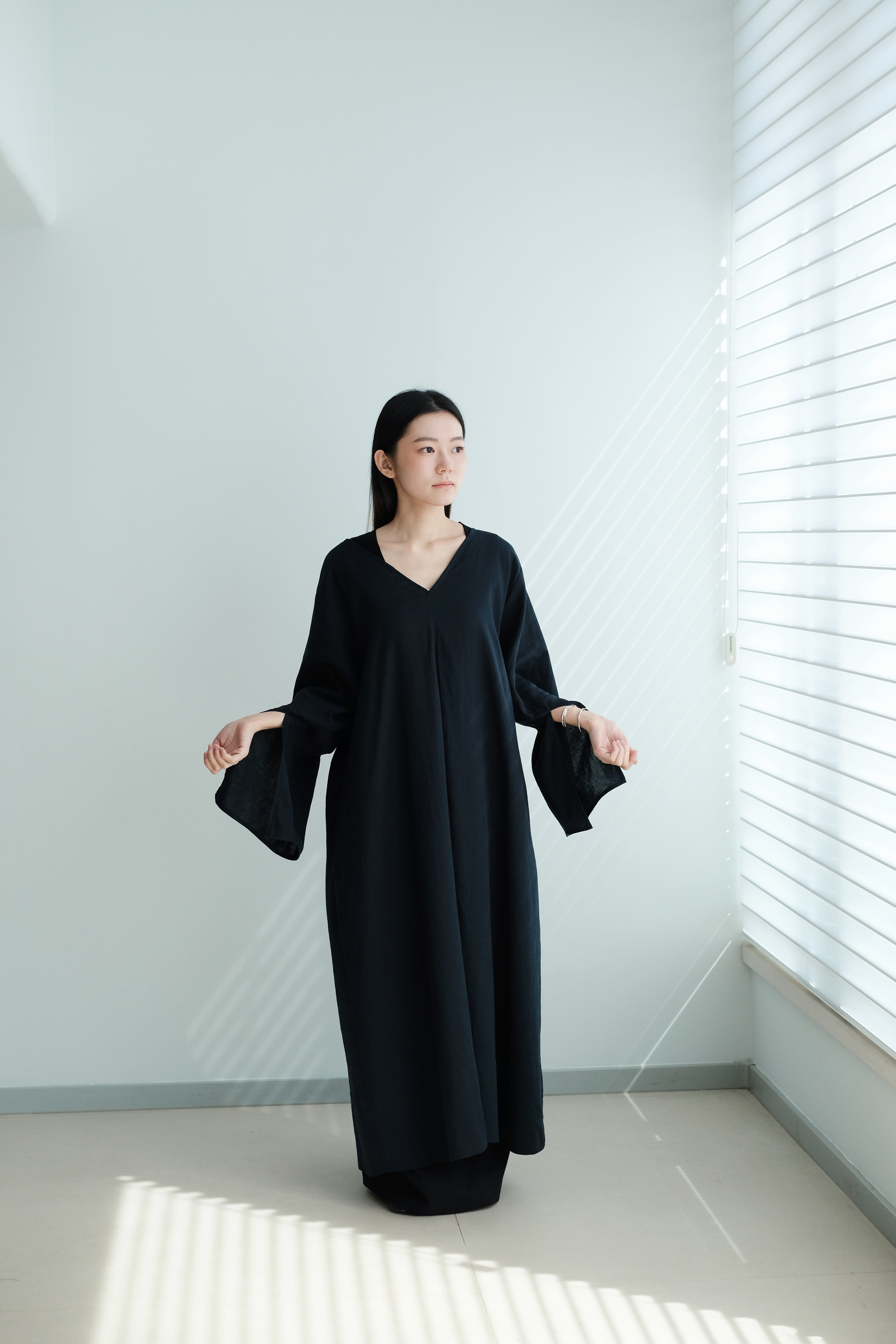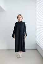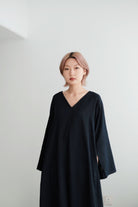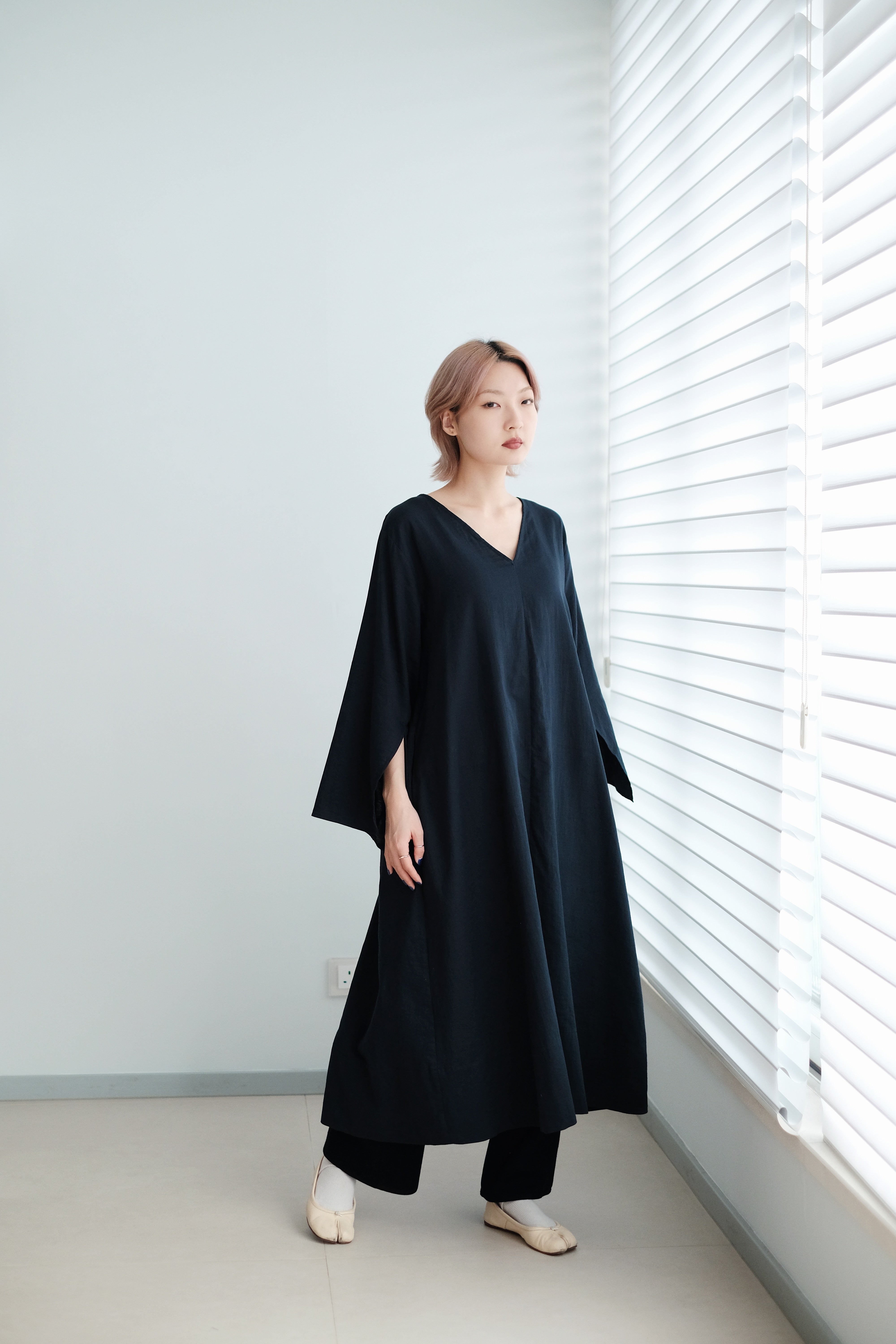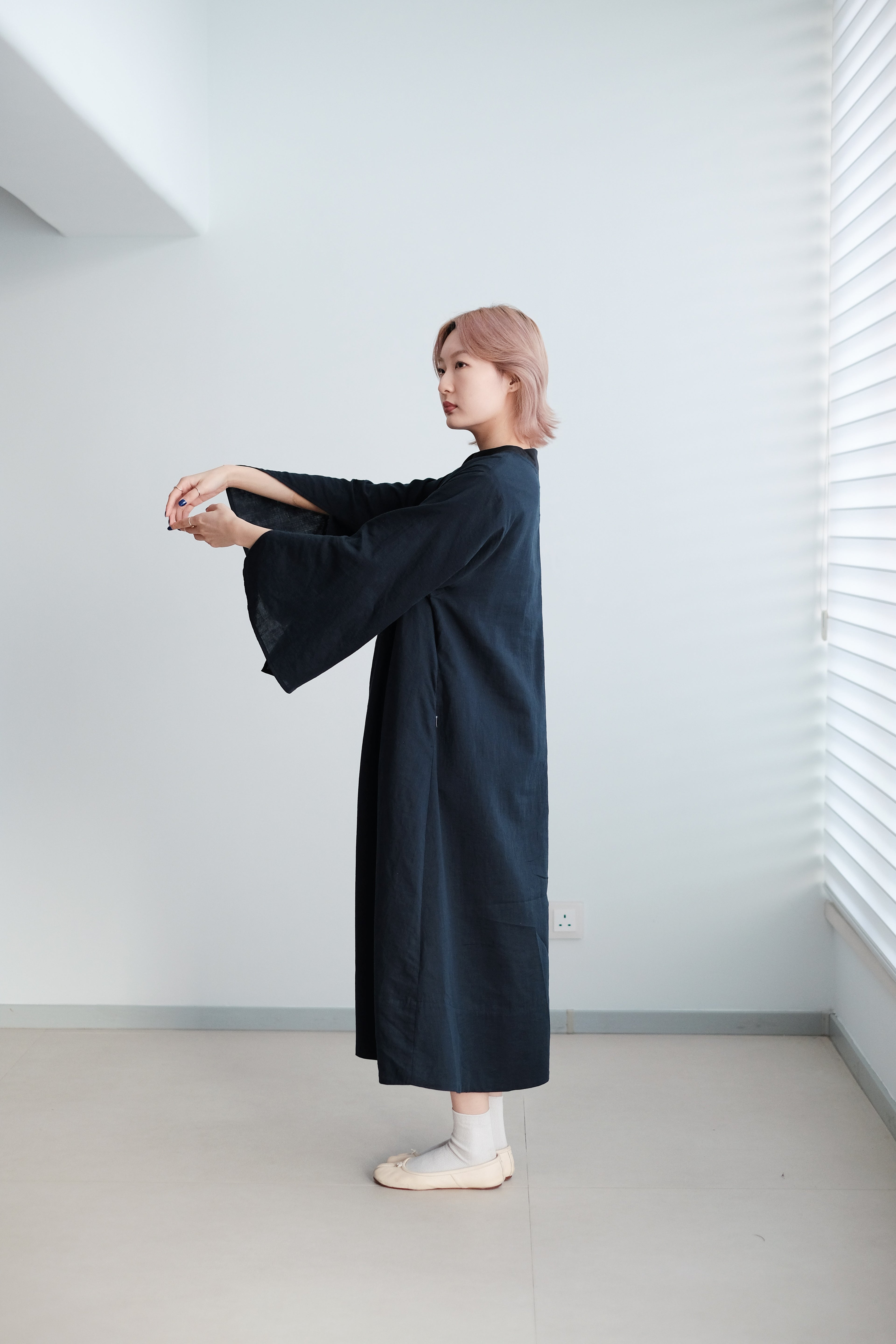 This deep navy kaftan dress is crafted from a soft yet structured fabric that drapes beautifully without looking bulky. Designed with a relaxed silhouette, a clean V-neckline, and wide kimono-style sleeves, it moves elegantly with every step.