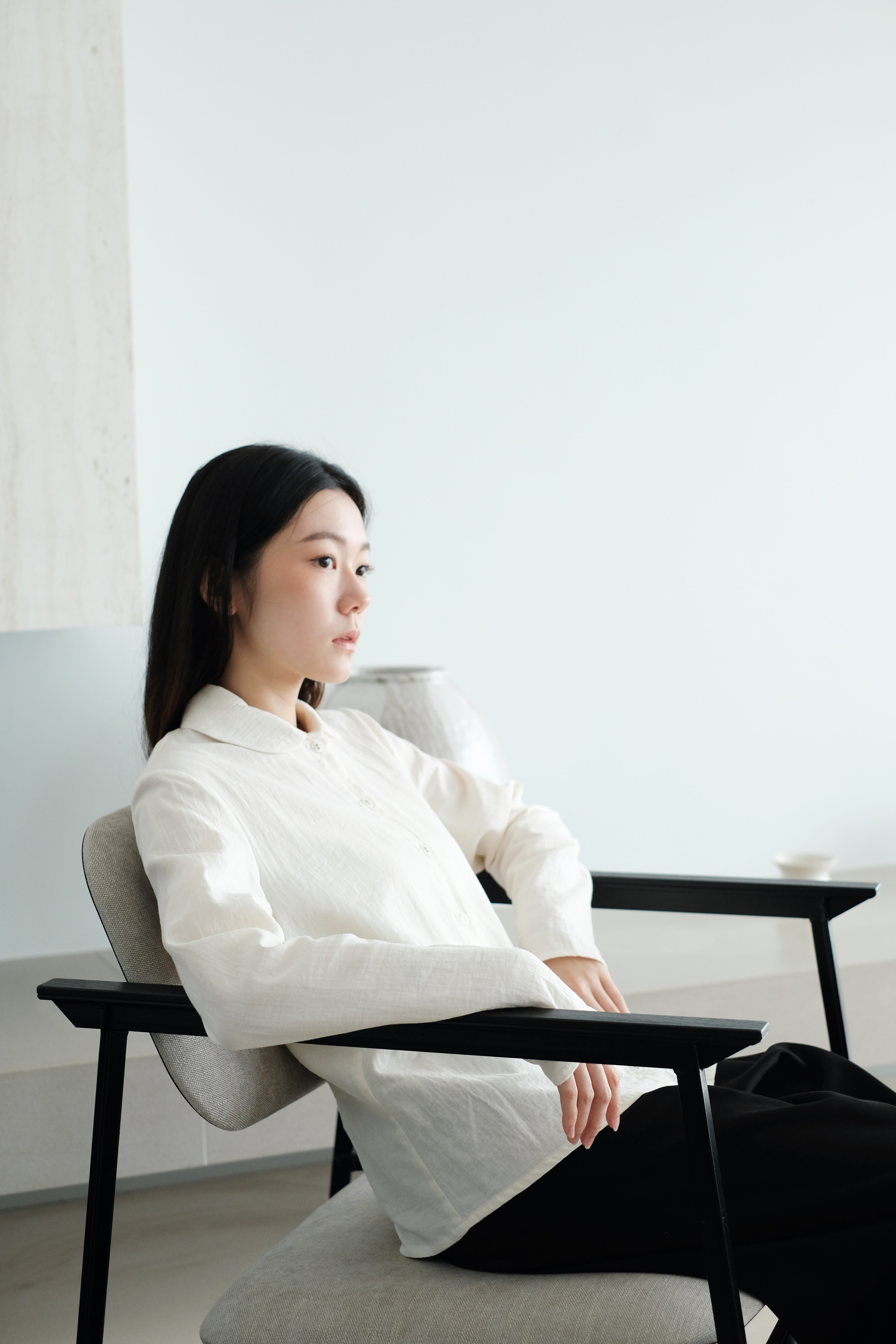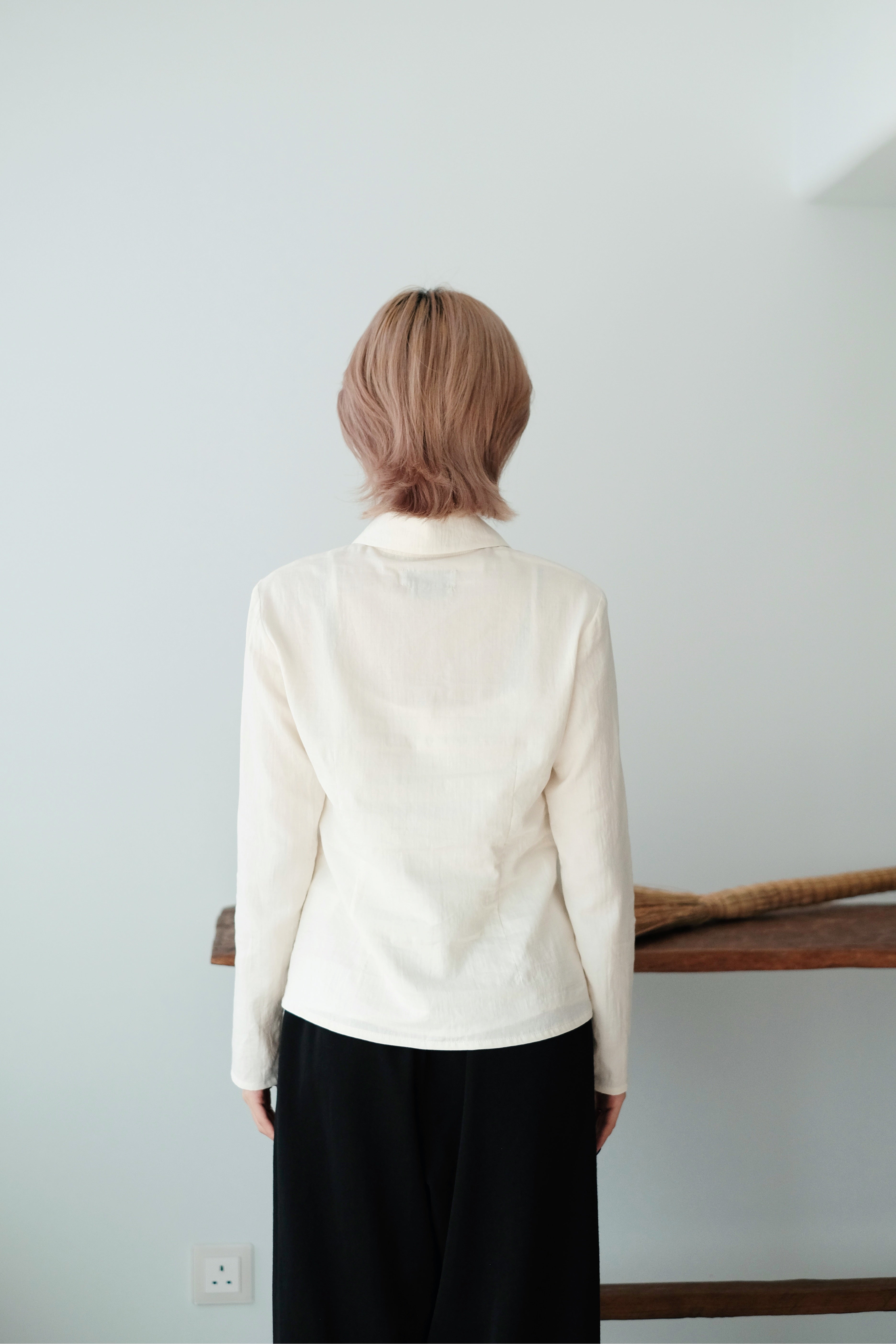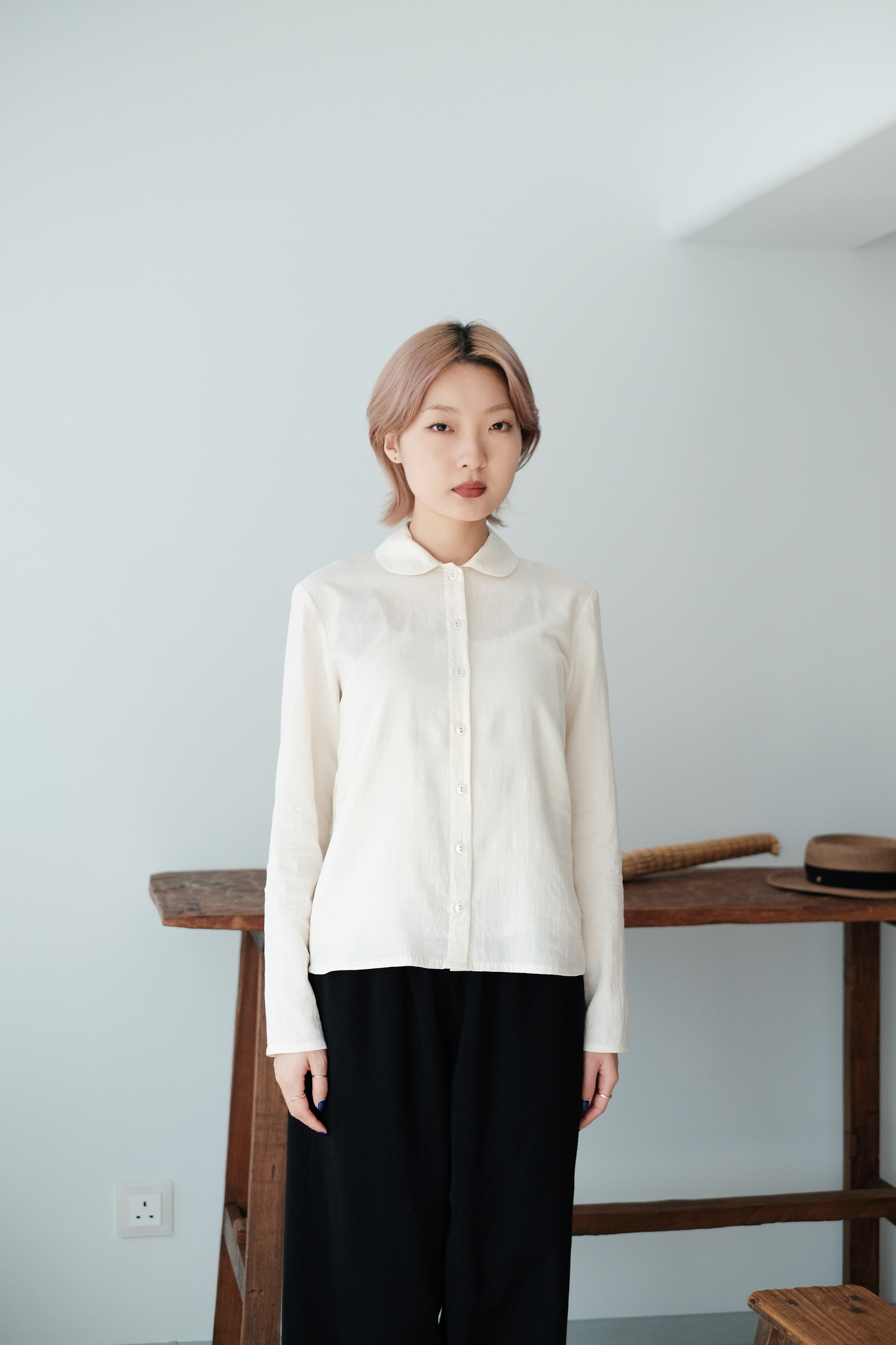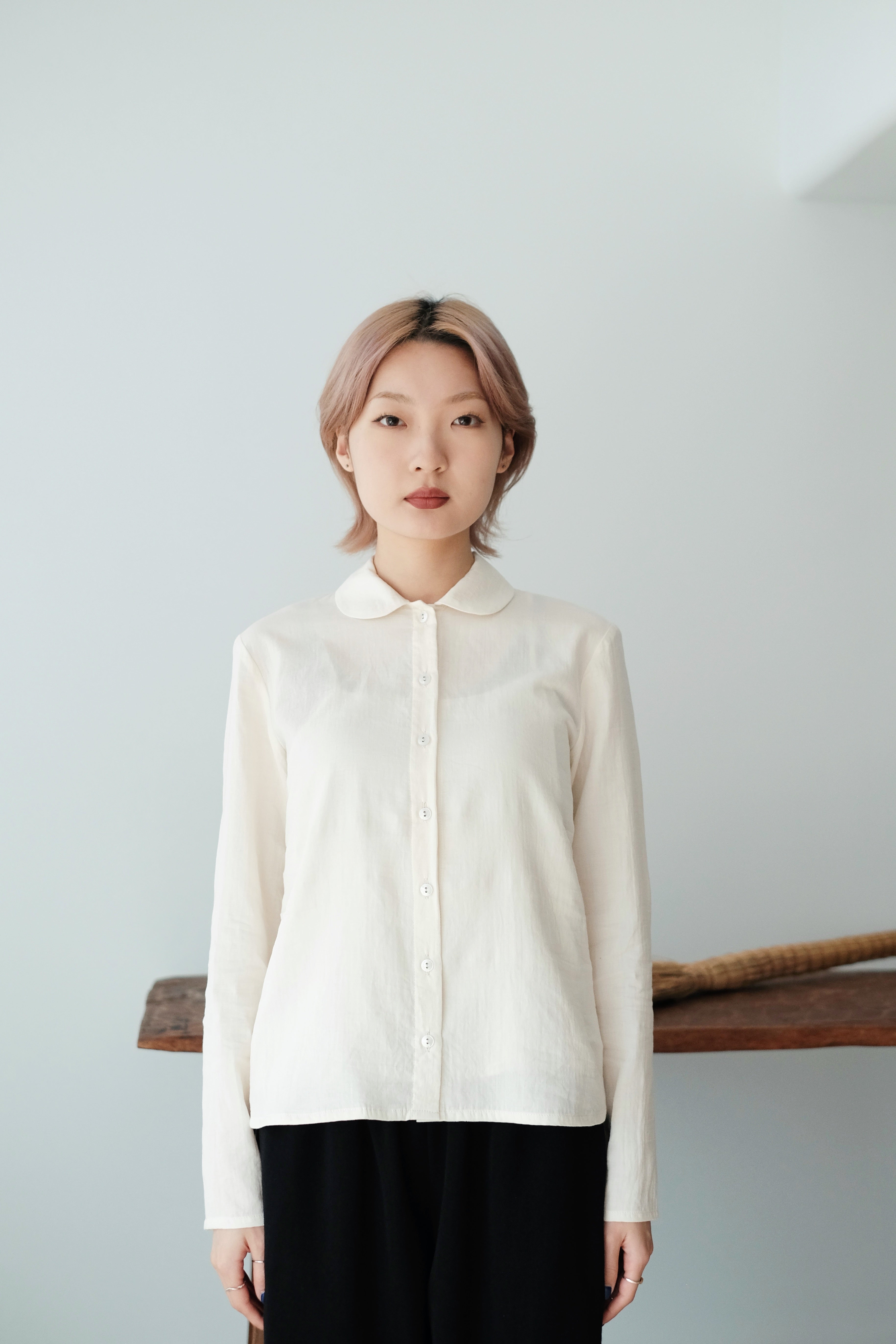 A soft, rounded-collar shirt with clean, minimal lines and a naturally gentle look.