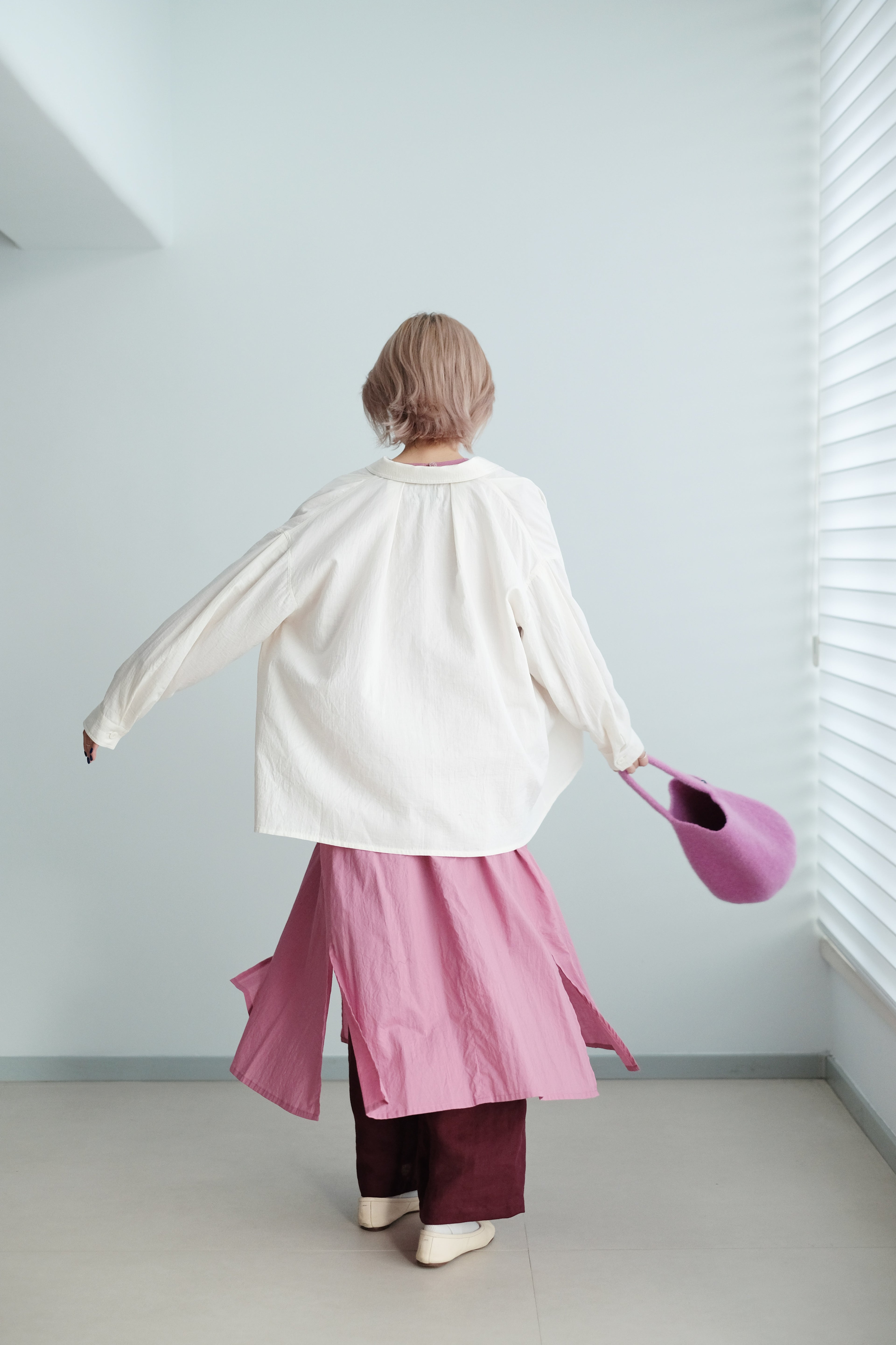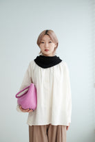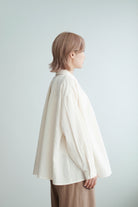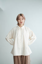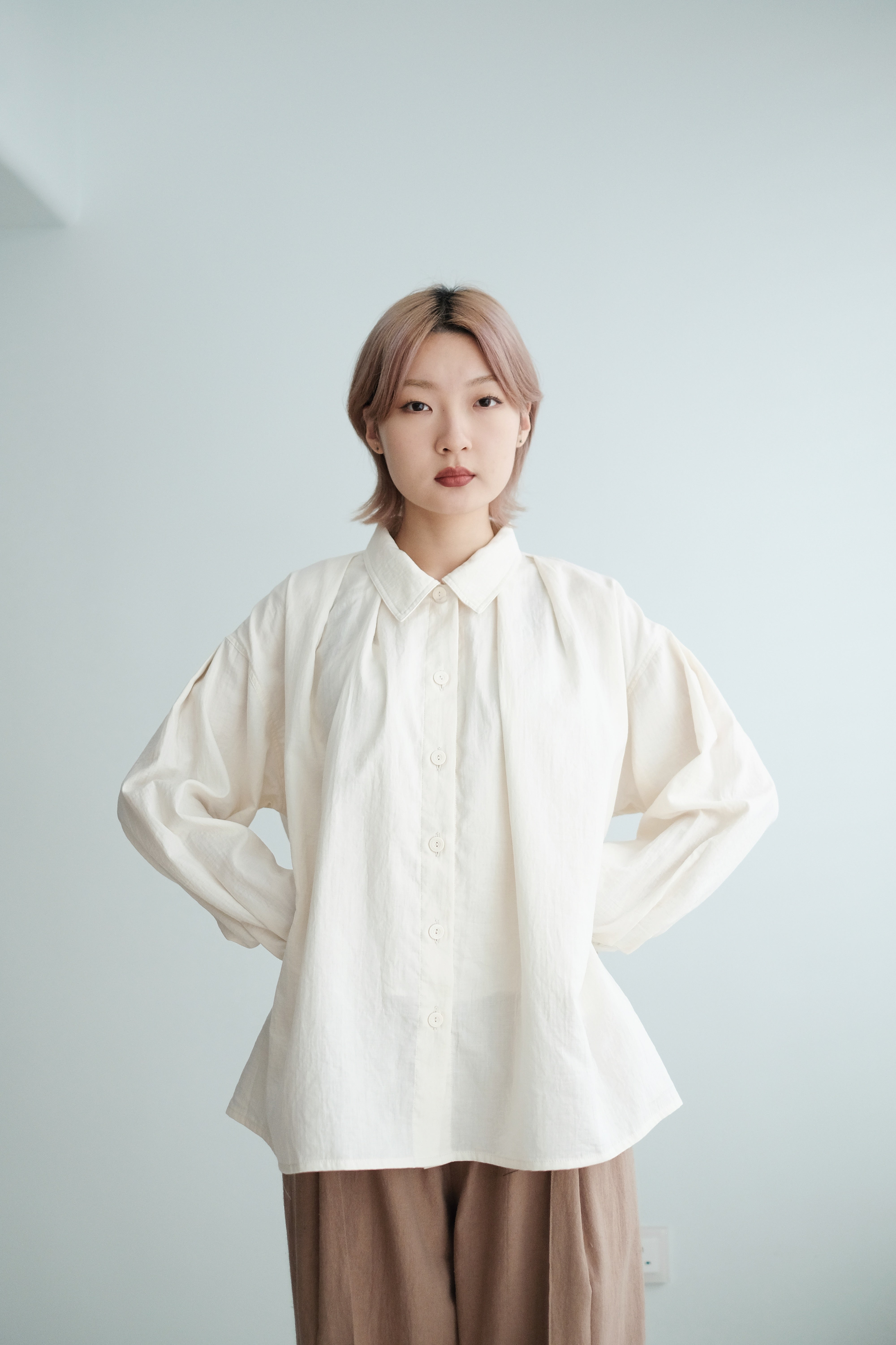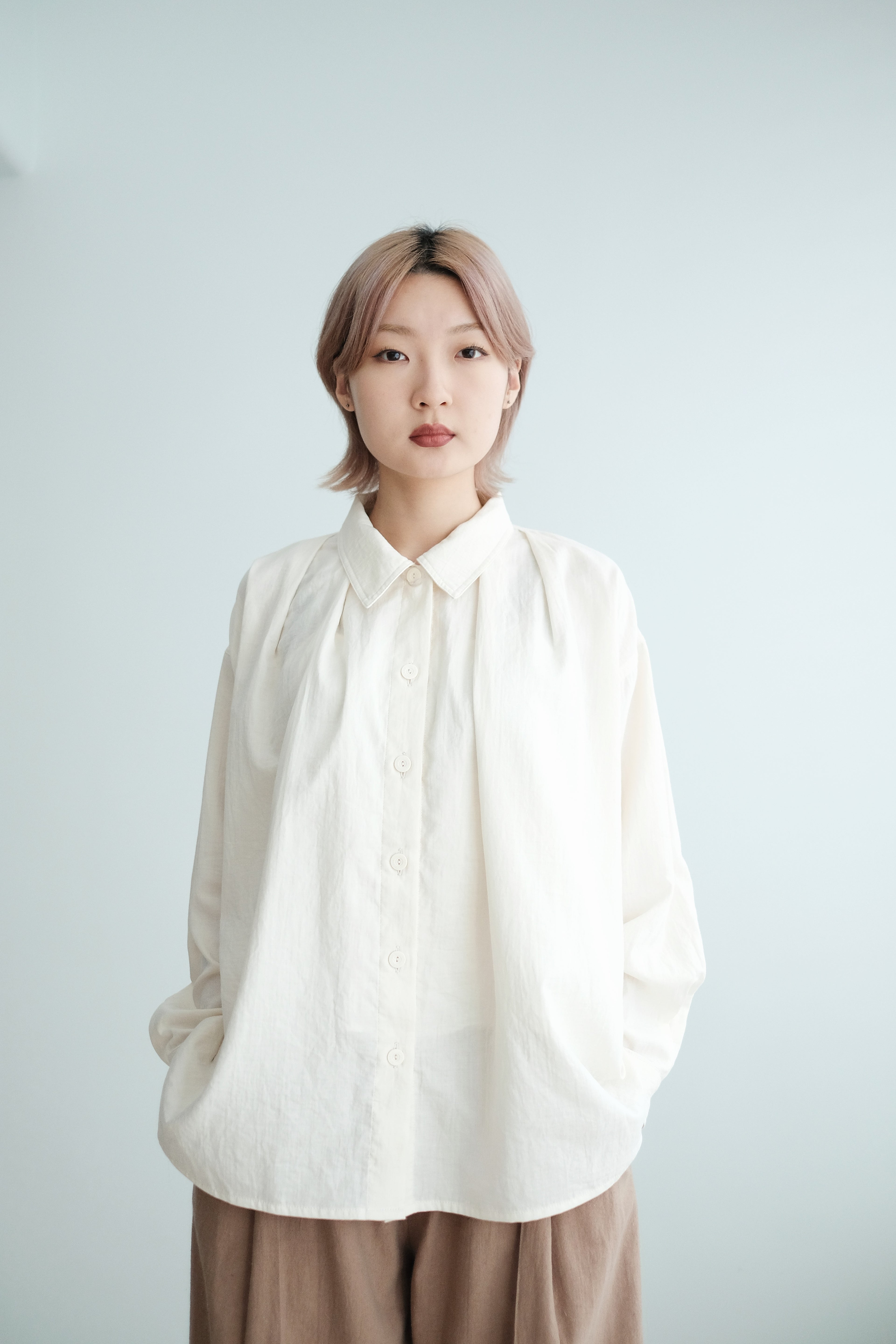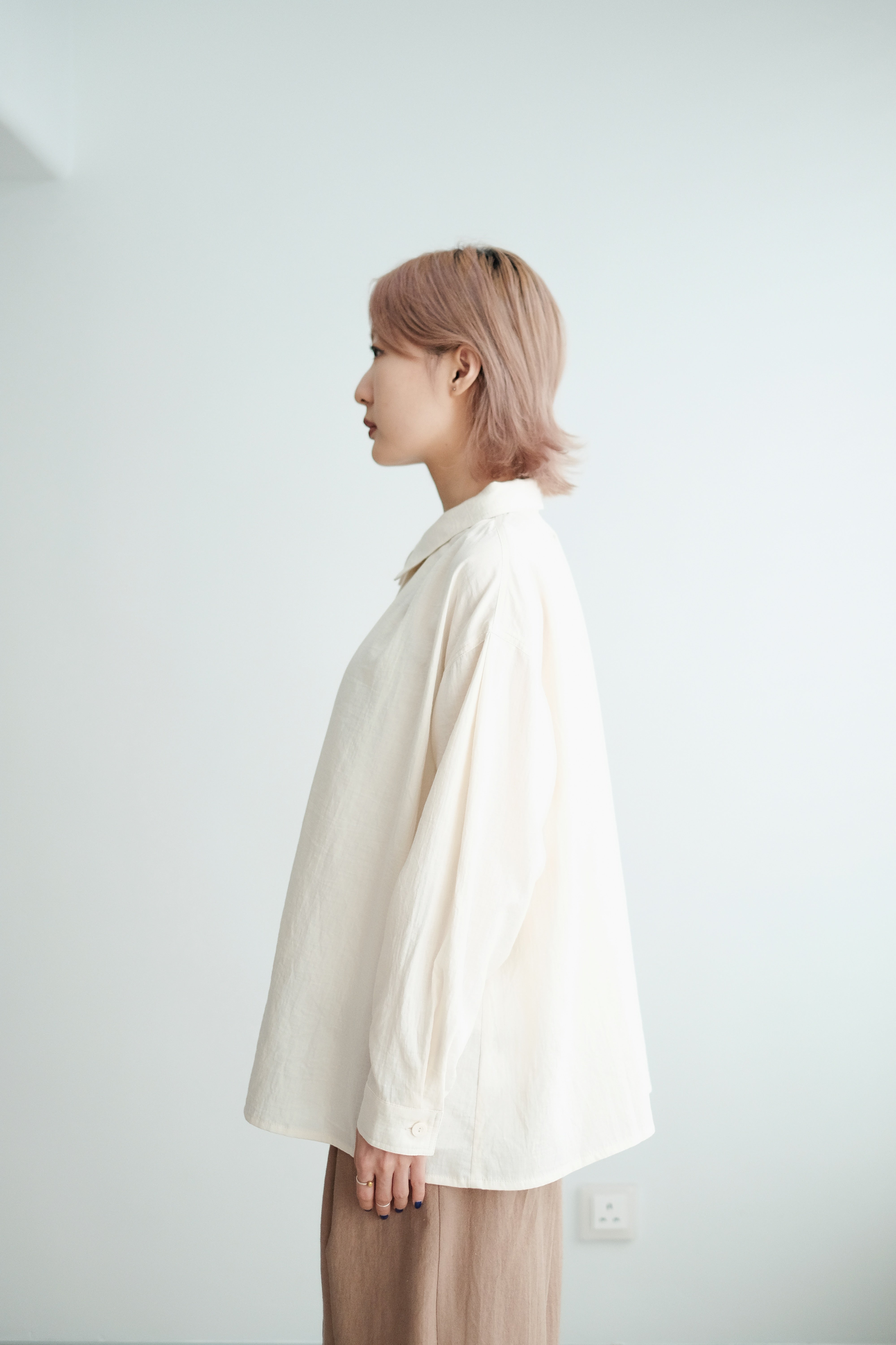 This white shirt is crafted from a lightweight cotton-blend fabric with a natural crinkled texture—soft, breathable, and subtly structured. Delicate gathers at the neckline create gentle volume without looking bulky. Designed in a relaxed silhouette with a rounded hem, it flatters the body effortlessly and works perfectly both on its own or as a layering piece.