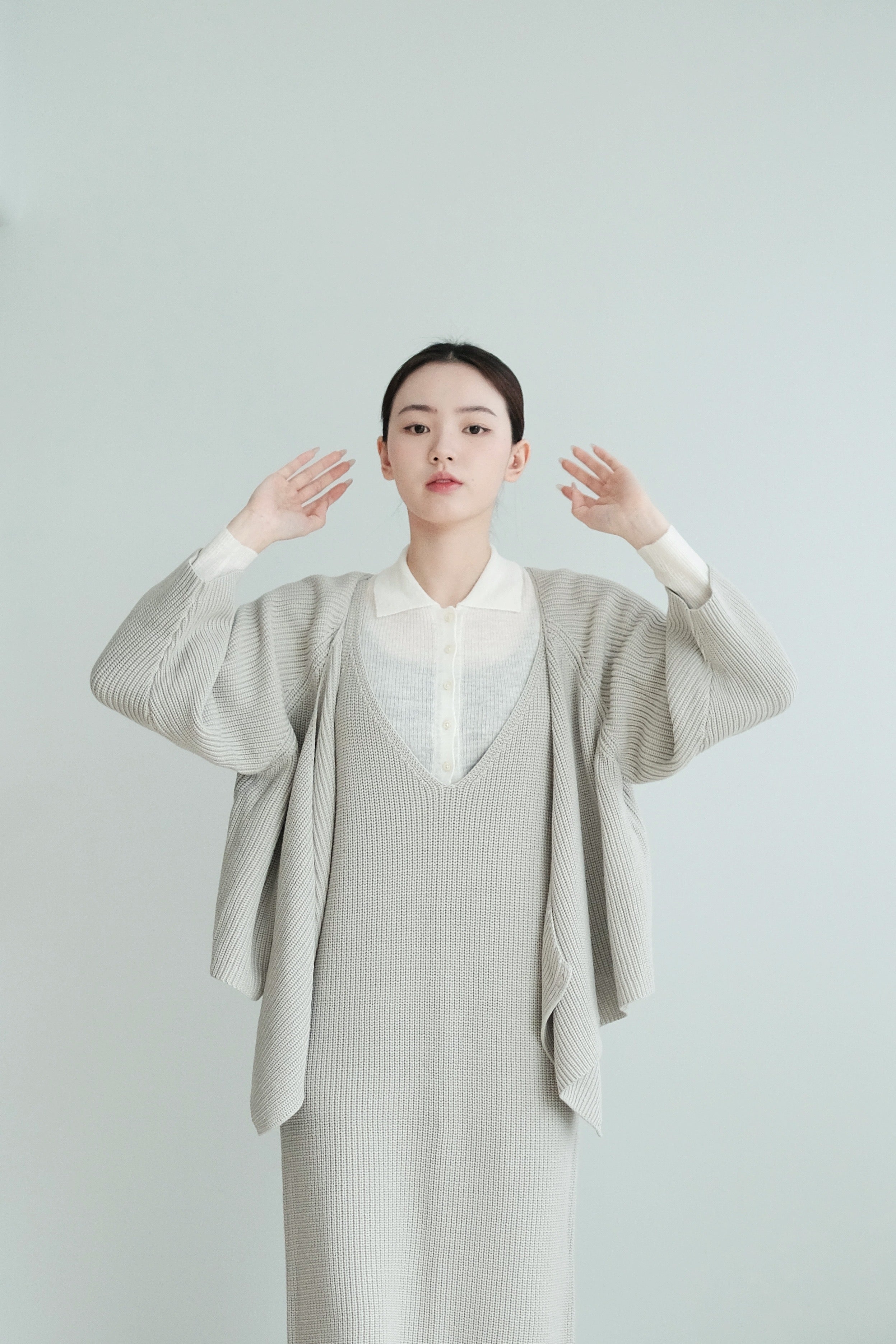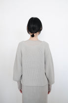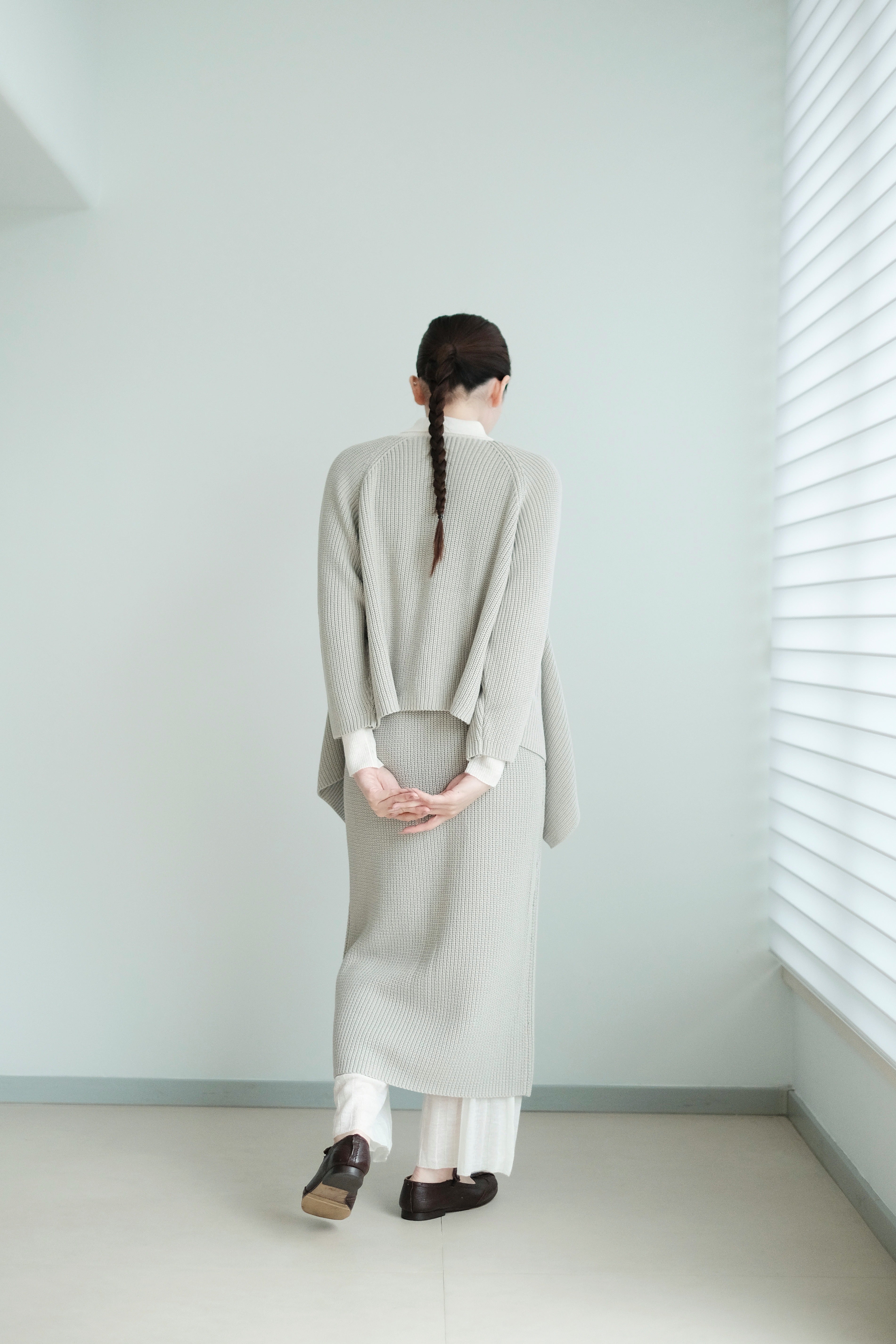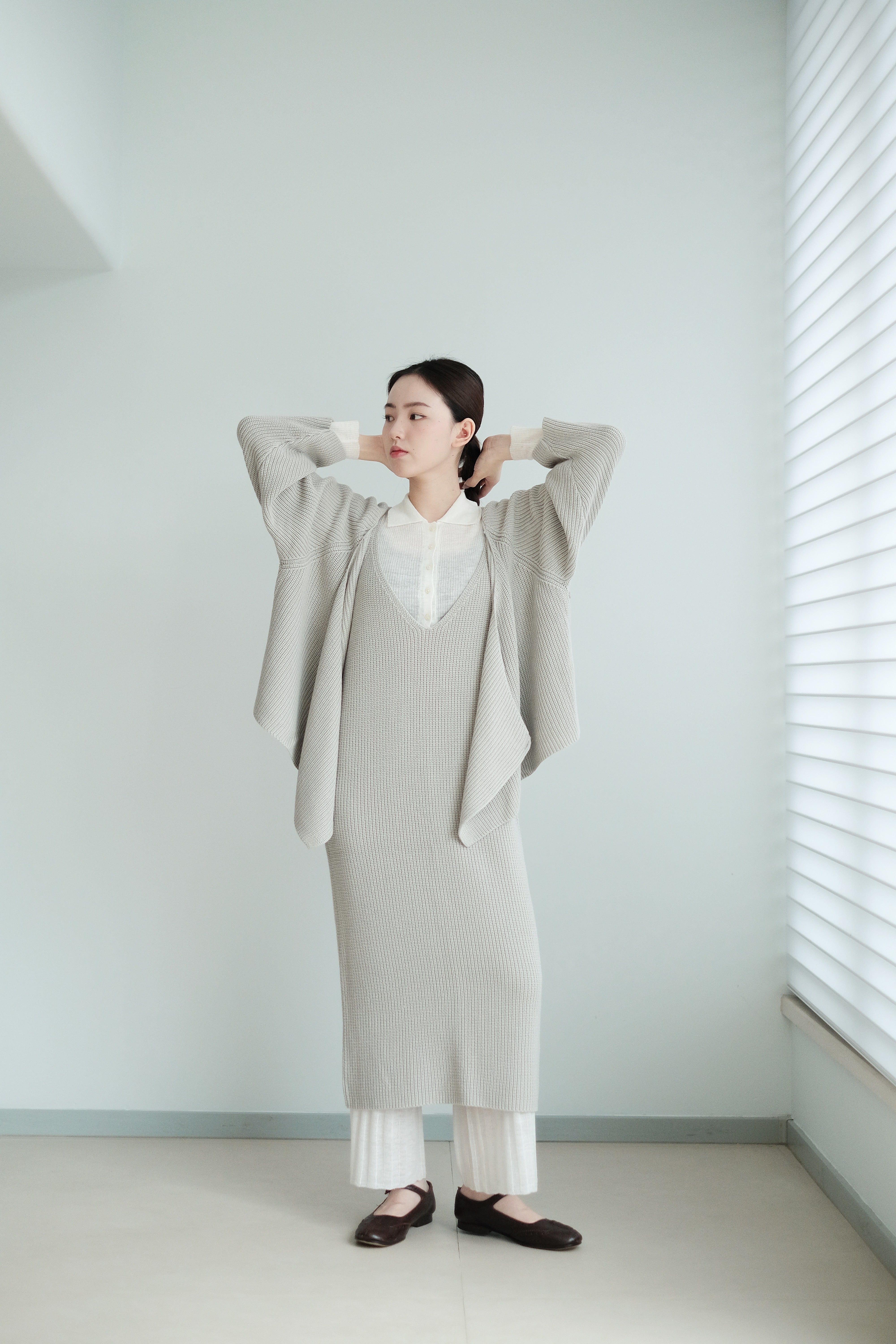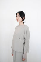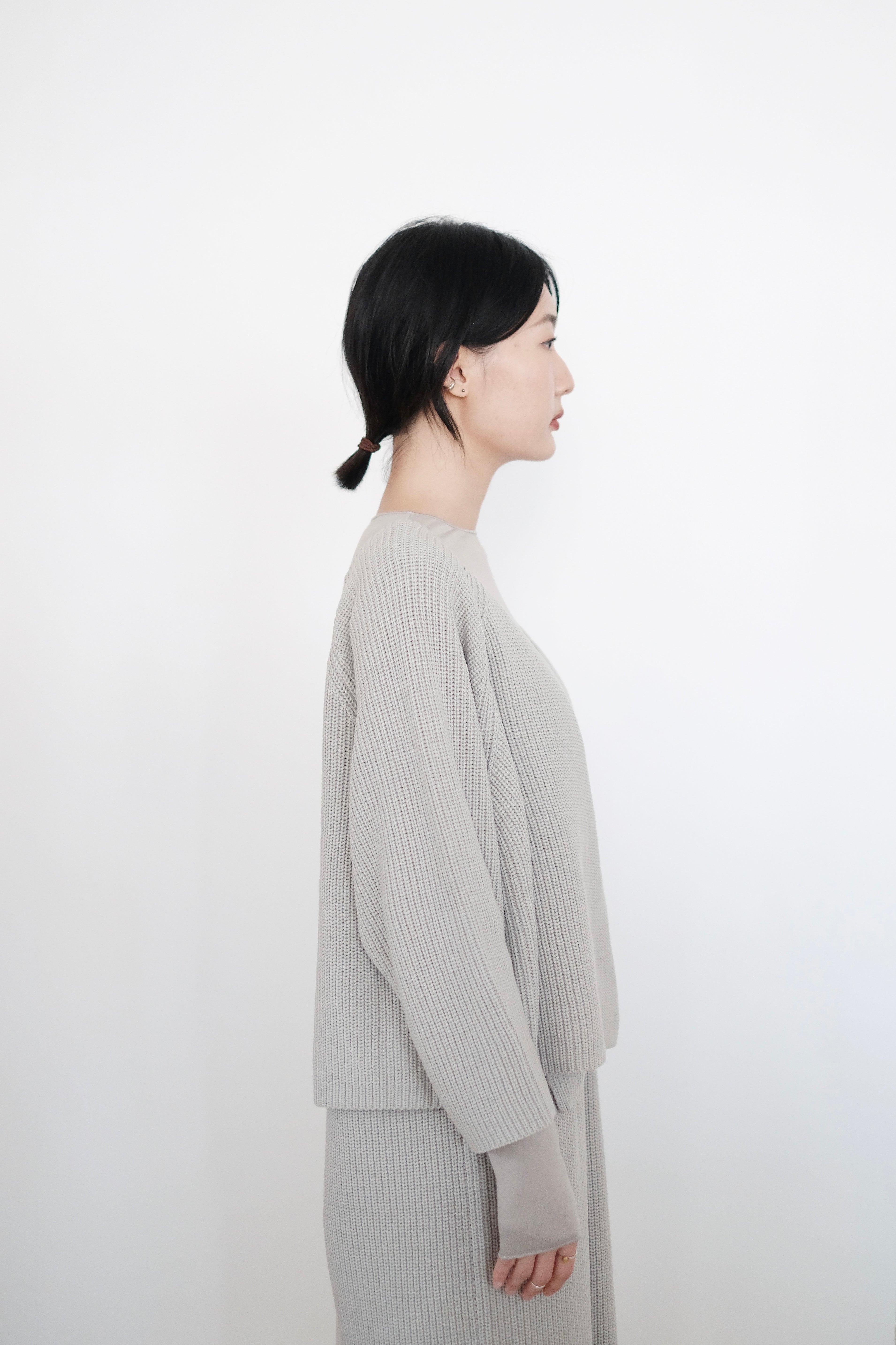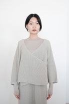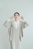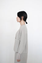 這件針織上衣選用了柔軟的米色棉線材質,溫潤自然,展現出低調典雅的質感。V領設計以斜切方式呈現,帶來層次感和視覺上的修飾效果。寬鬆的剪裁搭配七分袖設計,使整體更顯輕盈隨性,而寬鬆下擺稍微不規則的弧度更增添了靈動感。背面無拉鍊和扣環,保持了簡約風格的連貫性,是一款適合日常穿搭的舒適單品。
