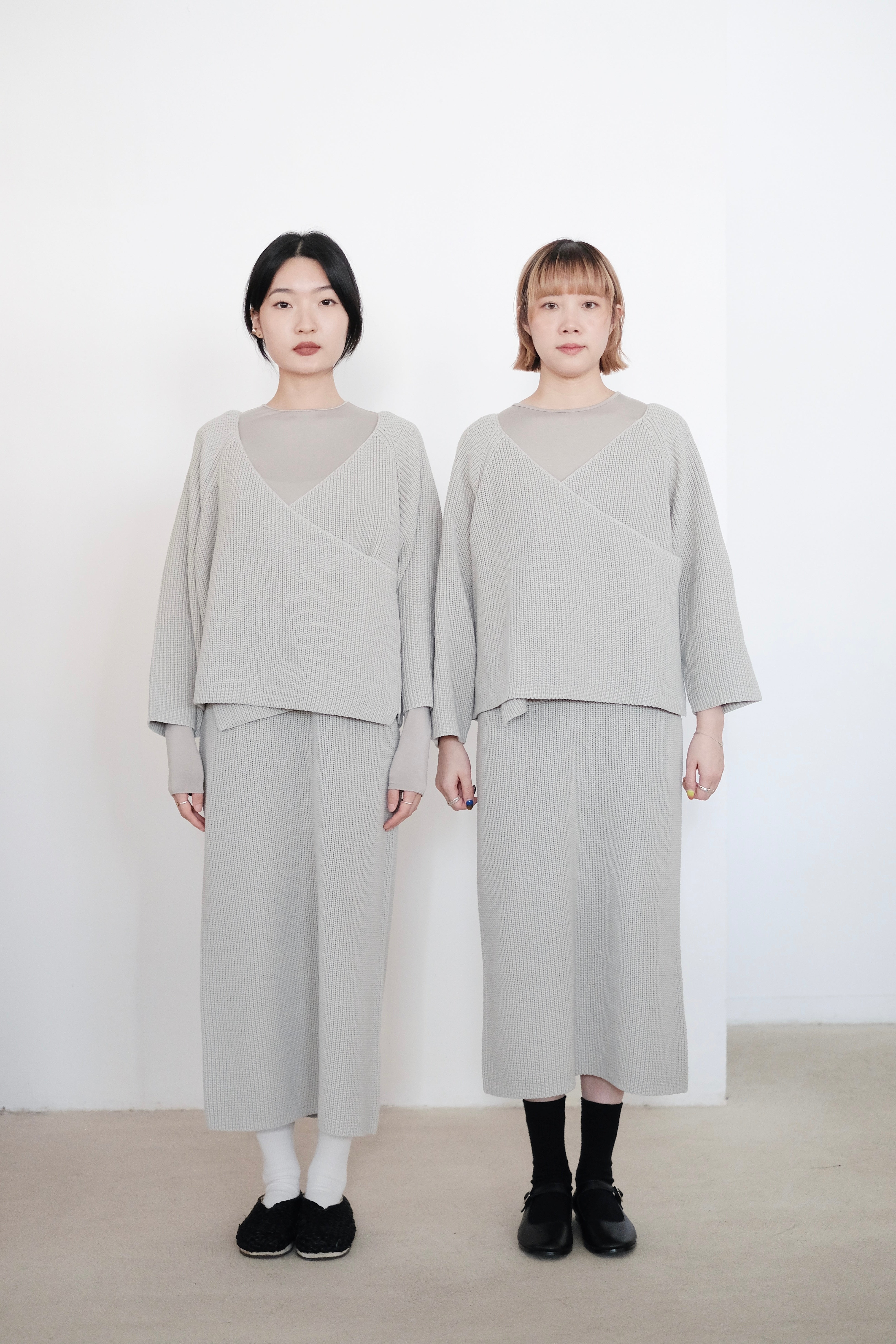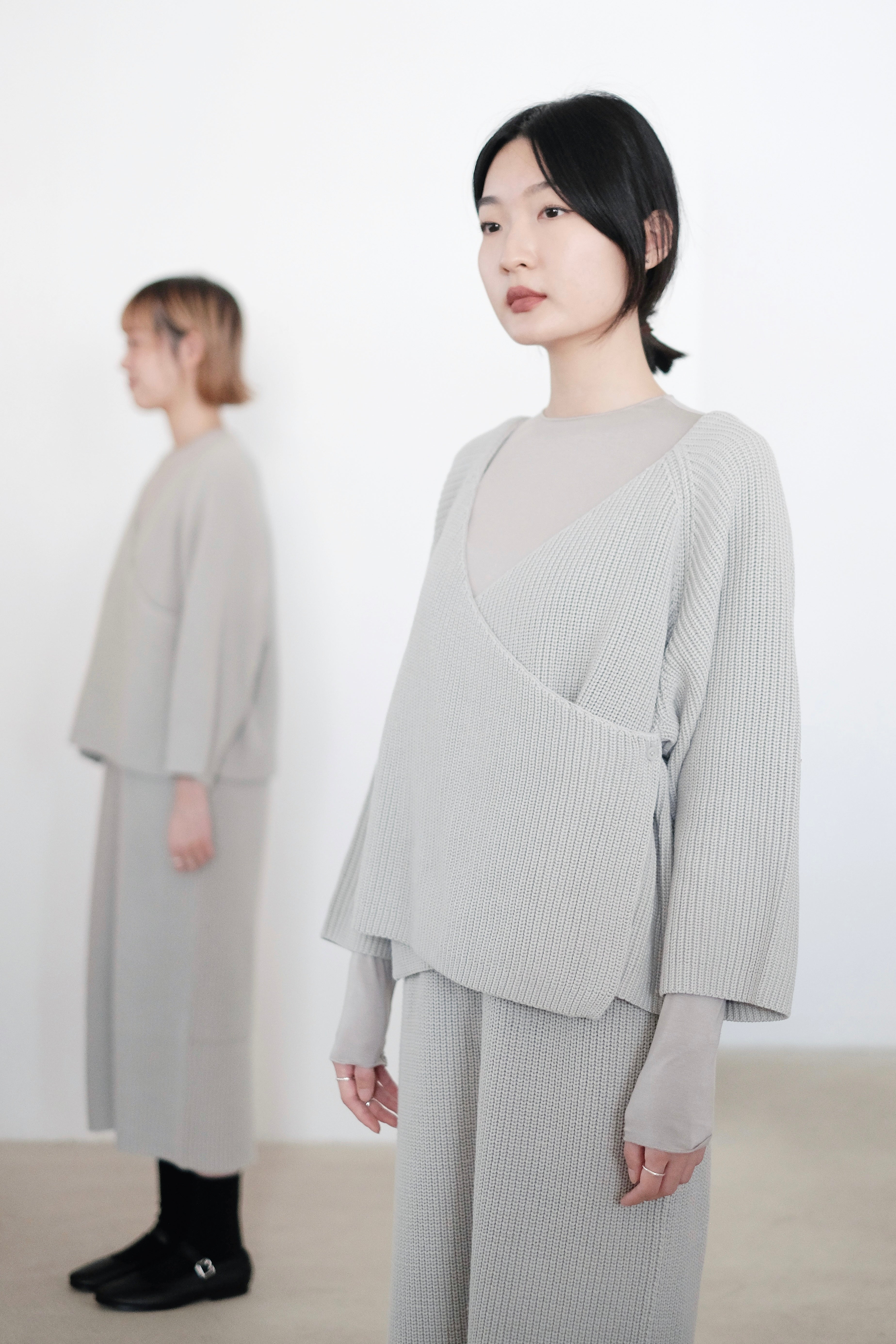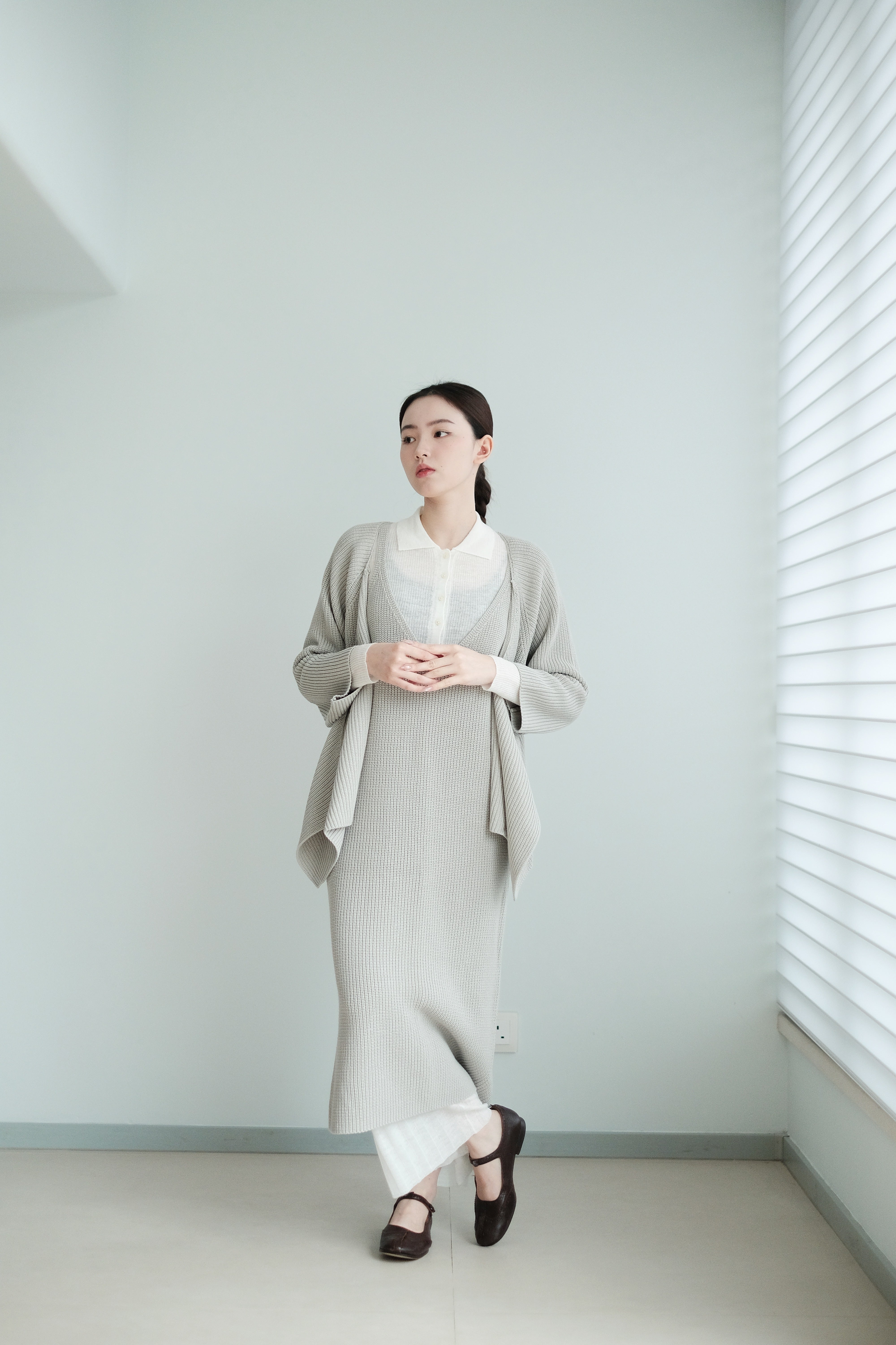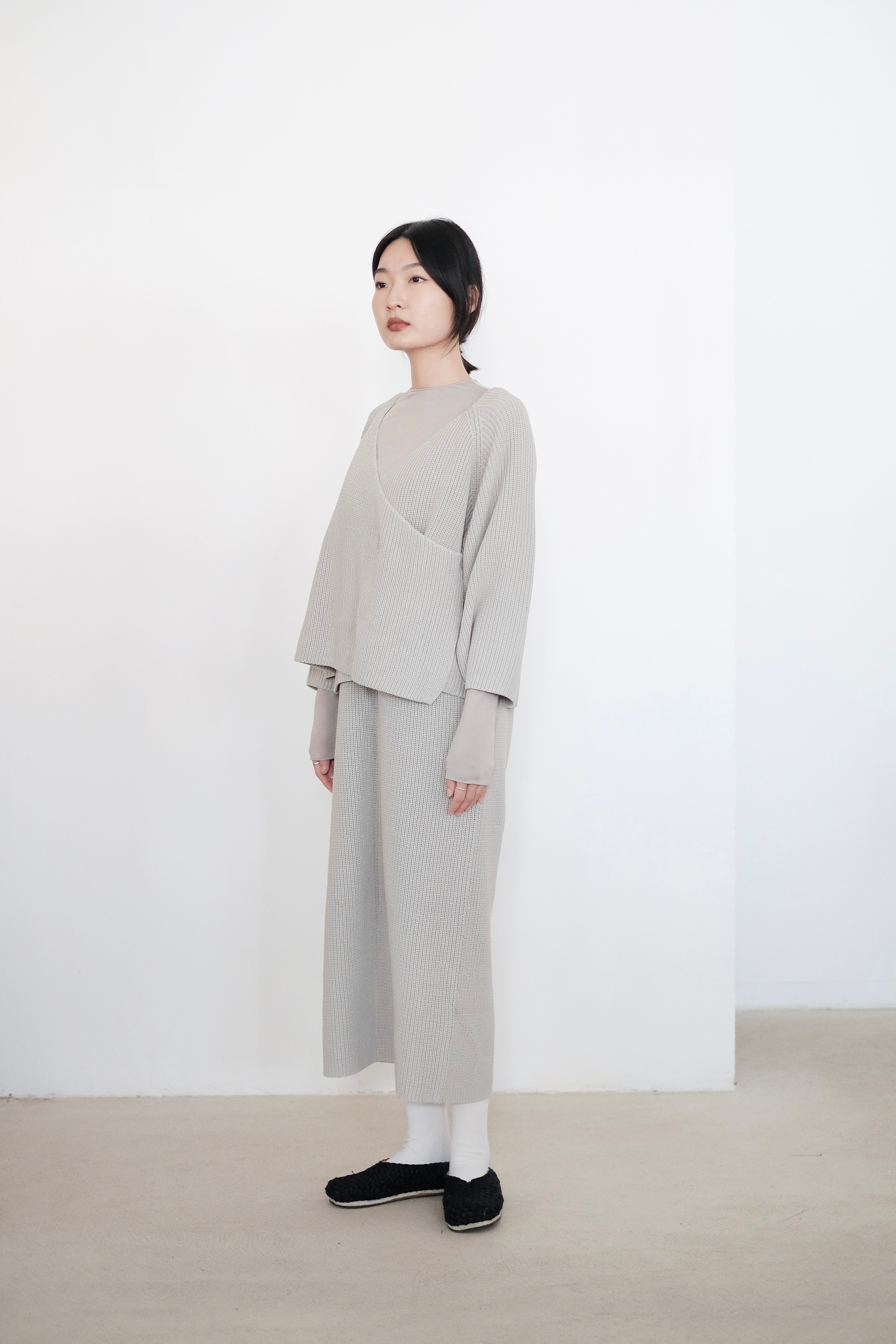 這件針織上衣選用了柔軟的米色棉線材質,溫潤自然,展現出低調典雅的質感。V領設計以斜切方式呈現,帶來層次感和視覺上的修飾效果。寬鬆的剪裁搭配七分袖設計,使整體更顯輕盈隨性,而寬鬆下擺稍微不規則的弧度更增添了靈動感。背面無拉鍊和扣環,保持了簡約風格的連貫性,是一款適合日常穿搭的舒適單品。