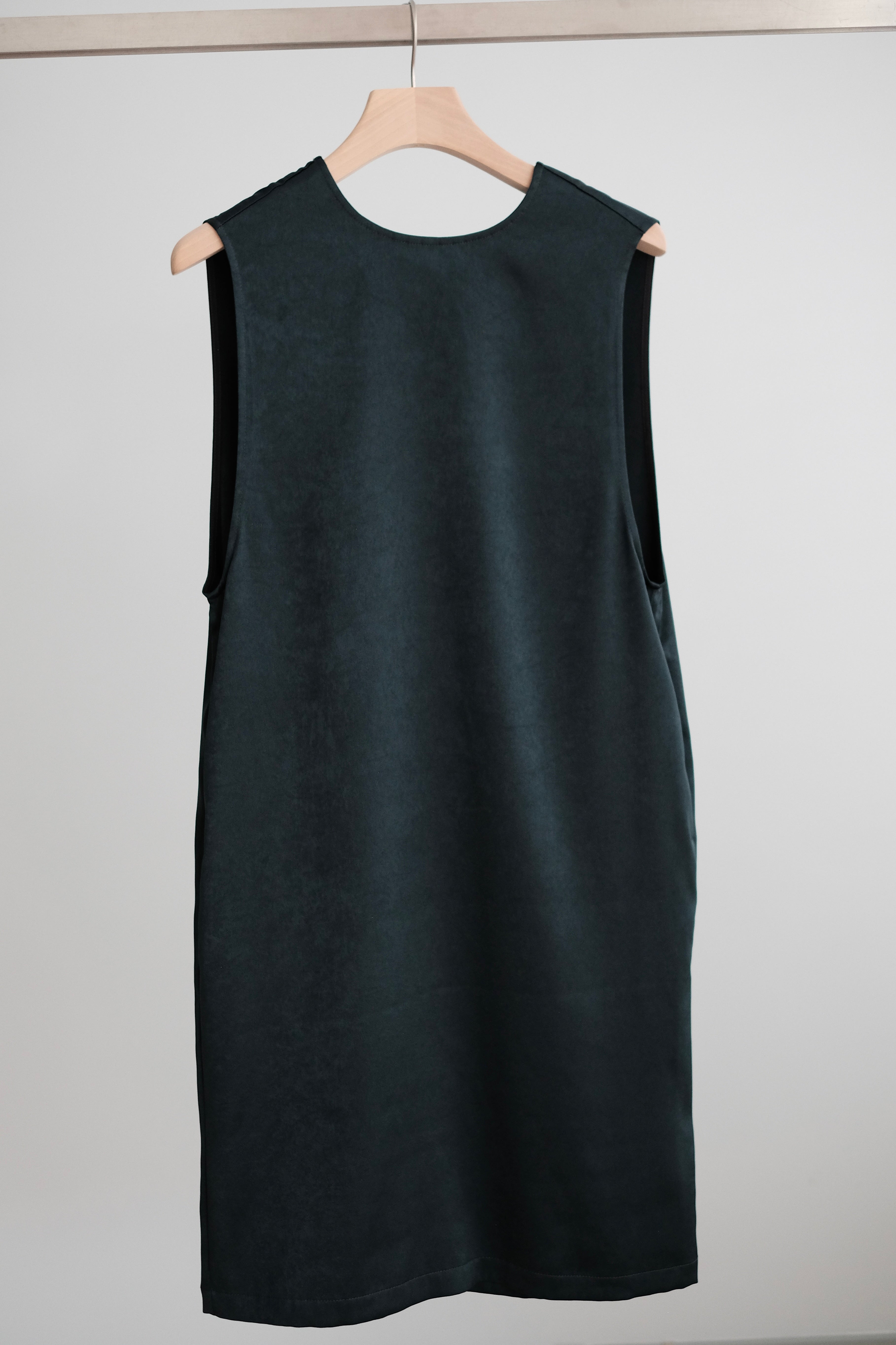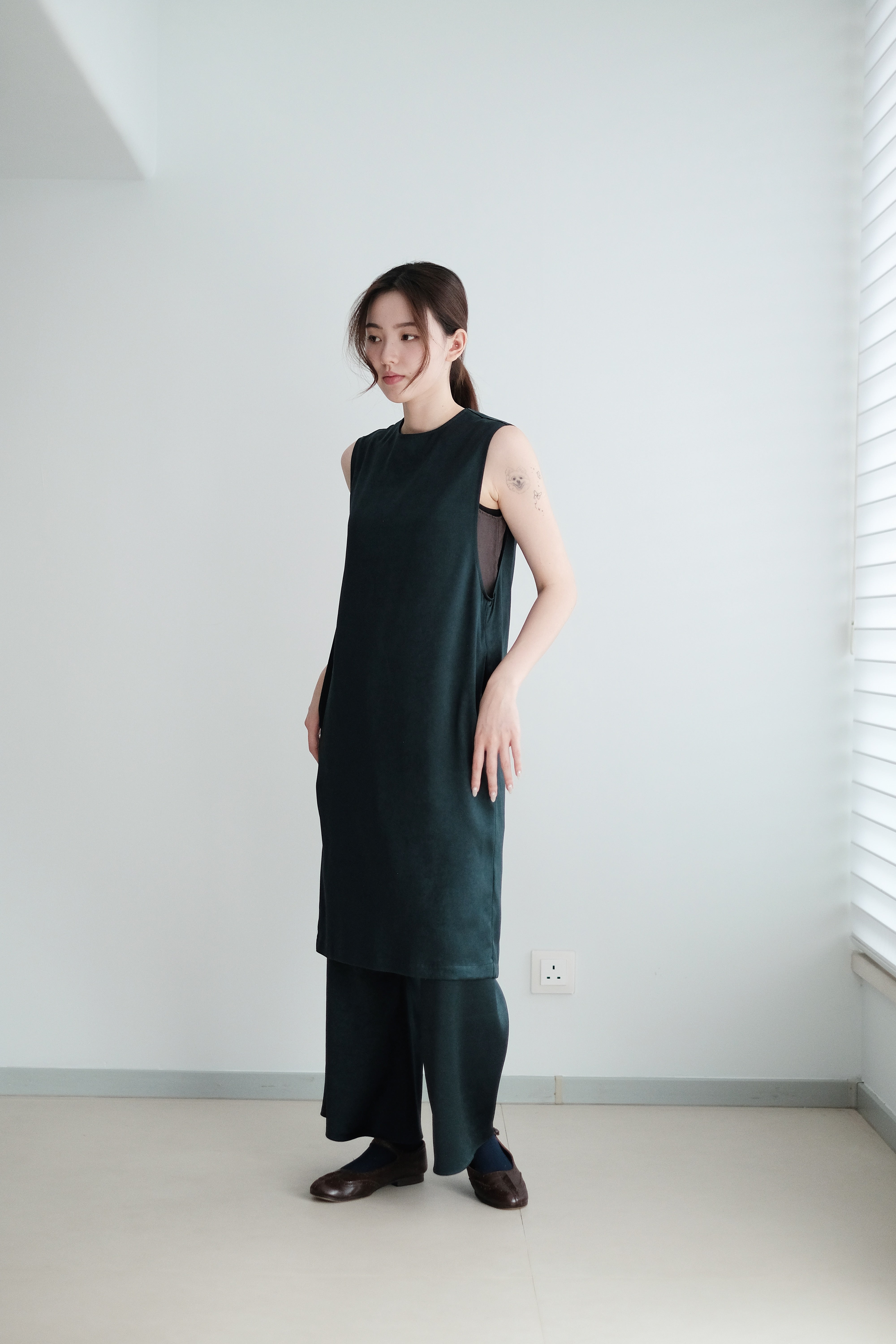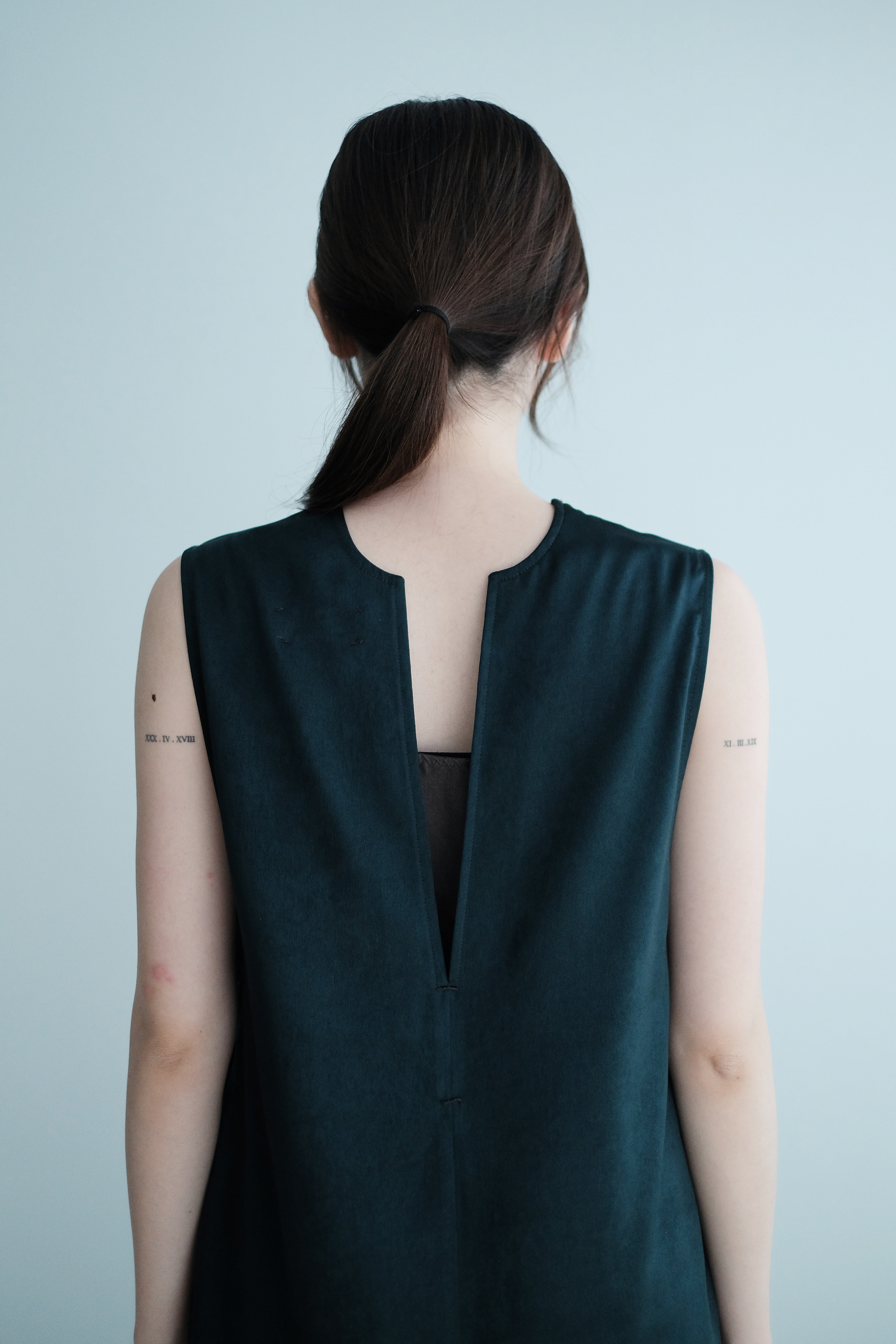 這款無袖洋裝採用三醋酸混紡面料製成,布料表面有類似麂皮的質感,輕柔不貼身,具備自然垂墜感。背面以深V剪裁作為亮點,於視覺上修飾背部線條,更添一份隱約的性感。側邊設有隱形口袋,方便日常使用。可單穿,也可與同布料的褲子一同搭配,營造成套的利落印象。