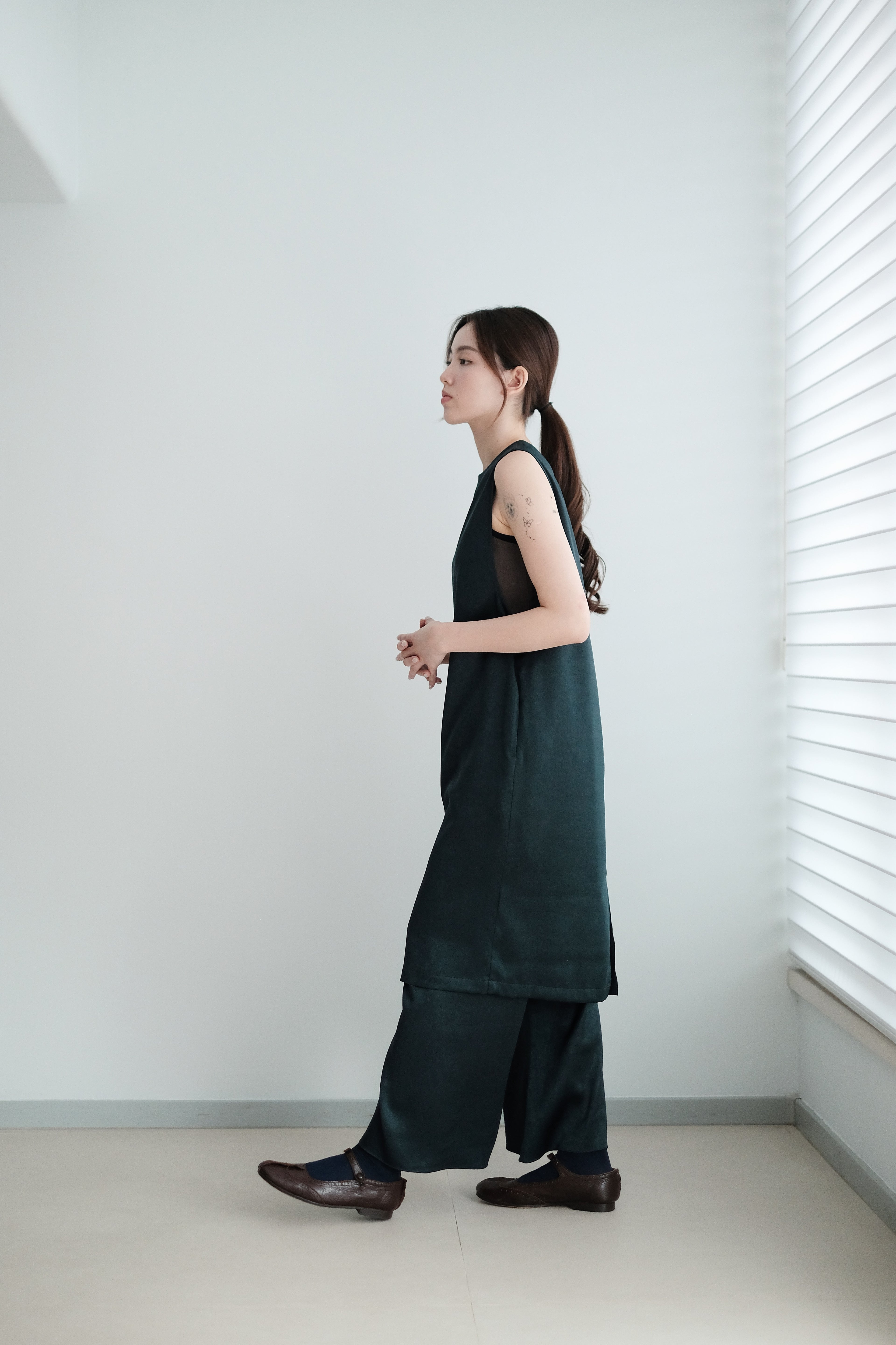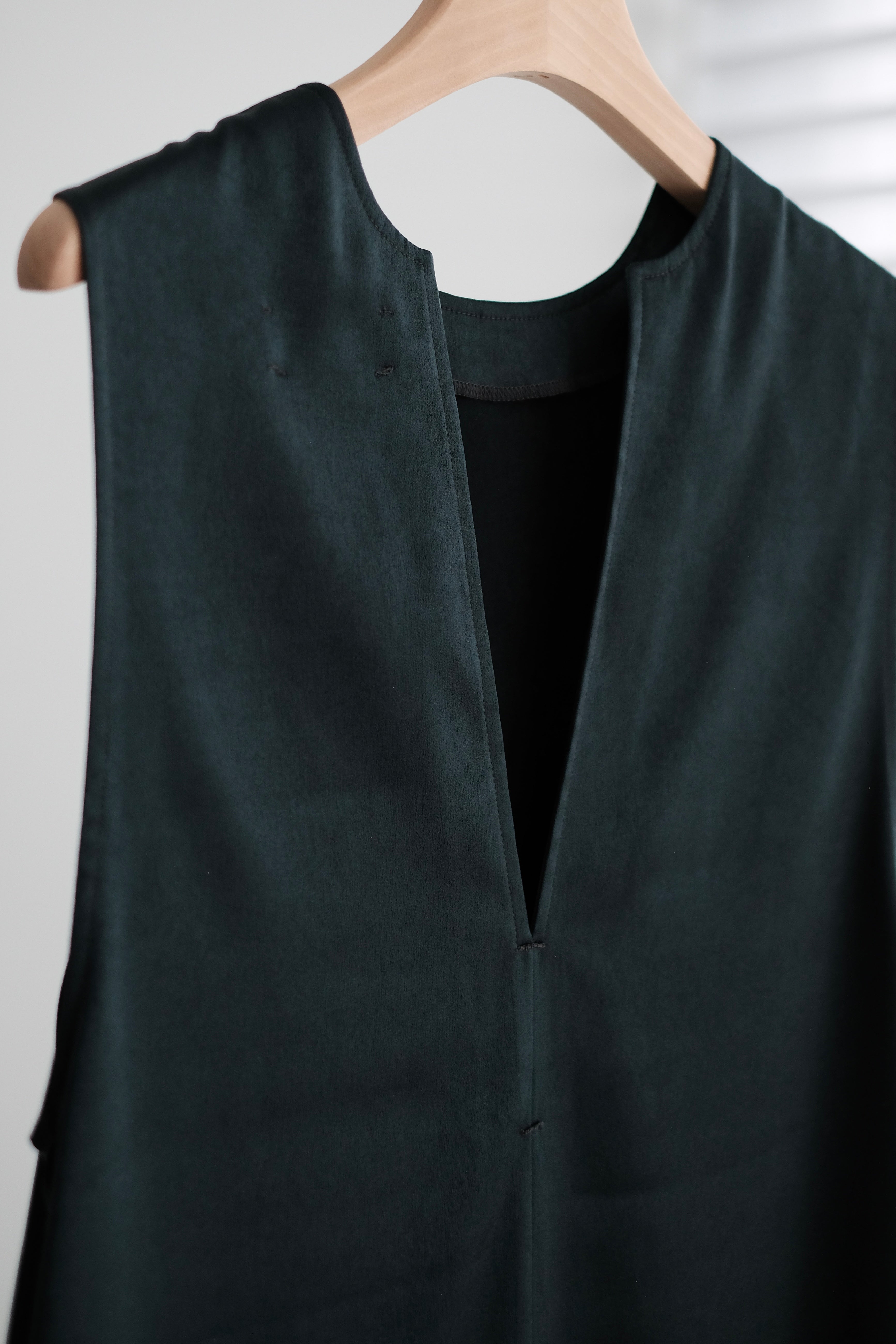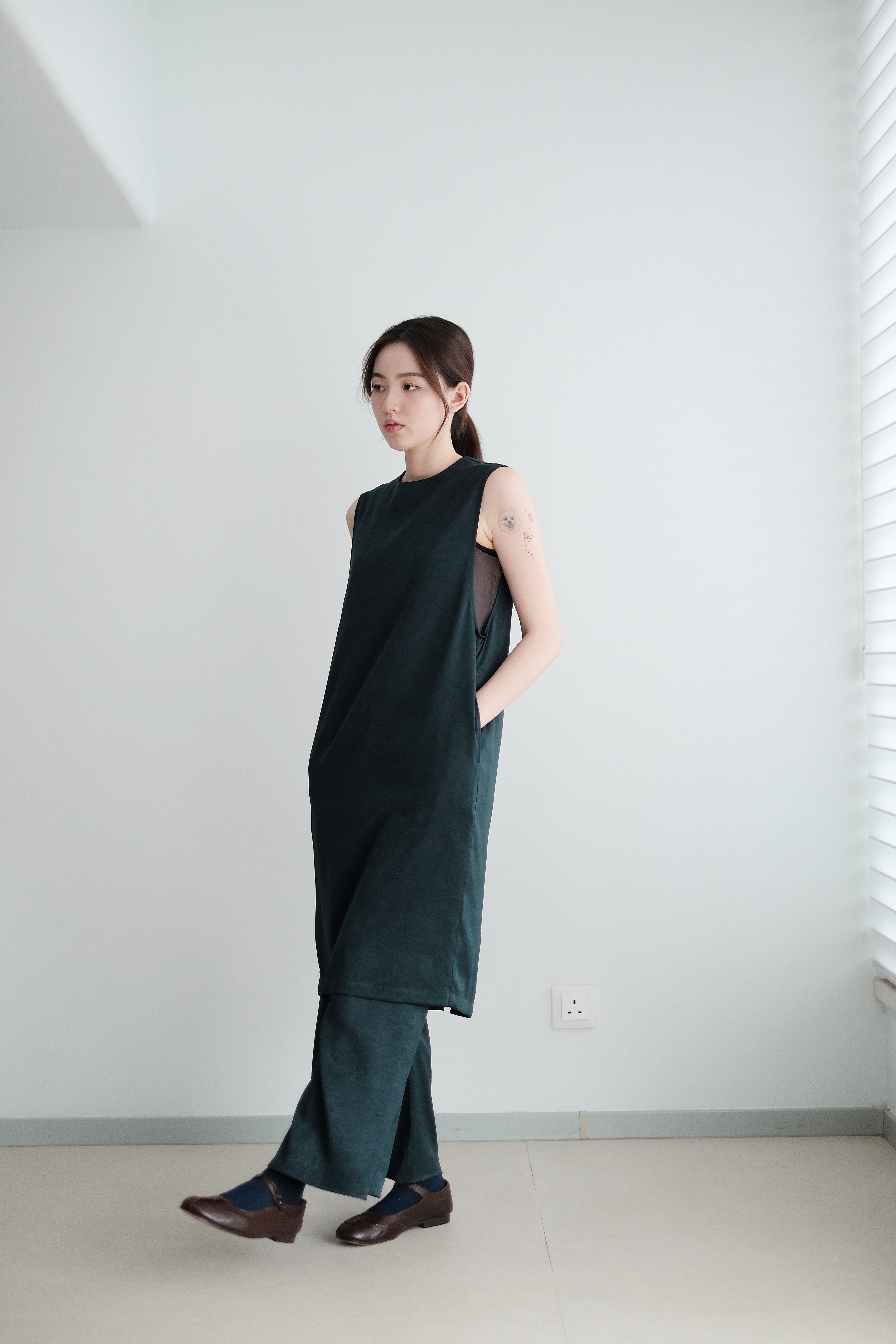 這款無袖洋裝採用三醋酸混紡面料製成,布料表面有類似麂皮的質感,輕柔不貼身,具備自然垂墜感。背面以深V剪裁作為亮點,於視覺上修飾背部線條,更添一份隱約的性感。側邊設有隱形口袋,方便日常使用。可單穿,也可與同布料的褲子一同搭配,營造成套的利落印象。