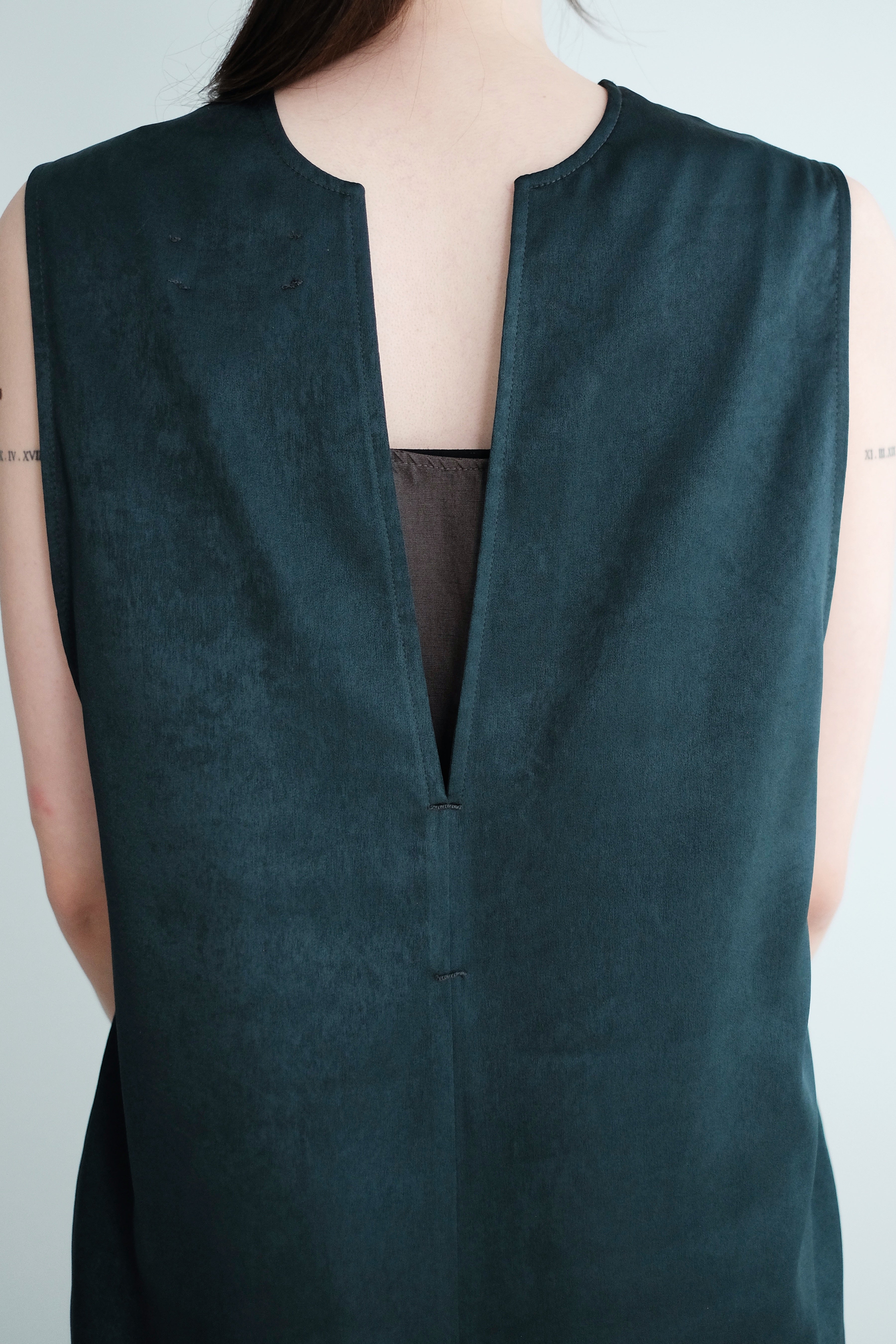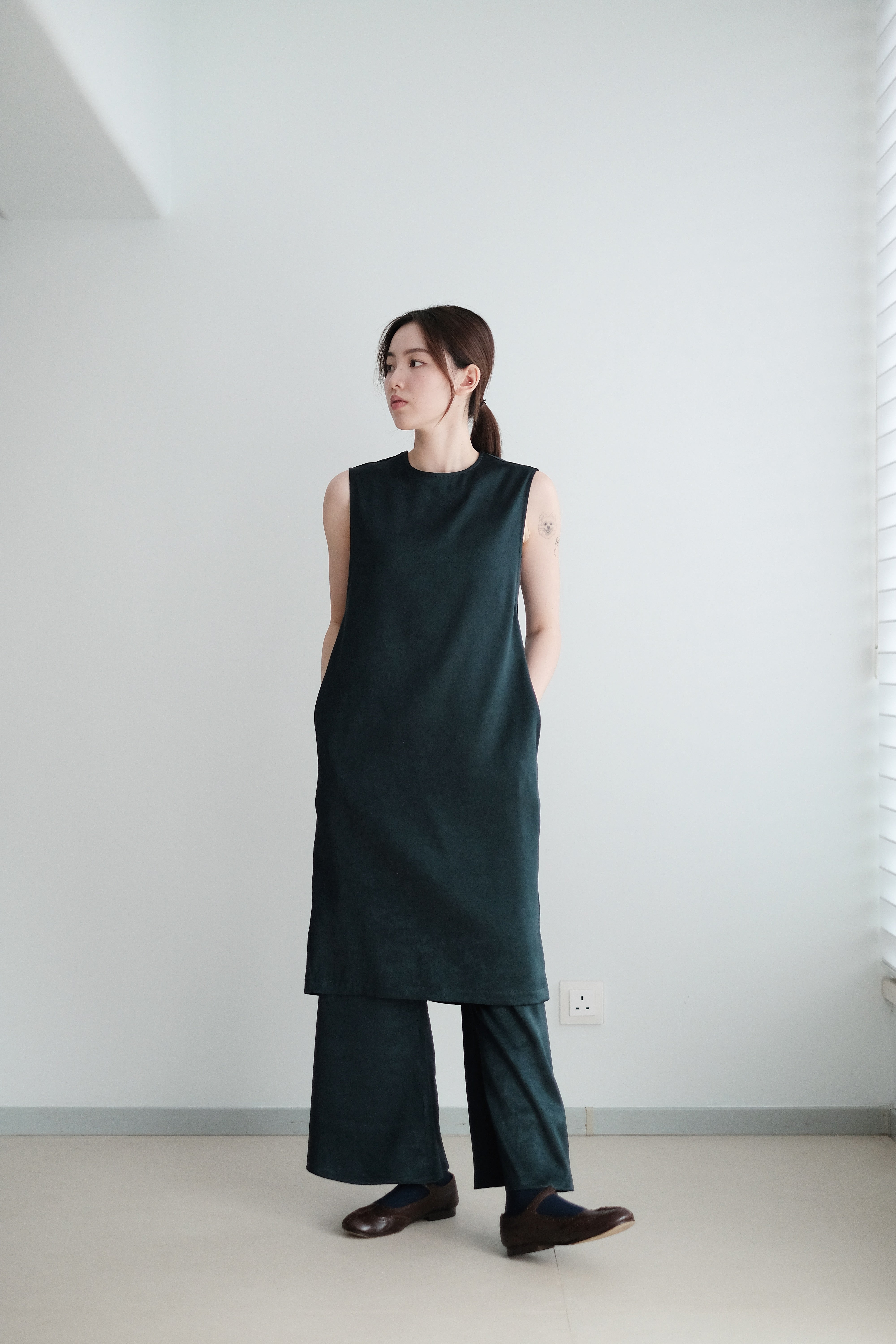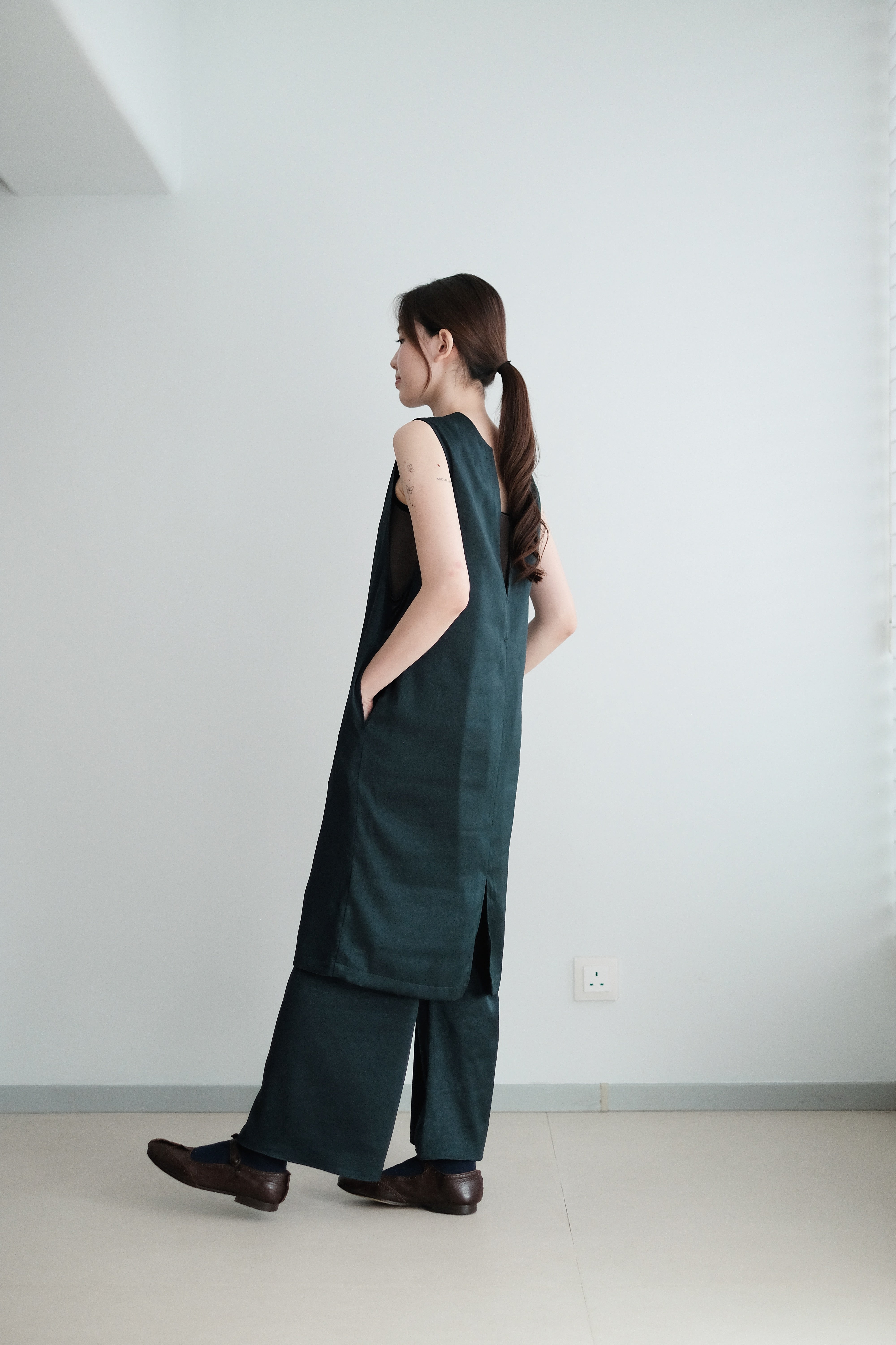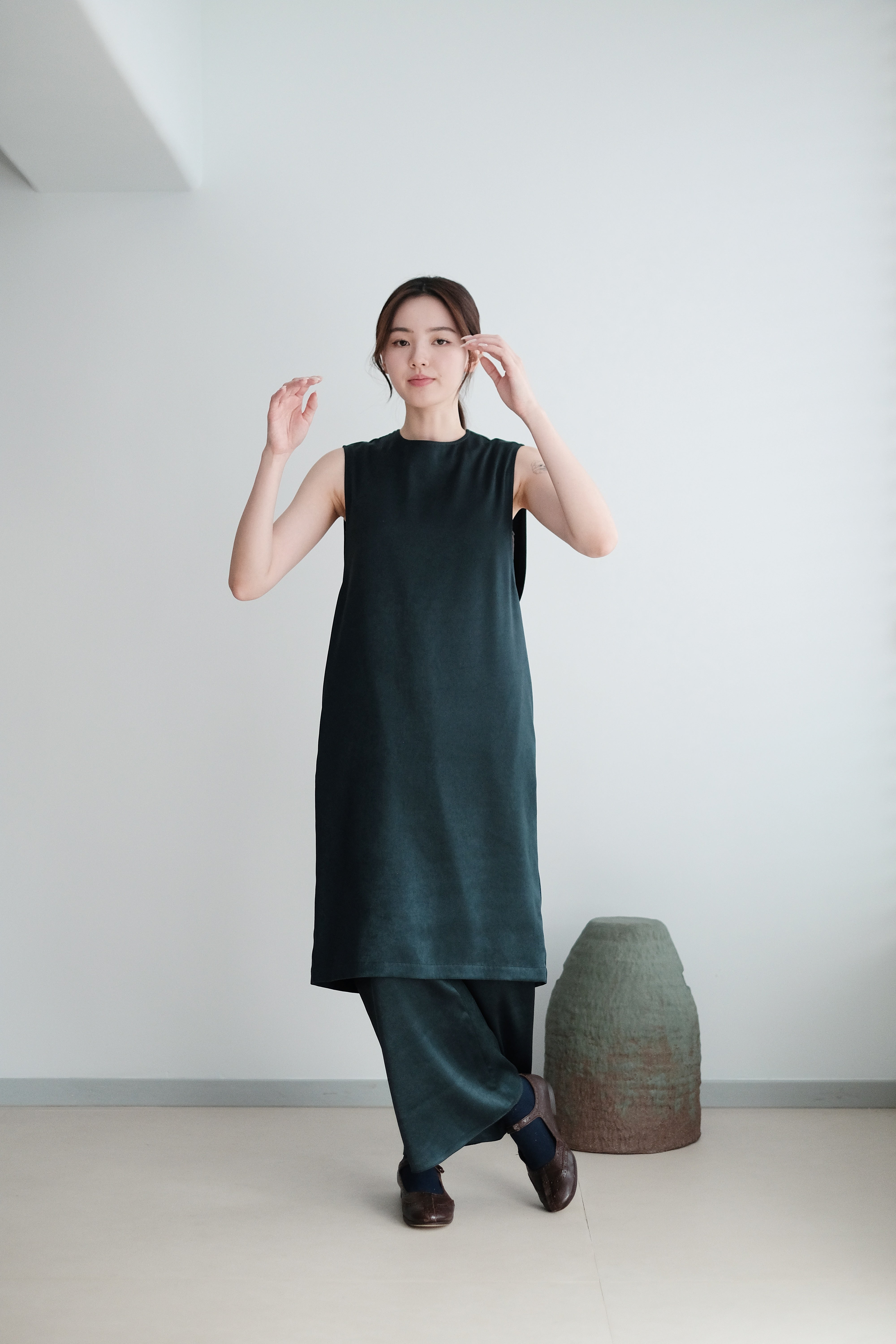 This sleeveless dress is made from a triacetate blend fabric with a subtle suede-like finish. Soft, breathable, and gently structured, it drapes beautifully on the body without clinging. The standout detail is the deep V-cut back, offering a refined yet understated sensuality. Discreet side pockets add practicality, and it can be worn alone or paired with matching trousers for a polished, coordinated look.