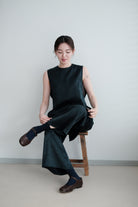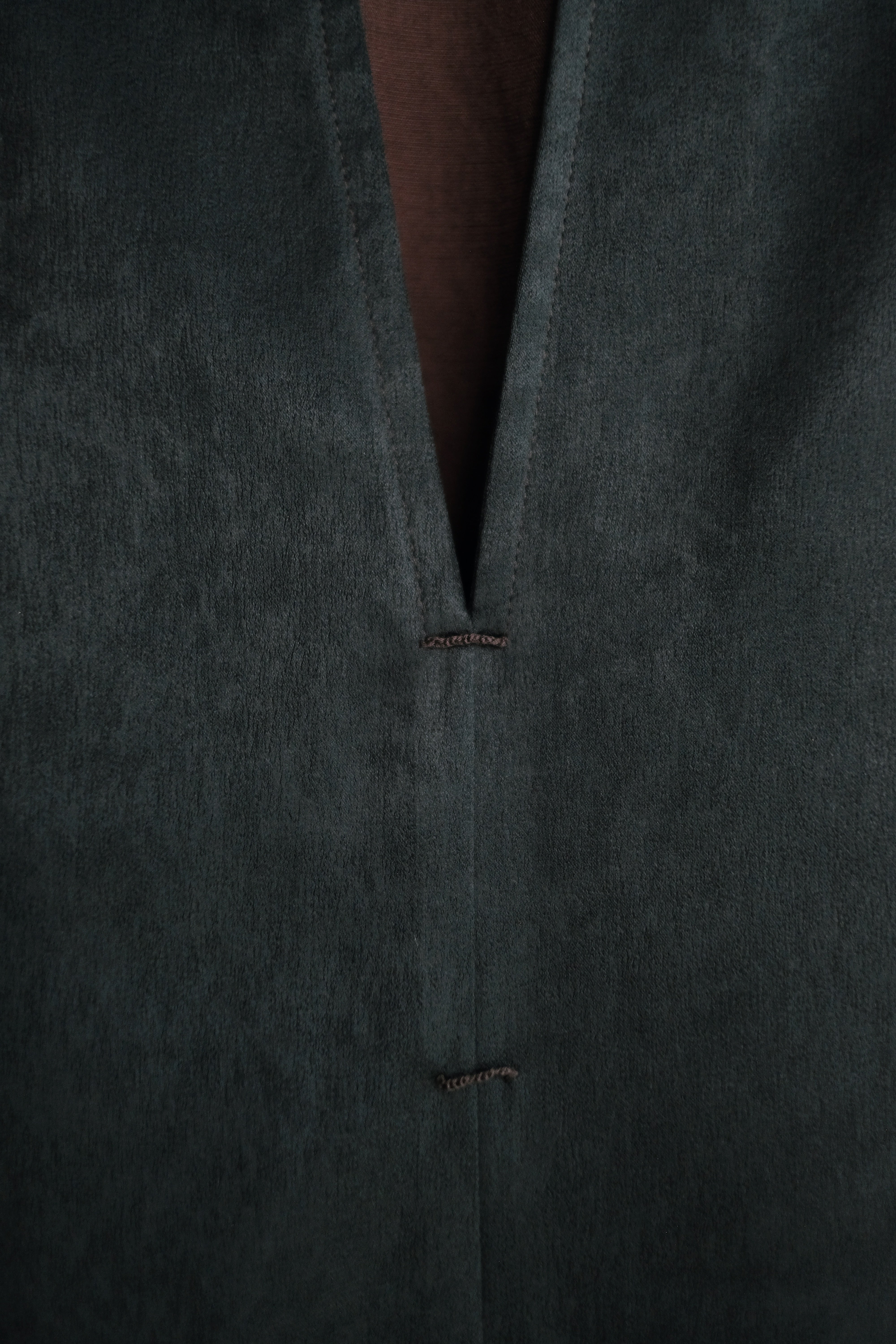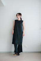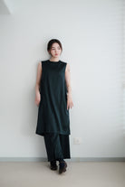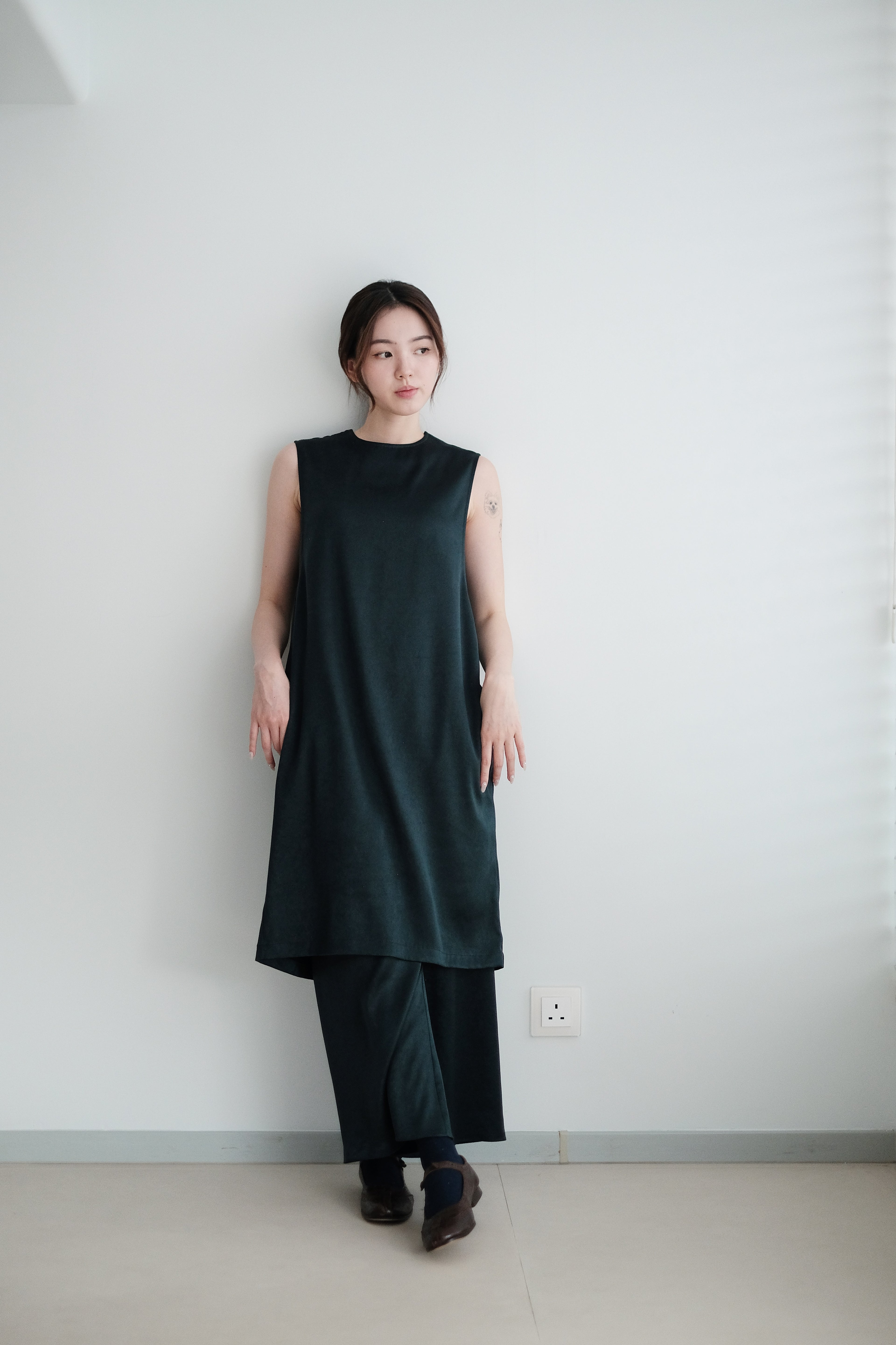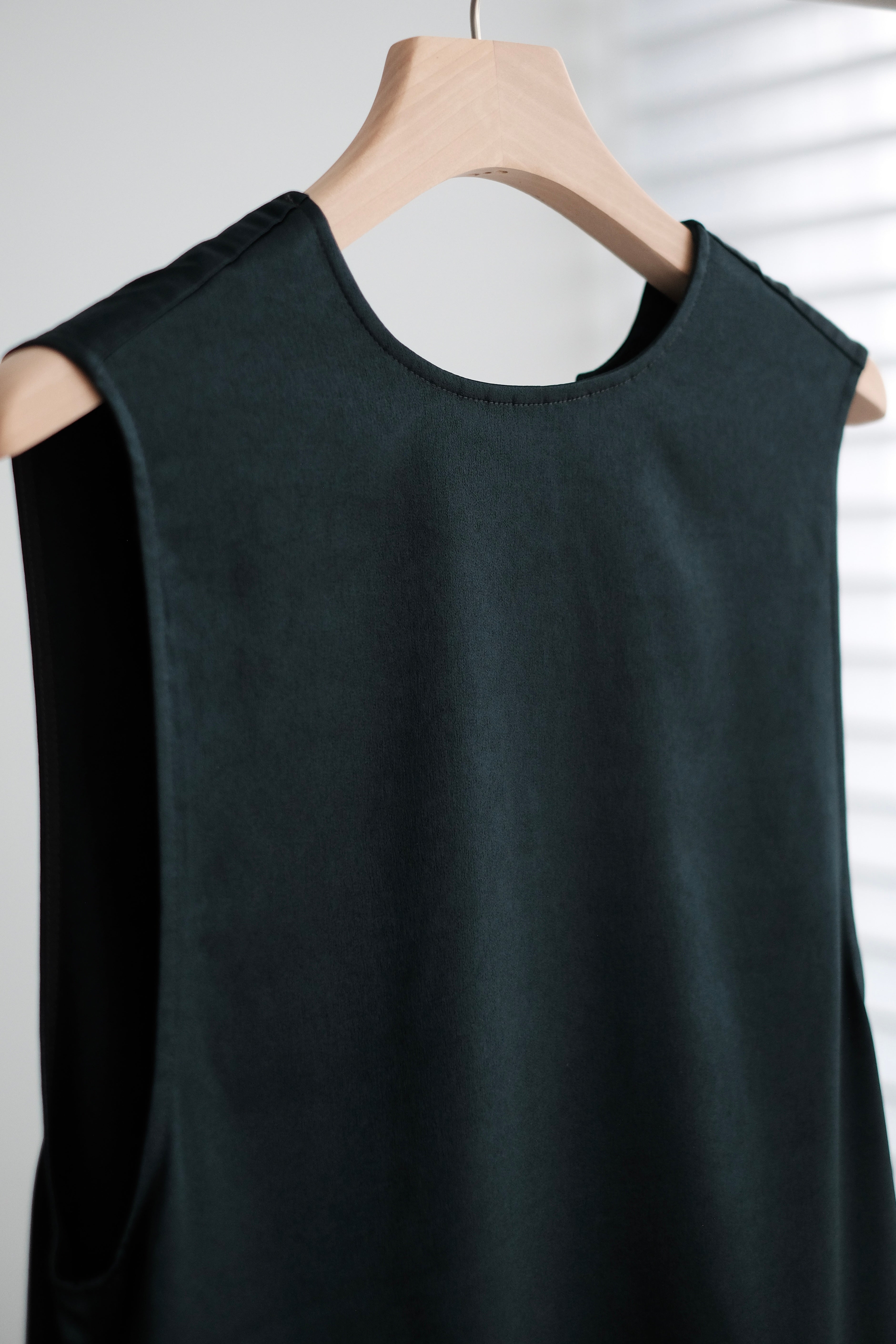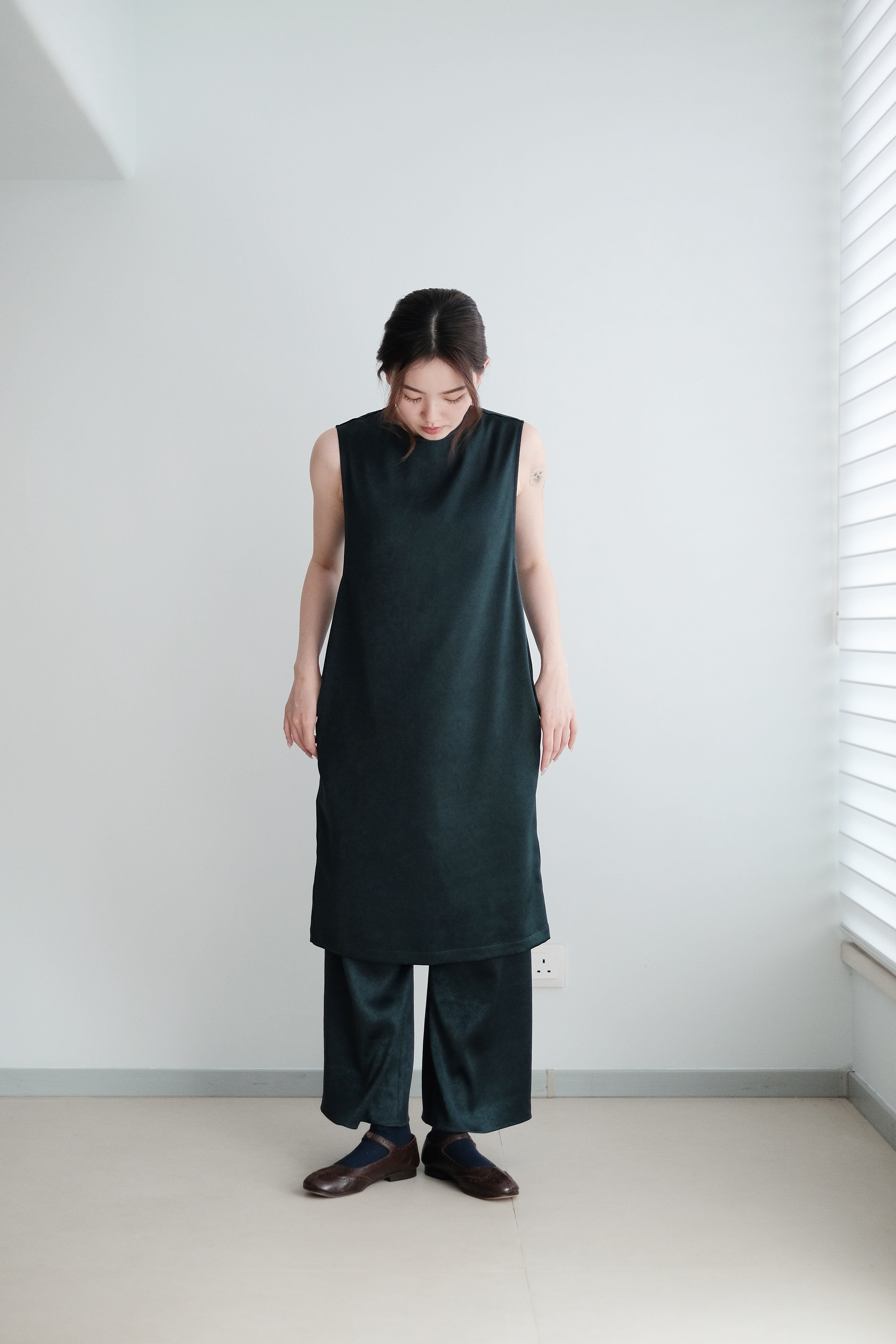This sleeveless dress is made from a triacetate blend fabric with a subtle suede-like finish. Soft, breathable, and gently structured, it drapes beautifully on the body without clinging. The standout detail is the deep V-cut back, offering a refined yet understated sensuality. Discreet side pockets add practicality, and it can be worn alone or paired with matching trousers for a polished, coordinated look.
