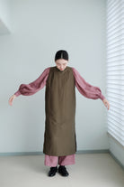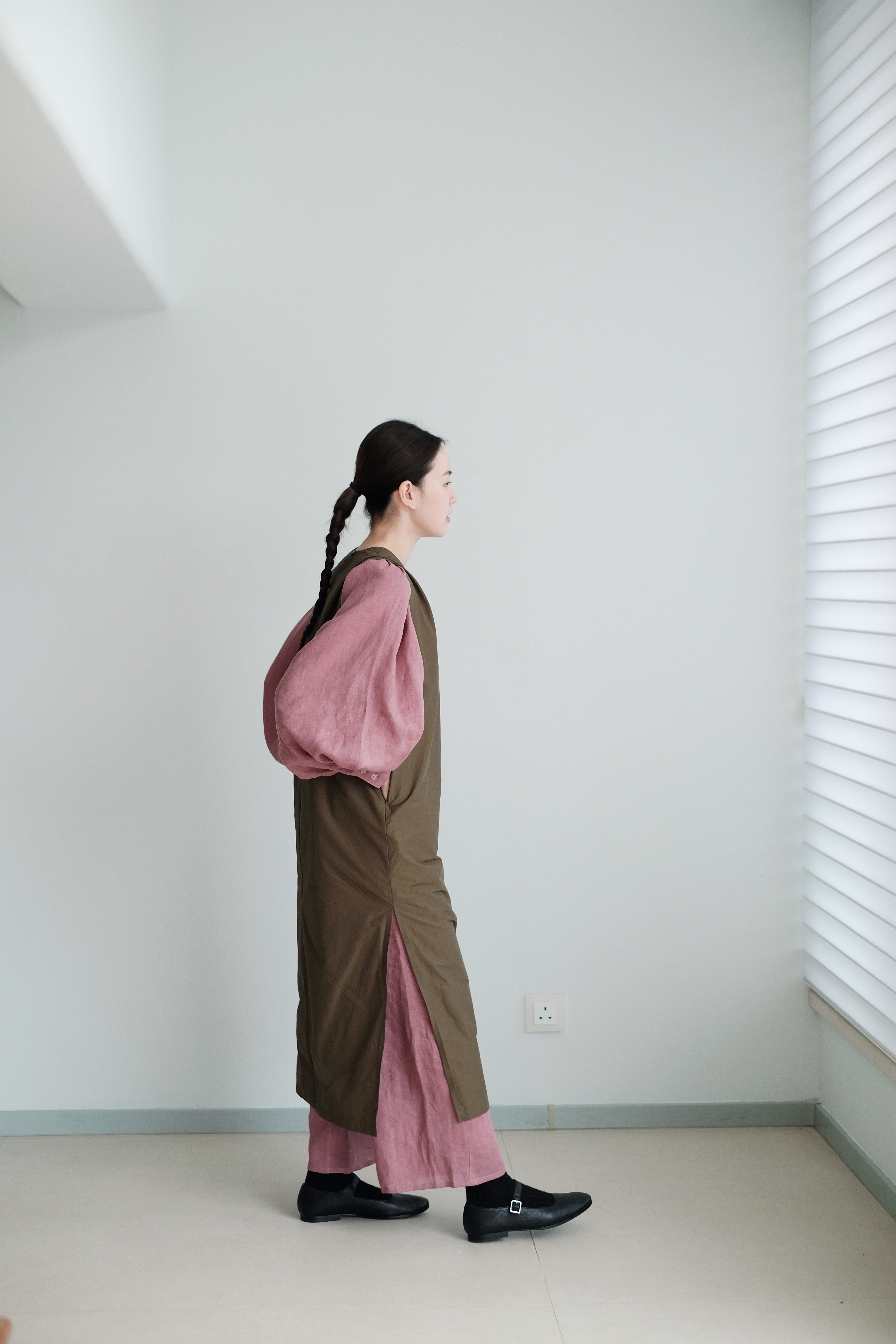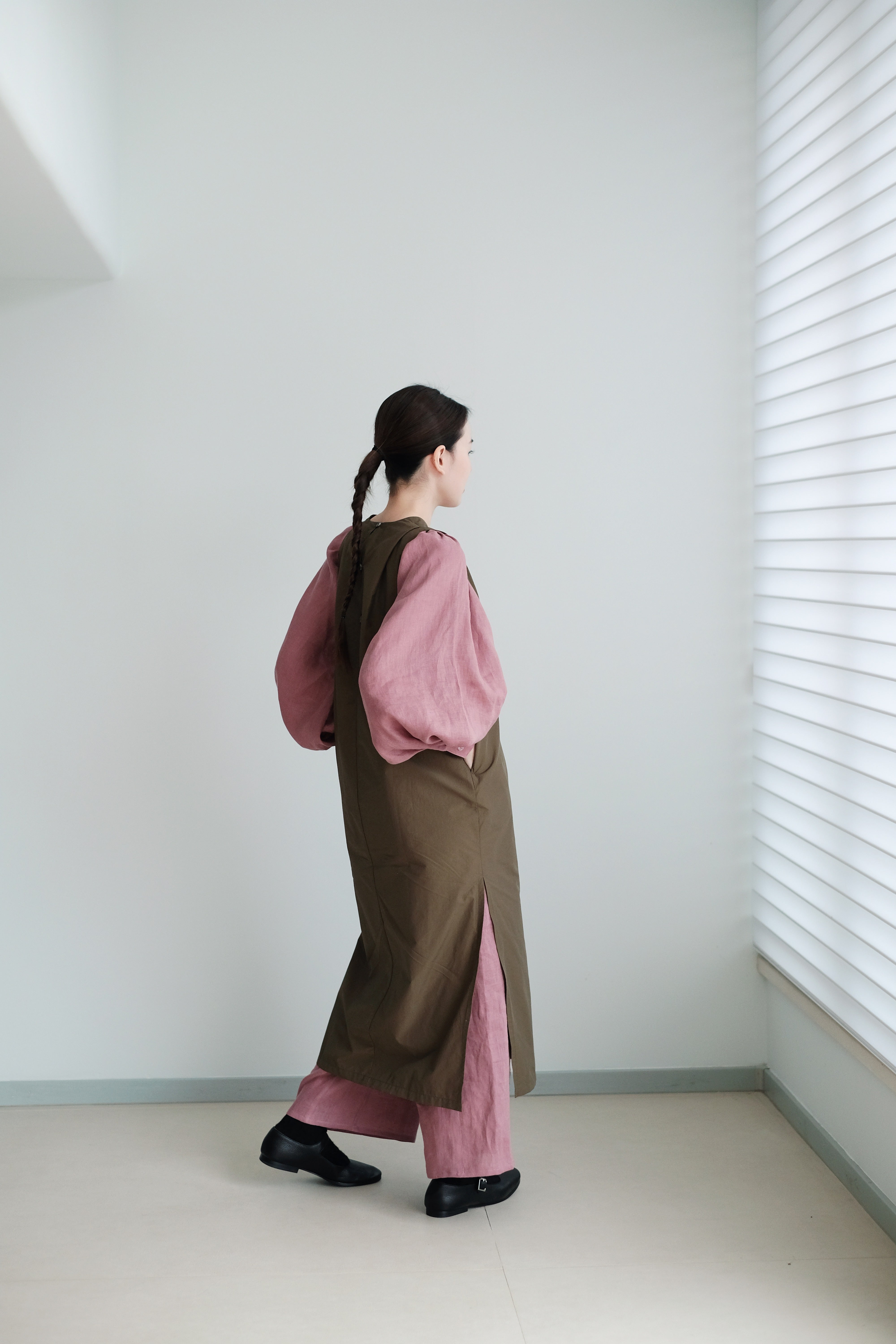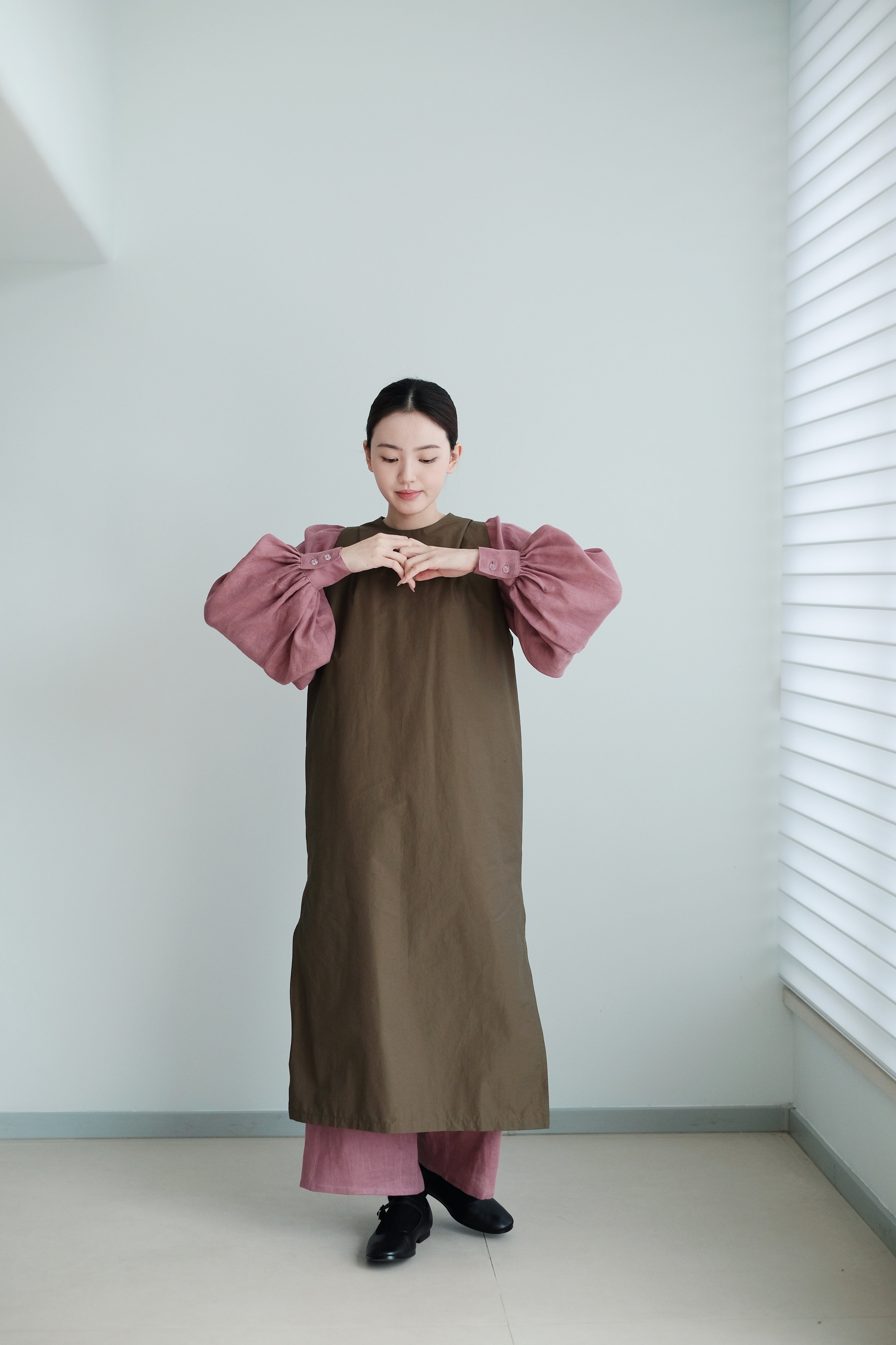 The voluminous balloon sleeves taper neatly at the cuffs, balancing ease and structure.