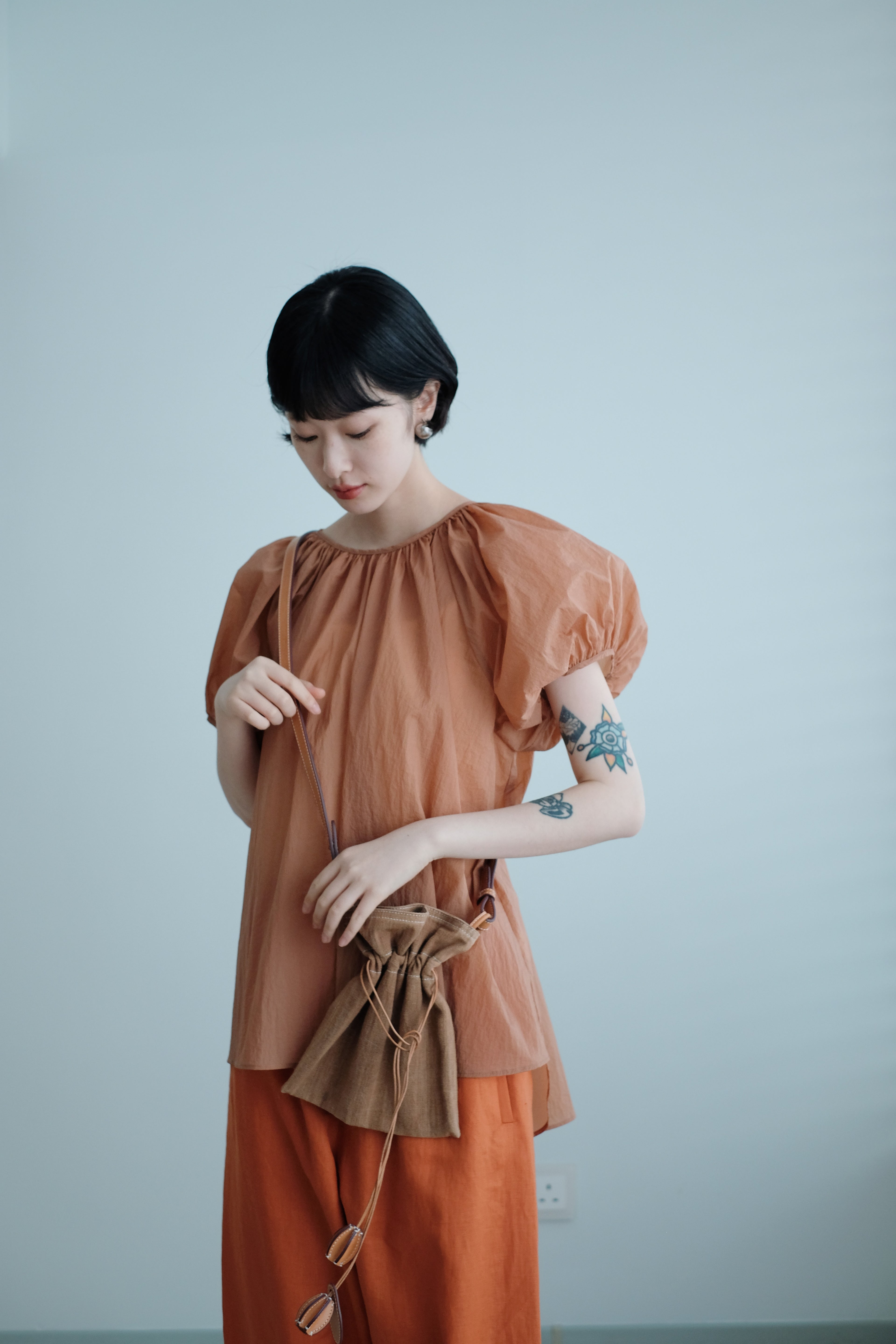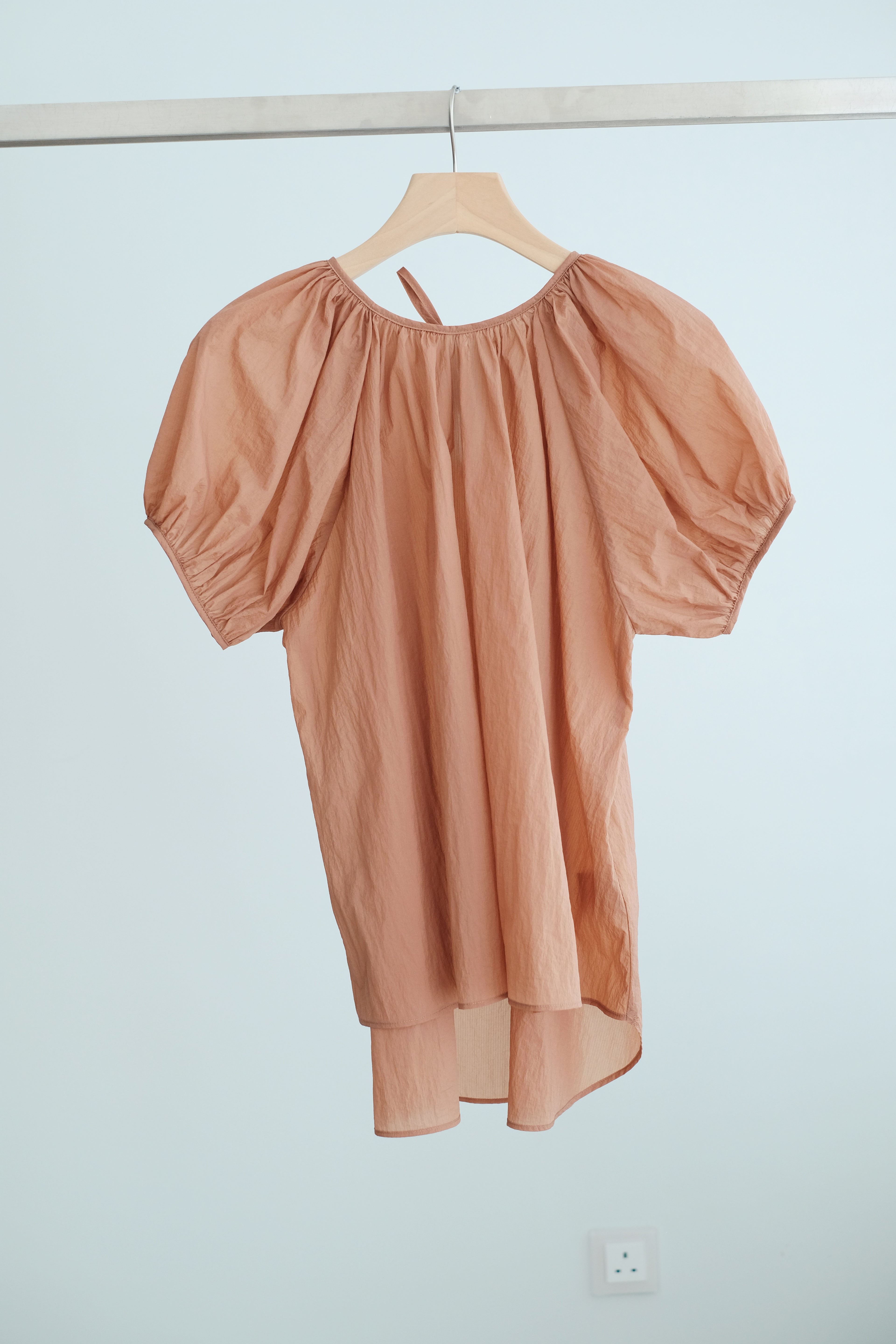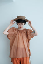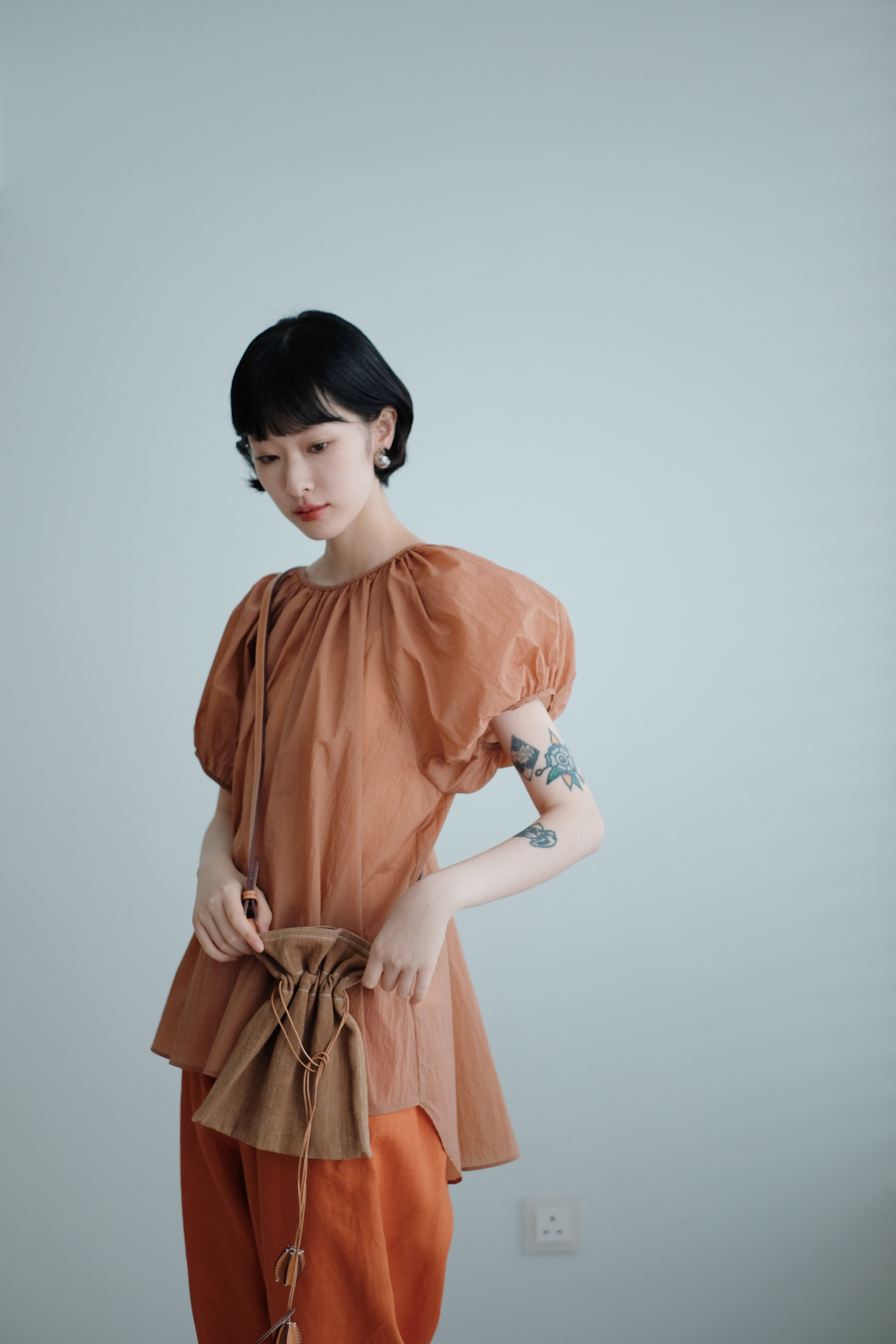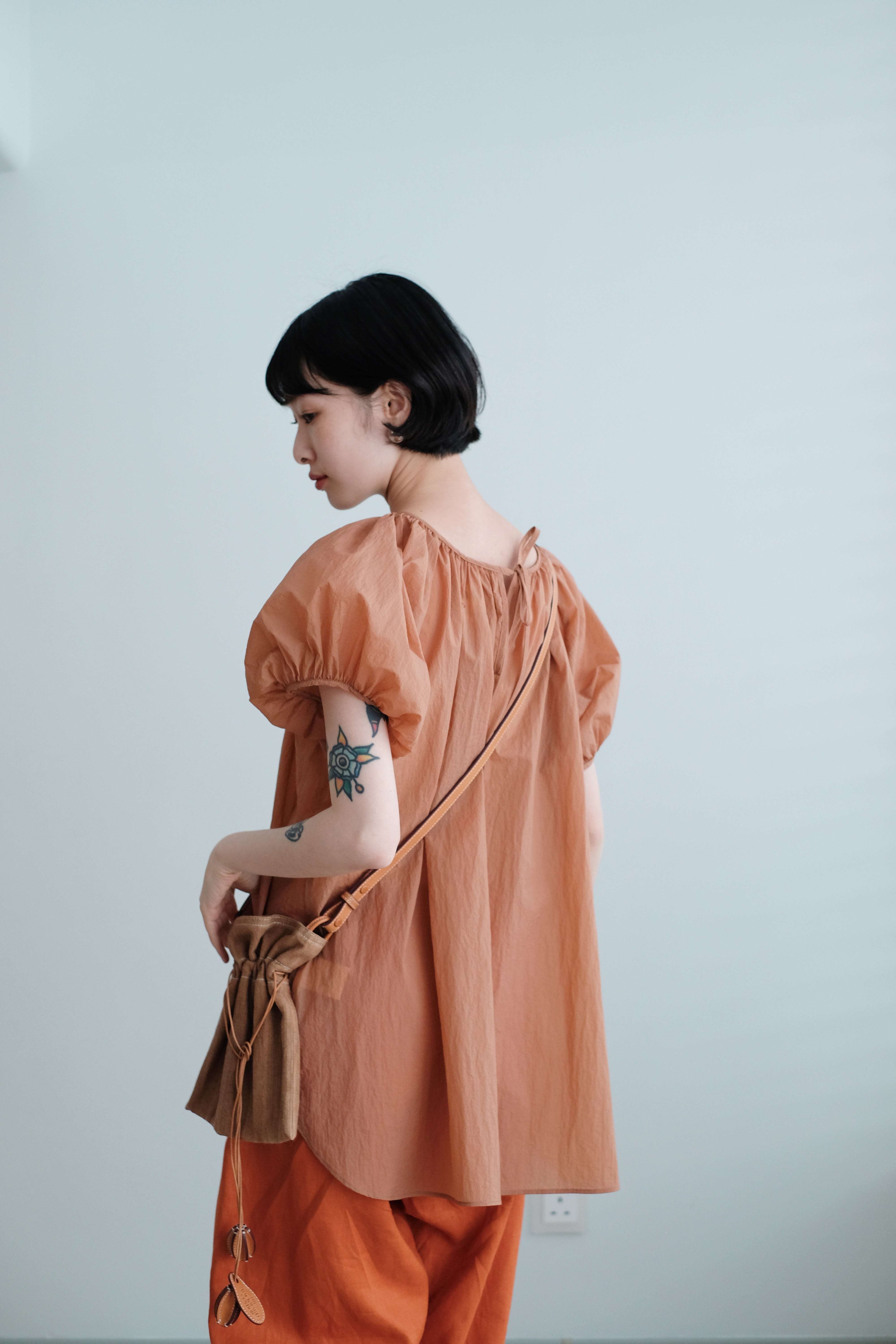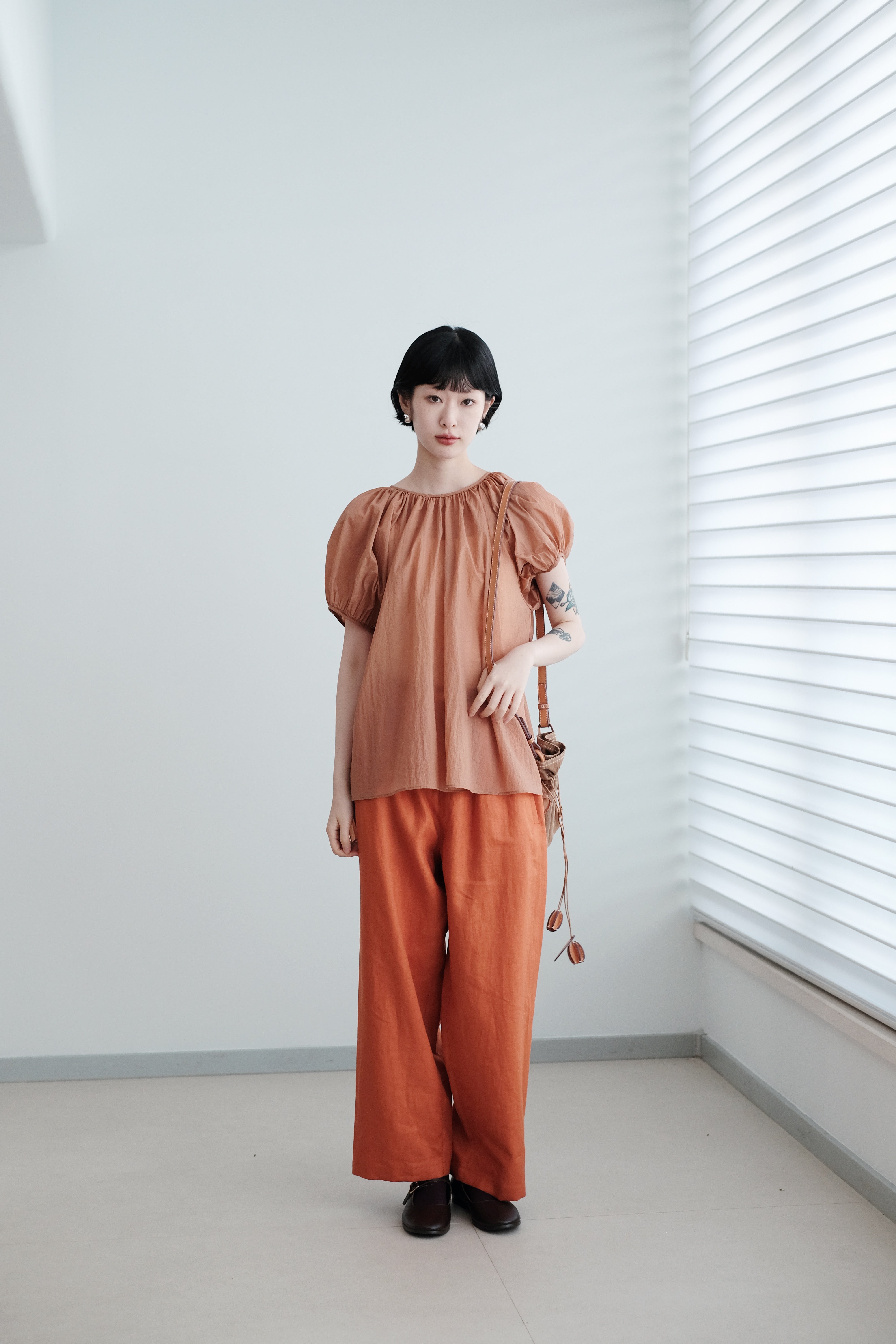 This rust-orange blouse is crafted from a lightweight fabric with puff sleeves at the shoulders, adding a soft volume to the silhouette. The back features a tie detail, giving flexibility and a relaxed fit. The fabric has a subtle sheen with a light drape, making it comfortable and breathable—perfect for summer wear on its own or styled in layers.