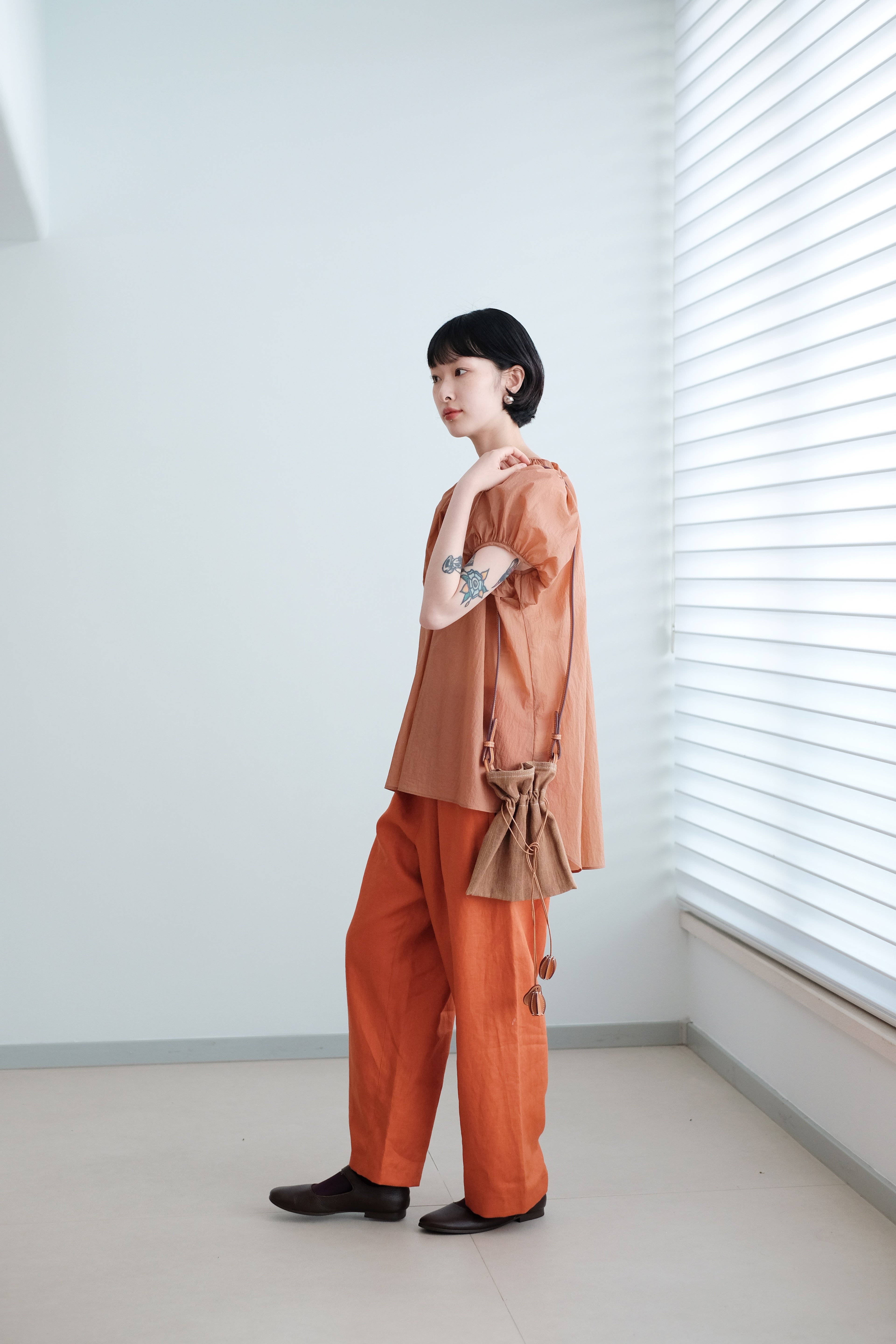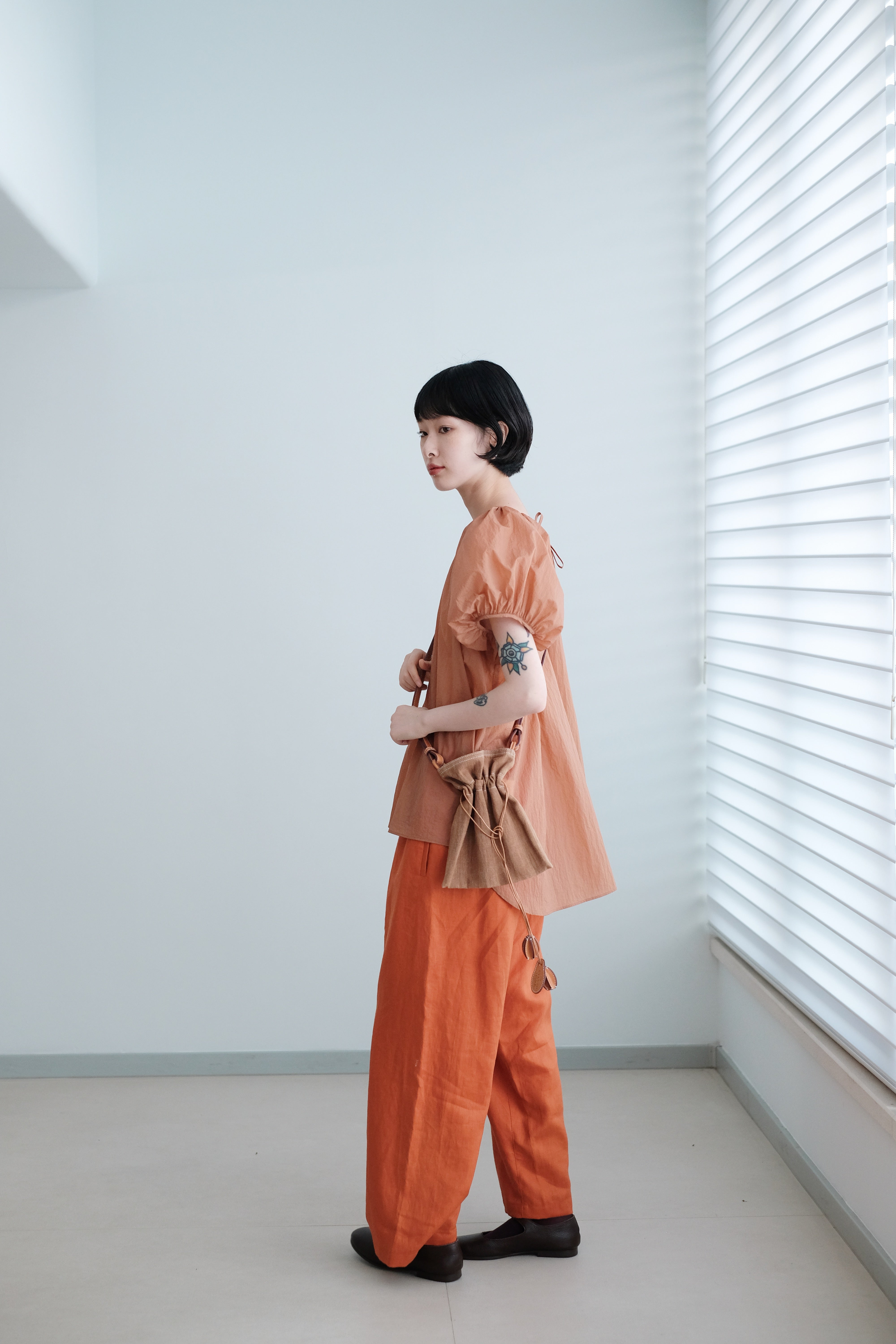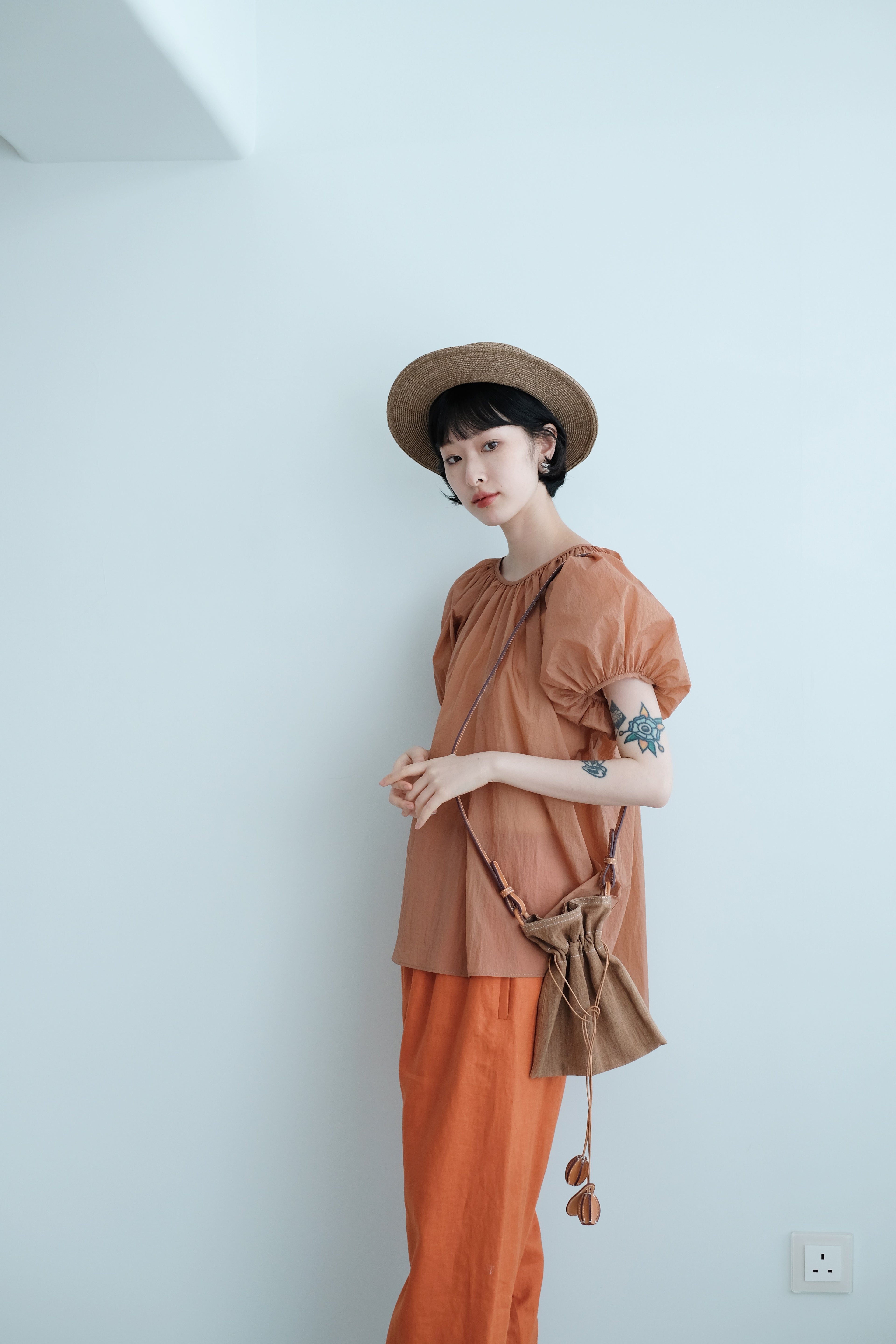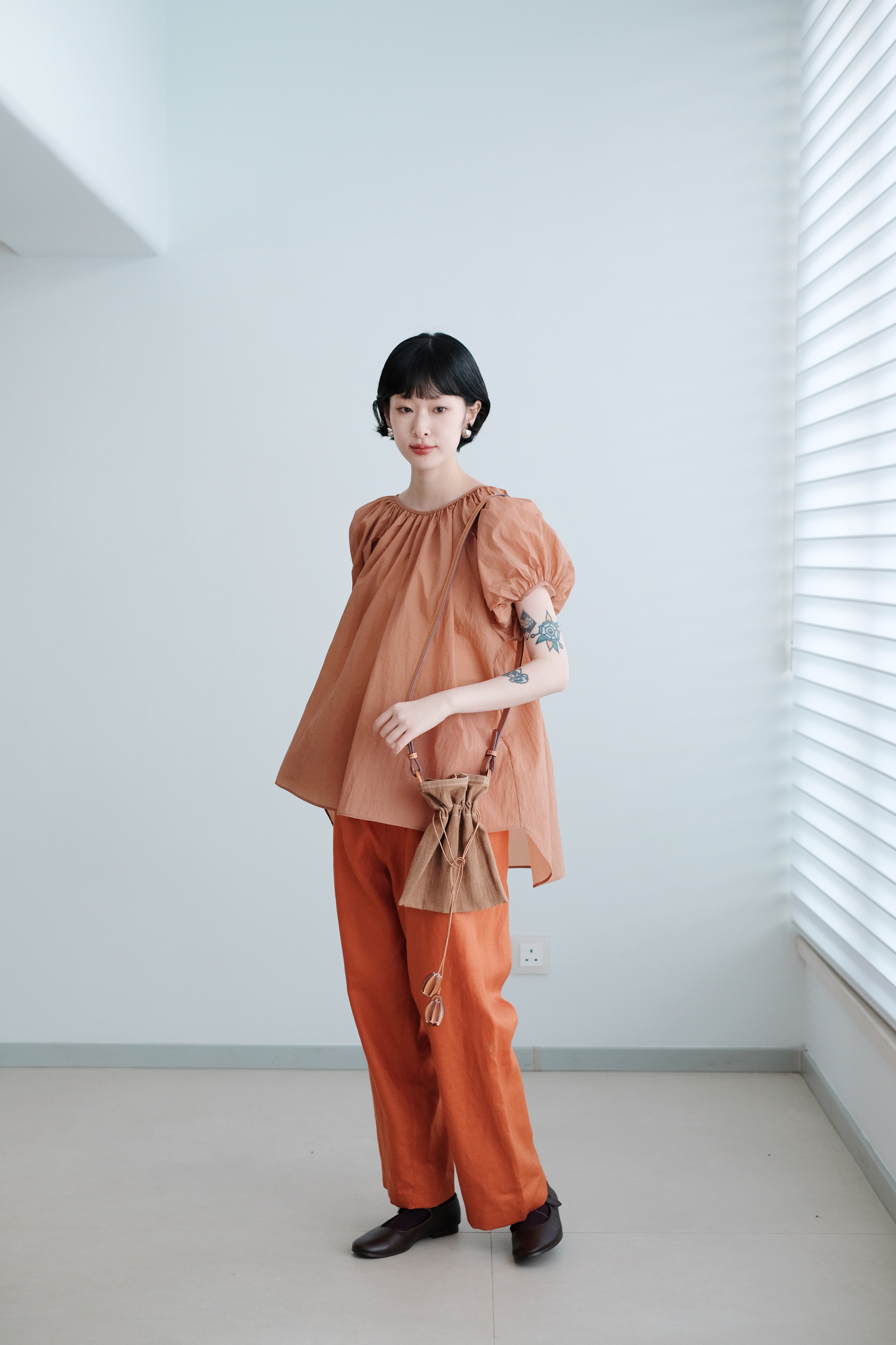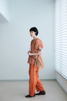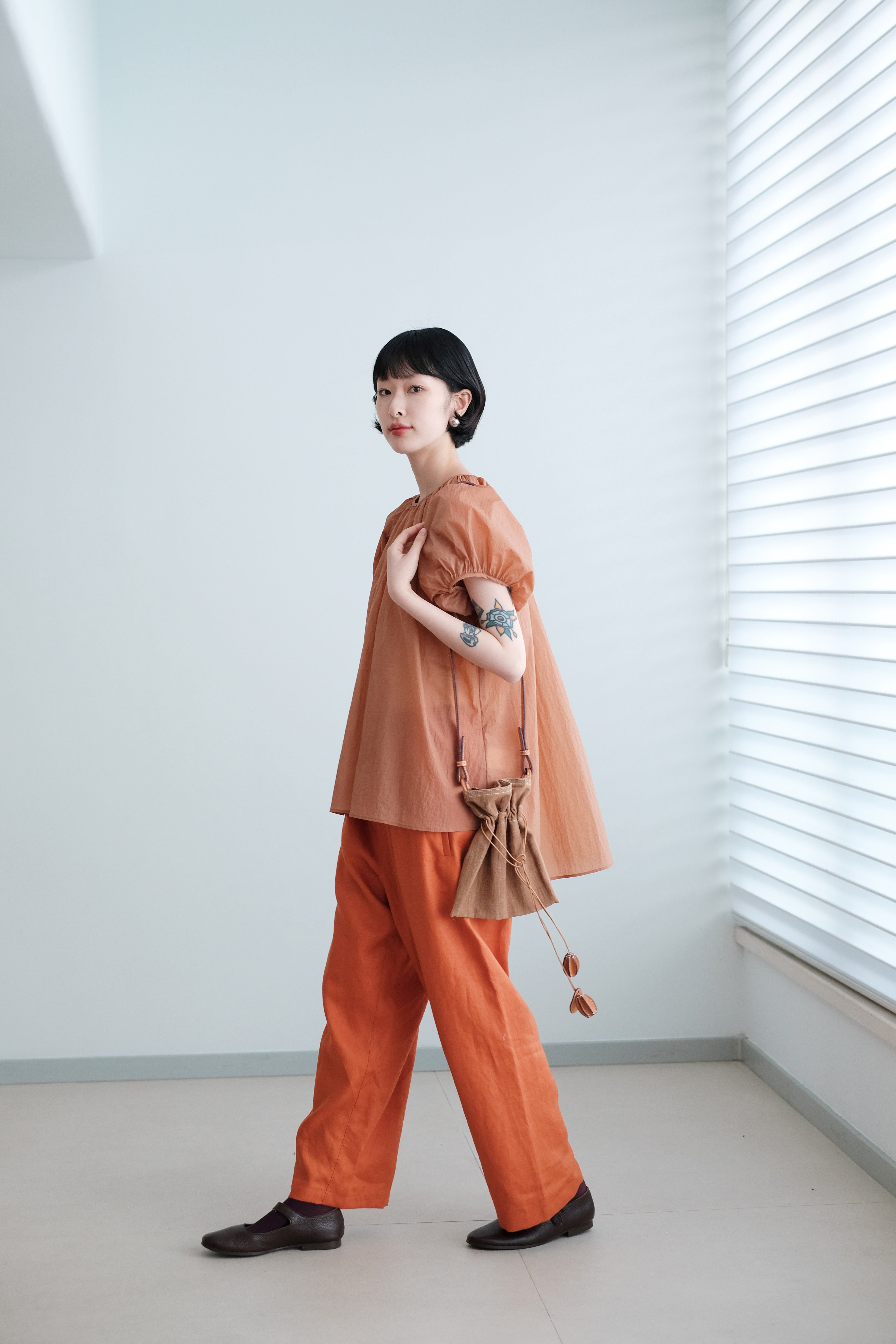 This rust-orange blouse is crafted from a lightweight fabric with puff sleeves at the shoulders, adding a soft volume to the silhouette. The back features a tie detail, giving flexibility and a relaxed fit. The fabric has a subtle sheen with a light drape, making it comfortable and breathable—perfect for summer wear on its own or styled in layers.