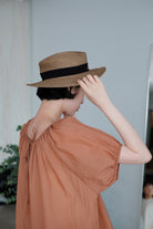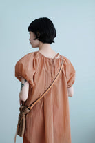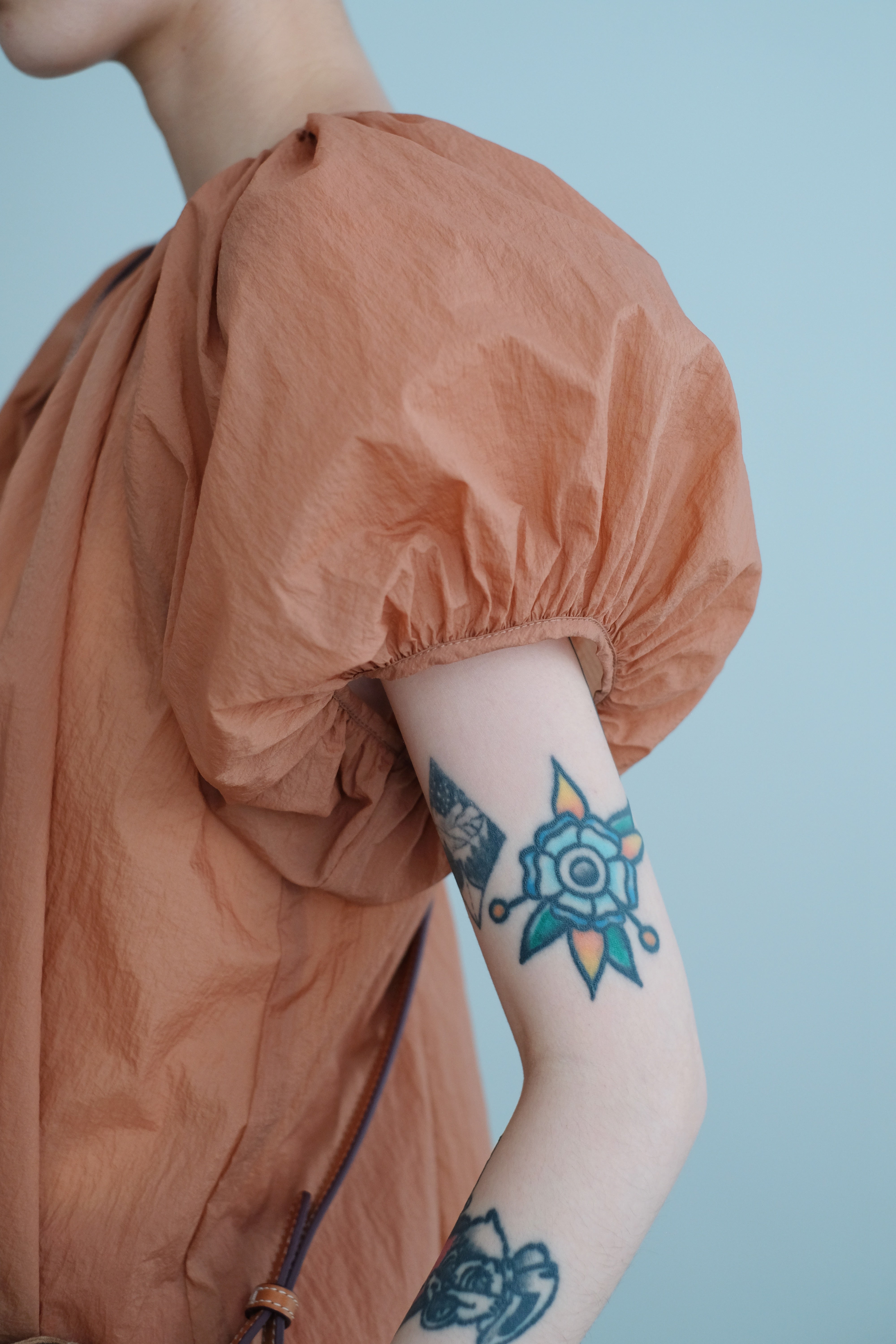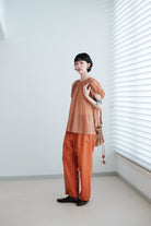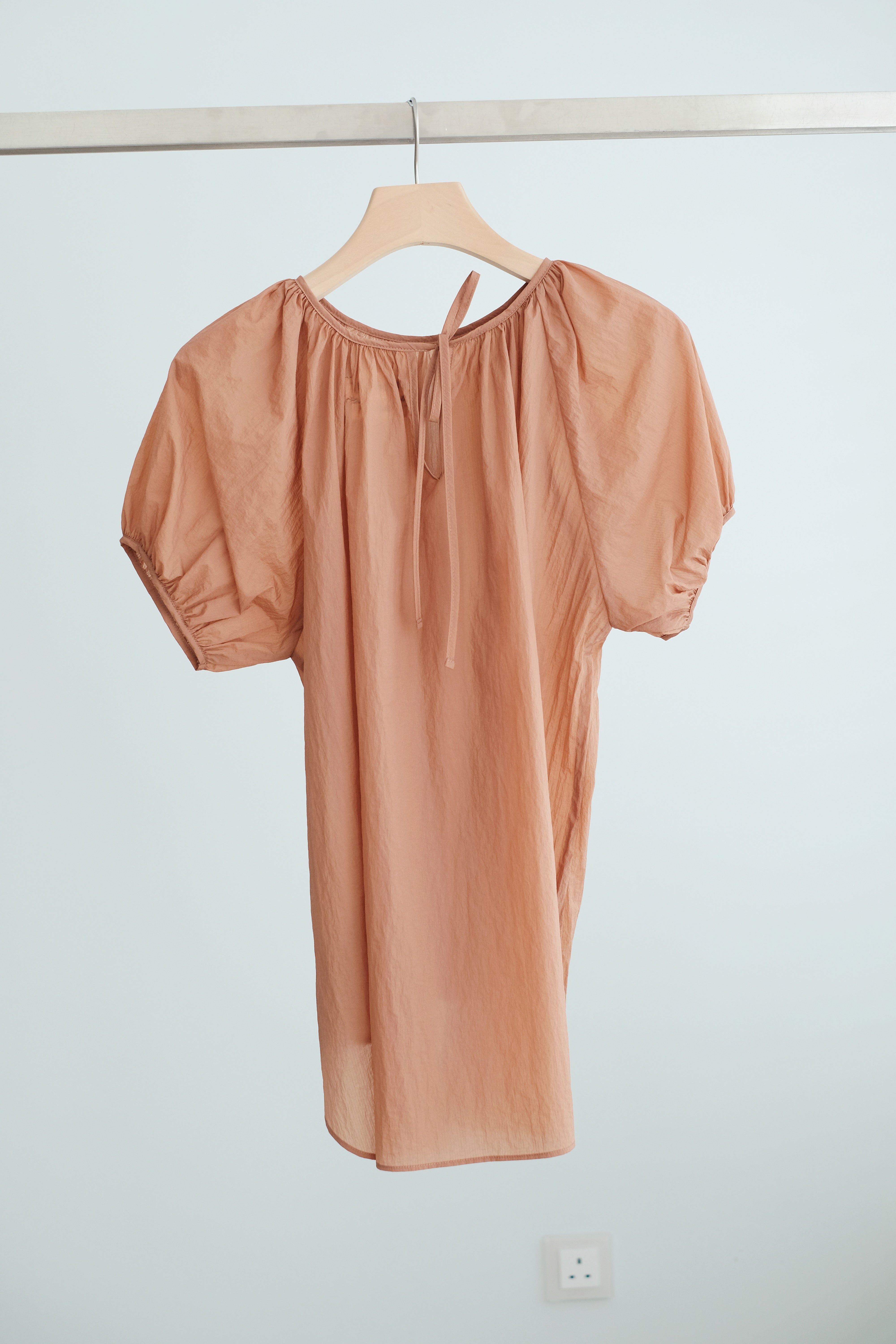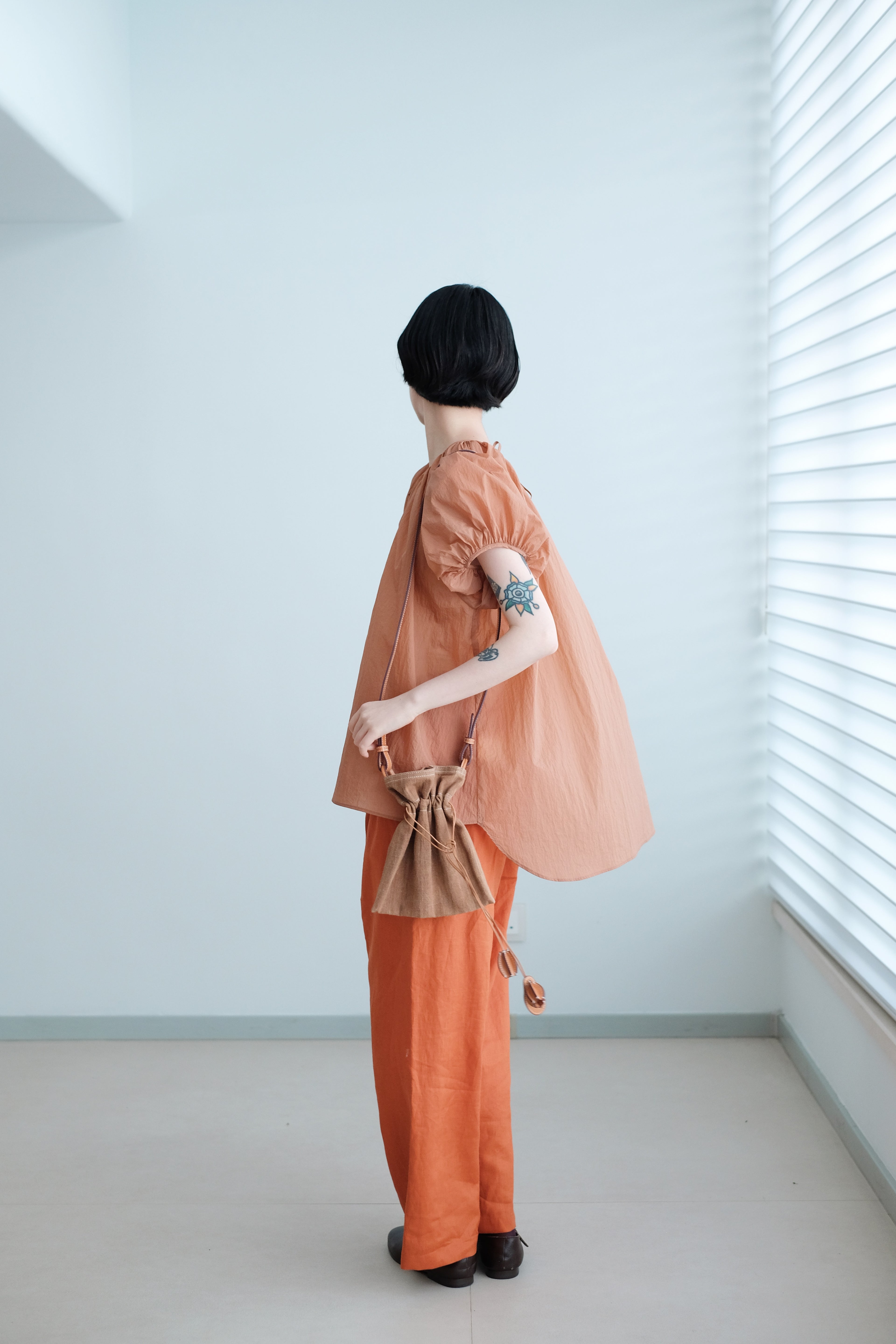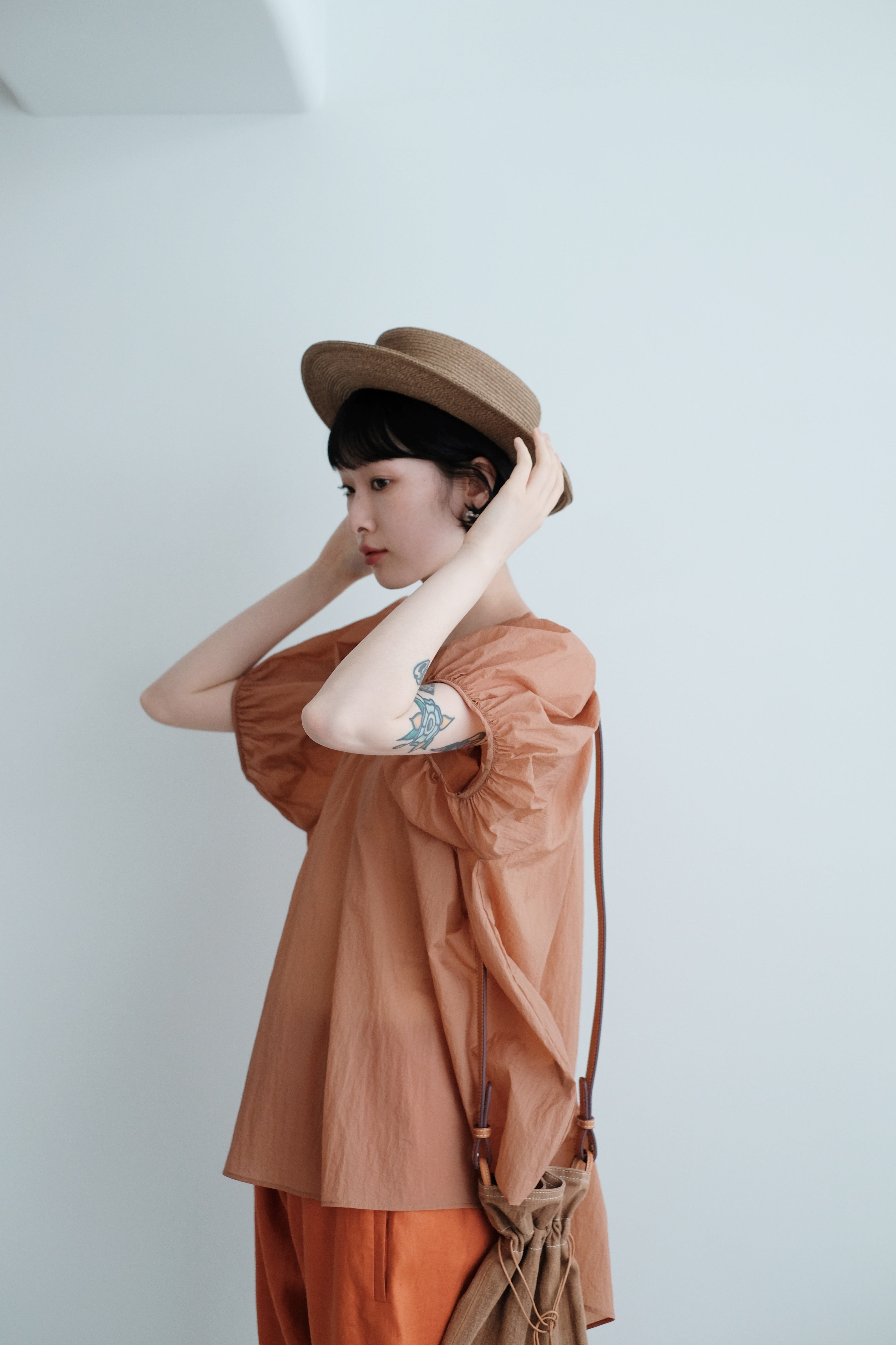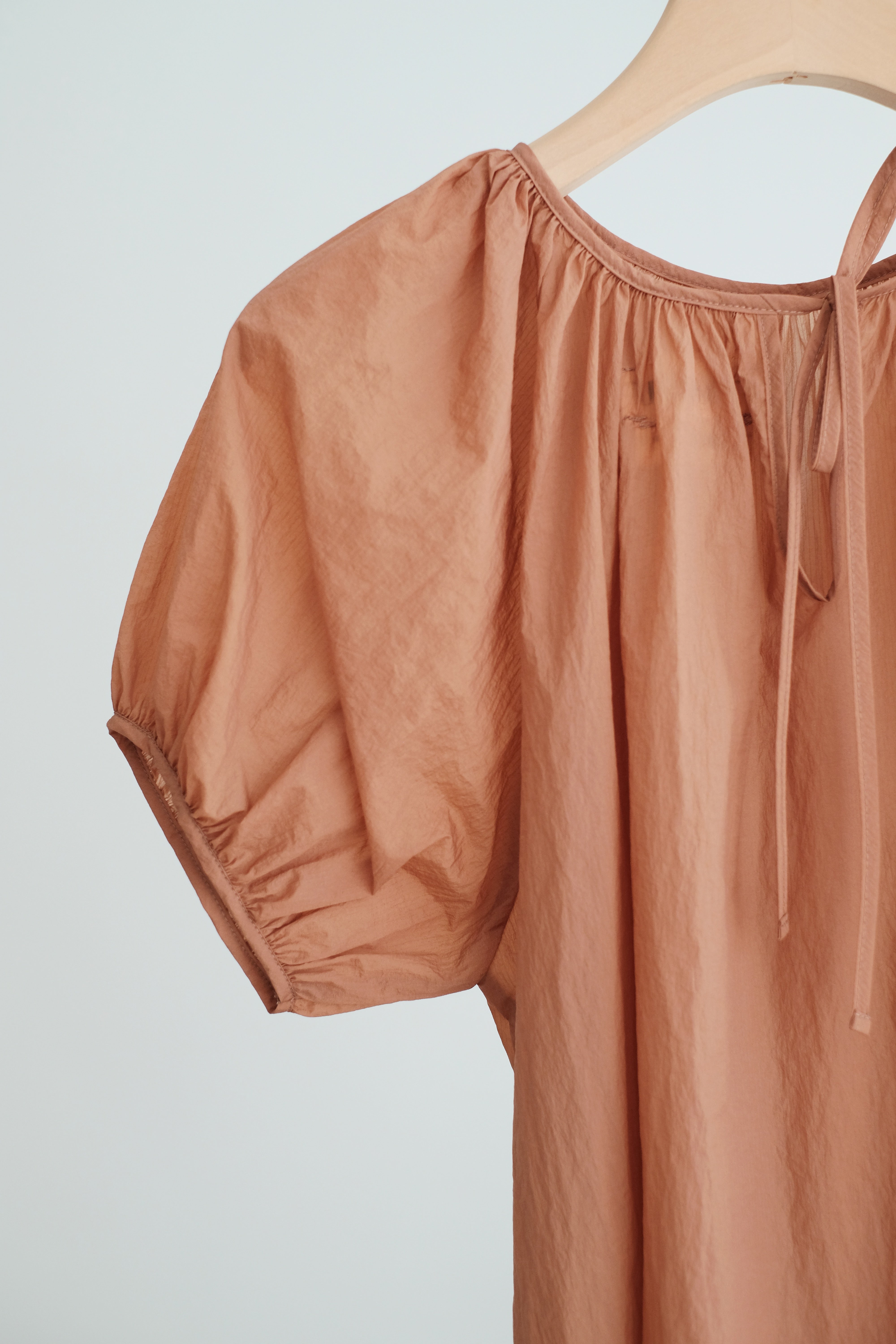 This rust-orange blouse is crafted from a lightweight fabric with puff sleeves at the shoulders, adding a soft volume to the silhouette. The back features a tie detail, giving flexibility and a relaxed fit. The fabric has a subtle sheen with a light drape, making it comfortable and breathable—perfect for summer wear on its own or styled in layers.