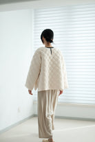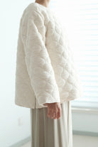 This quilted top in snow white features a unique honeycomb stitching pattern, adding depth and texture to the look. The soft and thick material provides excellent warmth and a comfortable, enveloping feel. The small two side opening detail adds an extra layer of style, making it a perfect choice for autumn and winter outfits, easily creating a simple yet distinctive look.