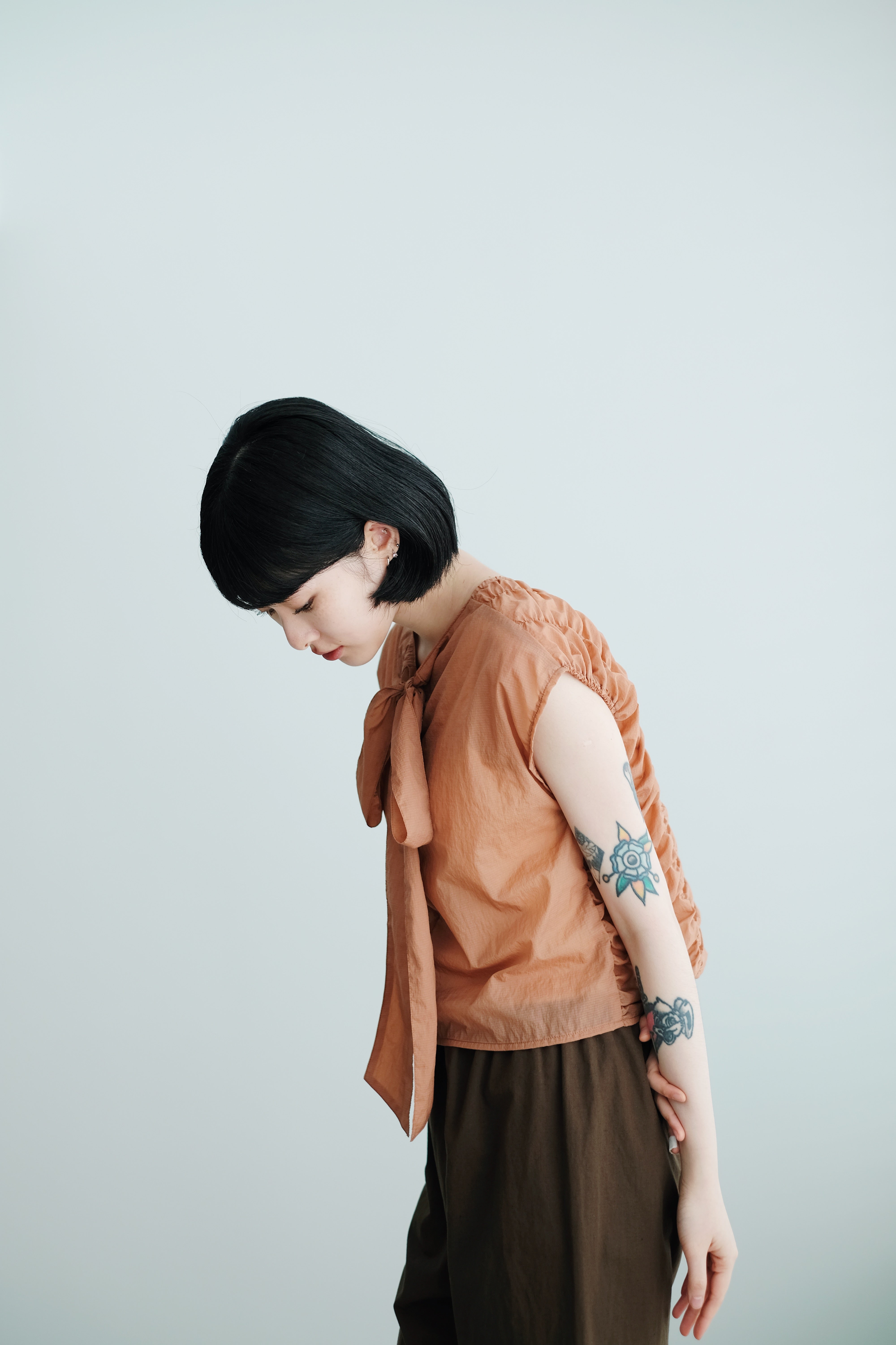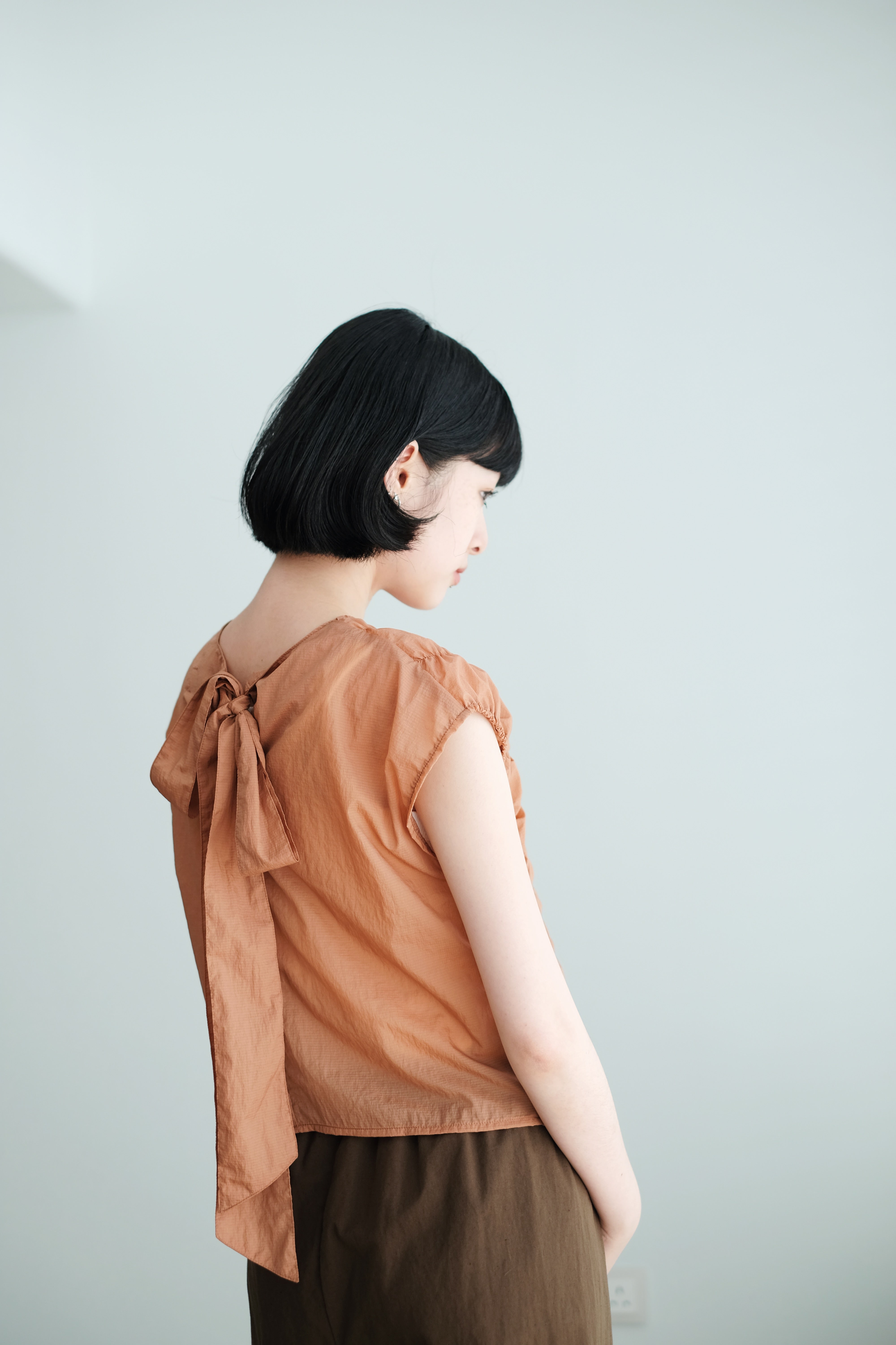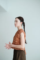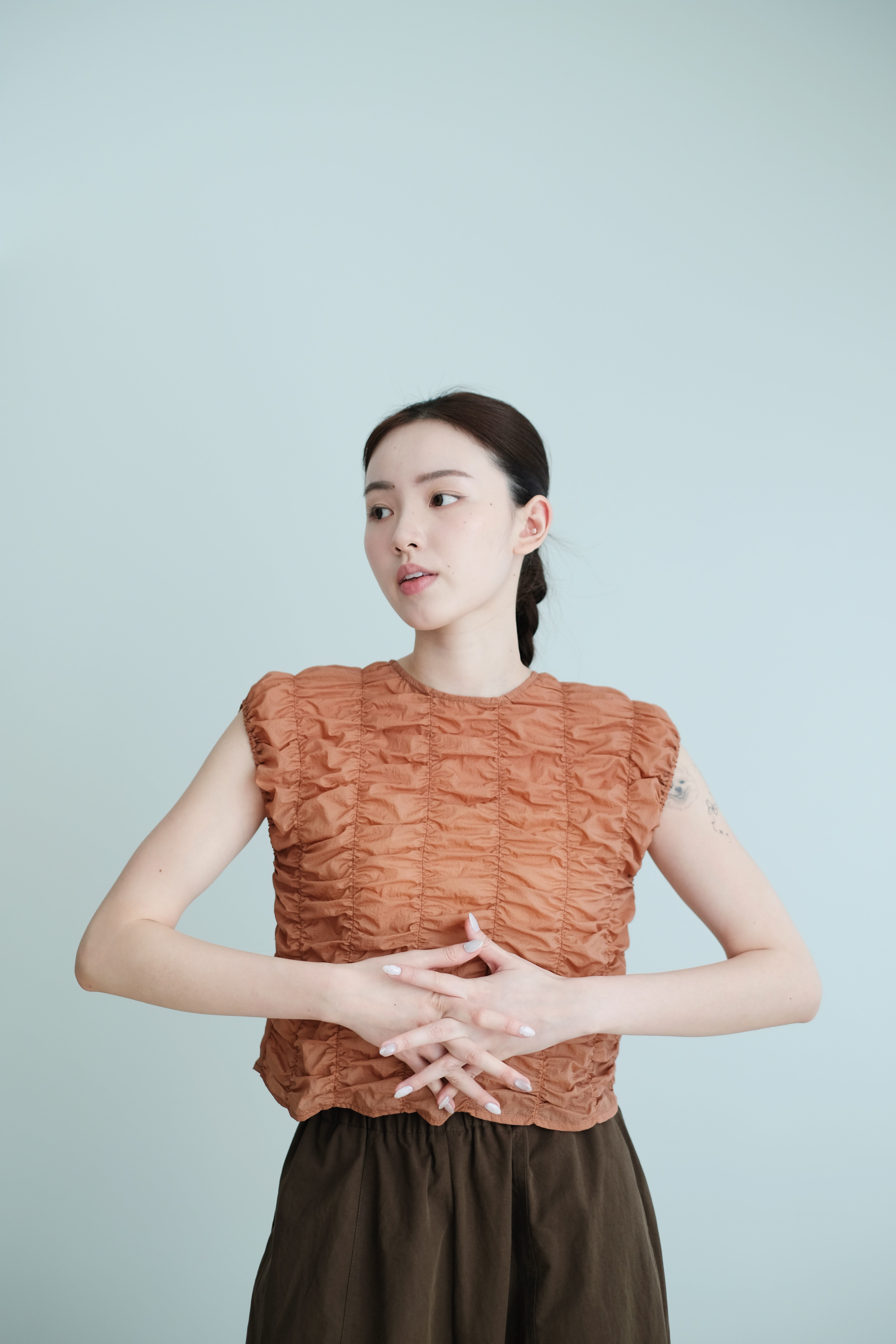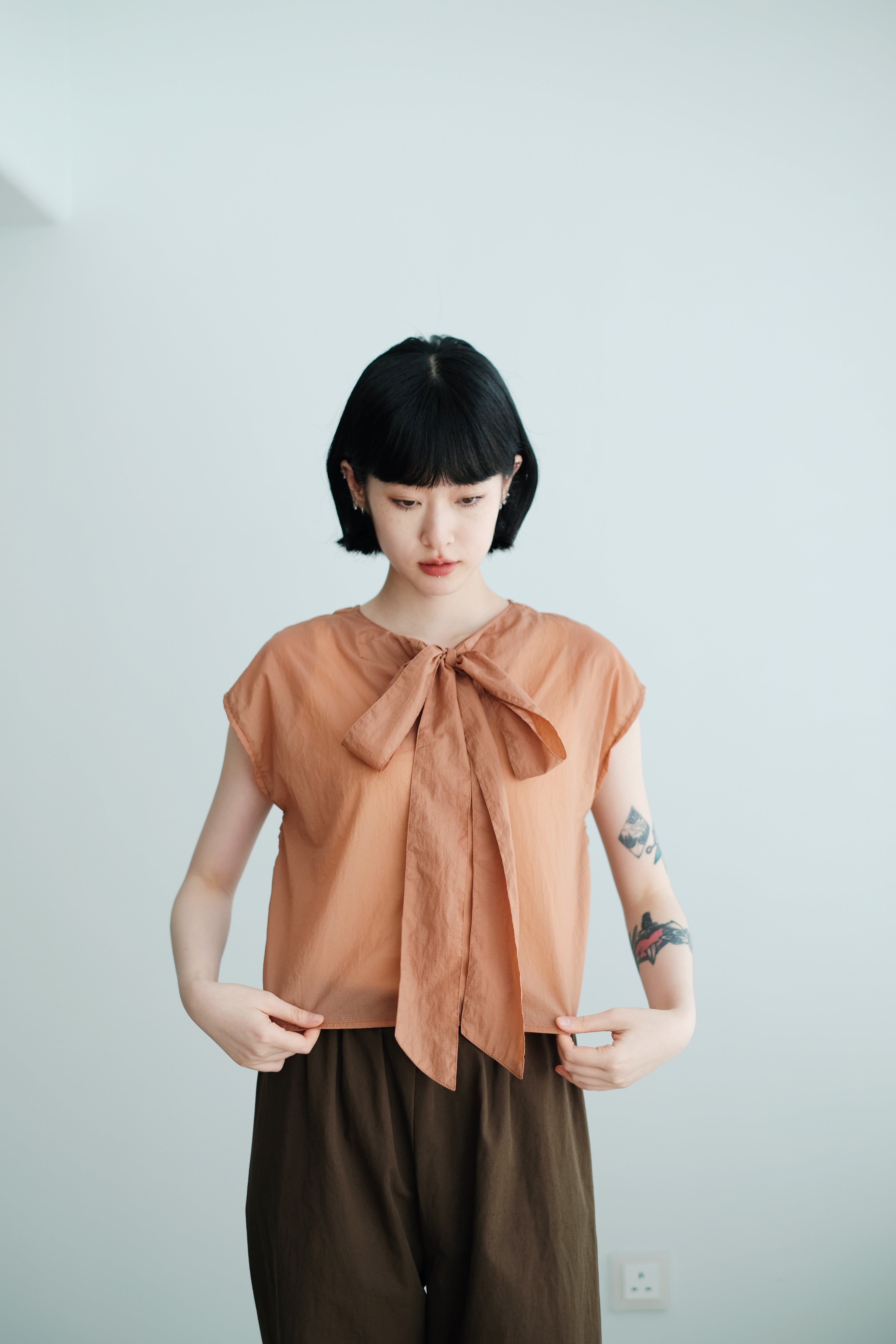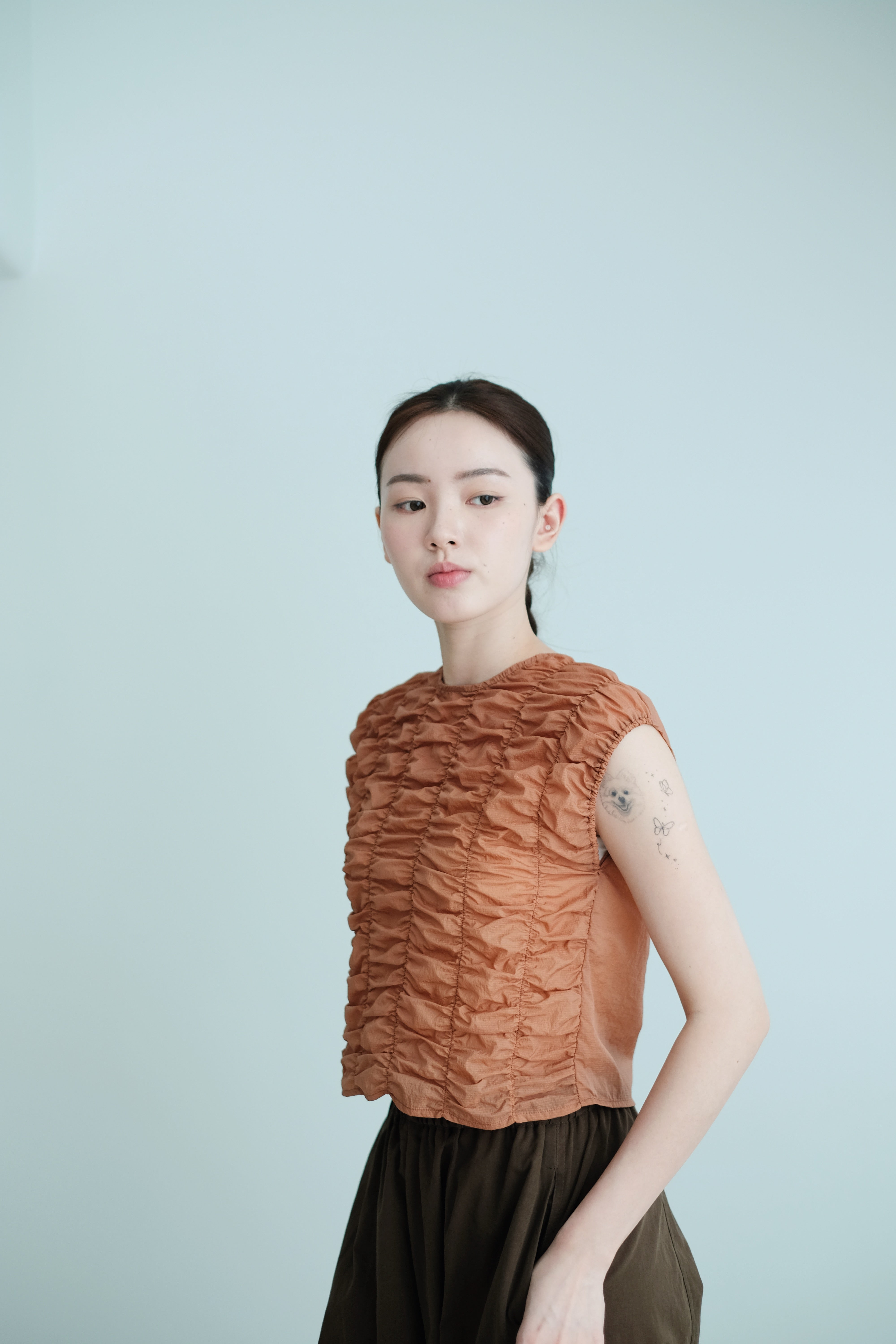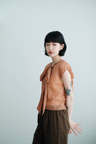 This bow-tie vest is a detail-oriented piece with a thoughtfully crafted design. The front features delicate ruching that creates rich texture and volume, while the back is highlighted by a wide, statement bow that adds both softness and structure. The shoulders are slightly extended with angled seams, naturally enhancing the arms’ silhouette. Made from a lightweight and smooth fabric, the vest comes in a deep tone between cocoa and coffee—subtle yet full of character.