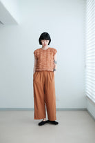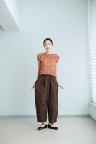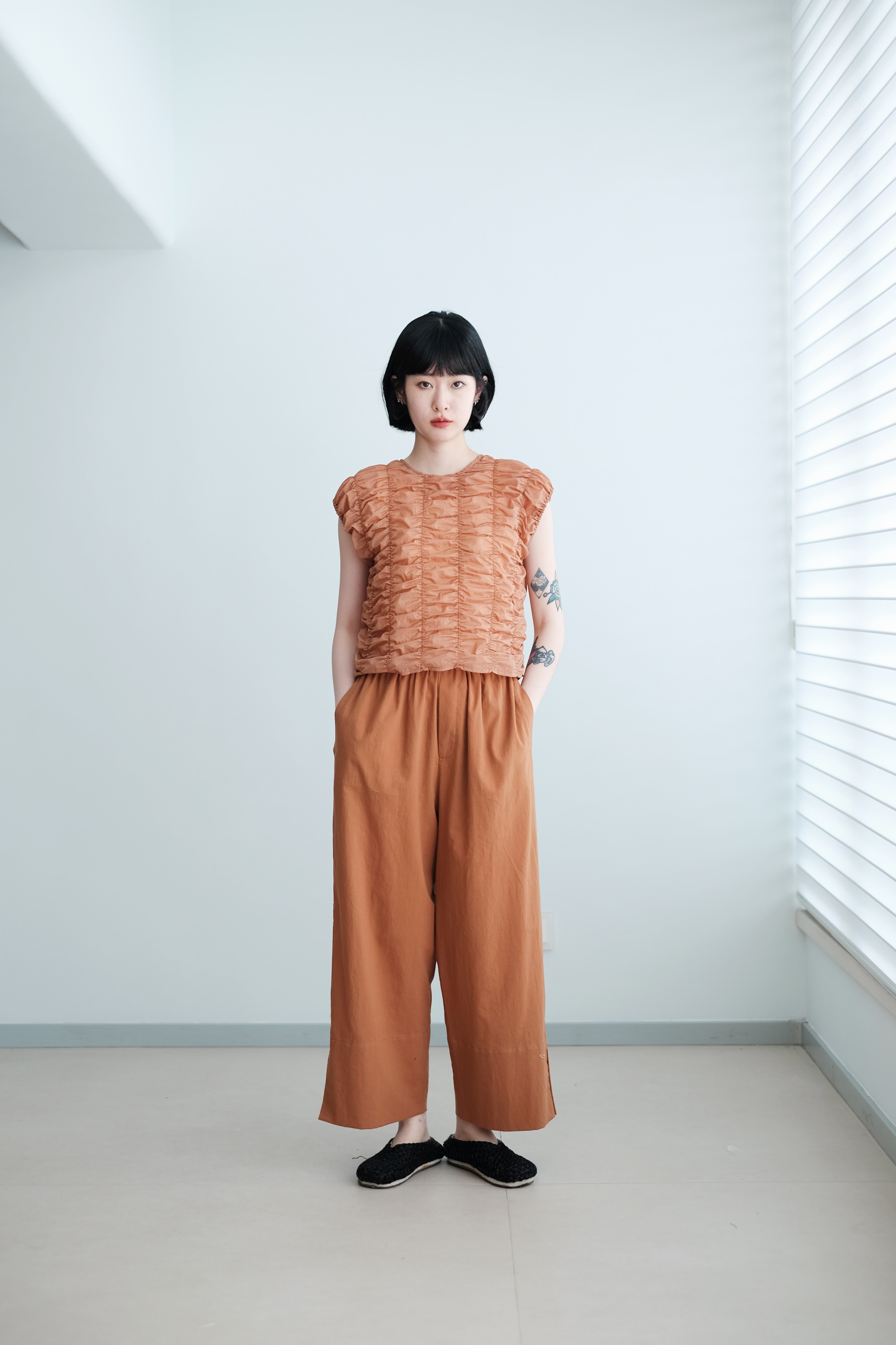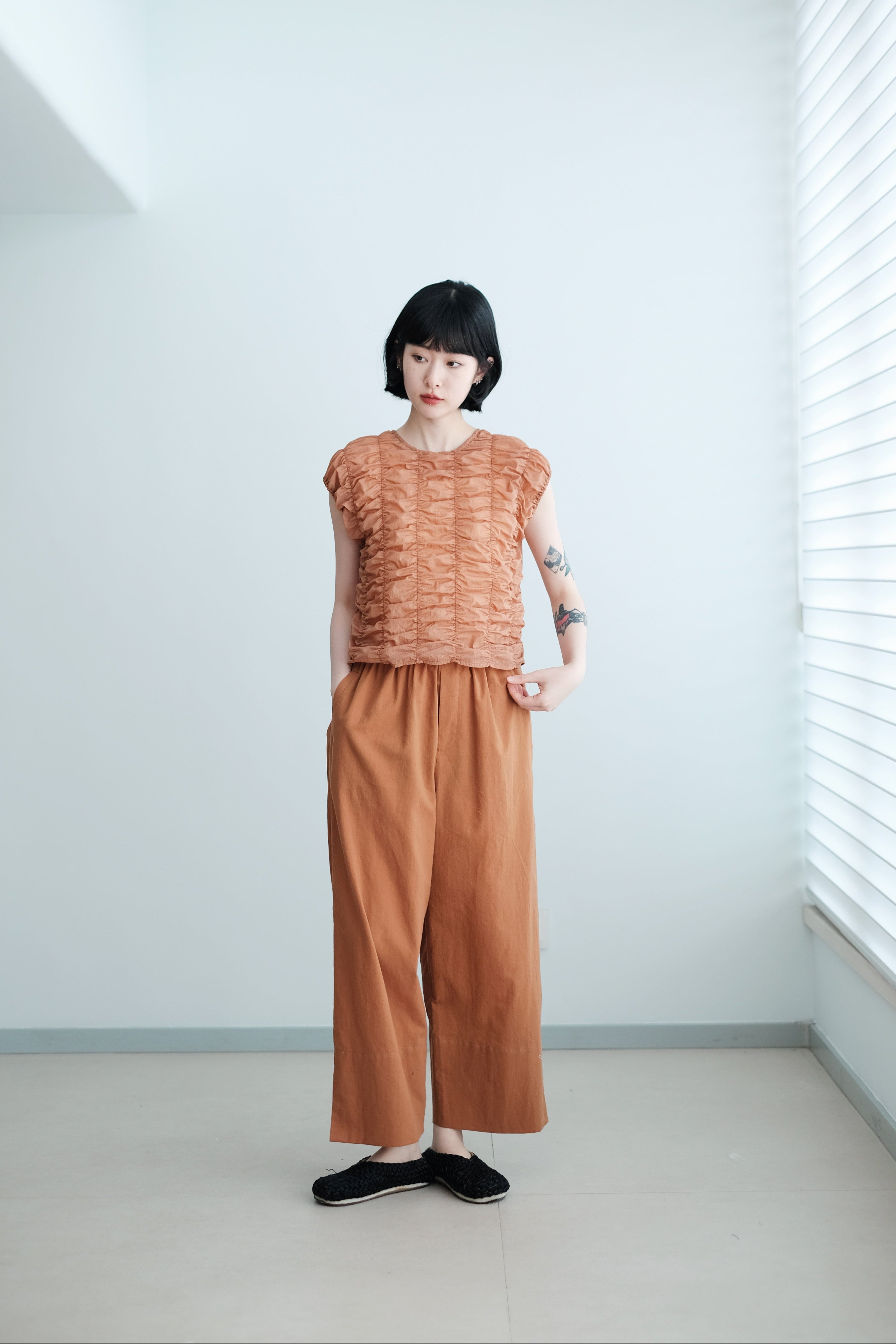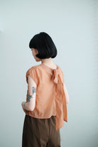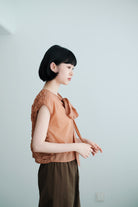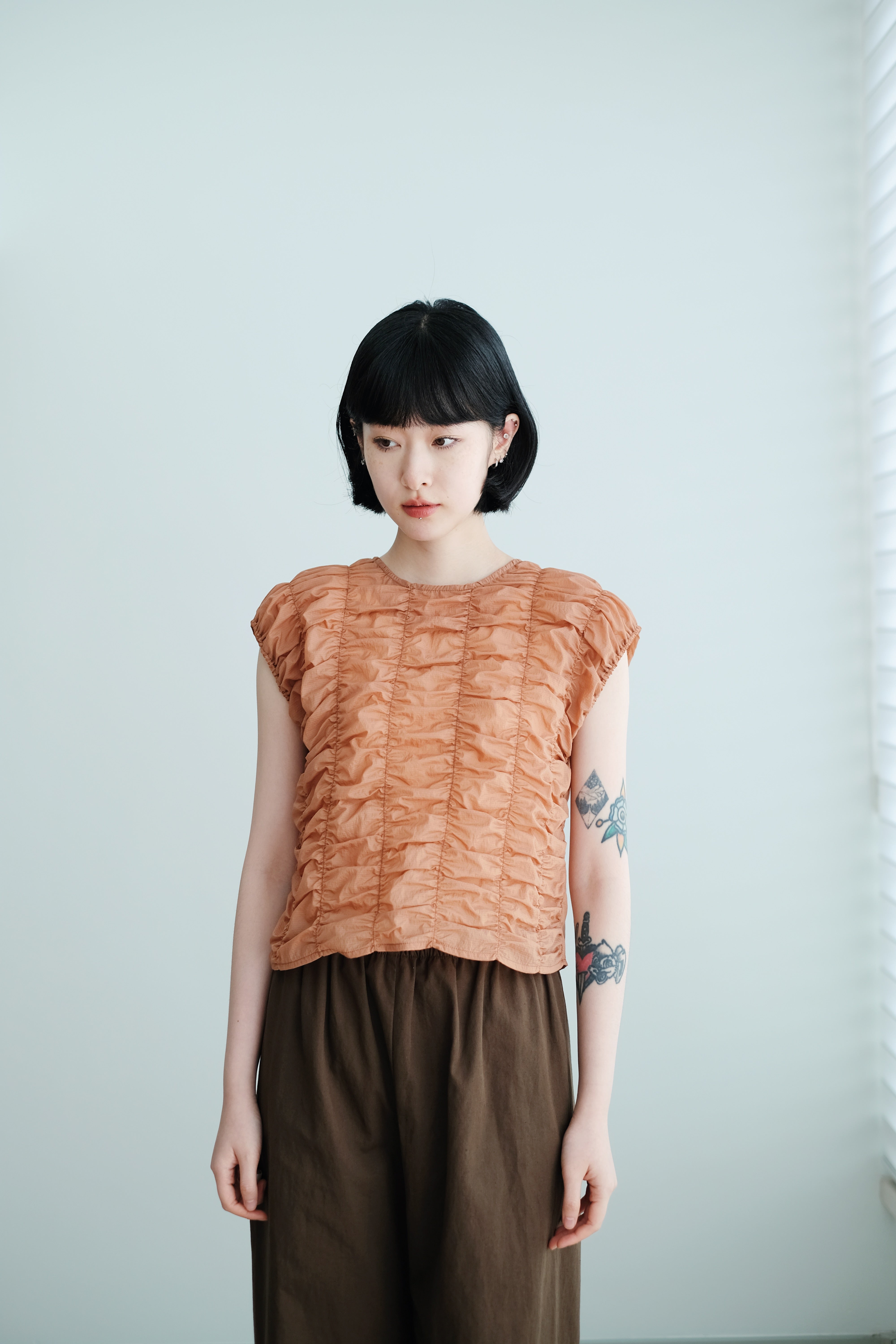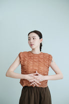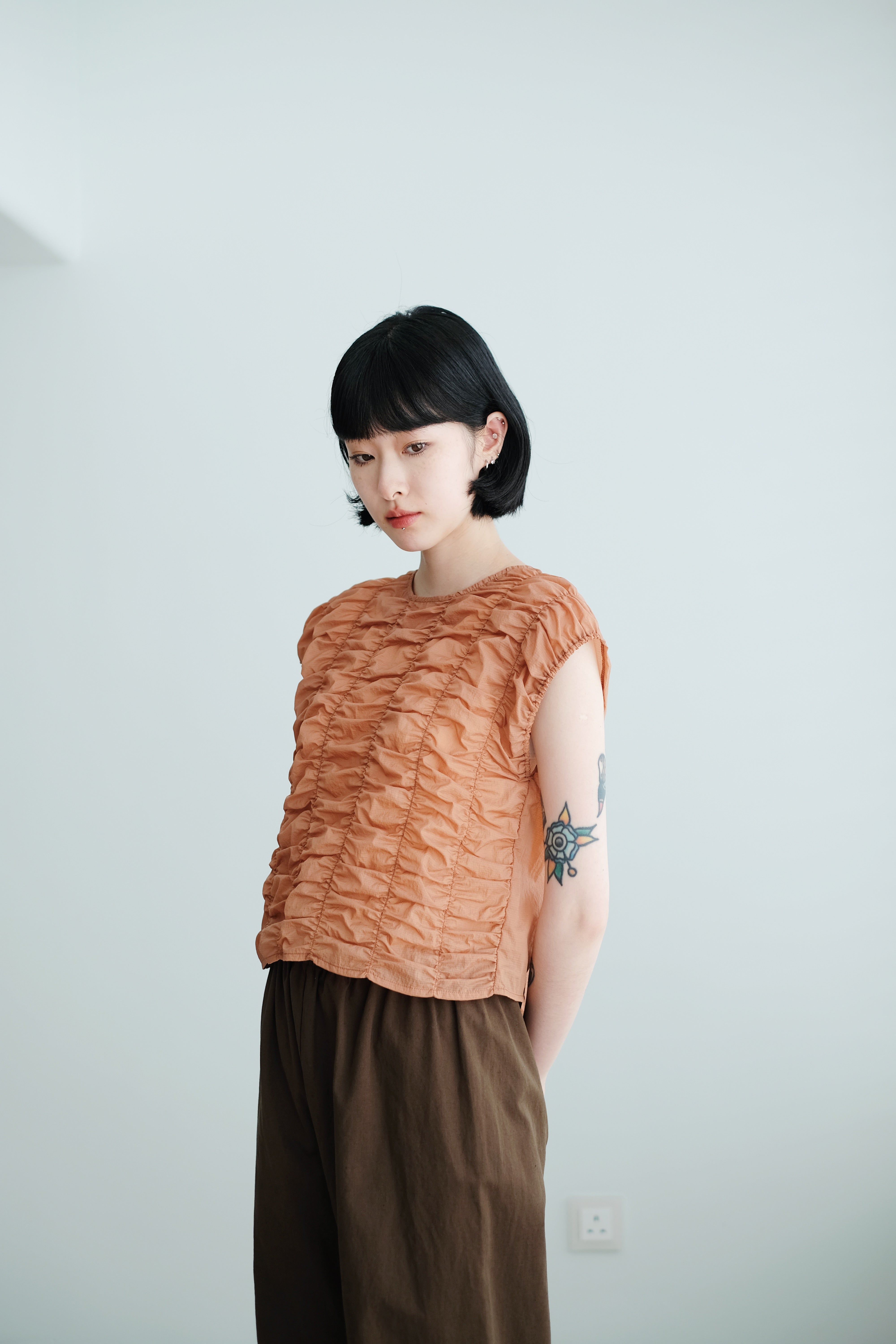 This bow-tie vest is a detail-oriented piece with a thoughtfully crafted design. The front features delicate ruching that creates rich texture and volume, while the back is highlighted by a wide, statement bow that adds both softness and structure. The shoulders are slightly extended with angled seams, naturally enhancing the arms’ silhouette. Made from a lightweight and smooth fabric, the vest comes in a deep tone between cocoa and coffee—subtle yet full of character.