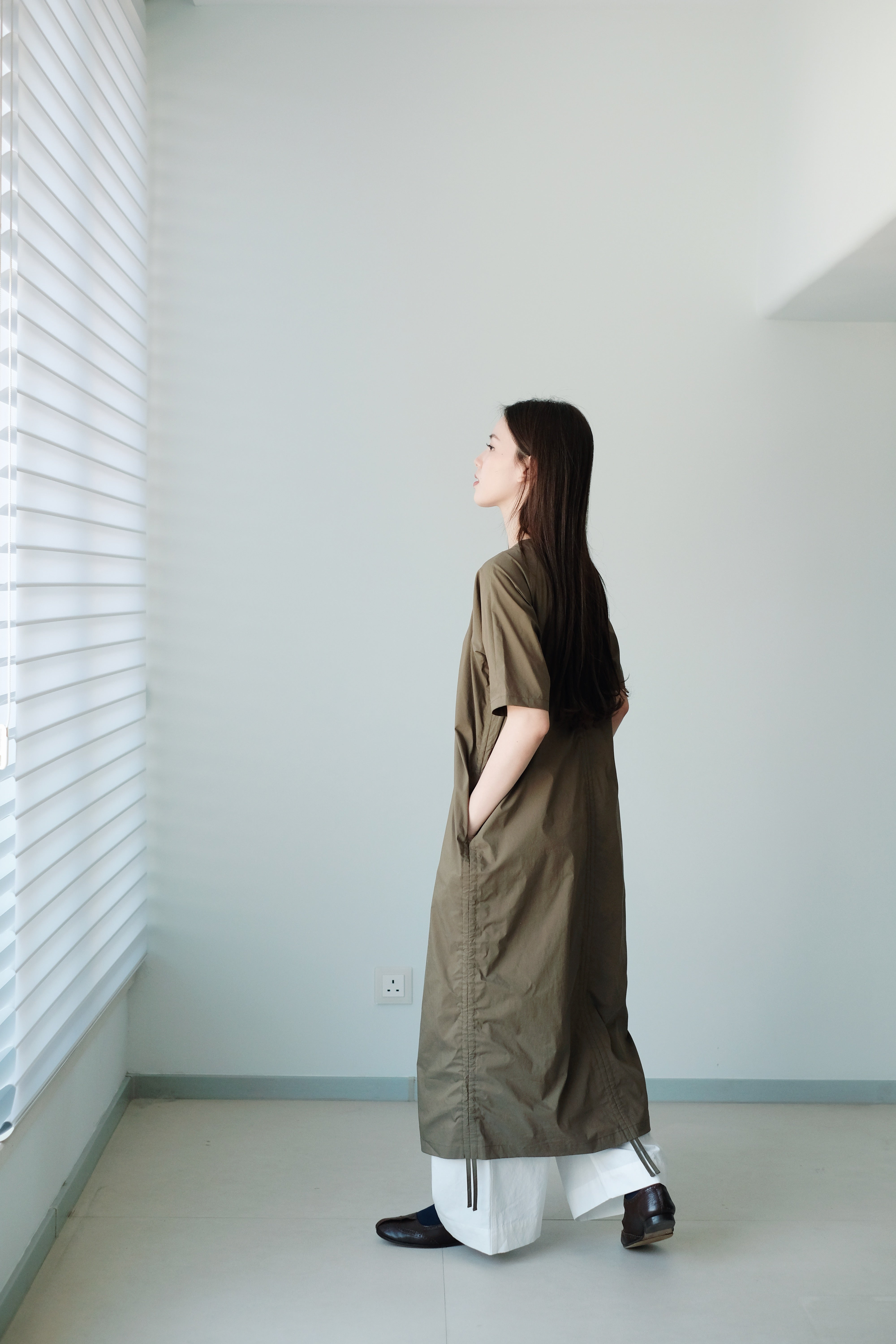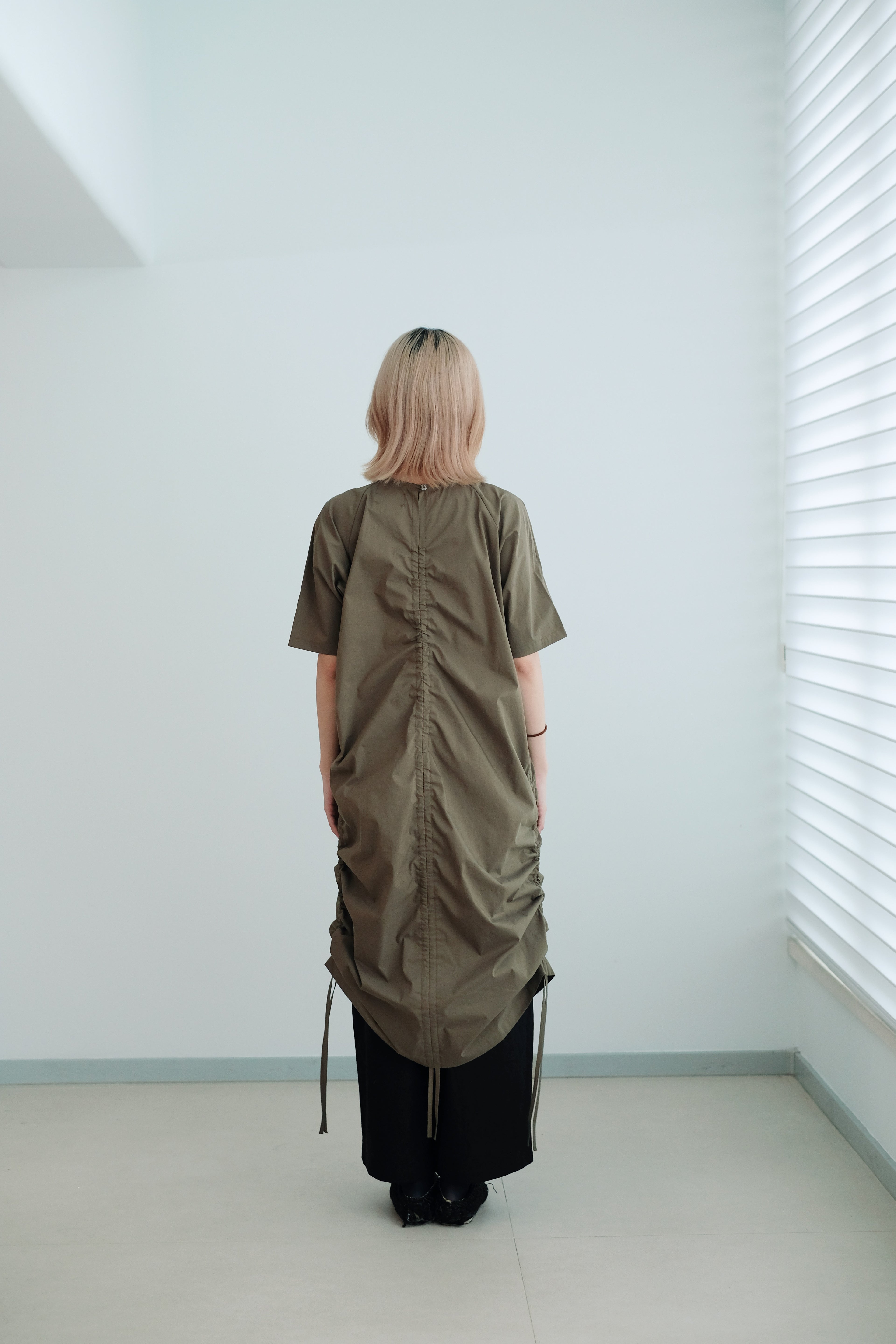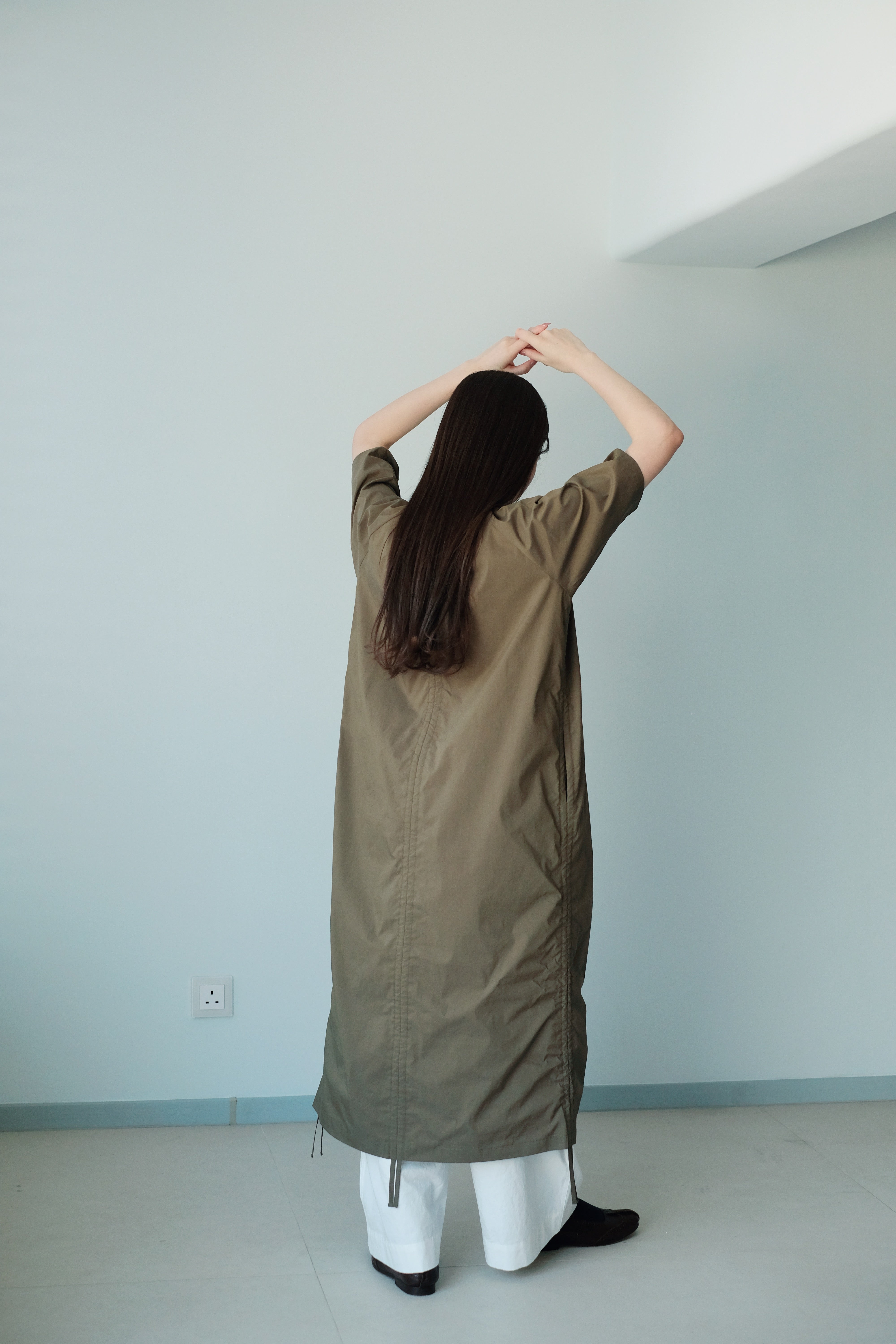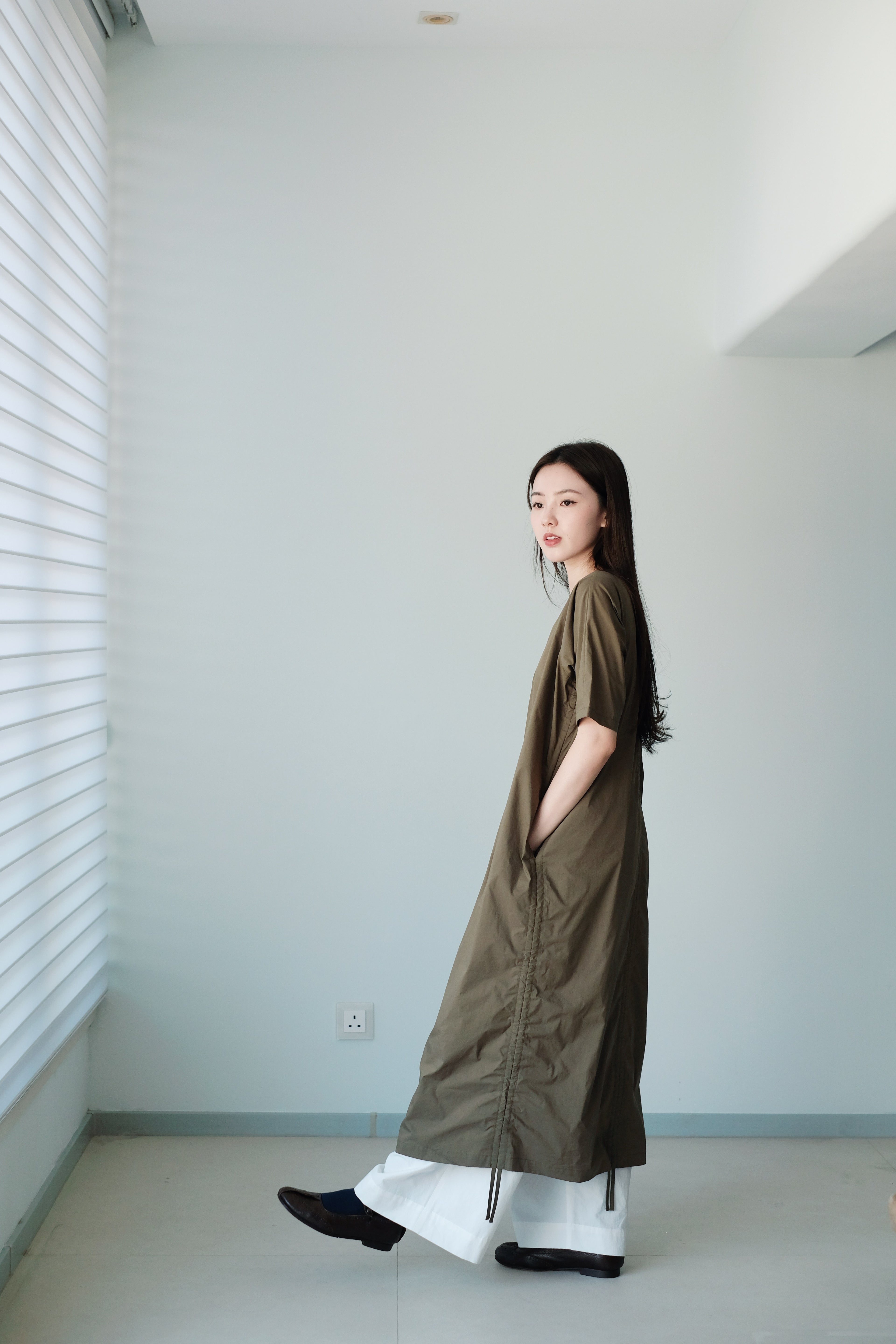 This army-green dress is designed with versatility in mind. Drawstrings are placed at the front, back, and sides, allowing you to adjust the length and silhouette freely. Worn loose, it becomes a straight long dress with clean lines; tightened, it transforms into a structured shape or even an oversized top, pairing effortlessly with trousers or skirts. Made from a crisp fabric with a subtle sheen, the deep military green shade conveys a grounded, androgynous charm—practical yet distinctive for everyday wear.