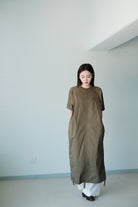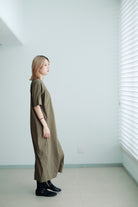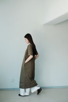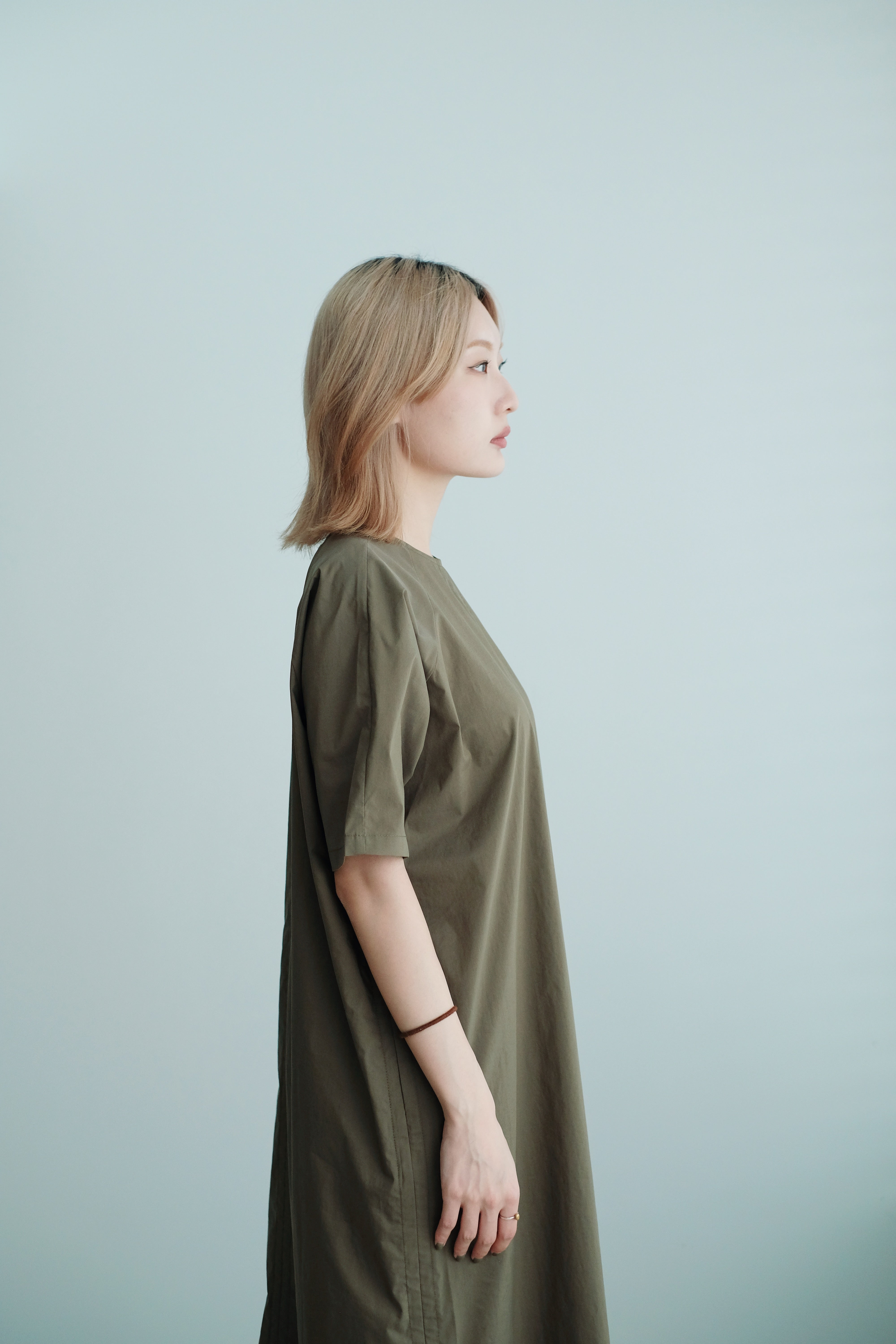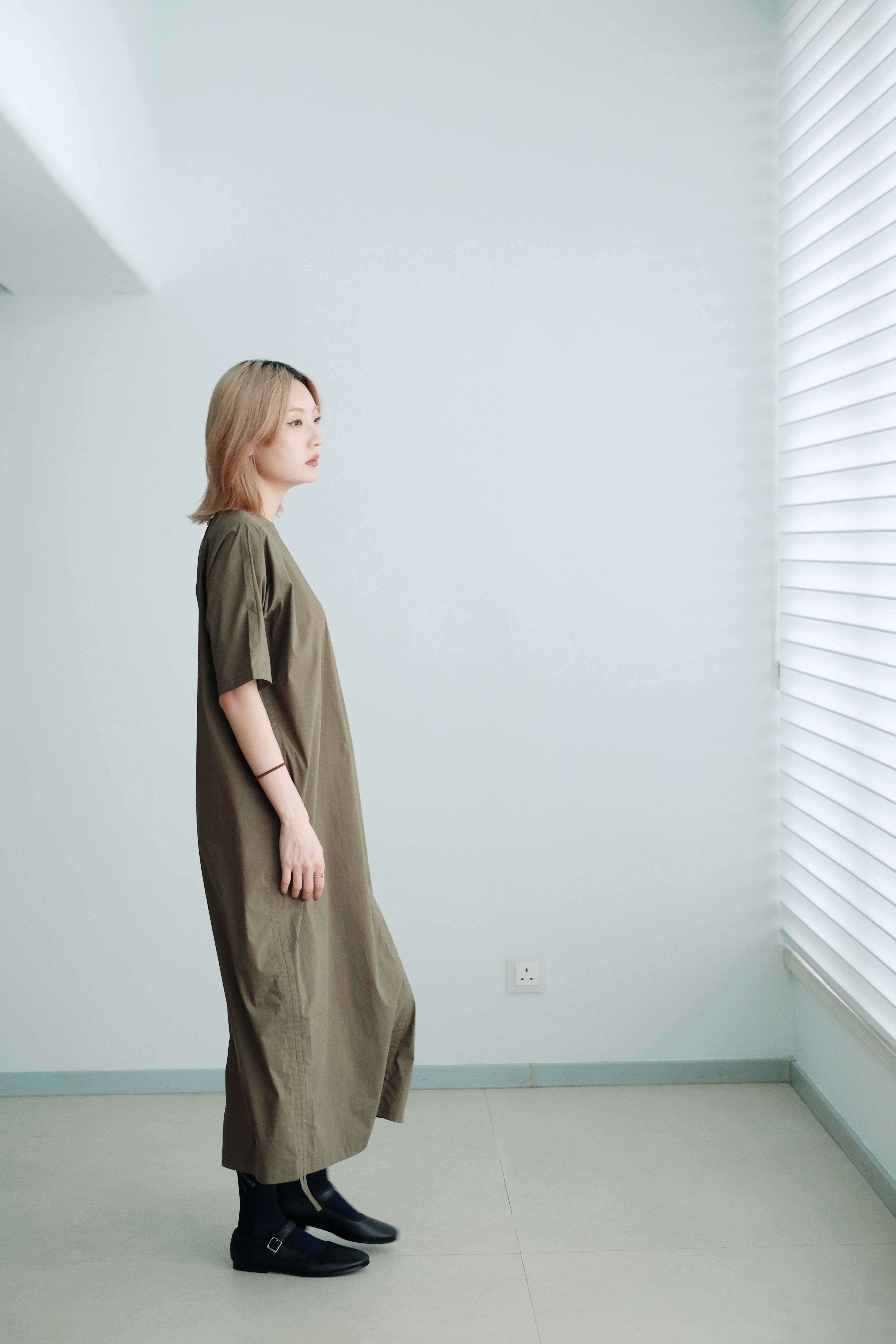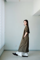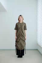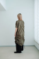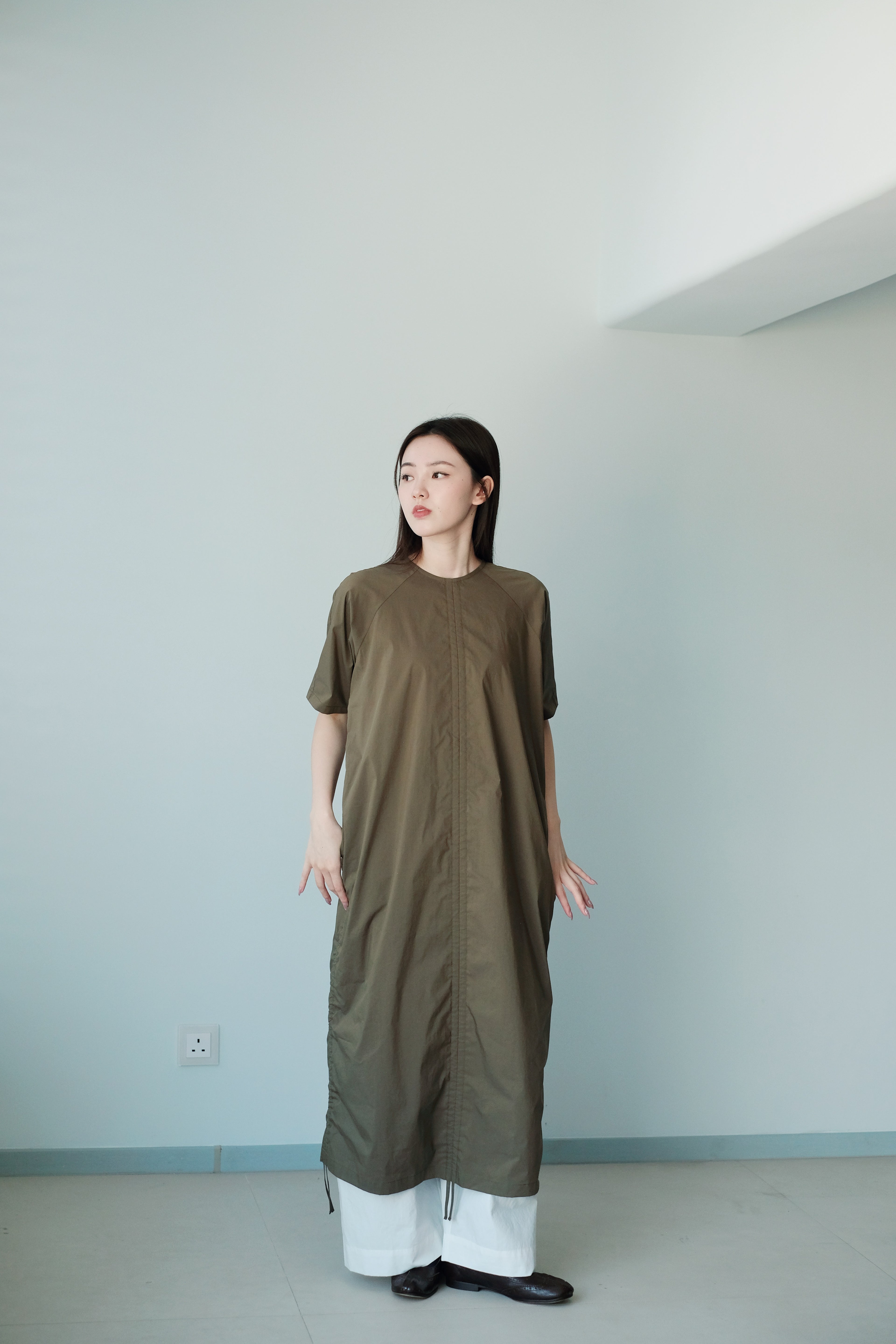 This army-green dress is designed with versatility in mind. Drawstrings are placed at the front, back, and sides, allowing you to adjust the length and silhouette freely. Worn loose, it becomes a straight long dress with clean lines; tightened, it transforms into a structured shape or even an oversized top, pairing effortlessly with trousers or skirts. Made from a crisp fabric with a subtle sheen, the deep military green shade conveys a grounded, androgynous charm—practical yet distinctive for everyday wear.