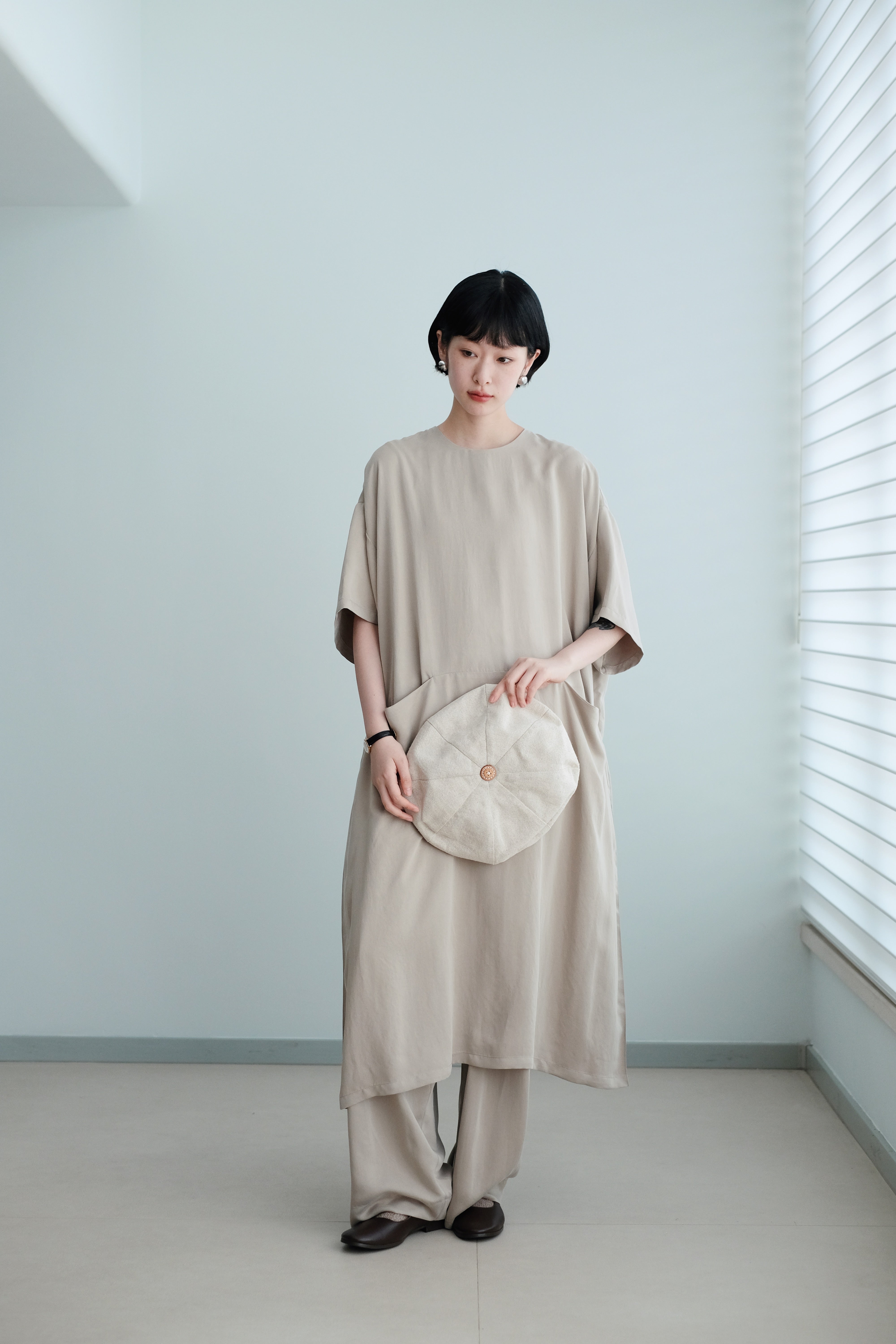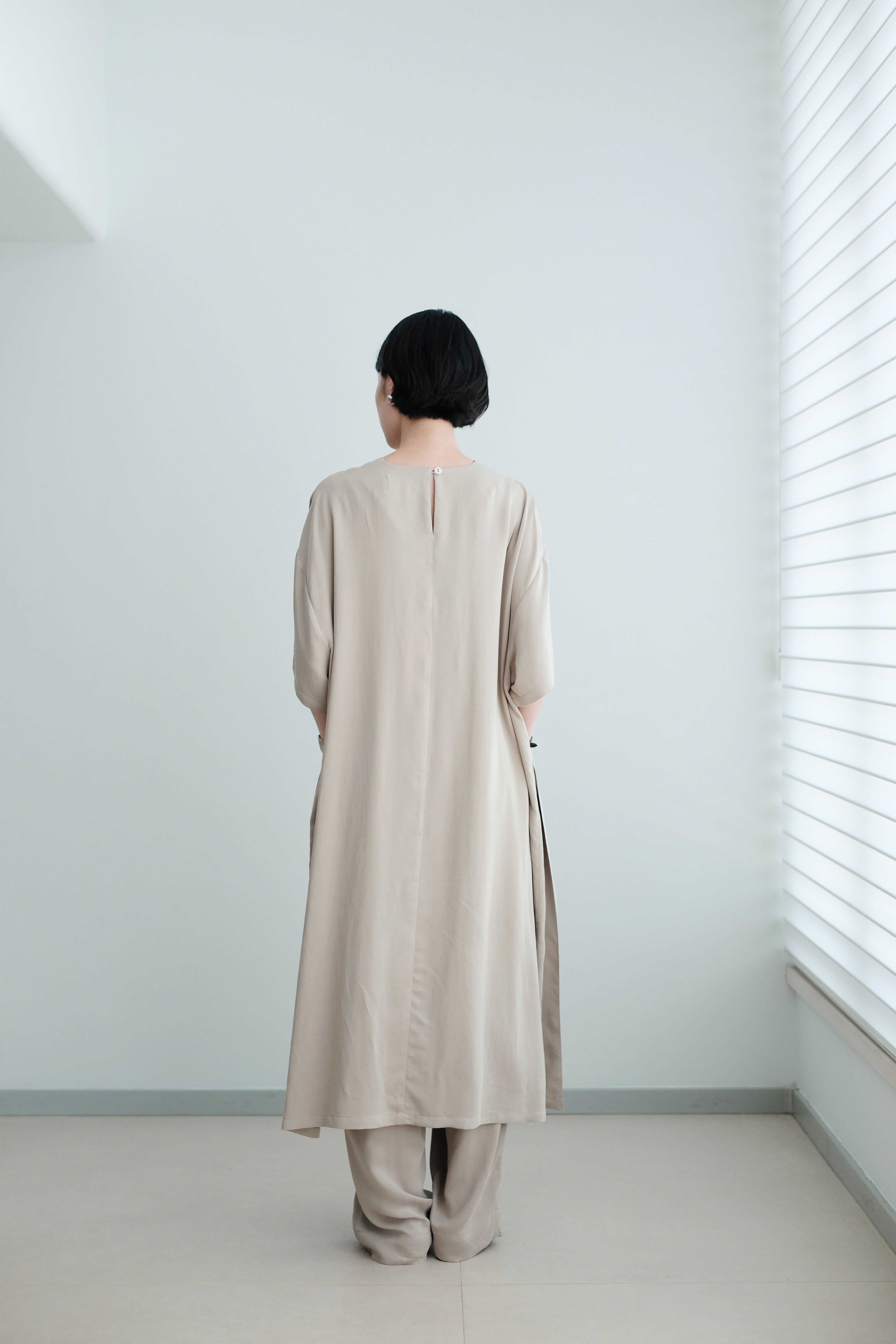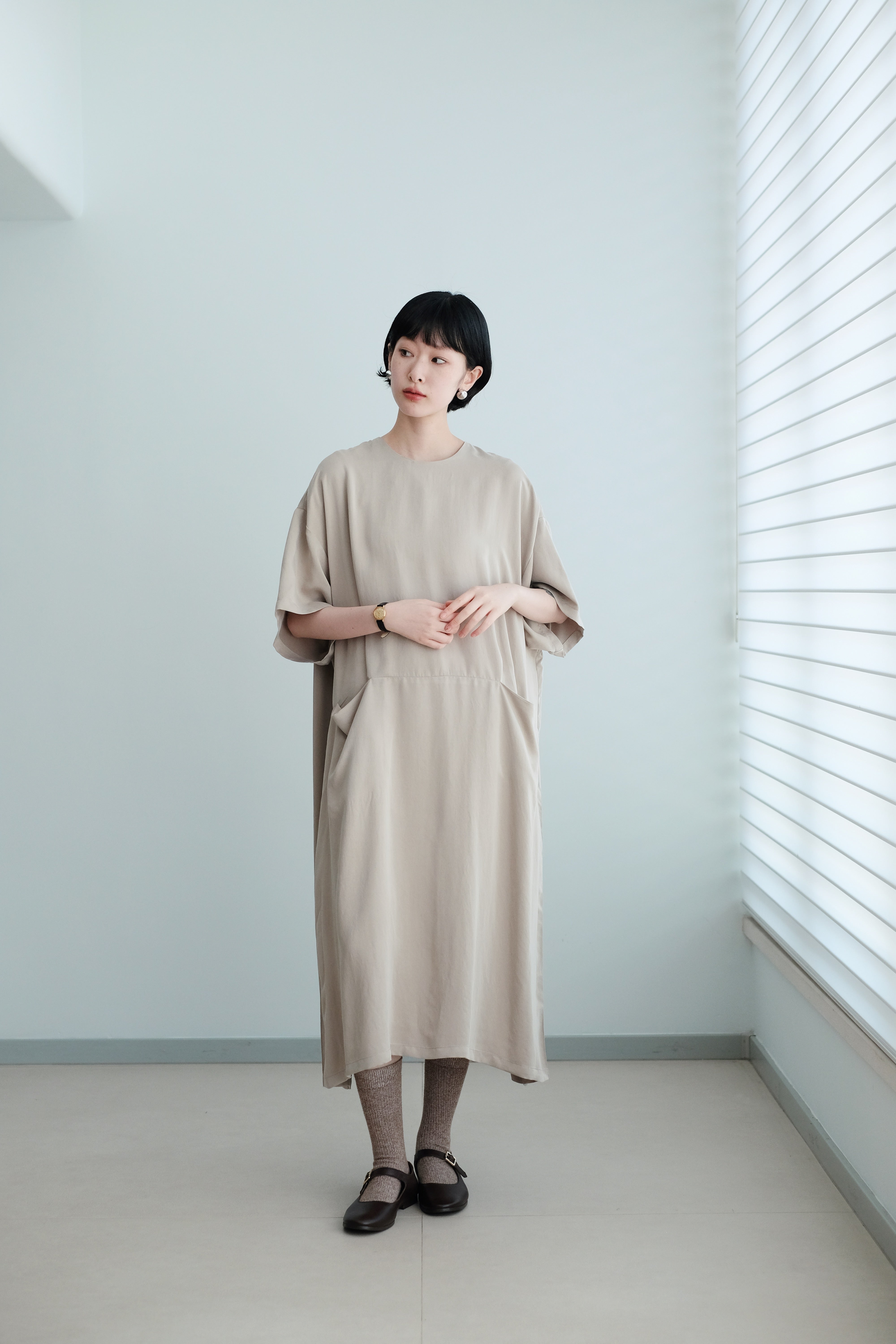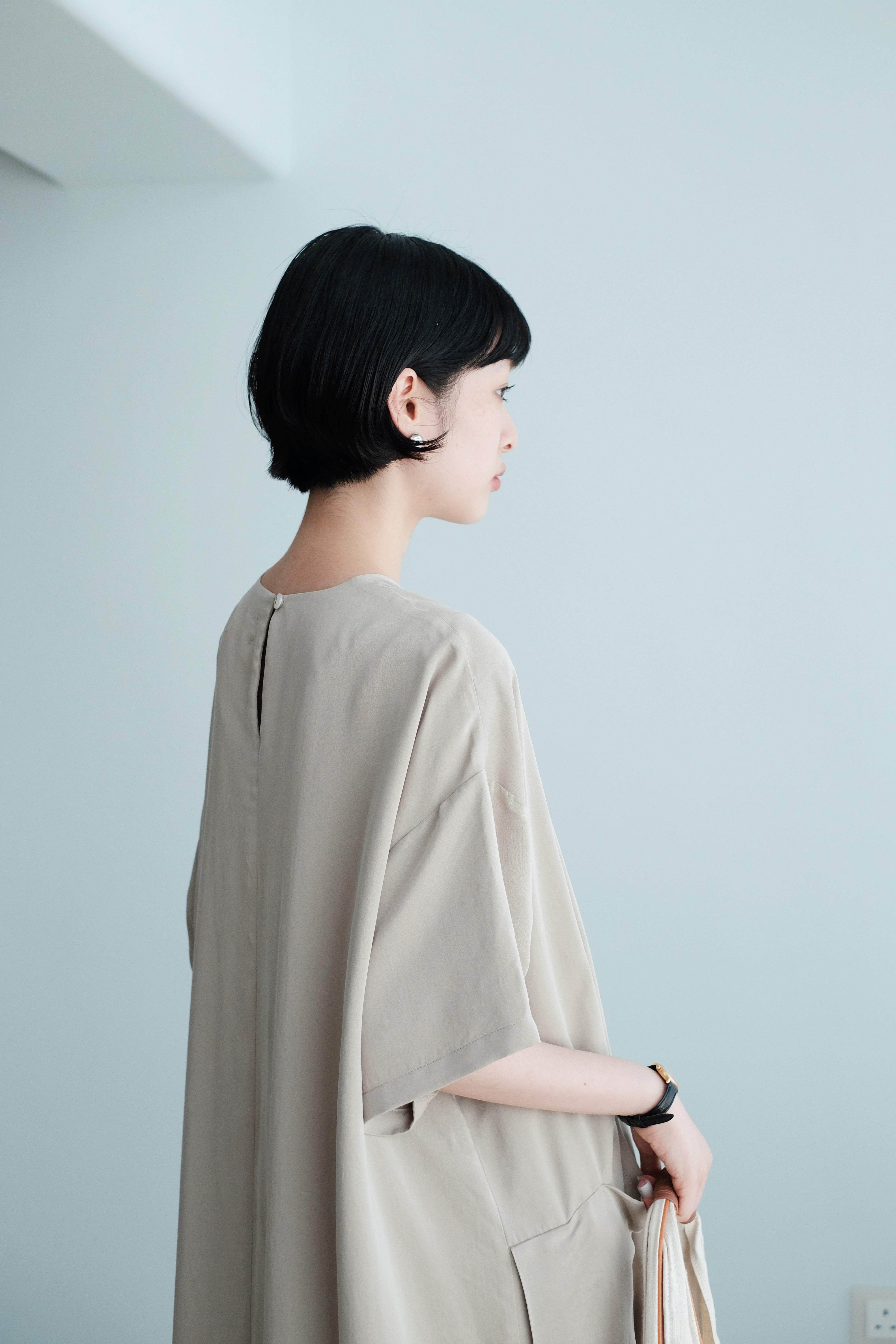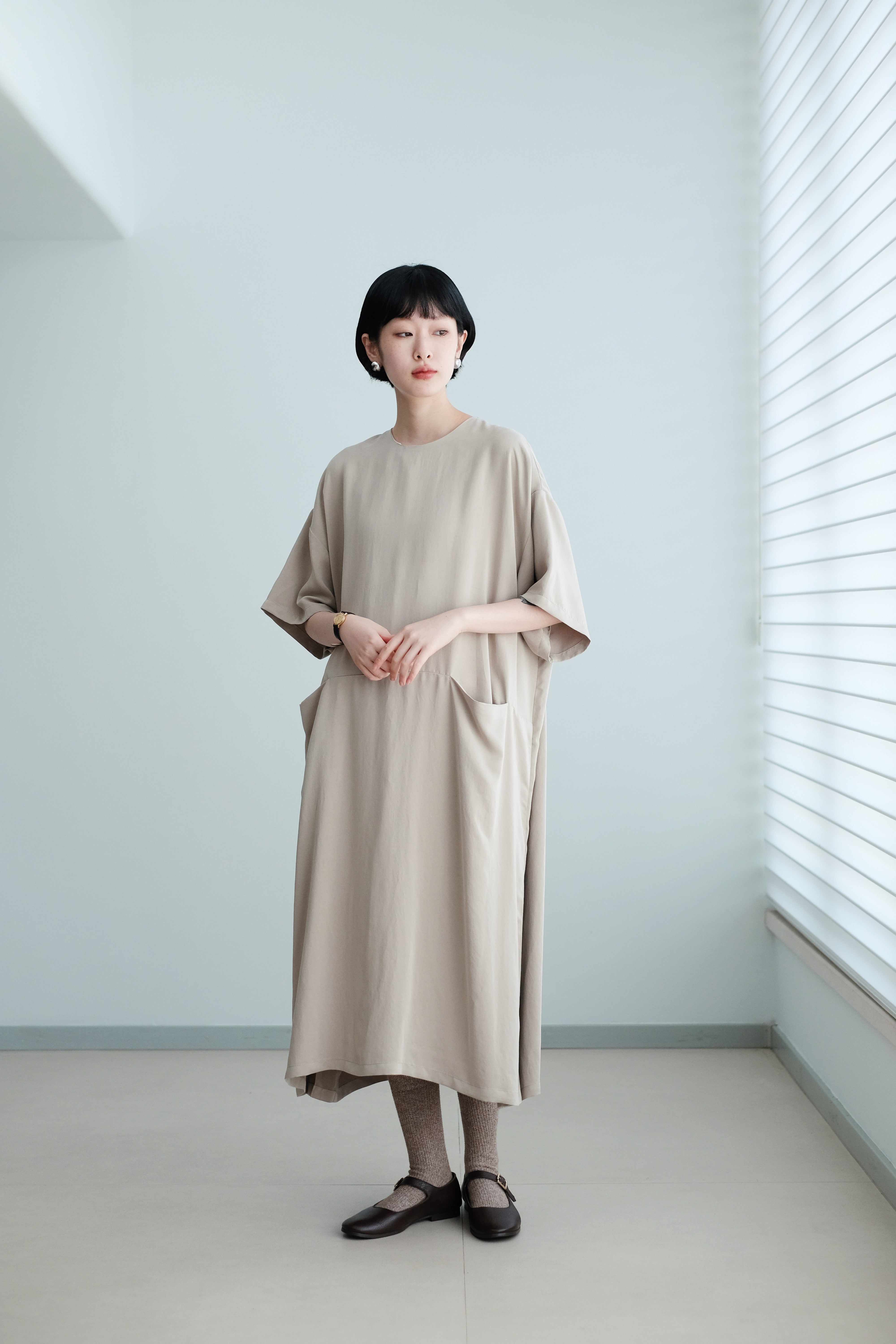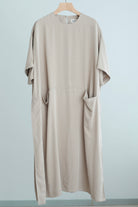 Crafted from a lightweight, fluid fabric with a natural drape. The dress features a relaxed straight silhouette, enhanced by structured side pockets that add subtle volume. A back button closure offers ease of wear. Presented in a soft beige tone, it conveys quiet elegance and understated charm.