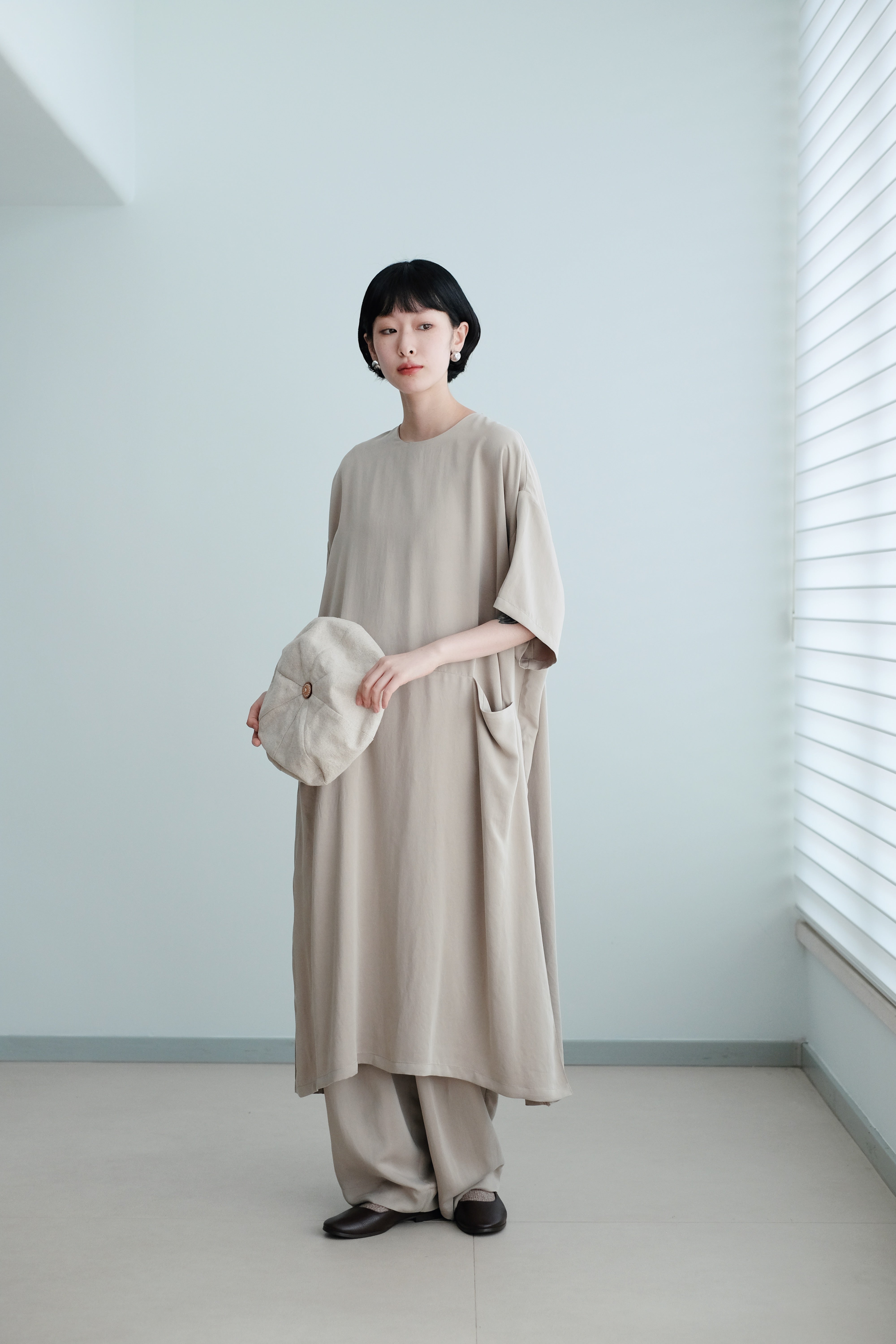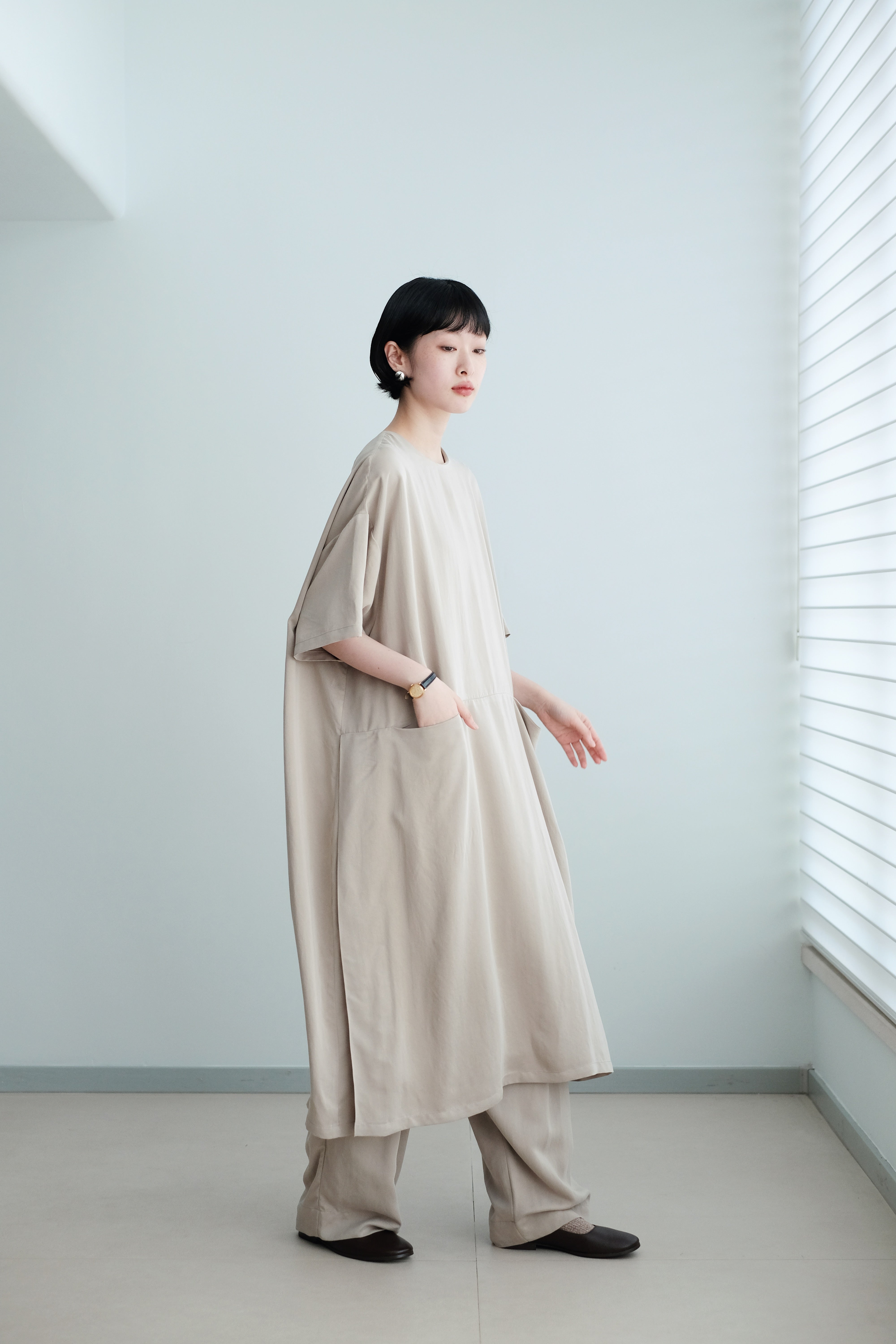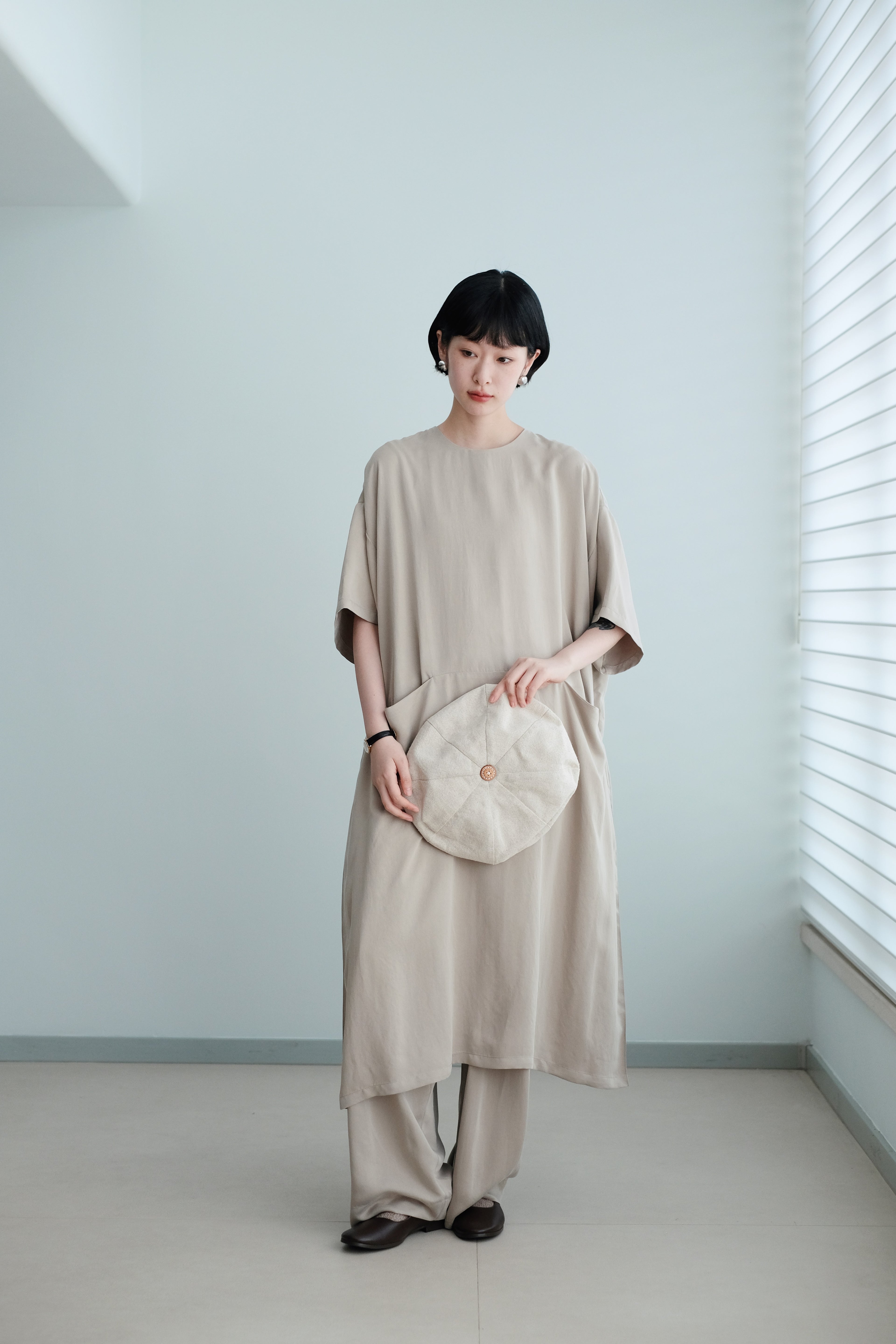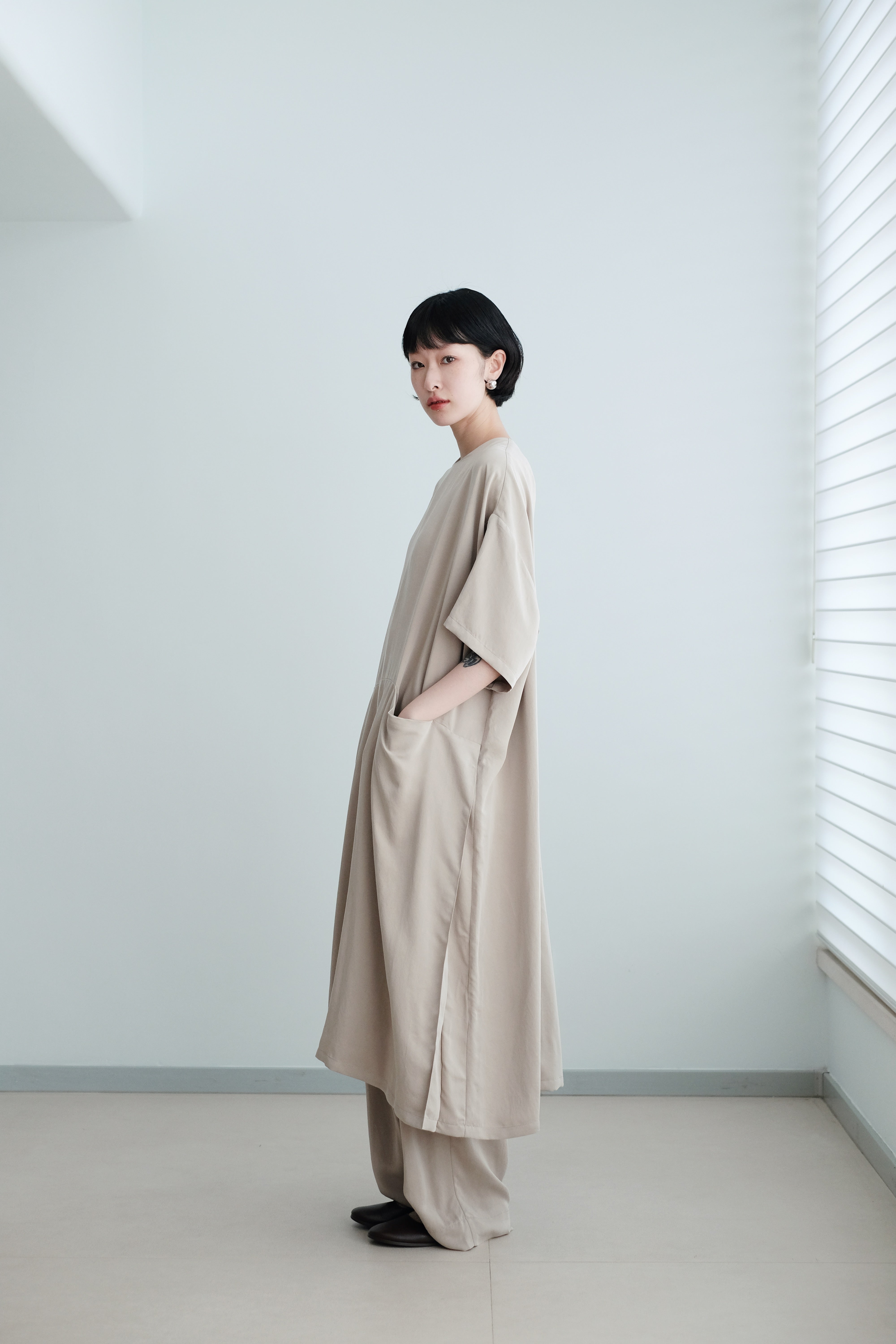 Crafted from a lightweight, fluid fabric with a natural drape. The dress features a relaxed straight silhouette, enhanced by structured side pockets that add subtle volume. A back button closure offers ease of wear. Presented in a soft beige tone, it conveys quiet elegance and understated charm.
