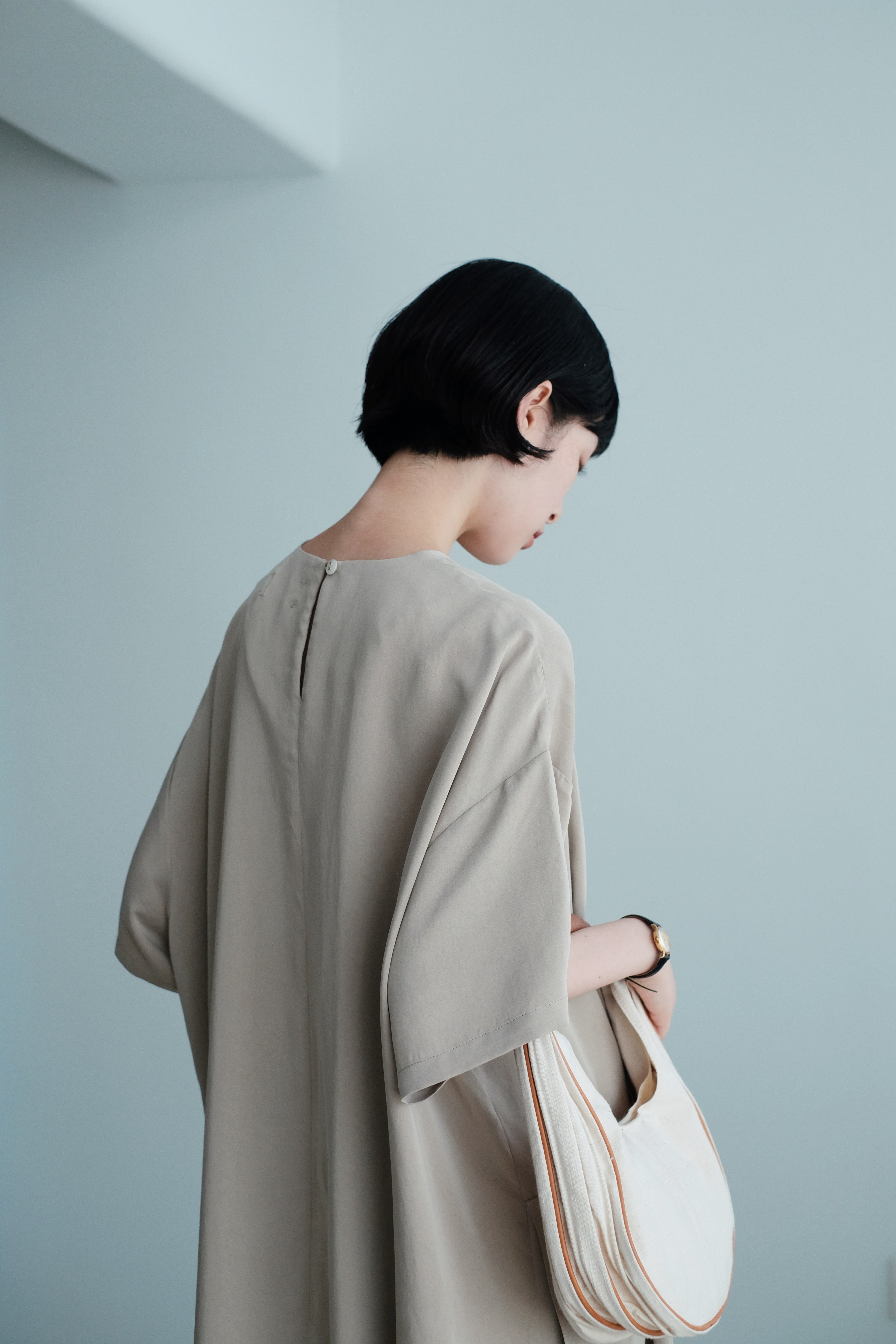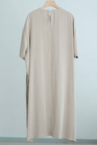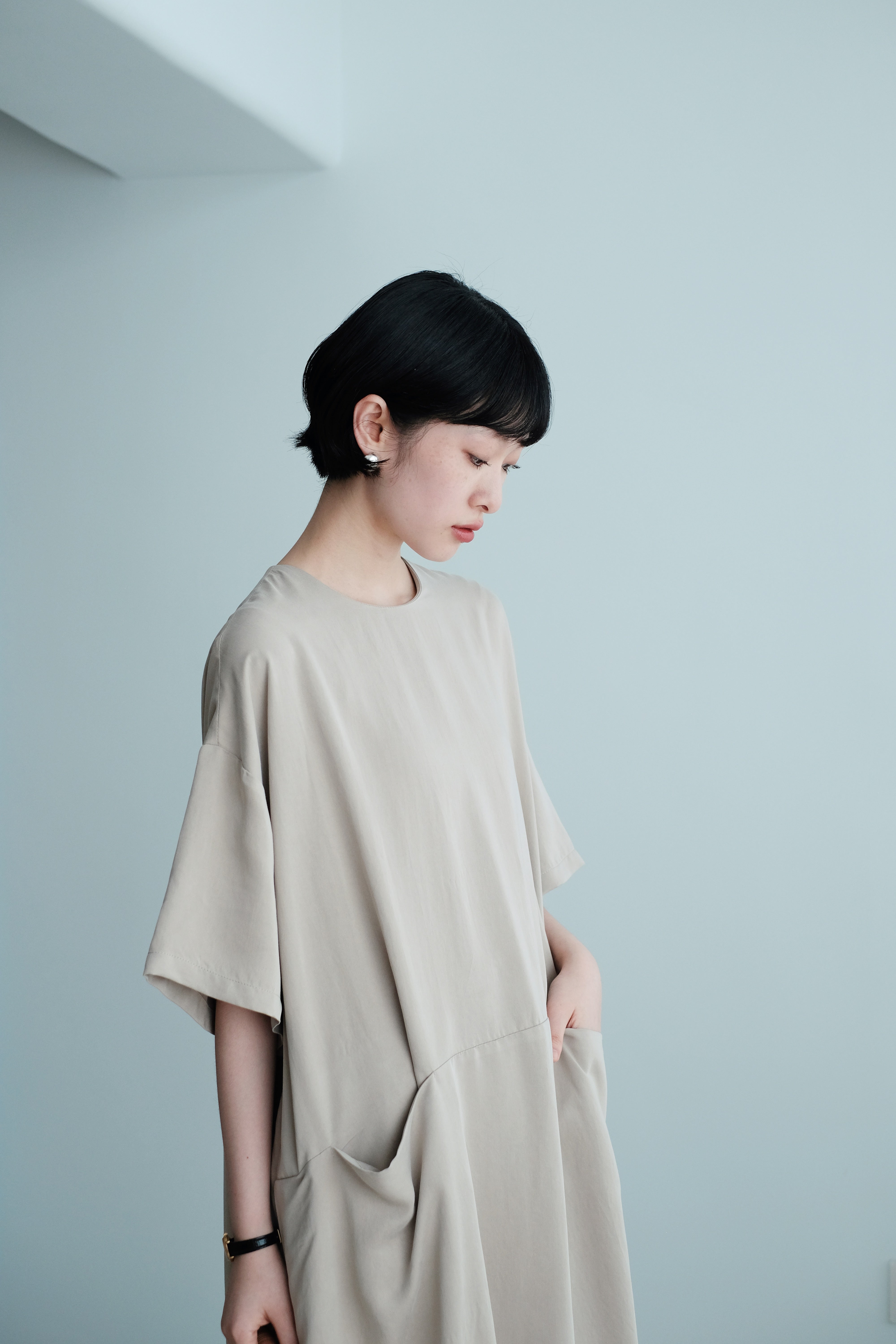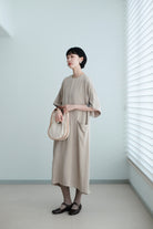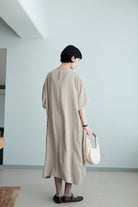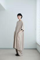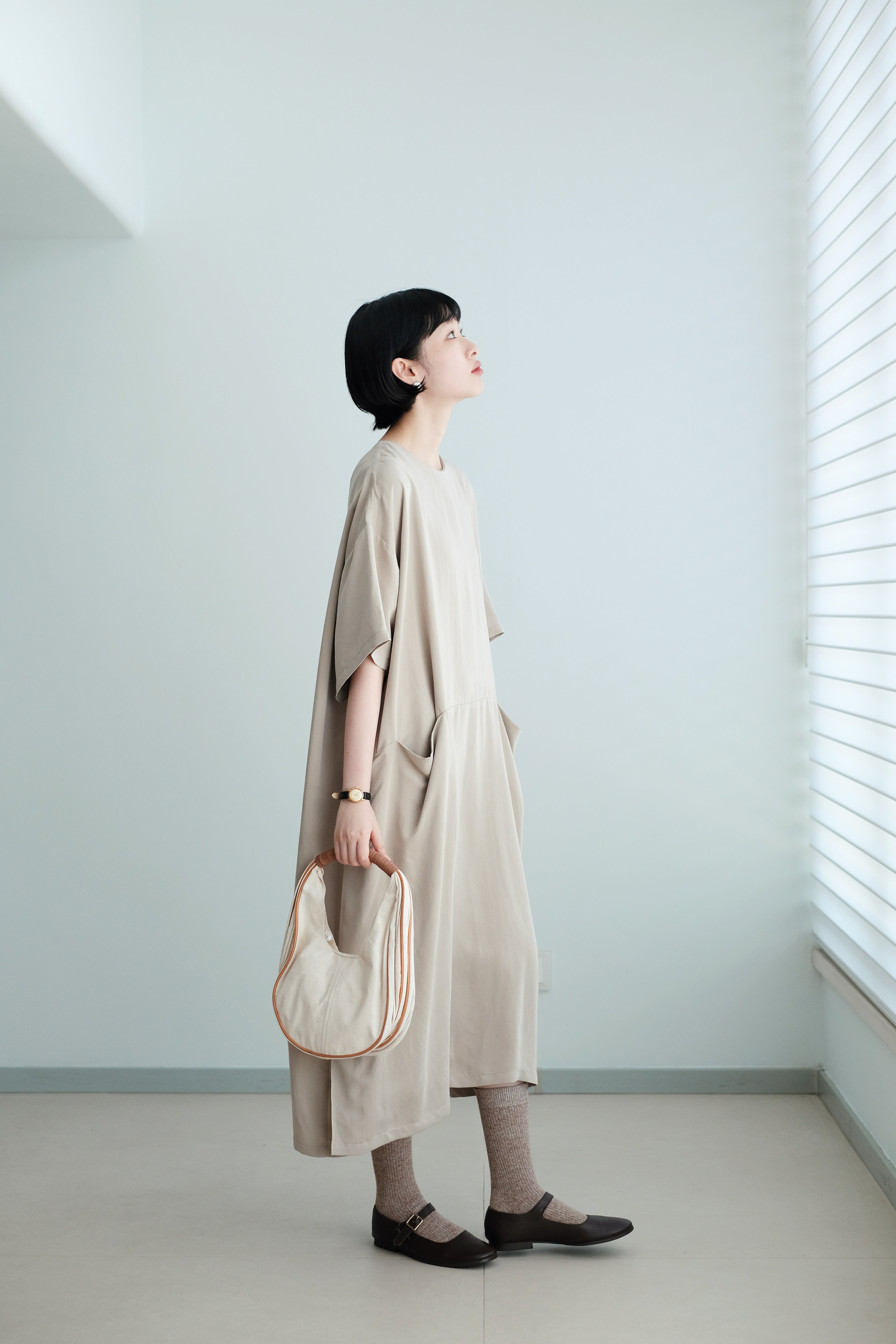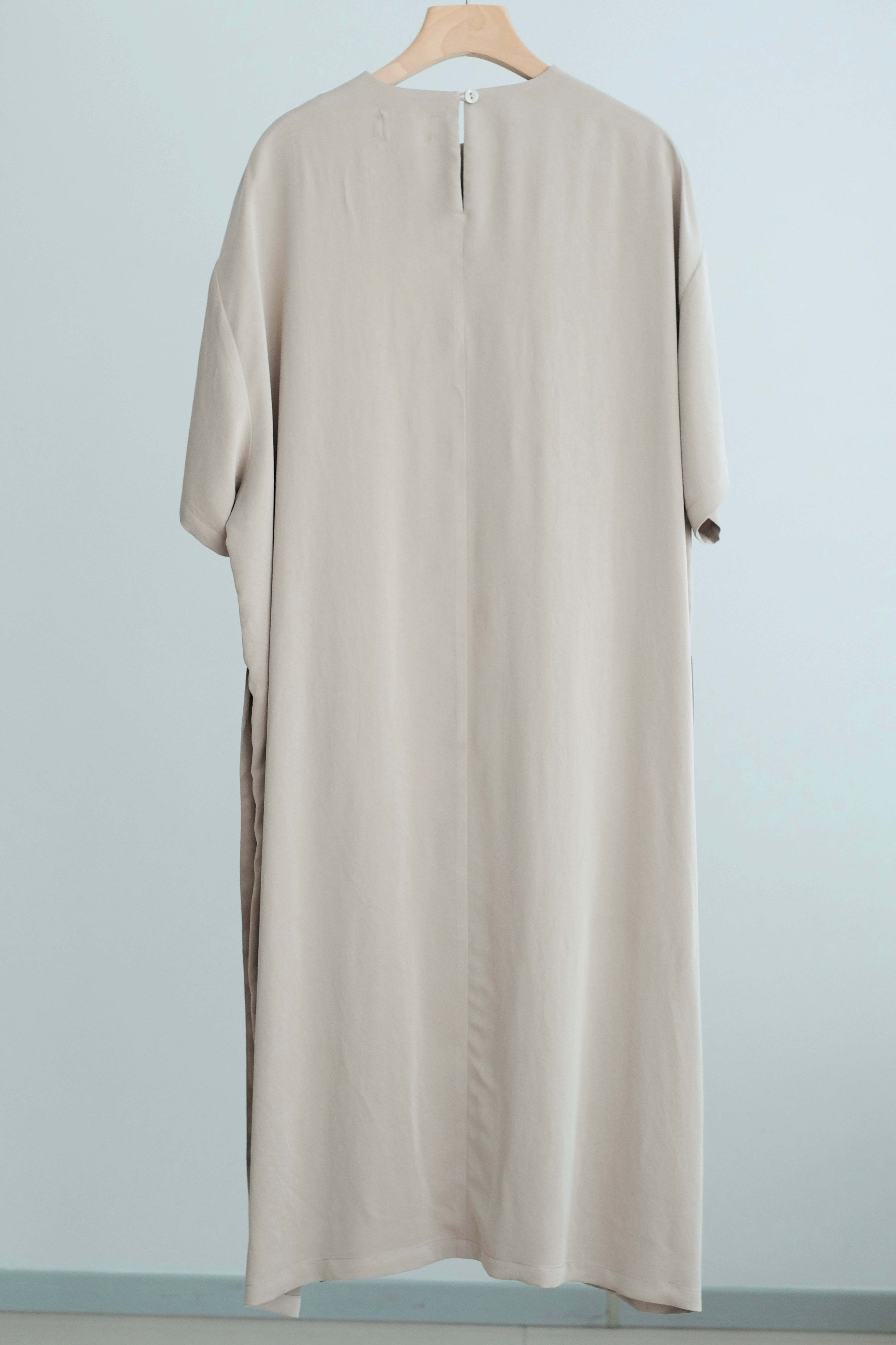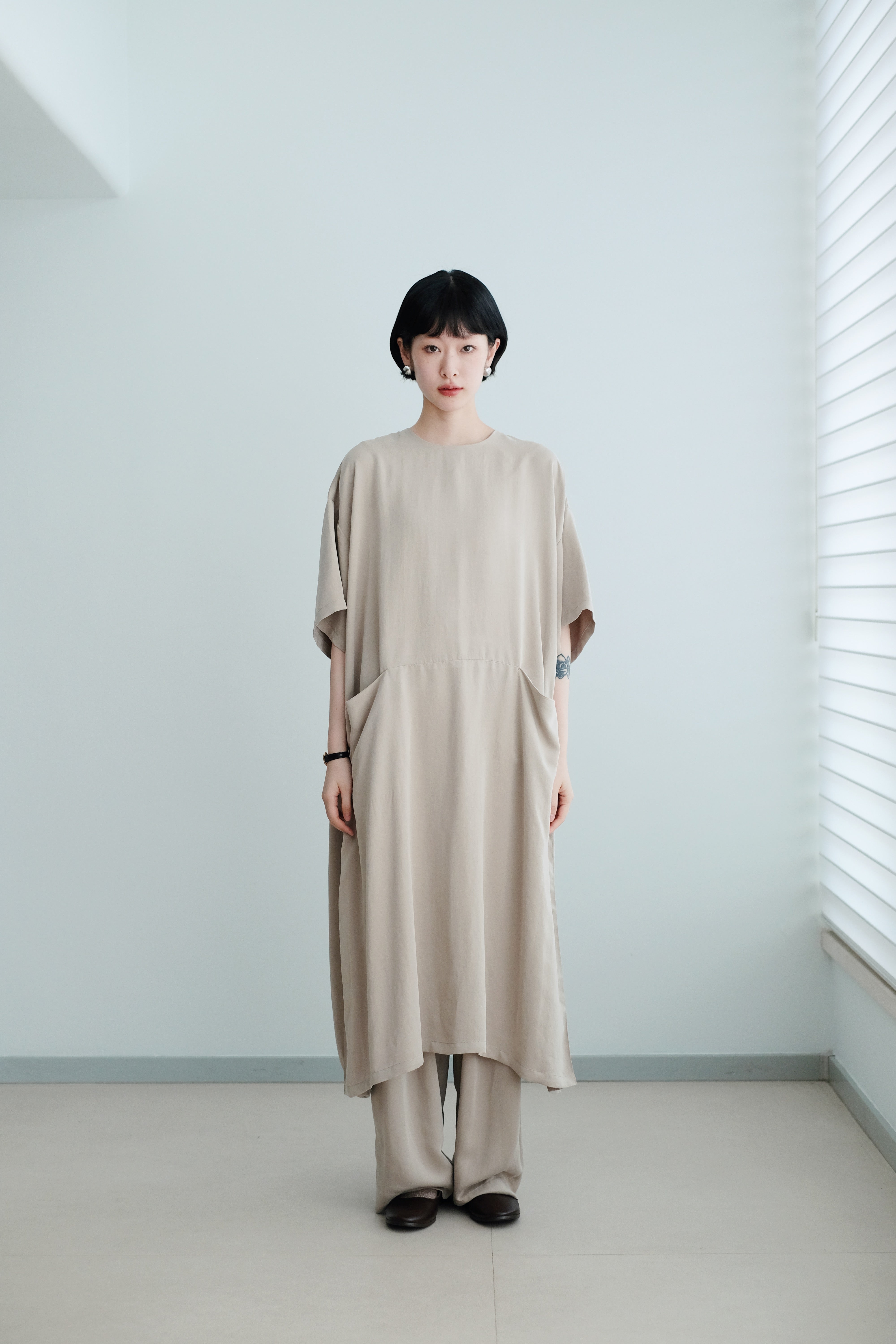 Crafted from a lightweight, fluid fabric with a natural drape. The dress features a relaxed straight silhouette, enhanced by structured side pockets that add subtle volume. A back button closure offers ease of wear. Presented in a soft beige tone, it conveys quiet elegance and understated charm.