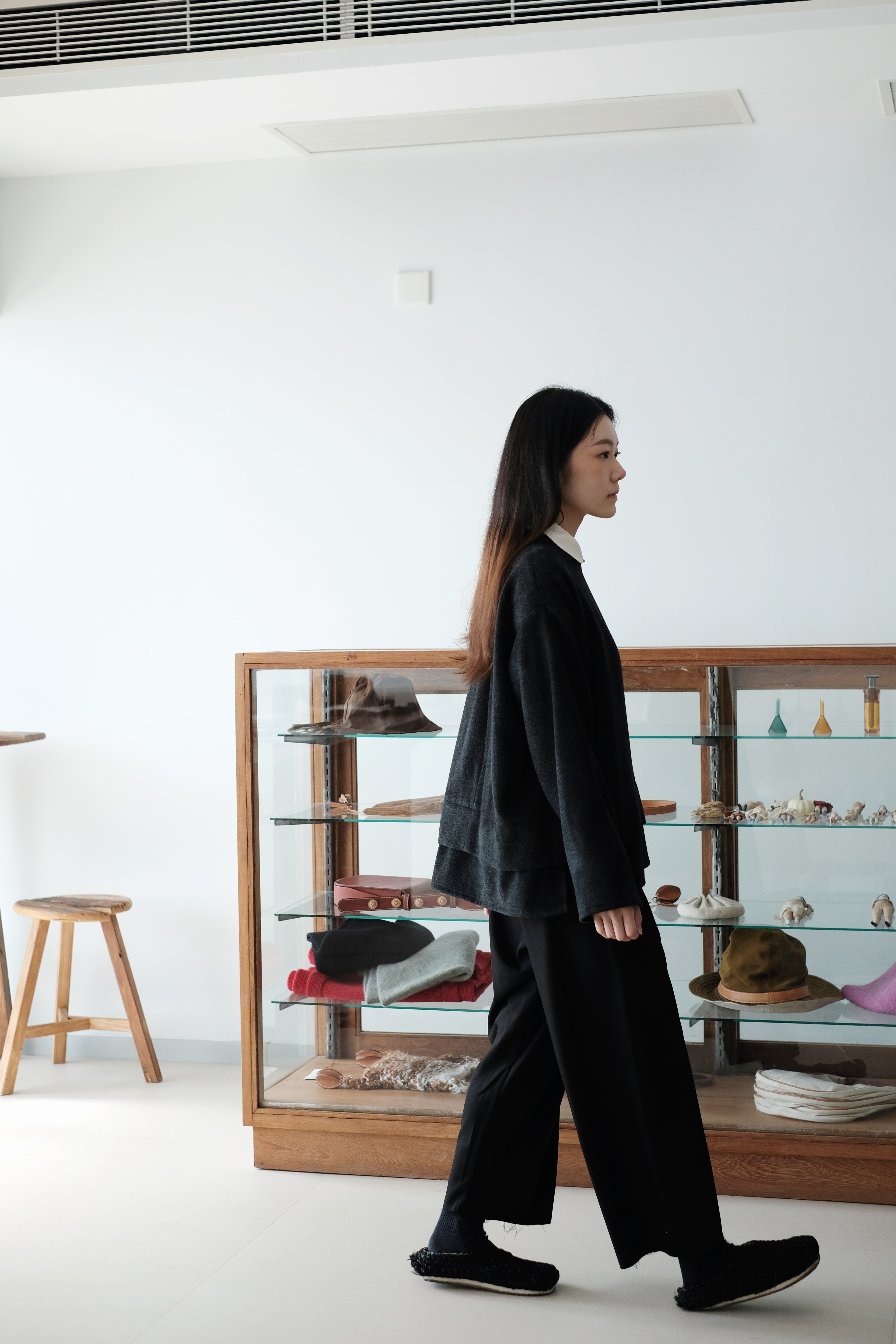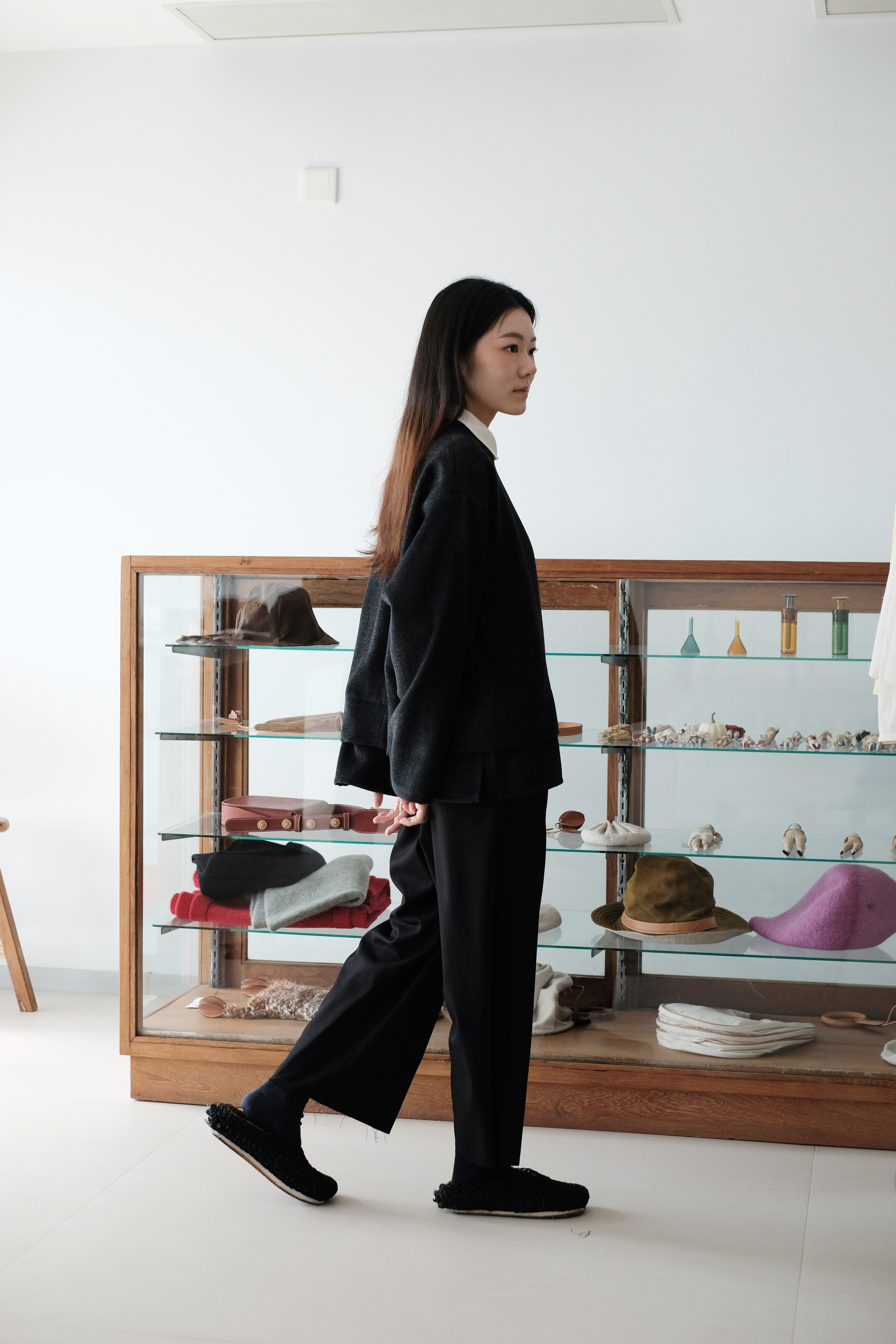 Made from soft viscose fabric, these trousers feature a fluid drape and a subtle sheen. The design is a straight cut with a slightly flared leg, finished with a raw-edge hem for a relaxed, effortless look. Without side seams, the silhouette falls naturally and moves smoothly with the body. The elastic waistband ensures comfort, making it perfect for pairing with knits or blouses for an easy yet refined autumn outfit.
