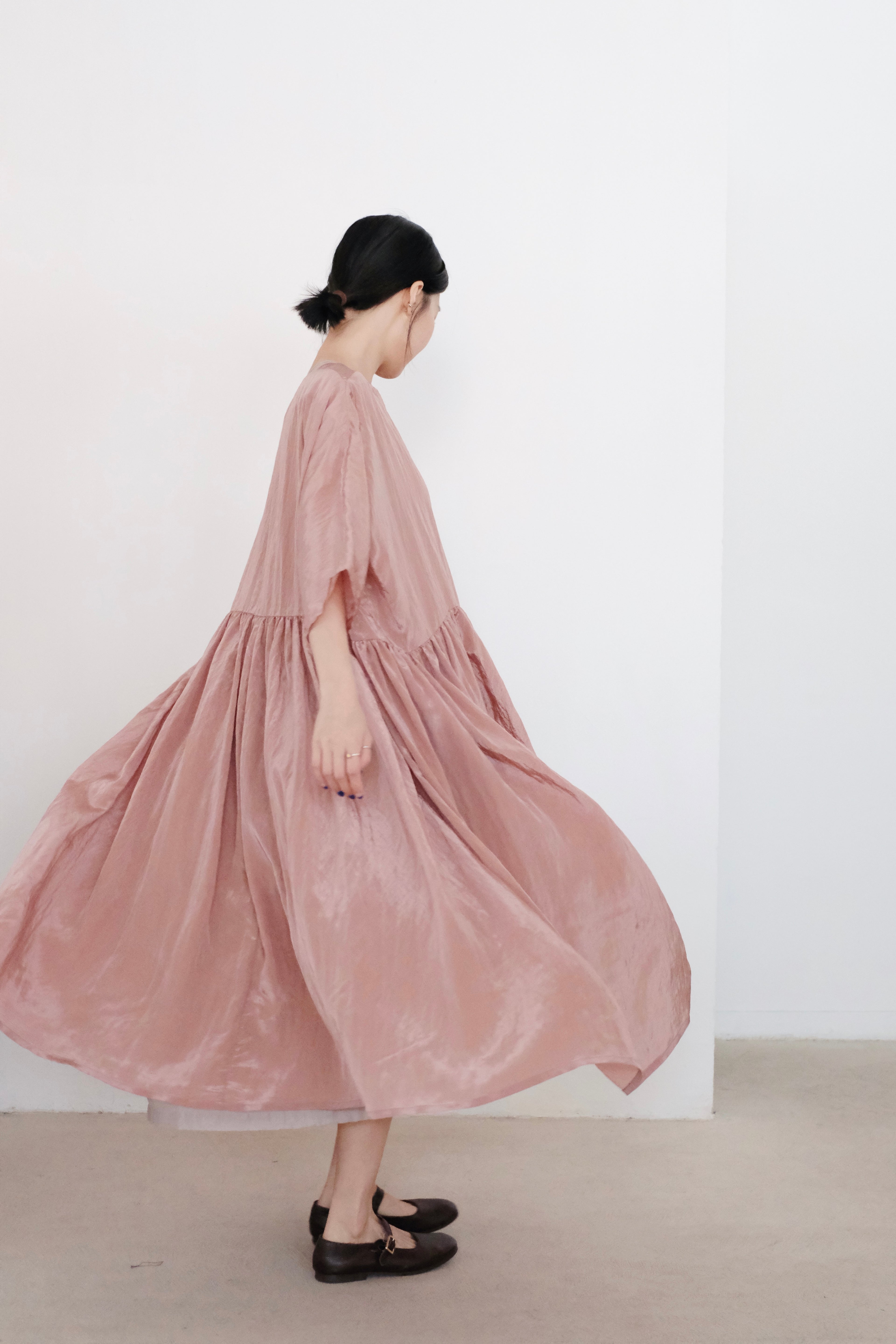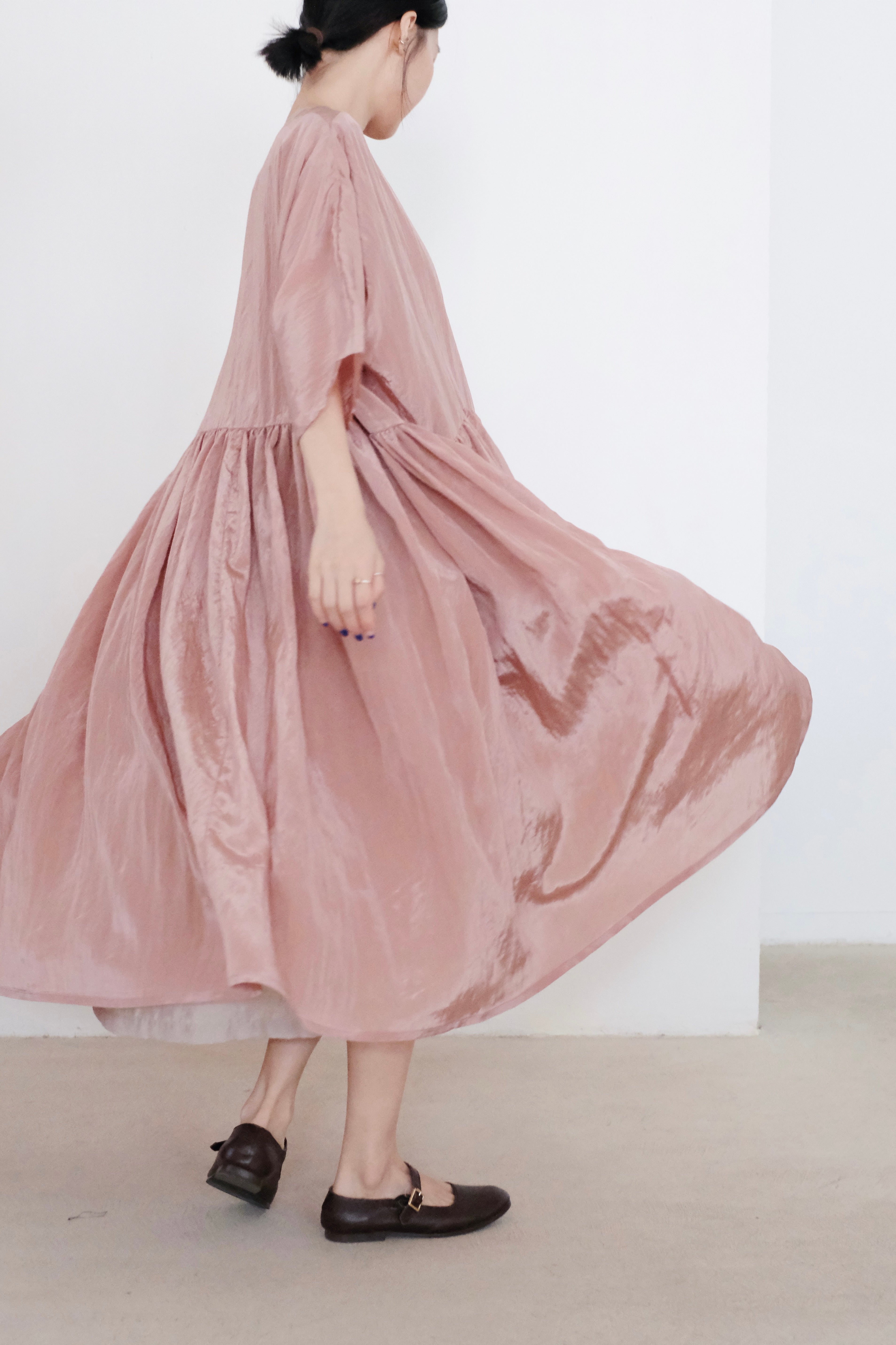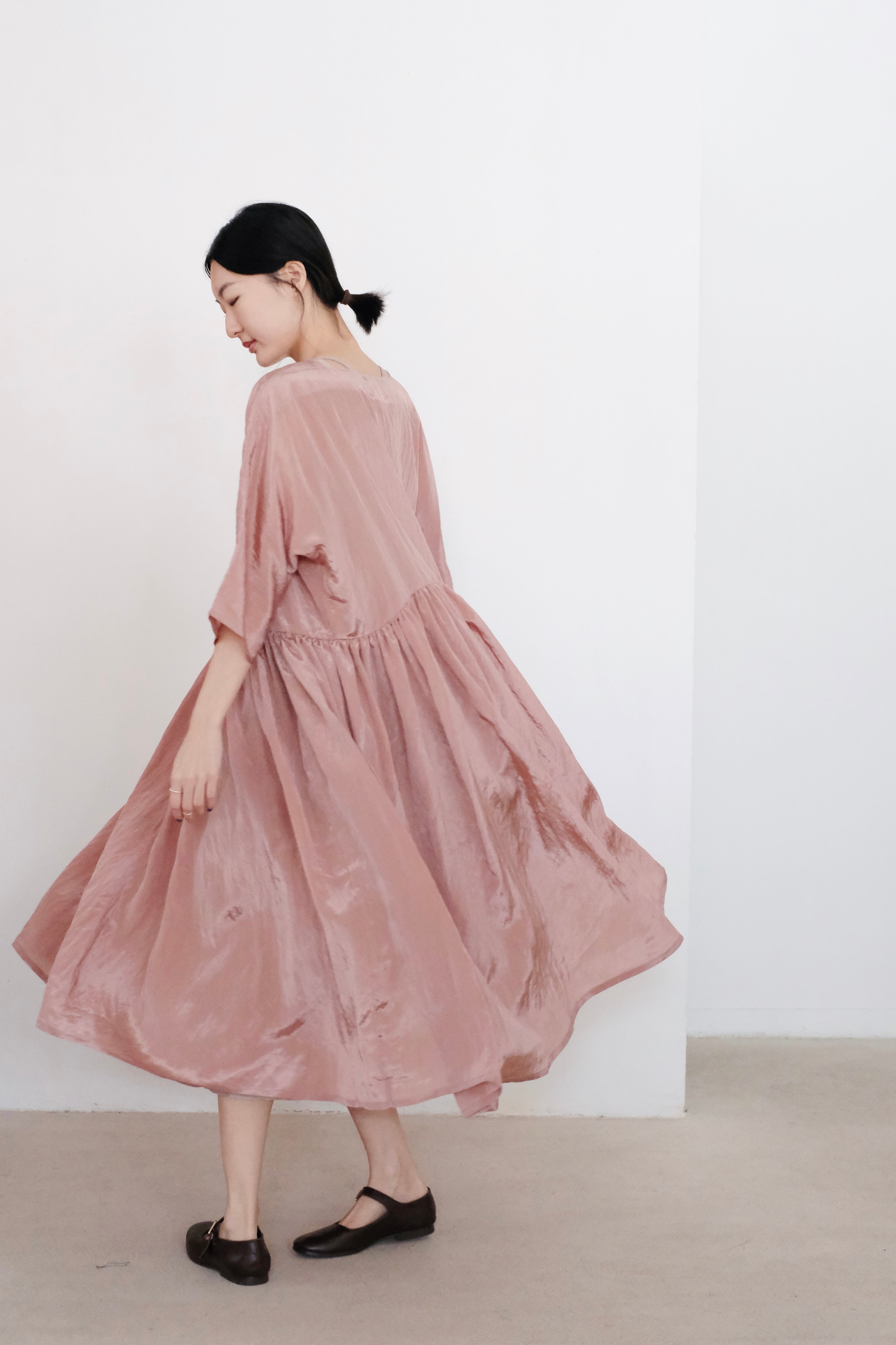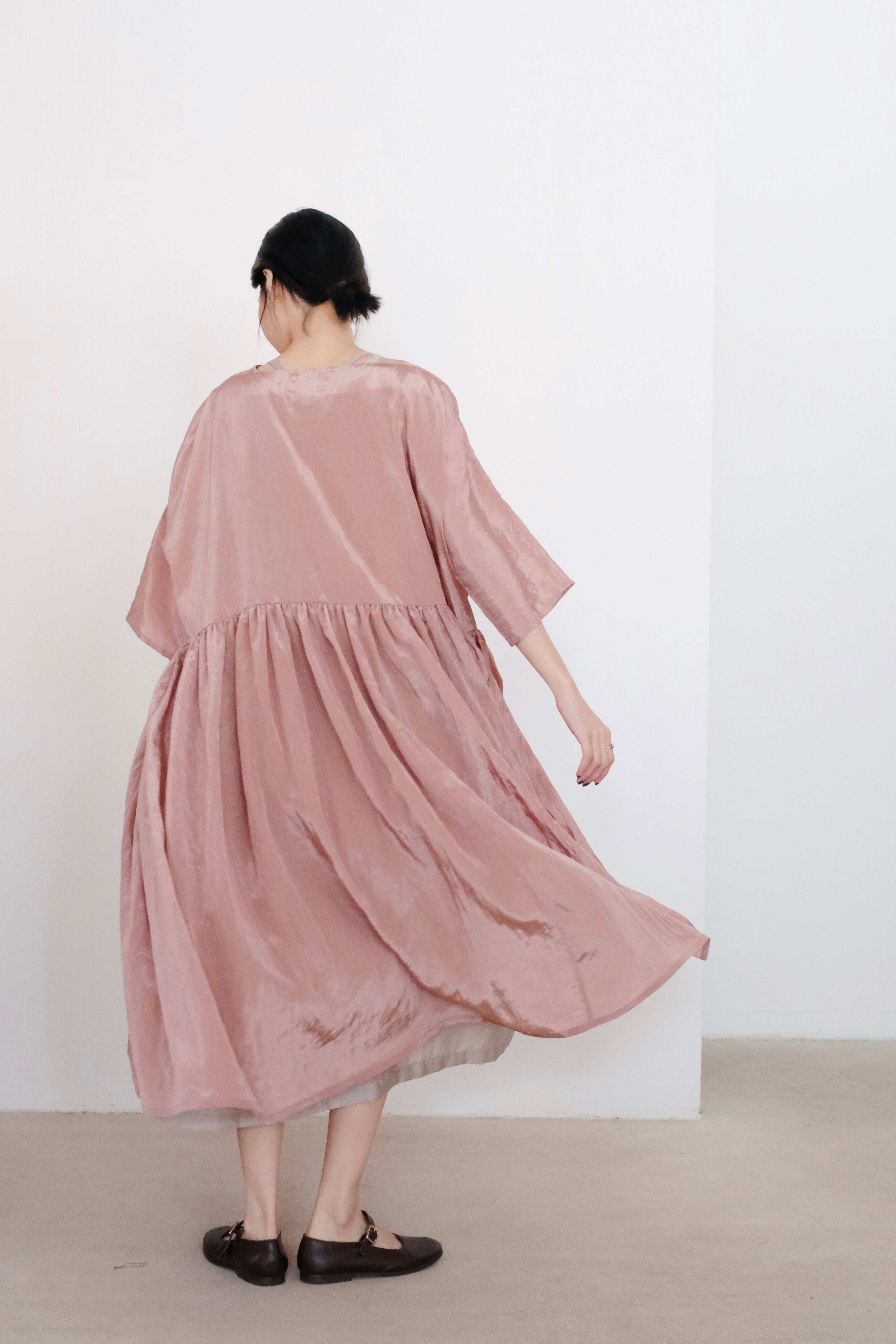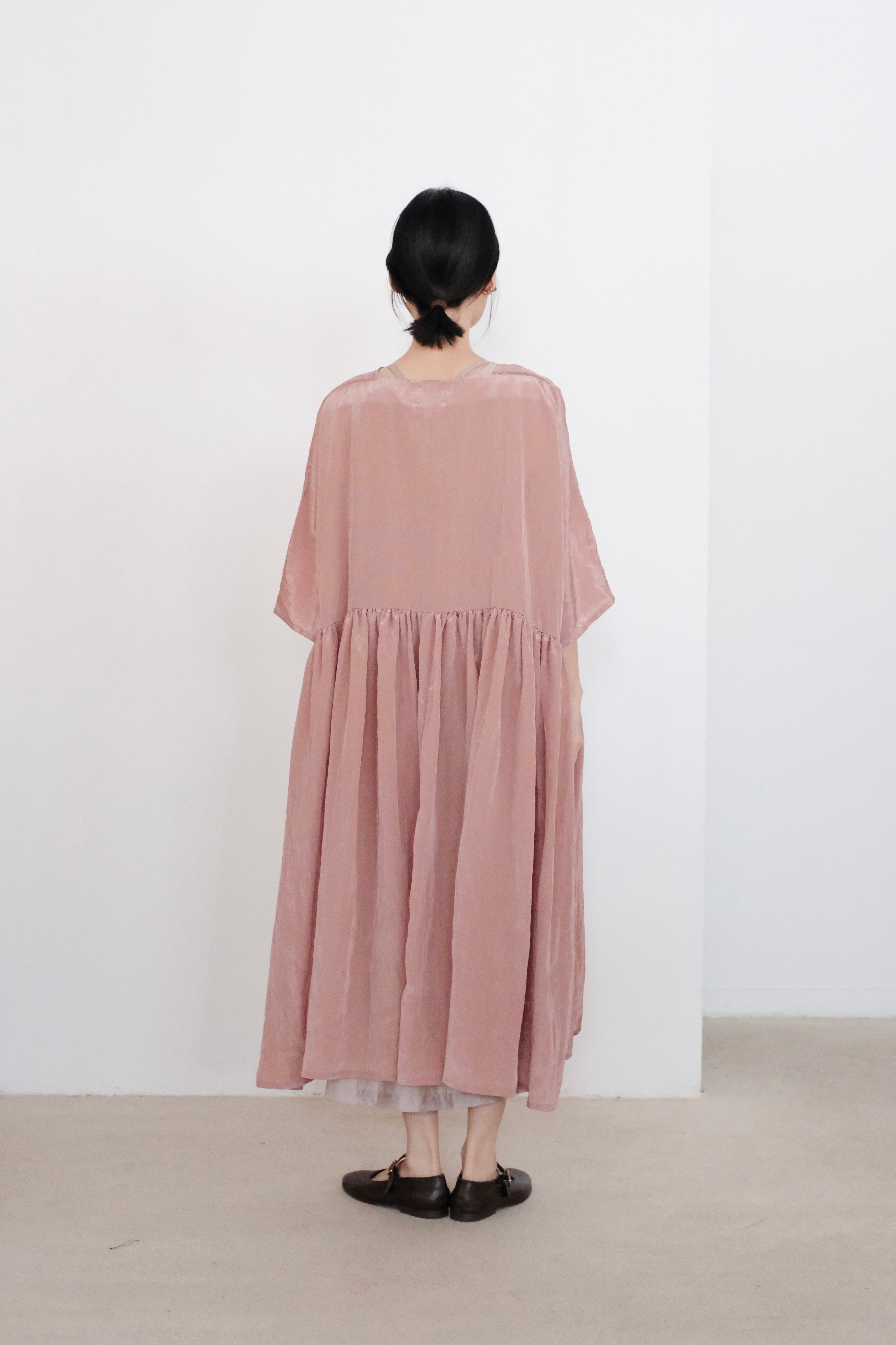 This elegant dress is crafted from a lightweight and slightly shiny fabric that sways and moves with your every step, exuding a sense of effortless grace. The dress features a gathered design at both the upper and lower parts, creating a voluminous, flowing silhouette that adds a touch of playfulness and femininity. The loose cut and ample fabric give a sense of movement and airiness, making it perfect for a breezy summer day or a casual evening event.