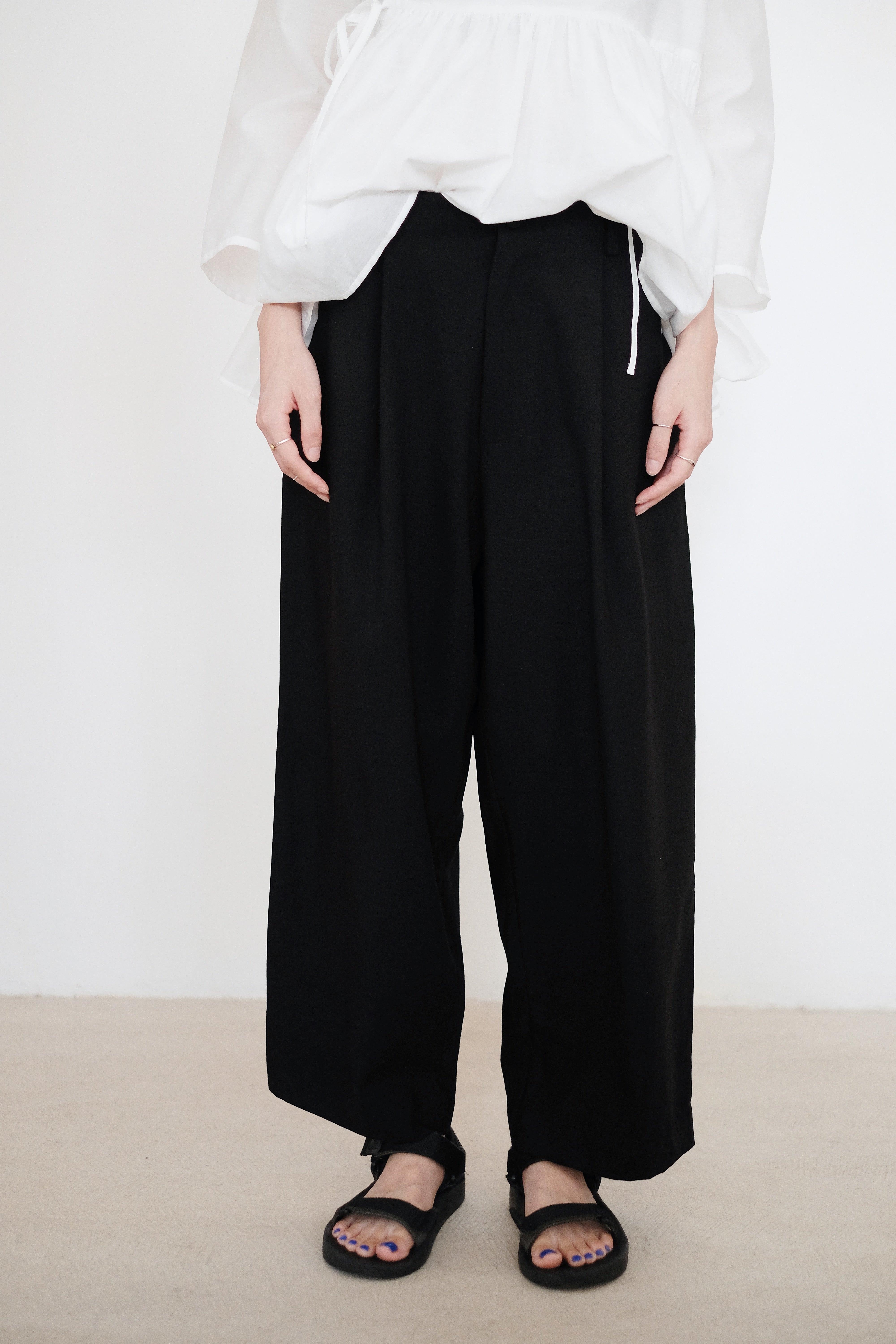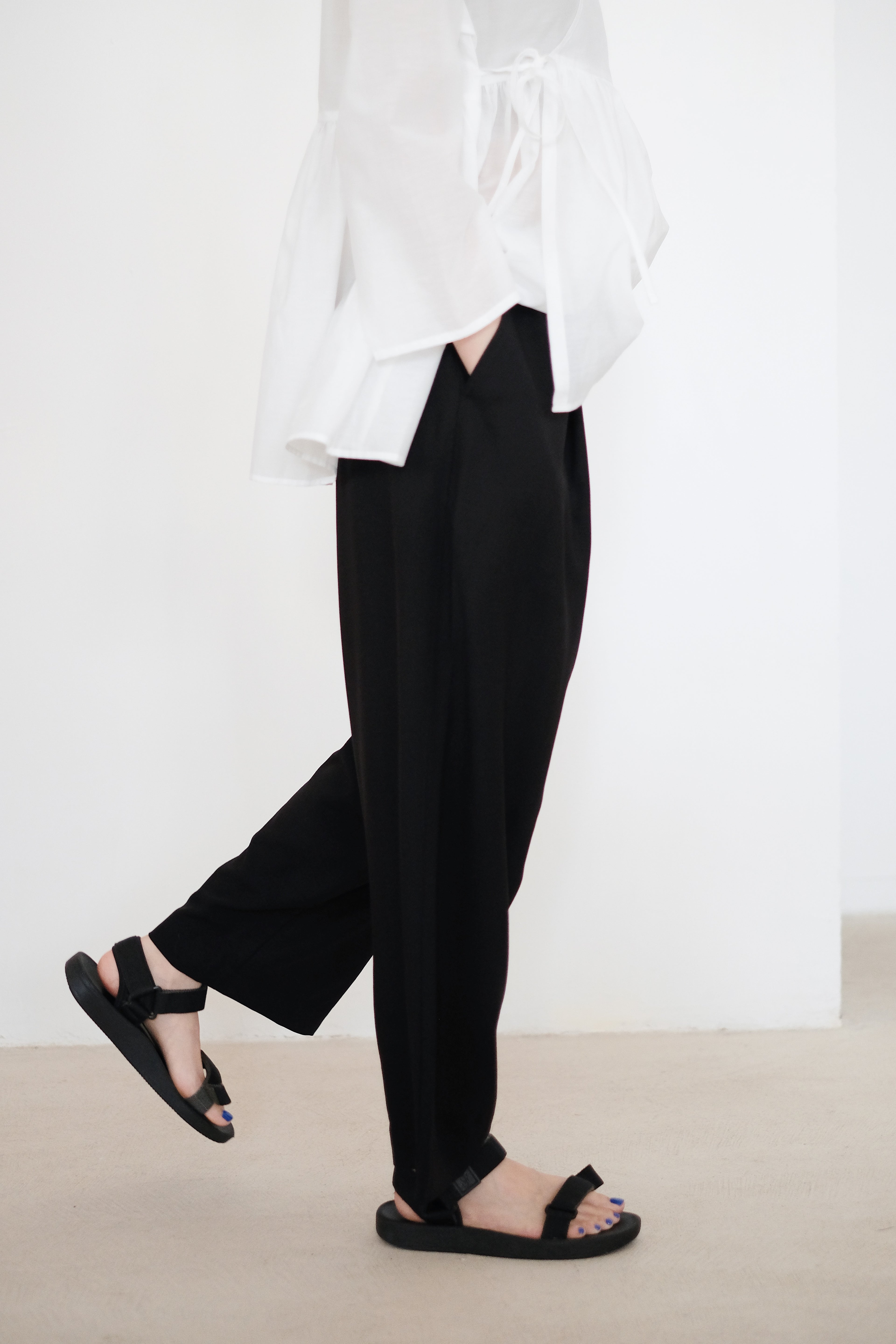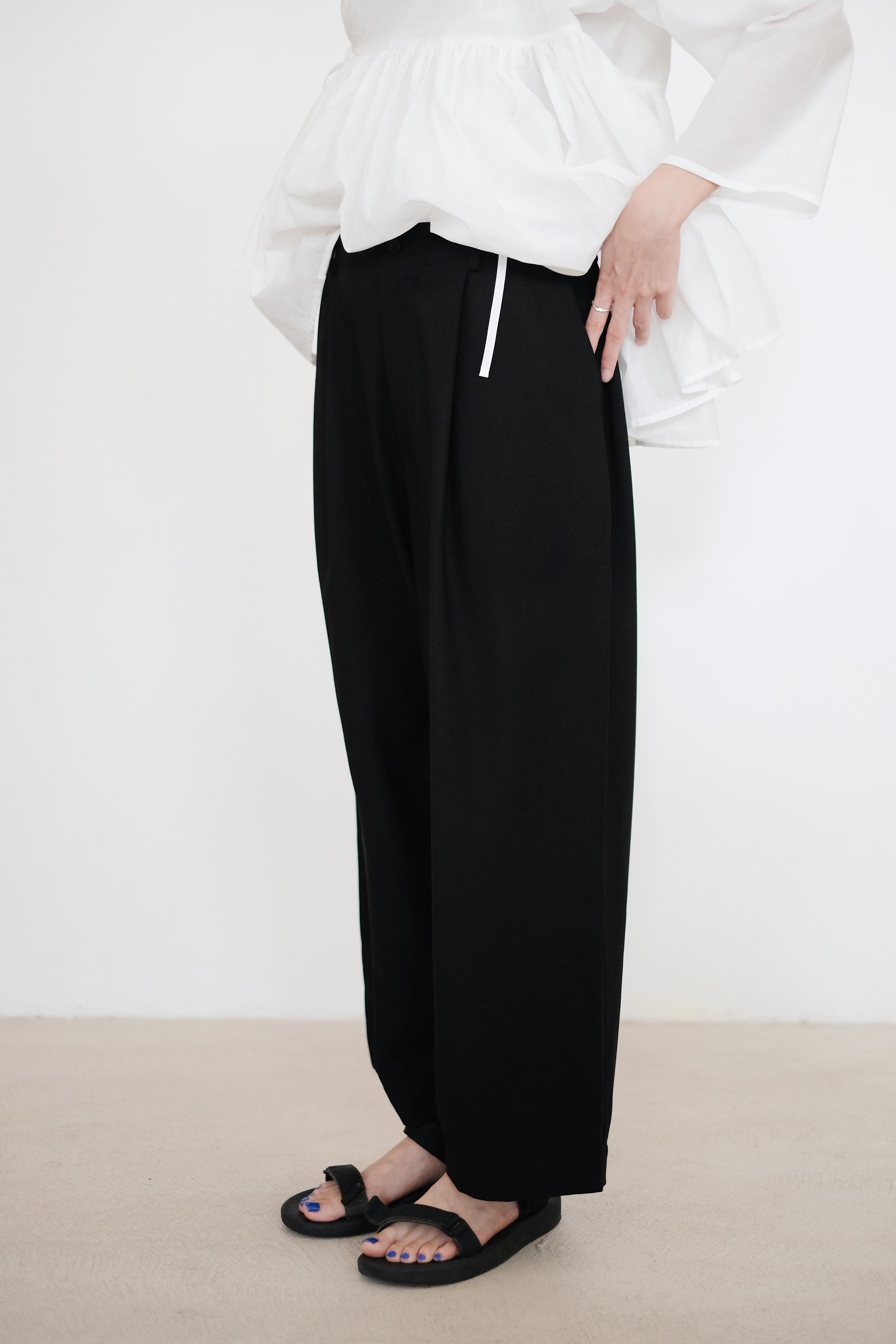 These relaxed-fit pants feature a pleated front and a slightly tapered leg, creating a draped silhouette that is both comfortable and stylish. Made from a lightweight fabric, they offer ease of movement and versatility for everyday wear.