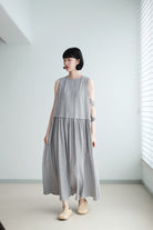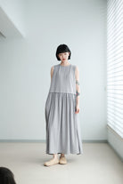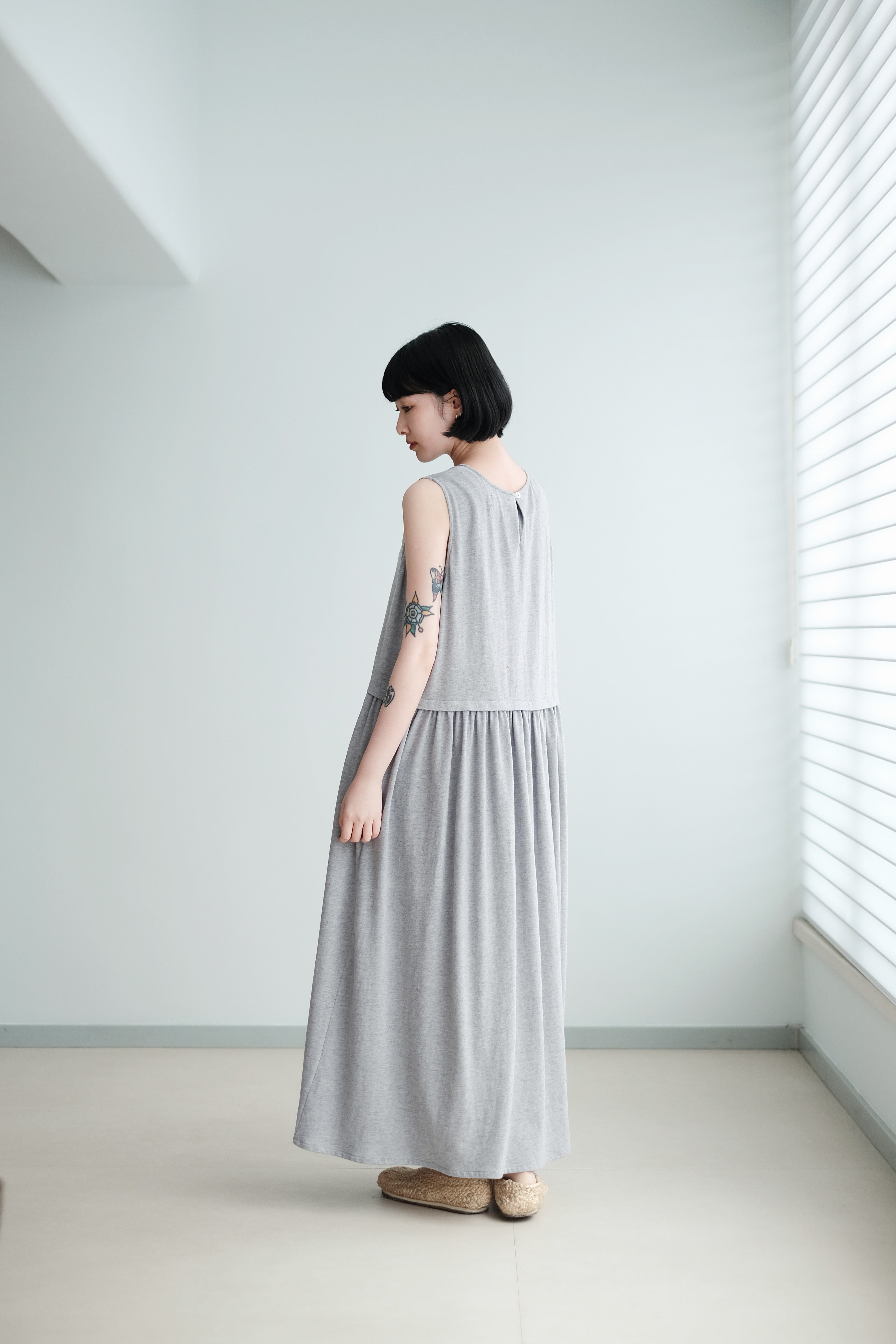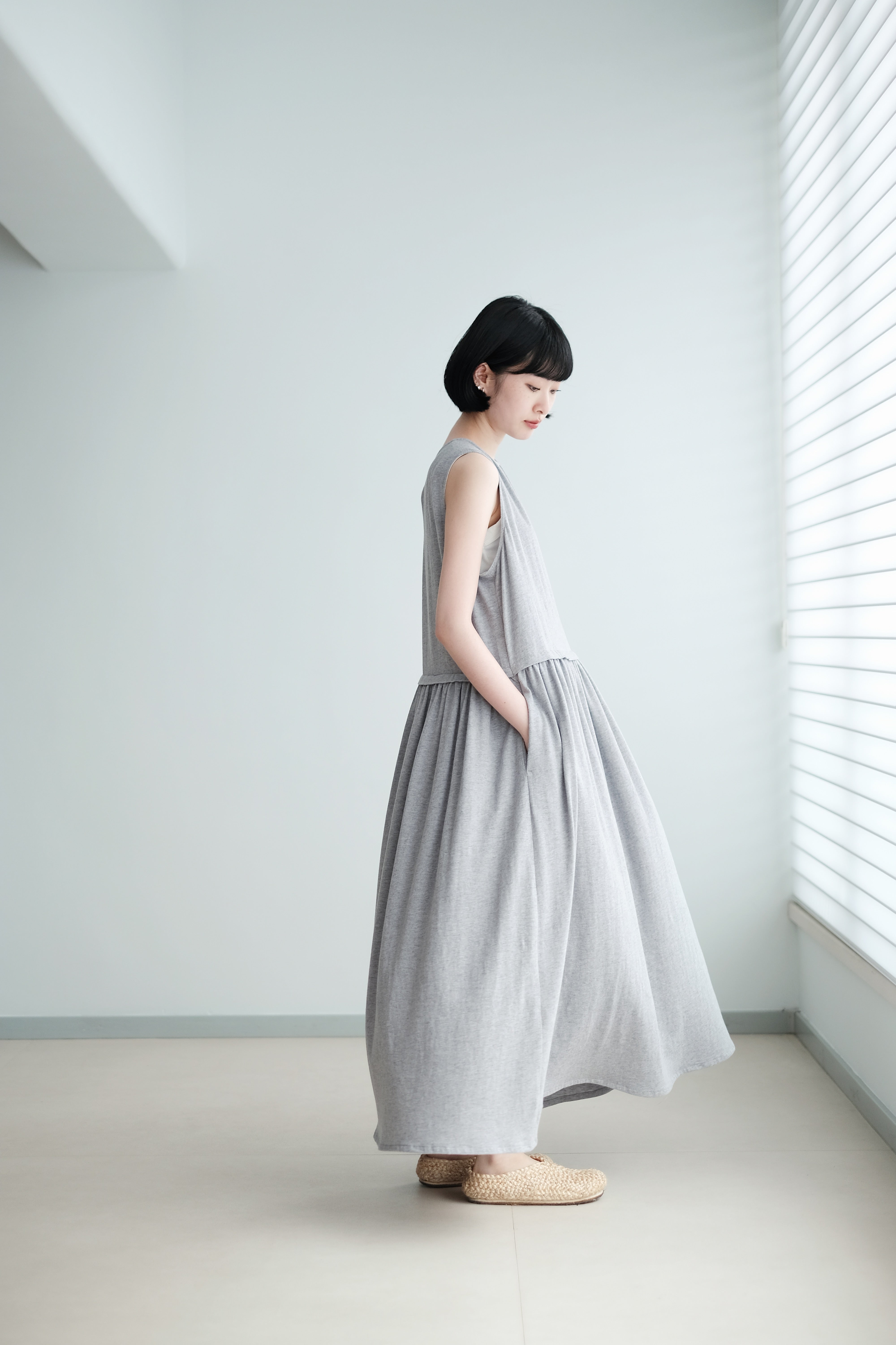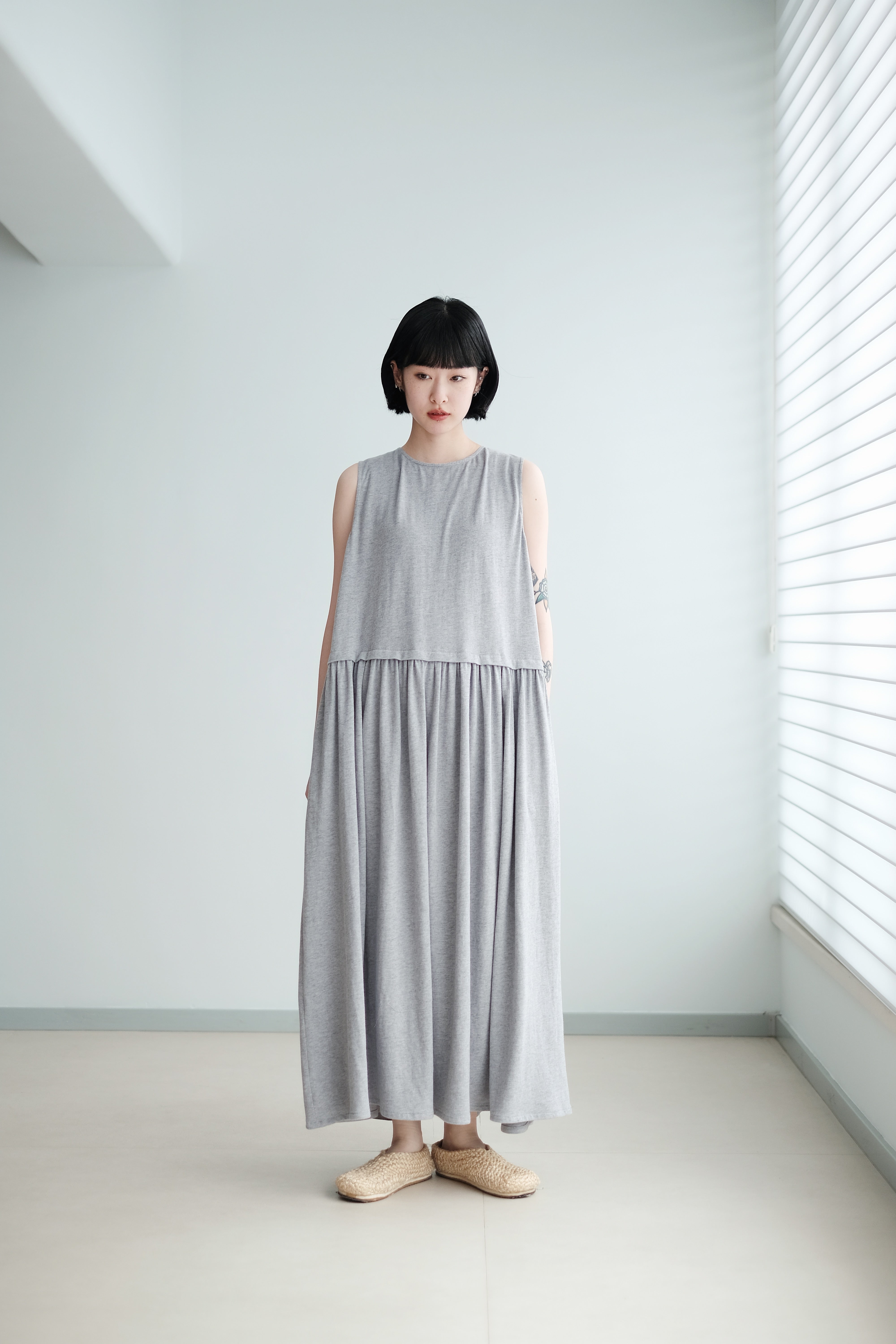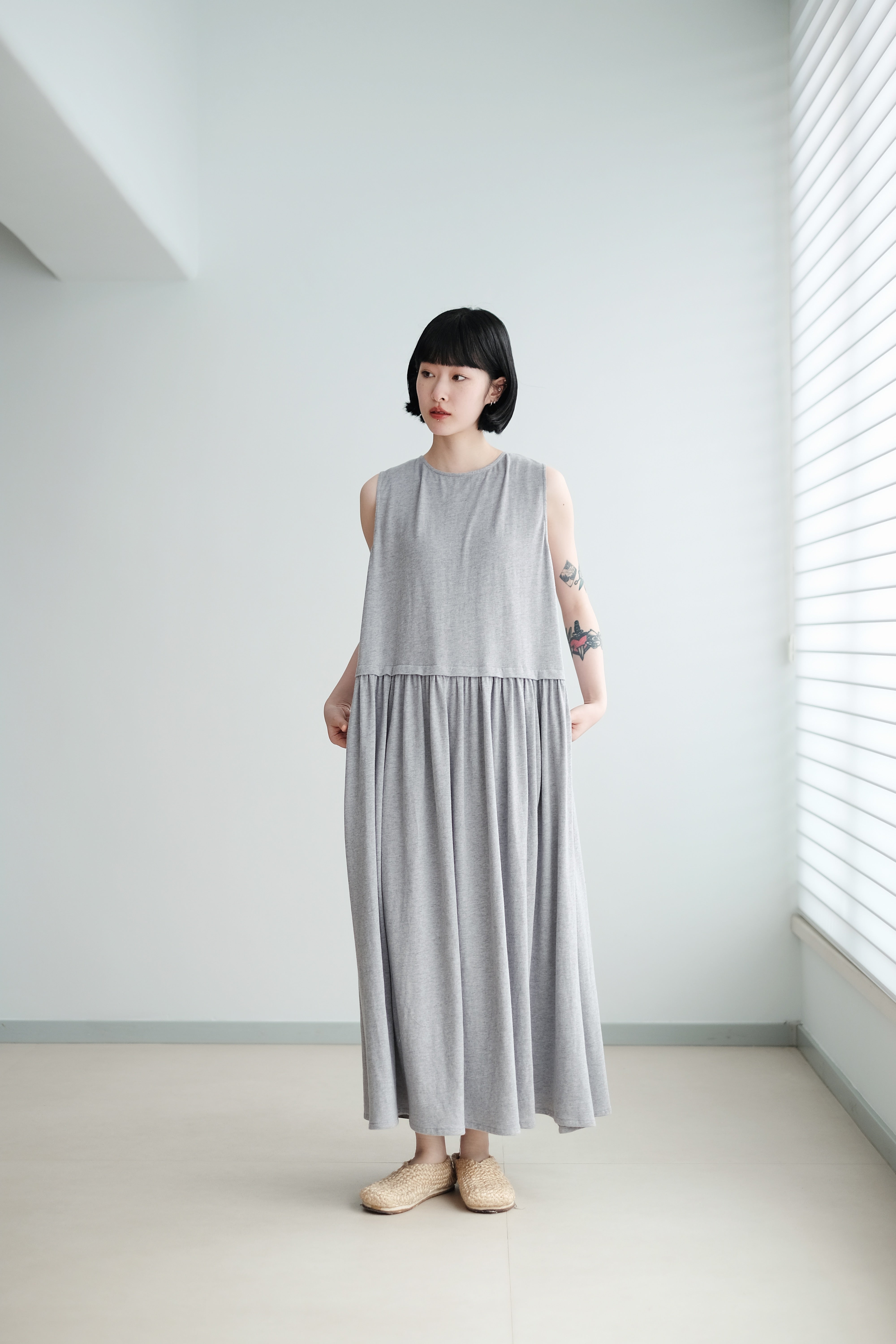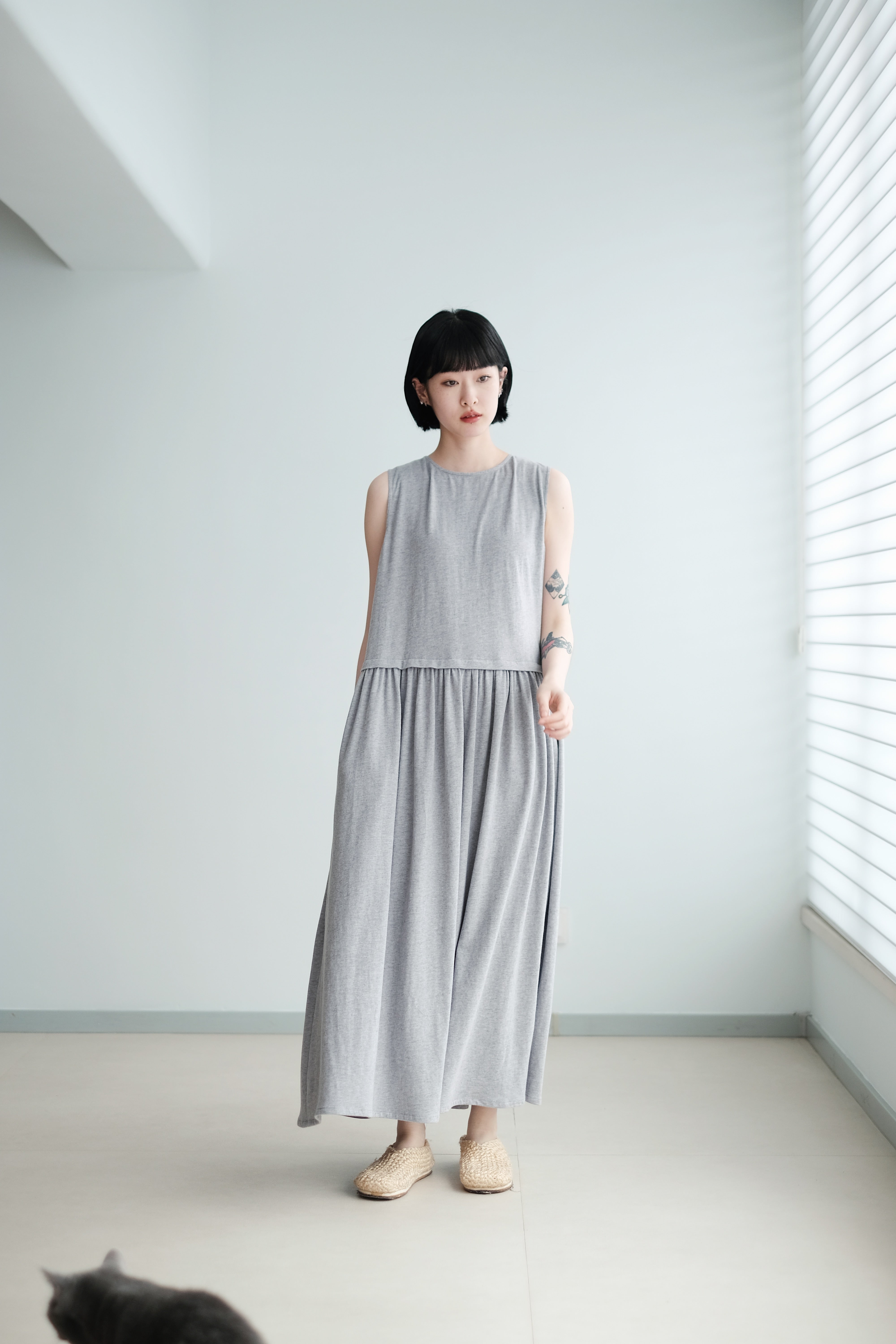 This sleeveless cotton dress is crafted from a soft and lightweight fabric, offering a smooth and breathable feel for all-day comfort. The clean upper bodice contrasts with the gently gathered lower panel, creating a flowing silhouette that moves naturally with every step.